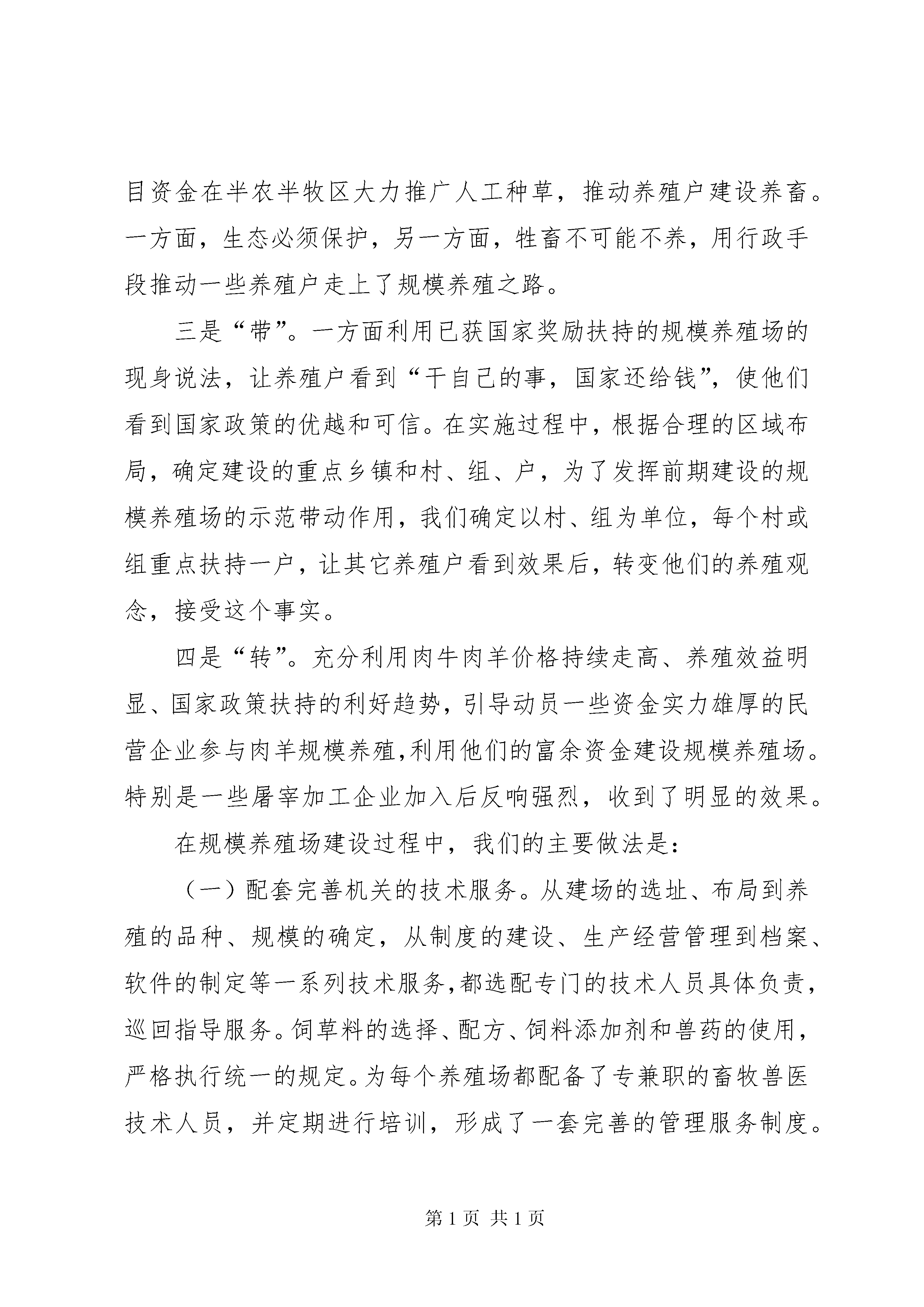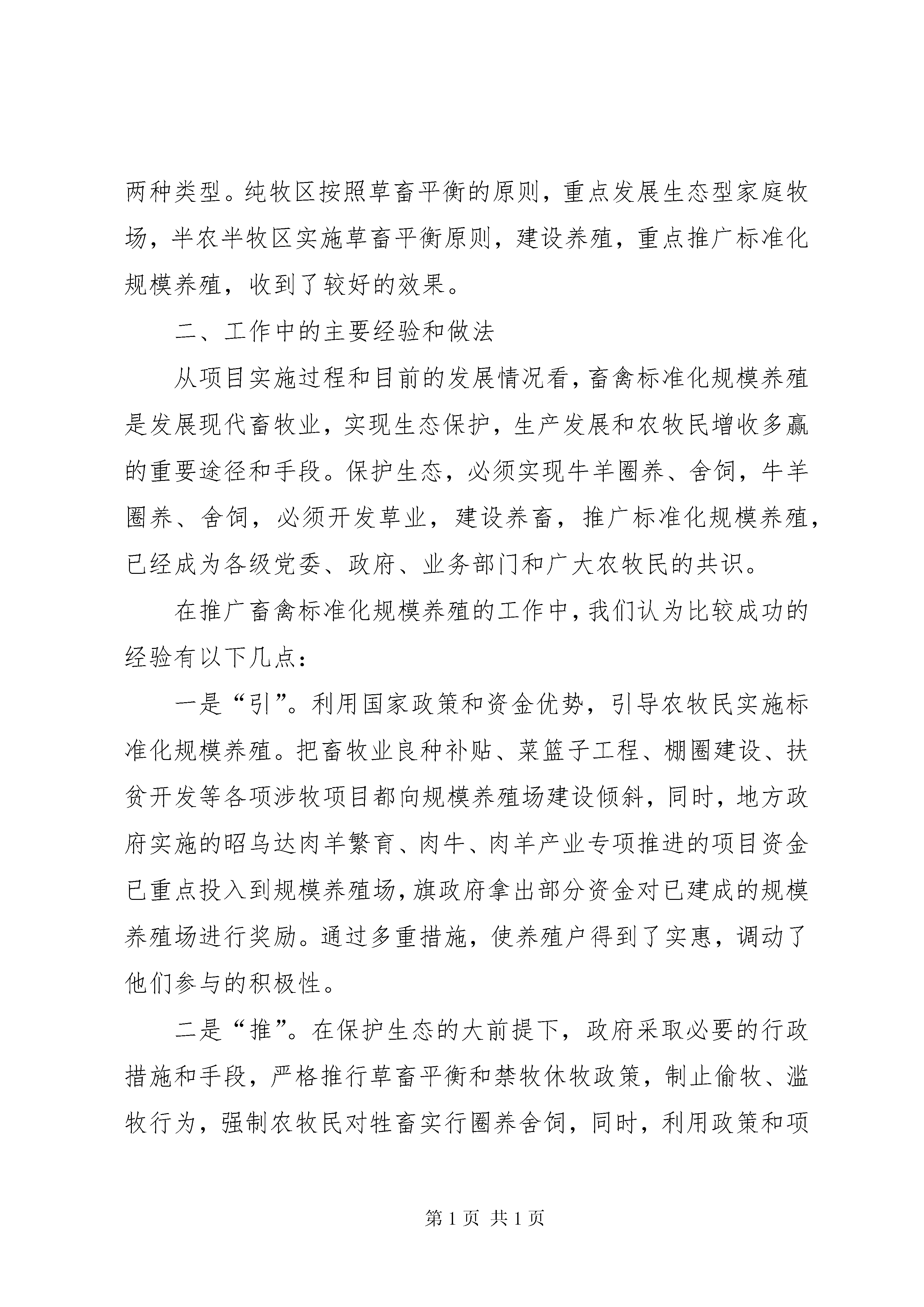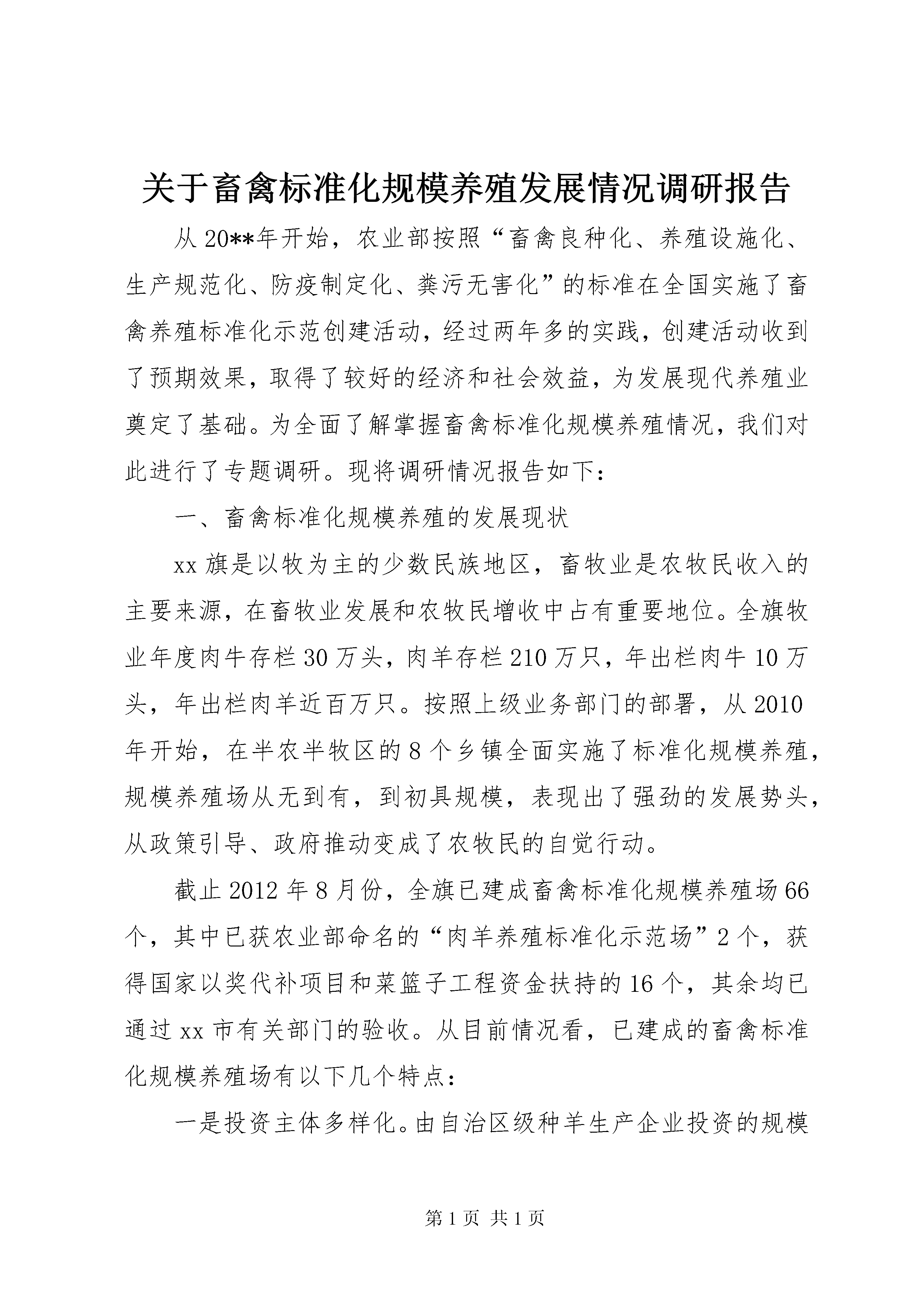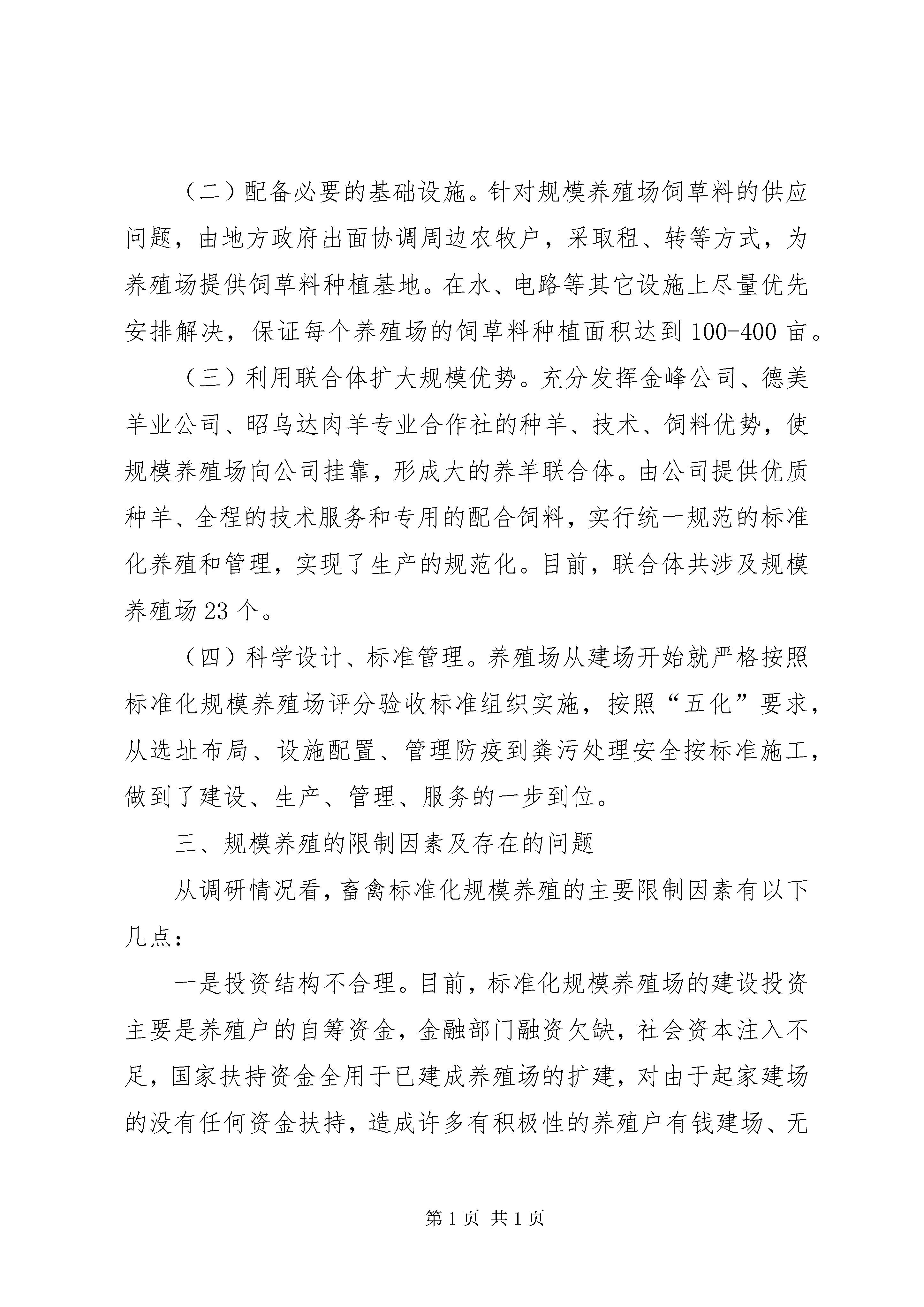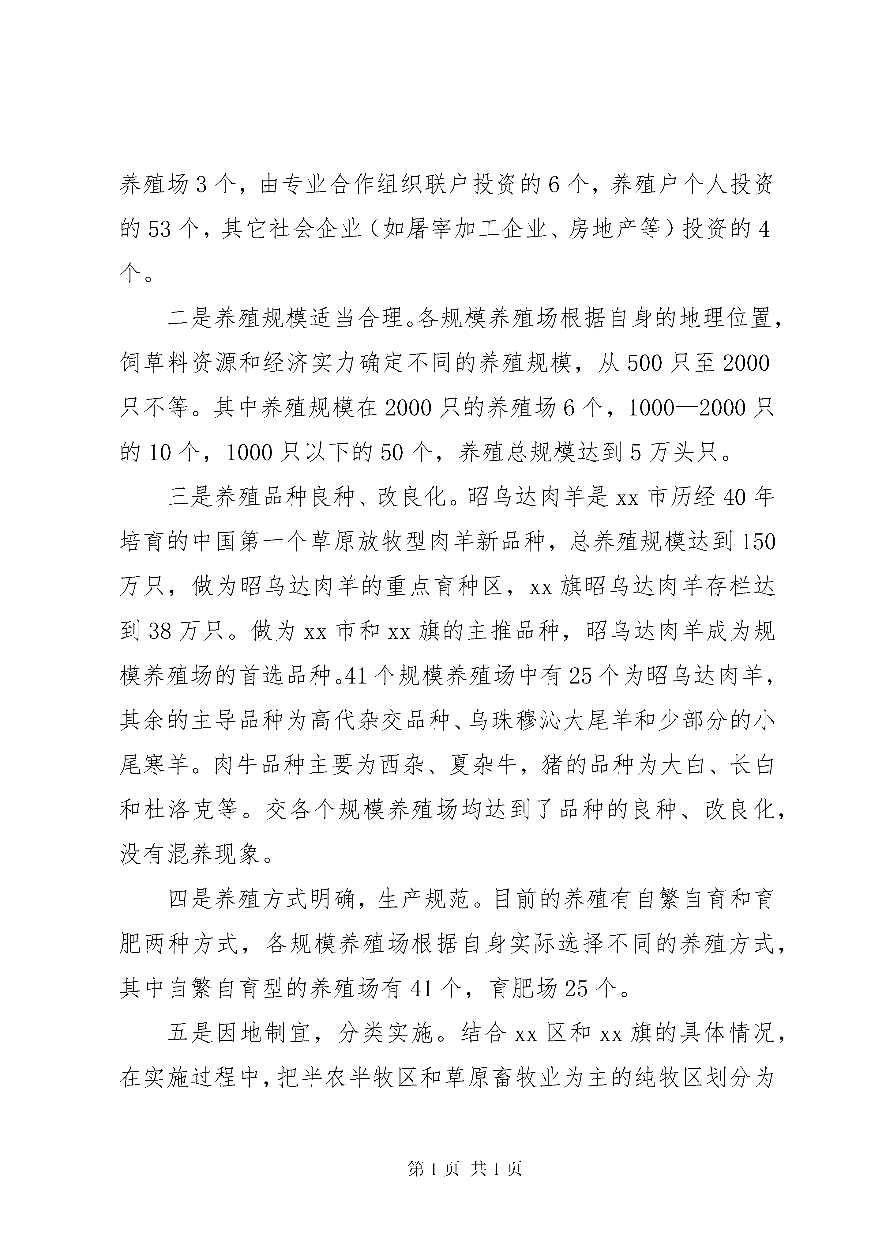 关于畜禽标准化规模养殖发展情况调研报告从20**年开始,农业部按照“畜禽良种化、养殖设施化、生产规范化、防疫制定化、粪污无害化”的标准在全国实施了畜禽养殖标准化示范创建活动,经过两年多的实践,创建活动收到了预期效果,取得了较好的经济和社会效益,为发展现代养殖业奠定了基础。为全面了解掌握畜禽标准化规模养殖情况,我们对此进行了专题调研。现将调研情况报告如下:一、畜禽标准化规模养殖的发展现状xx旗是以牧为主的少数民族地区,畜牧业是农牧民收入的主要来源,在畜牧业发展和农牧民增收中占有重要地位。全旗牧业年度肉牛存栏30万头,肉羊存栏210万只,年出栏肉牛10万头,年出栏肉羊近百万只。按照上级业务部门的部署,从2010年开始,在半农半牧区的8个乡镇全面实施了标准化规模养殖,规模养殖场从无到有,到初具规模,表现出了强劲的发展势头,从政策引导、政府推动变成了农牧民的自觉行动。截止2012年8月份,全旗已建成畜禽标准化规模养殖场66个,其中已获农业部命名的“肉羊养殖标准化示范场”2个,获得国家以奖代补项目和菜篮子工程资金扶持的16个,其余均已通过xx市有关部门的验收。从目前情况看,已建成的畜禽标准化规模养殖场有以下几个特点:一是投资主体多样化。由自治区级种羊生产企业投资的规模养殖场3个,由专业合作组织联户投资的6个,养殖户个人投资的53个,其它社会企业(如屠宰加工企业、房地产等)投资的4个。二是养殖规模适当合理。各规模养殖场根据自身的地理位置,饲草料资源和经济实力确定不同的养殖规模,从500只至2000只不等。其中养殖规模在2000只的养殖场6个,1000—2000只的10个,1000只以下的50个,养殖总规模达到5万头只。三是养殖品种良种、改良化。昭乌达肉羊是xx市历经40年培育的中国第一个草原放牧型肉羊新品种,总养殖规模达到150万只,做为昭乌达肉羊的重点育种区,xx旗昭乌达肉羊存栏达到38万只。做为xx市和xx旗的主推品种,昭乌达肉羊成为规模养殖场的首选品种。41个规模养殖场中有25个为昭乌达肉羊,其余的主导品种为高代杂交品种、乌珠穆沁大尾羊和少部分的小尾寒羊。肉牛品种主要为西杂、夏杂牛,猪的品种为大白、长白和杜洛克等。交各个规模养殖场均达到了品种的良种、改良化,没有混养现象。四是养殖方式明确,生产规范。目前的养殖有自繁自育和育肥两种方式,各规模养殖场根据自身实际选择不同的养殖方式,其中自繁自育型的养殖场有41个,育肥场25个。五是因地制宜,分类实施。结合xx区和xx旗的具体情况,在实施过程中,把半农半牧区和草原畜牧业为主的纯牧区划分为两种类型。纯牧区按照草畜平衡的原则,重点发展生态型家庭牧场,半农半牧区实施草畜平衡原则,建设养殖,重点推广标准化规模养殖,收到了较好的效果。二、工作中的主要经验和做法从项目实施过程和目前的发展情况看,畜禽标准化规模养殖是发展现代畜牧业,实现生态保护,生产发展和农牧民增收多赢的重要途径和手段。保护生态,必须实现牛羊圈养、舍饲,牛羊圈养、舍饲,必须开发草业,建设养畜,推广标准化规模养殖,已经成为各级党委、政府、业务部门和广大农牧民的共识。在推广畜禽标准化规模养殖的工作中,我们认为比较成功的经验有以下几点:一是“引”。利用国家政策和资金优势,引导农牧民实施标准化规模养殖。把畜牧业良种补贴、菜篮子工程、棚圈建设、扶贫开发等各项涉牧项目都向规模养殖场建设倾斜,同时,地方政府实施的昭乌达肉羊繁育、肉牛、肉羊产业专项推进的项目资金已重点投入到规模养殖场,旗政府拿出部分资金对已建成的规模养殖场进行奖励。通过多重措施,使养殖户得到了实惠,调动了他们参与的积极性。二是“推”。在保护生态的大前提下,政府采取必要的行政措施和手段,严格推行草畜平衡和禁牧休牧政策,制止偷牧、滥牧行为,强制农牧民对牲畜实行圈养舍饲,同时,利用政策和项目资金在半农半牧区大力推广人工种草,推动养殖户建设养畜。一方面,生态必须保护,另一方面,牲畜不可能不养,用行政手段推动一些养殖户走上了规模养殖之路。三是“带”。一方面利用已获国家奖励扶持的规模养殖场的现身说法,让养殖户看到“干自己的事,国家还给钱”,使他们看到国家政策的优越和可信。在实施过程中,根据合理的区域布局,确定建设的重点乡镇和村、组、户,为了发挥前期建设的规模养殖场的示范带动作用,我们确定以村、组为单位,每个村或组重点扶持一户,让其它养殖户看到效果后,转变他们的养殖观念,接受这个事实。四是“转”。充分利用肉牛肉羊价格持续走高、养殖效益明显、国家政策扶持的利好趋势,引导动员一些资金实力雄厚的民营企业参与肉羊规模养殖,利用他们的富余资金建设规模养殖场。特别是一些屠宰加工企业加入后反响强烈,收到了明显的效果。在规模养殖场建设过程中,我们的主要做法是:(一)配套完善机关的技术服务。