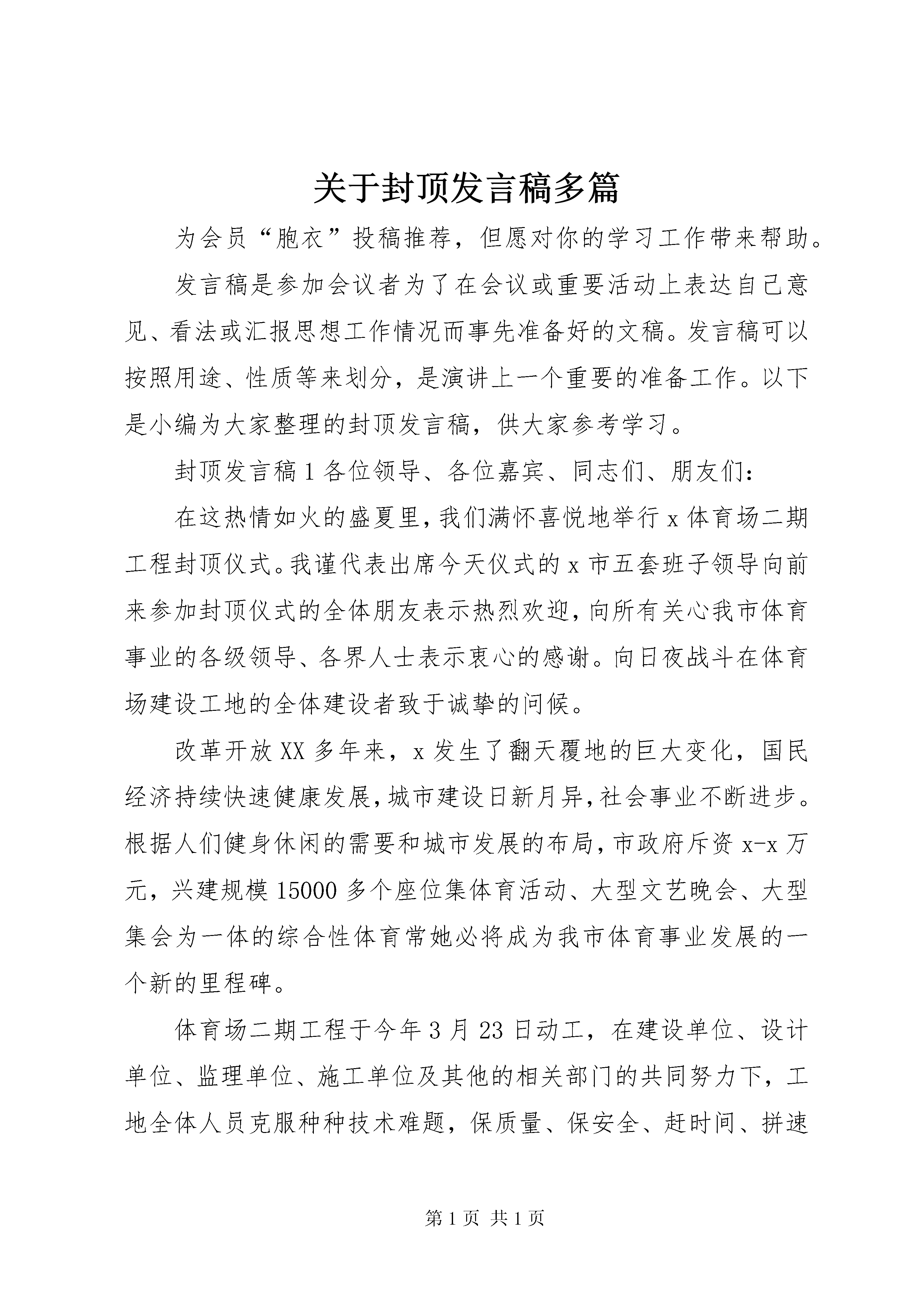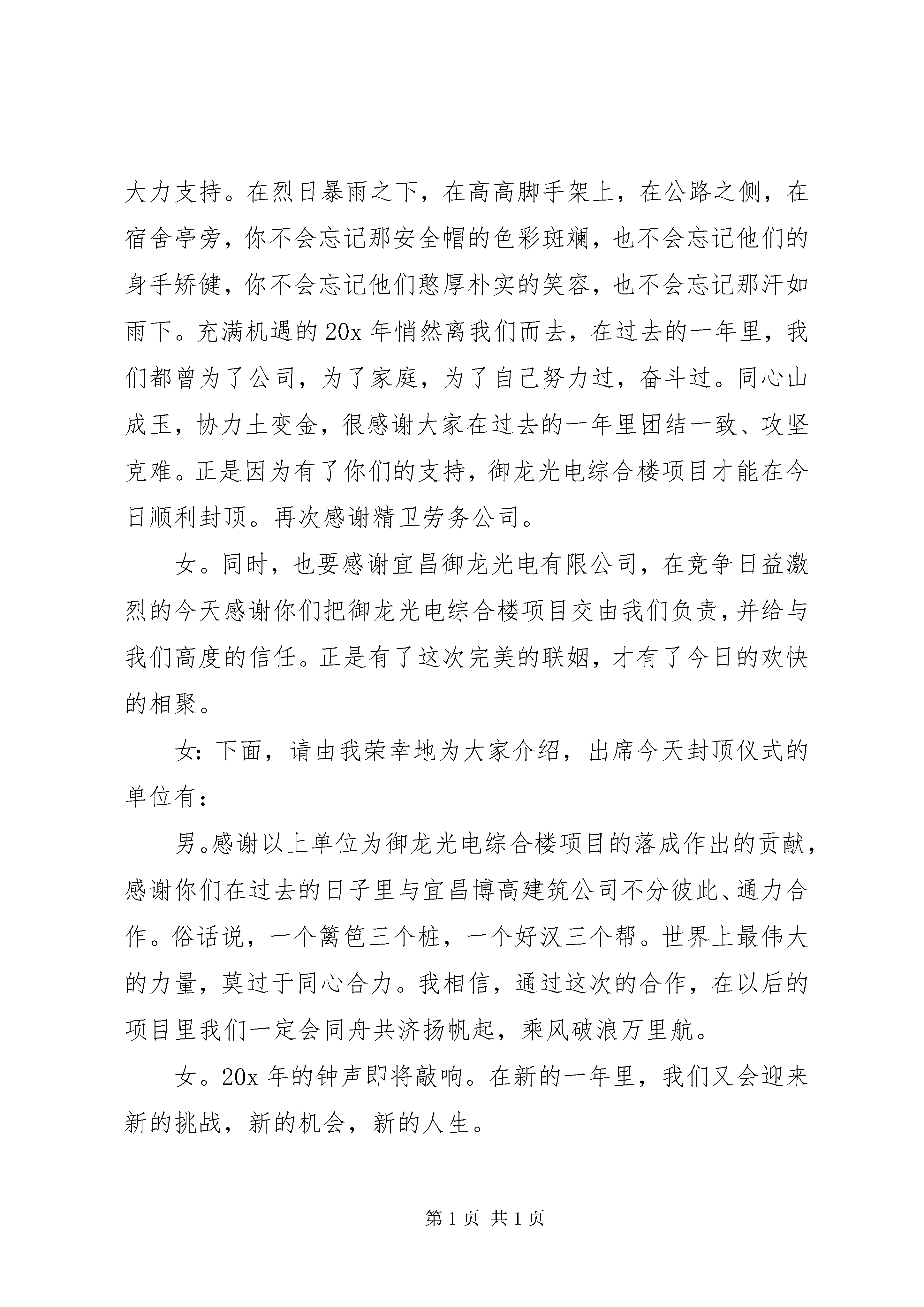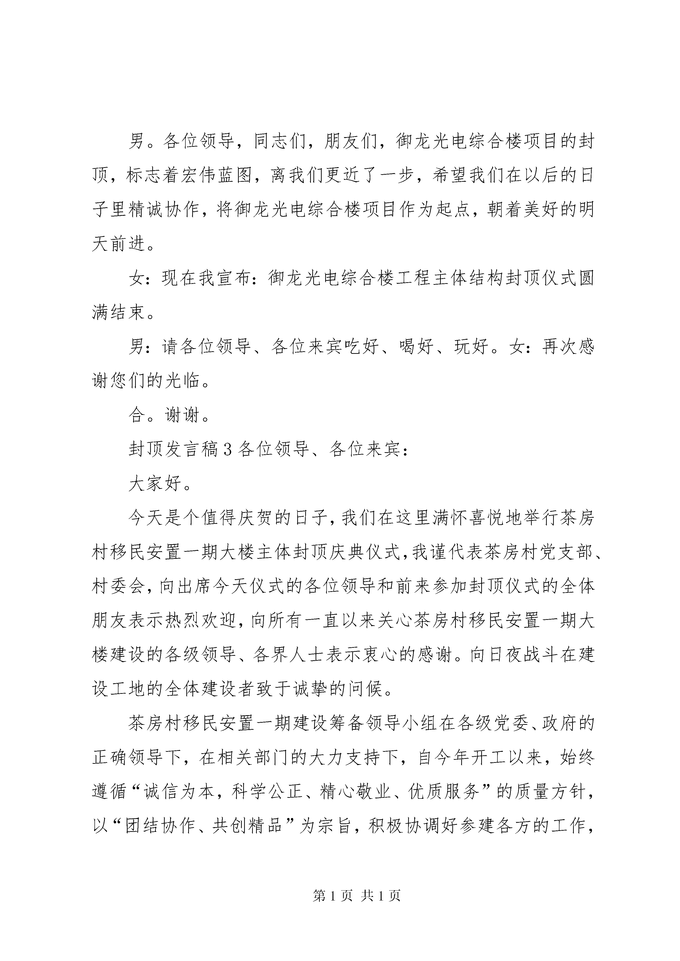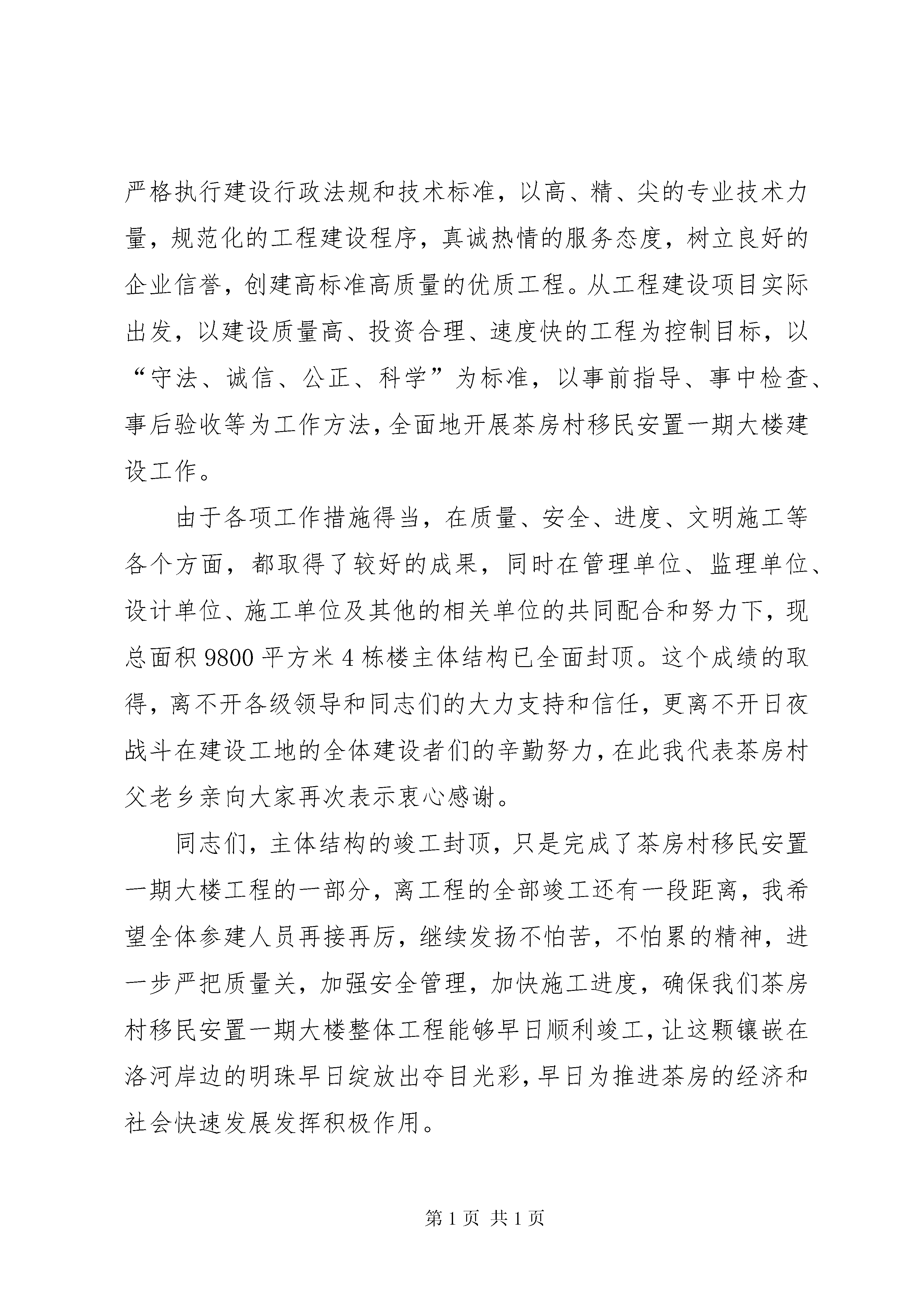 关于封顶发言稿多篇为会员“胞衣”投稿推荐,但愿对你的学习工作带来帮助。发言稿是参加会议者为了在会议或重要活动上表达自己意见、看法或汇报思想工作情况而事先准备好的文稿。发言稿可以按照用途、性质等来划分,是演讲上一个重要的准备工作。以下是小编为大家整理的封顶发言稿,供大家参考学习。封顶发言稿1各位领导、各位嘉宾、同志们、朋友们:在这热情如火的盛夏里,我们满怀喜悦地举行x体育场二期工程封顶仪式。我谨代表出席今天仪式的x市五套班子领导向前来参加封顶仪式的全体朋友表示热烈欢迎,向所有关心我市体育事业的各级领导、各界人士表示衷心的感谢。向日夜战斗在体育场建设工地的全体建设者致于诚挚的问候。改革开放XX多年来,x发生了翻天覆地的巨大变化,国民经济持续快速健康发展,城市建设日新月异,社会事业不断进步。根据人们健身休闲的需要和城市发展的布局,市政府斥资x-x万元,兴建规模15000多个座位集体育活动、大型文艺晚会、大型集会为一体的综合性体育常她必将成为我市体育事业发展的一个新的里程碑。体育场二期工程于今年3月23日动工,在建设单位、设计单位、监理单位、施工单位及其他的相关部门的共同努力下,工地全体人员克服种种技术难题,保质量、保安全、赶时间、拼速度,仅用三个多月就完成了主体结构的封顶,在此,我再次向全体参建人员表示衷心的感谢。同志们、朋友们,我们希望全体参建人员进一步严把质量关,加强安全管理,加快施工进度,确保市委、市政府的这个德政工程、民心工程如期完成。谢谢大家。封顶发言稿2男:尊敬的各位领导女:各位来宾男:朋友们合。大家上午好。女:感谢大家前来参加御龙光电综合楼项目工程主体结构封顶仪式。男:继奠基典礼后的二百个日日夜夜,经过建设团队的坚苦奋战,我们迎来了御龙光电综合楼主体结构的封顶庆典。女。在这岁末将至、隆冬时节,我们欢聚在此,共同见证这激动人心的一刻。在此,我谨代表御龙光电综合楼项目部全体工作人员,向今天莅临现场的所有来宾,表示热烈的欢迎和衷心的感谢。御龙光电综合楼项目工程自开工以来,得到了各方领导的高度重视,在您们的关怀指导下,经过勘查单位、质检单位、安检单位、全通混凝土搅拌站等各方的共同努力,工程在今日,主体结构将顺利封顶。男。在此,特别要感谢精卫劳务公司全体员工给予本项目的大力支持。在烈日暴雨之下,在高高脚手架上,在公路之侧,在宿舍亭旁,你不会忘记那安全帽的色彩斑斓,也不会忘记他们的身手矫健,你不会忘记他们憨厚朴实的笑容,也不会忘记那汗如雨下。充满机遇的20x年悄然离我们而去,在过去的一年里,我们都曾为了公司,为了家庭,为了自己努力过,奋斗过。同心山成玉,协力土变金,很感谢大家在过去的一年里团结一致、攻坚克难。正是因为有了你们的支持,御龙光电综合楼项目才能在今日顺利封顶。再次感谢精卫劳务公司。女。同时,也要感谢宜昌御龙光电有限公司,在竞争日益激烈的今天感谢你们把御龙光电综合楼项目交由我们负责,并给与我们高度的信任。正是有了这次完美的联姻,才有了今日的欢快的相聚。女:下面,请由我荣幸地为大家介绍,出席今天封顶仪式的单位有:男。感谢以上单位为御龙光电综合楼项目的落成作出的贡献,感谢你们在过去的日子里与宜昌博高建筑公司不分彼此、通力合作。俗话说,一个篱笆三个桩,一个好汉三个帮。世界上最伟大的力量,莫过于同心合力。我相信,通过这次的合作,在以后的项目里我们一定会同舟共济扬帆起,乘风破浪万里航。女。20x年的钟声即将敲响。在新的一年里,我们又会迎来新的挑战,新的机会,新的人生。男。各位领导,同志们,朋友们,御龙光电综合楼项目的封顶,标志着宏伟蓝图,离我们更近了一步,希望我们在以后的日子里精诚协作,将御龙光电综合楼项目作为起点,朝着美好的明天前进。女:现在我宣布:御龙光电综合楼工程主体结构封顶仪式圆满结束。男:请各位领导、各位来宾吃好、喝好、玩好。女:再次感谢您们的光临。合。谢谢。封顶发言稿3各位领导、各位来宾:大家好。今天是个值得庆贺的日子,我们在这里满怀喜悦地举行茶房村移民安置一期大楼主体封顶庆典仪式,我谨代表茶房村党支部、村委会,向出席今天仪式的各位领导和前来参加封顶仪式的全体朋友表示热烈欢迎,向所有一直以来关心茶房村移民安置一期大楼建设的各级领导、各界人士表示衷心的感谢。向日夜战斗在建设工地的全体建设者致于诚挚的问候。茶房村移民安置一期建设筹备领导小组在各级党委、政府的正确领导下,在相关部门的大力支持下,自今年开工以来,始终遵循“诚信为本,科学公正、精心敬业、优质服务”的质量方针,以“团结协作、共创精品”为宗旨,积极协调好参建各方的工作,严格执行建设行政法规和技术标准,以高、精、尖的专业技术力量,规范化的工程建设程序,真诚热情的服务态度,树立良好的企业信誉,创建高标准高质量的优质工程。从工程建设项目实际出发,以
