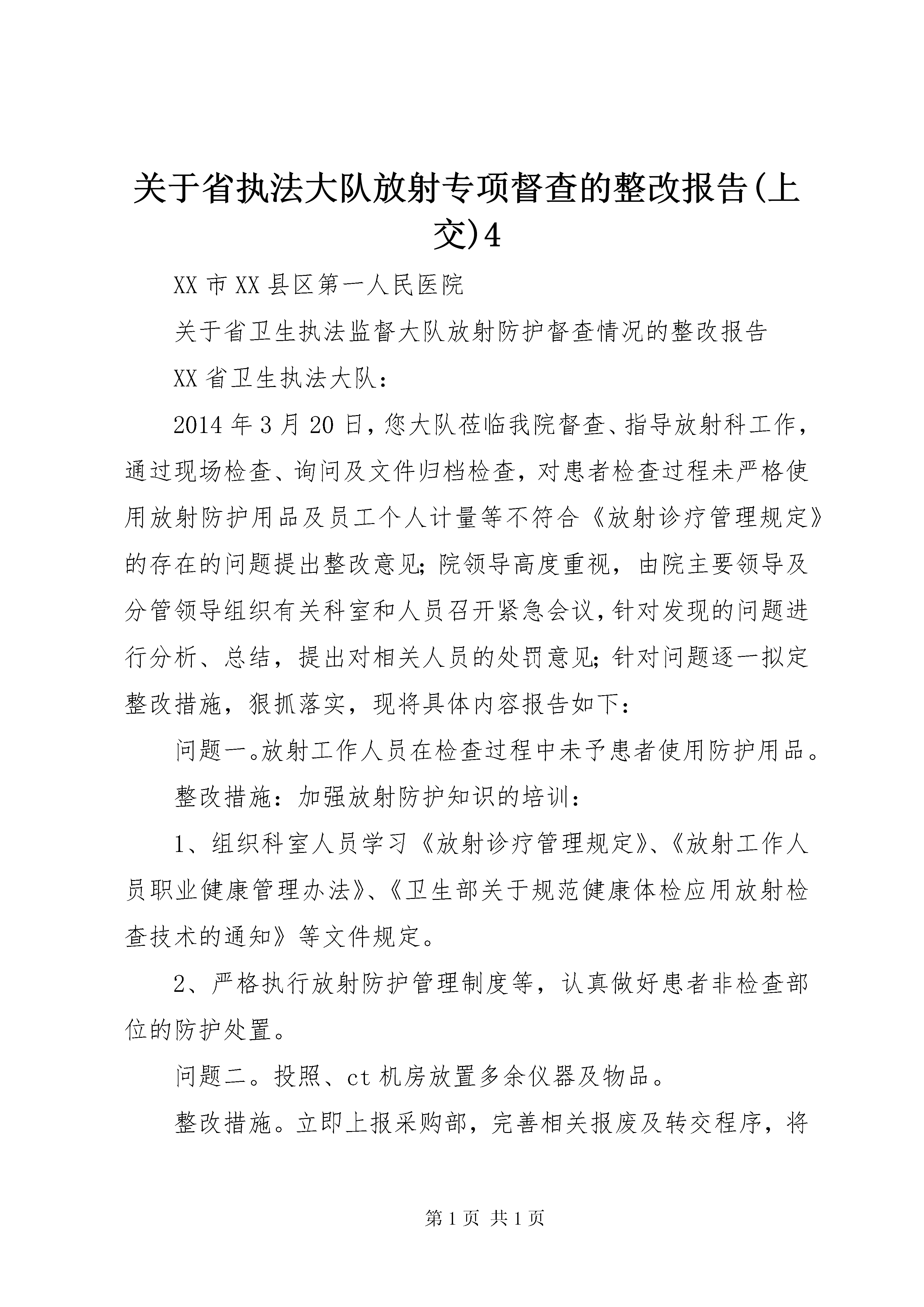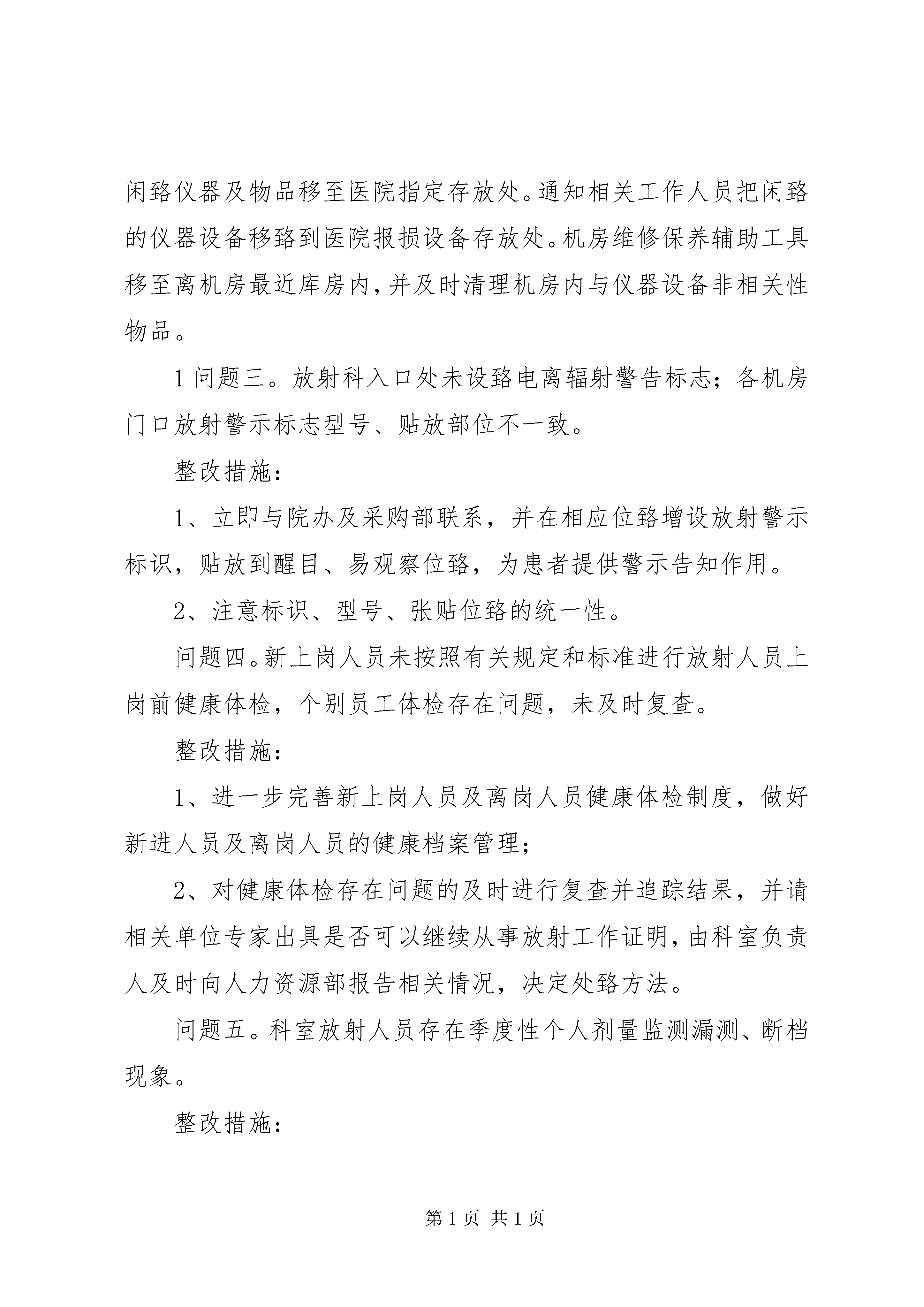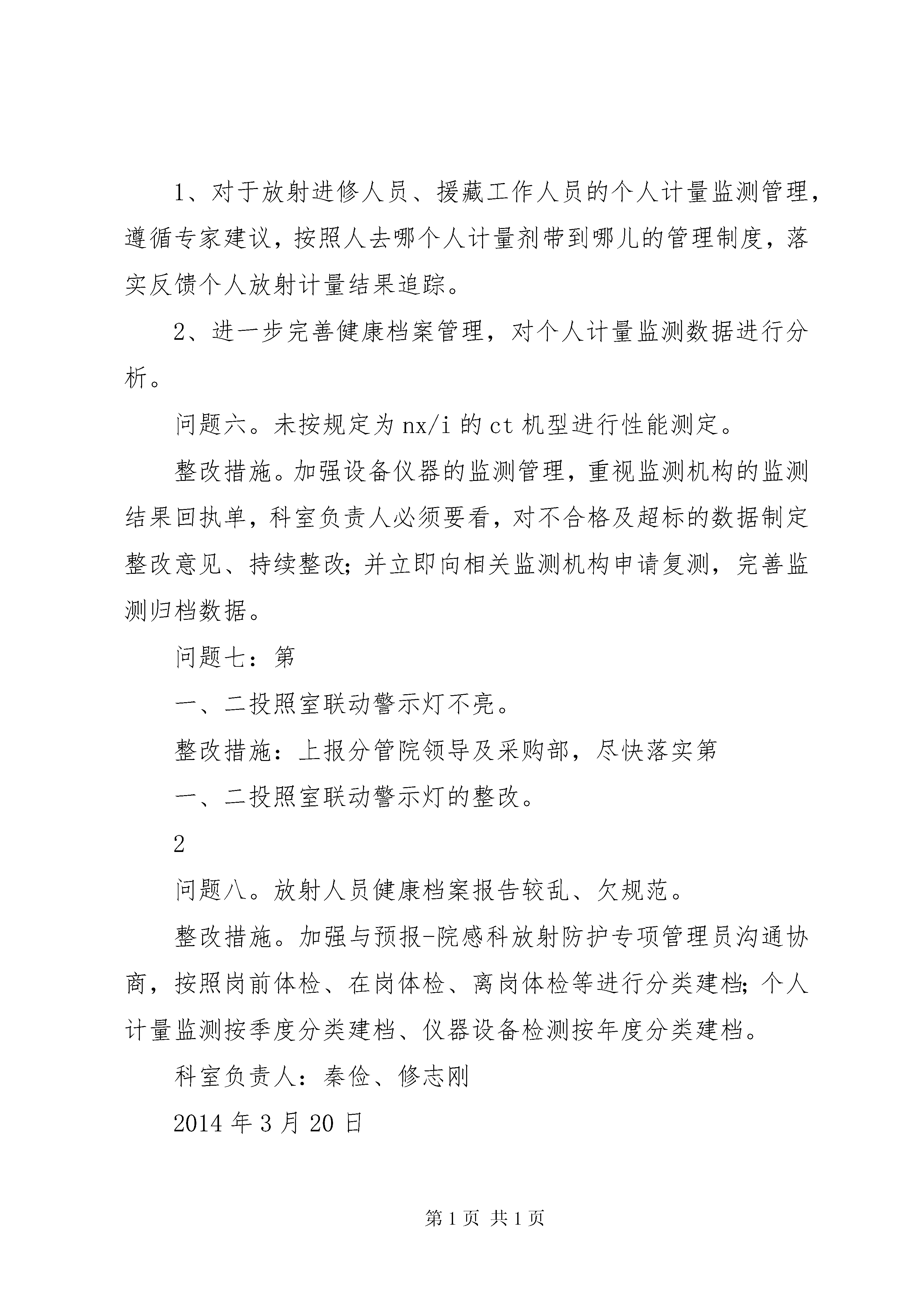 关于省执法大队放射专项督查的整改报告(上交)4XX市XX县区第一人民医院关于省卫生执法监督大队放射防护督查情况的整改报告XX省卫生执法大队:2014年3月20日,您大队莅临我院督查、指导放射科工作,通过现场检查、询问及文件归档检查,对患者检查过程未严格使用放射防护用品及员工个人计量等不符合《放射诊疗管理规定》的存在的问题提出整改意见;院领导高度重视,由院主要领导及分管领导组织有关科室和人员召开紧急会议,针对发现的问题进行分析、总结,提出对相关人员的处罚意见;针对问题逐一拟定整改措施,狠抓落实,现将具体内容报告如下:问题一。放射工作人员在检查过程中未予患者使用防护用品。整改措施:加强放射防护知识的培训:1、组织科室人员学习《放射诊疗管理规定》、《放射工作人员职业健康管理办法》、《卫生部关于规范健康体检应用放射检查技术的通知》等文件规定。2、严格执行放射防护管理制度等,认真做好患者非检查部位的防护处置。问题二。投照、ct机房放置多余仪器及物品。整改措施。立即上报采购部,完善相关报废及转交程序,将闲臵仪器及物品移至医院指定存放处。通知相关工作人员把闲臵的仪器设备移臵到医院报损设备存放处。机房维修保养辅助工具移至离机房最近库房内,并及时清理机房内与仪器设备非相关性物品。1问题三。放射科入口处未设臵电离辐射警告标志;各机房门口放射警示标志型号、贴放部位不一致。整改措施:1、立即与院办及采购部联系,并在相应位臵增设放射警示标识,贴放到醒目、易观察位臵,为患者提供警示告知作用。2、注意标识、型号、张贴位臵的统一性。问题四。新上岗人员未按照有关规定和标准进行放射人员上岗前健康体检,个别员工体检存在问题,未及时复查。整改措施:1、进一步完善新上岗人员及离岗人员健康体检制度,做好新进人员及离岗人员的健康档案管理;2、对健康体检存在问题的及时进行复查并追踪结果,并请相关单位专家出具是否可以继续从事放射工作证明,由科室负责人及时向人力资源部报告相关情况,决定处臵方法。问题五。科室放射人员存在季度性个人剂量监测漏测、断档现象。整改措施:1、对于放射进修人员、援藏工作人员的个人计量监测管理,遵循专家建议,按照人去哪个人计量剂带到哪儿的管理制度,落实反馈个人放射计量结果追踪。2、进一步完善健康档案管理,对个人计量监测数据进行分析。问题六。未按规定为nx/i的ct机型进行性能测定。整改措施。加强设备仪器的监测管理,重视监测机构的监测结果回执单,科室负责人必须要看,对不合格及超标的数据制定整改意见、持续整改;并立即向相关监测机构申请复测,完善监测归档数据。问题七:第一、二投照室联动警示灯不亮。整改措施:上报分管院领导及采购部,尽快落实第一、二投照室联动警示灯的整改。2问题八。放射人员健康档案报告较乱、欠规范。整改措施。加强与预报-院感科放射防护专项管理员沟通协商,按照岗前体检、在岗体检、离岗体检等进行分类建档;个人计量监测按季度分类建档、仪器设备检测按年度分类建档。科室负责人:秦俭、修志刚2014年3月20日3
