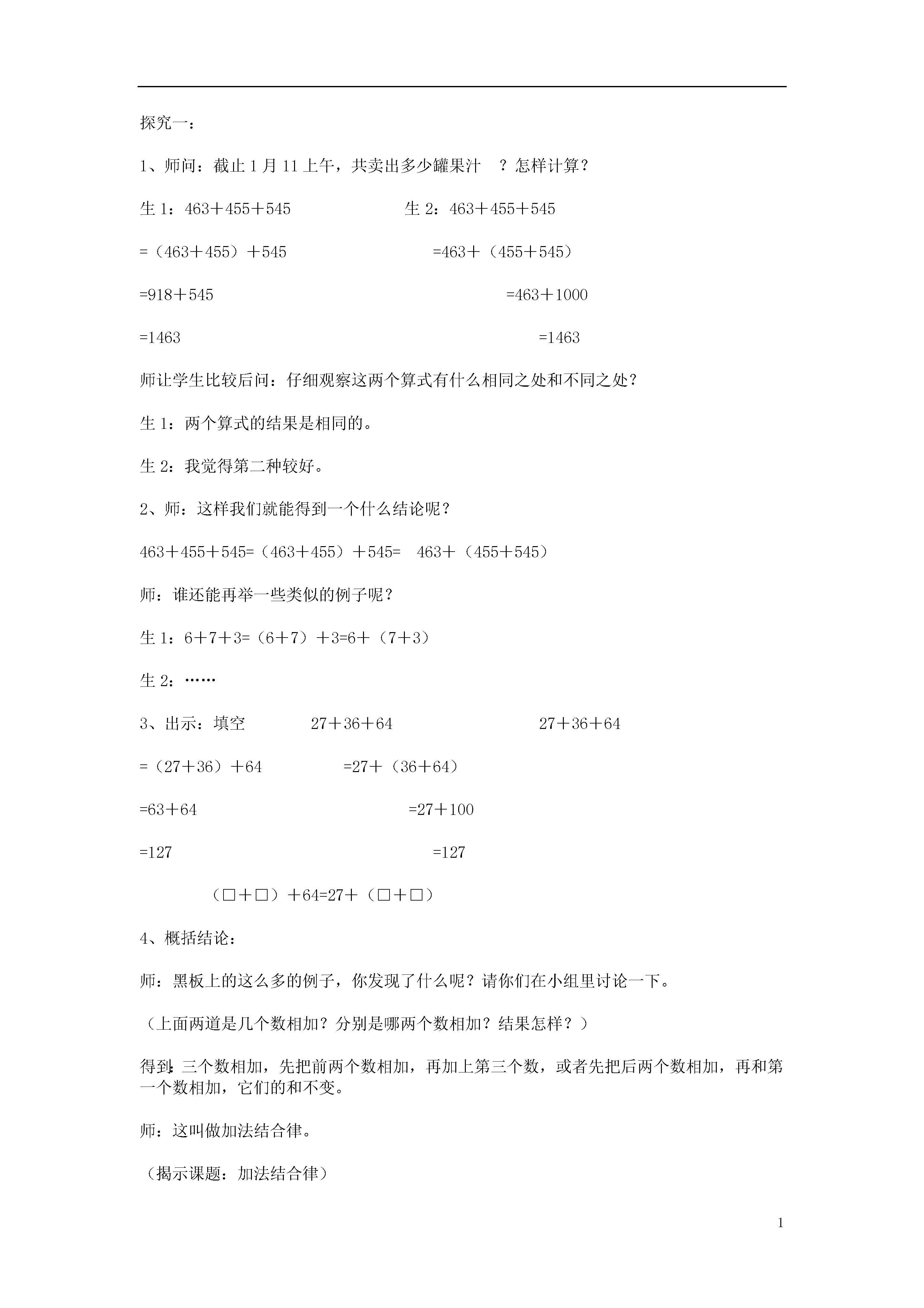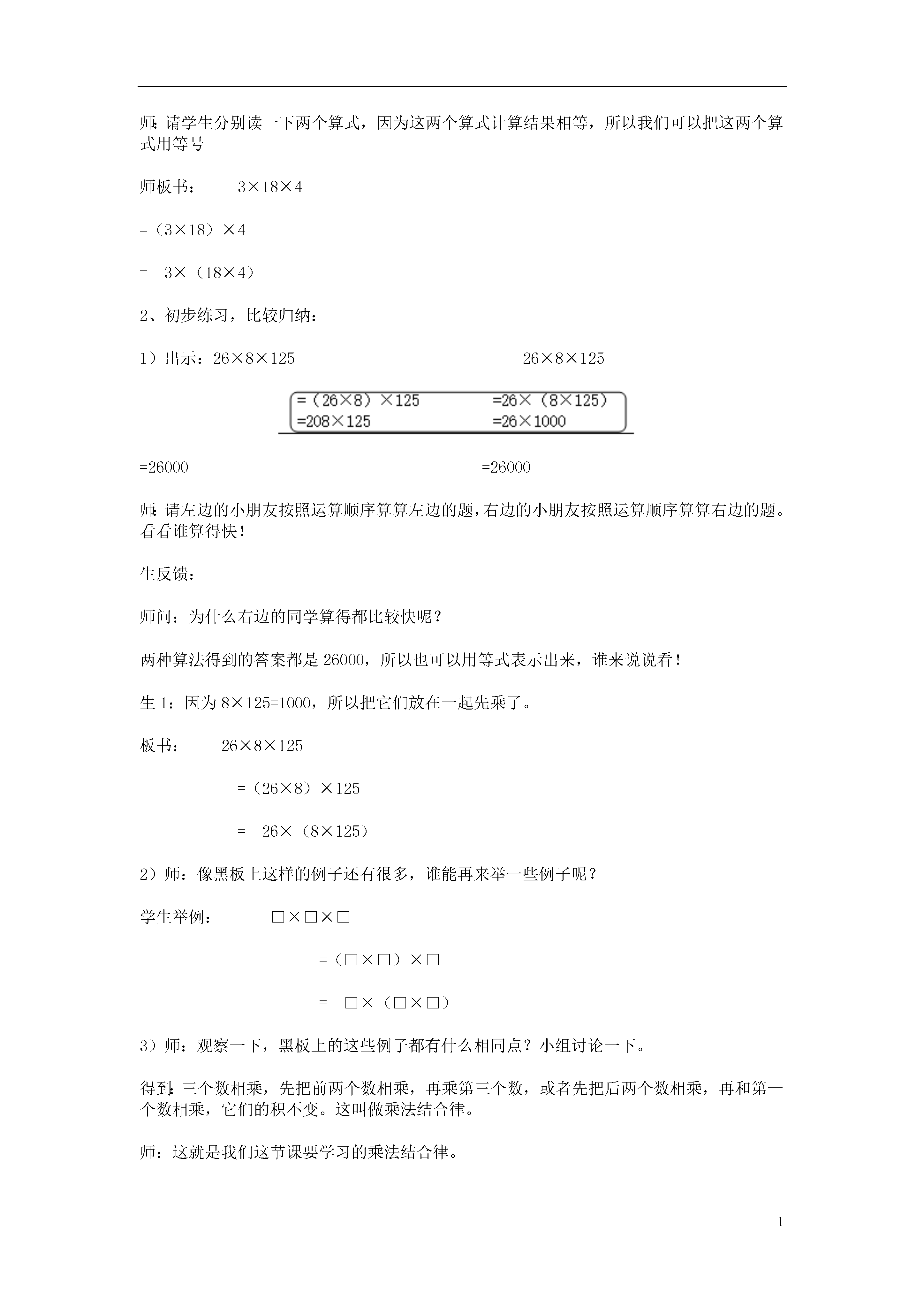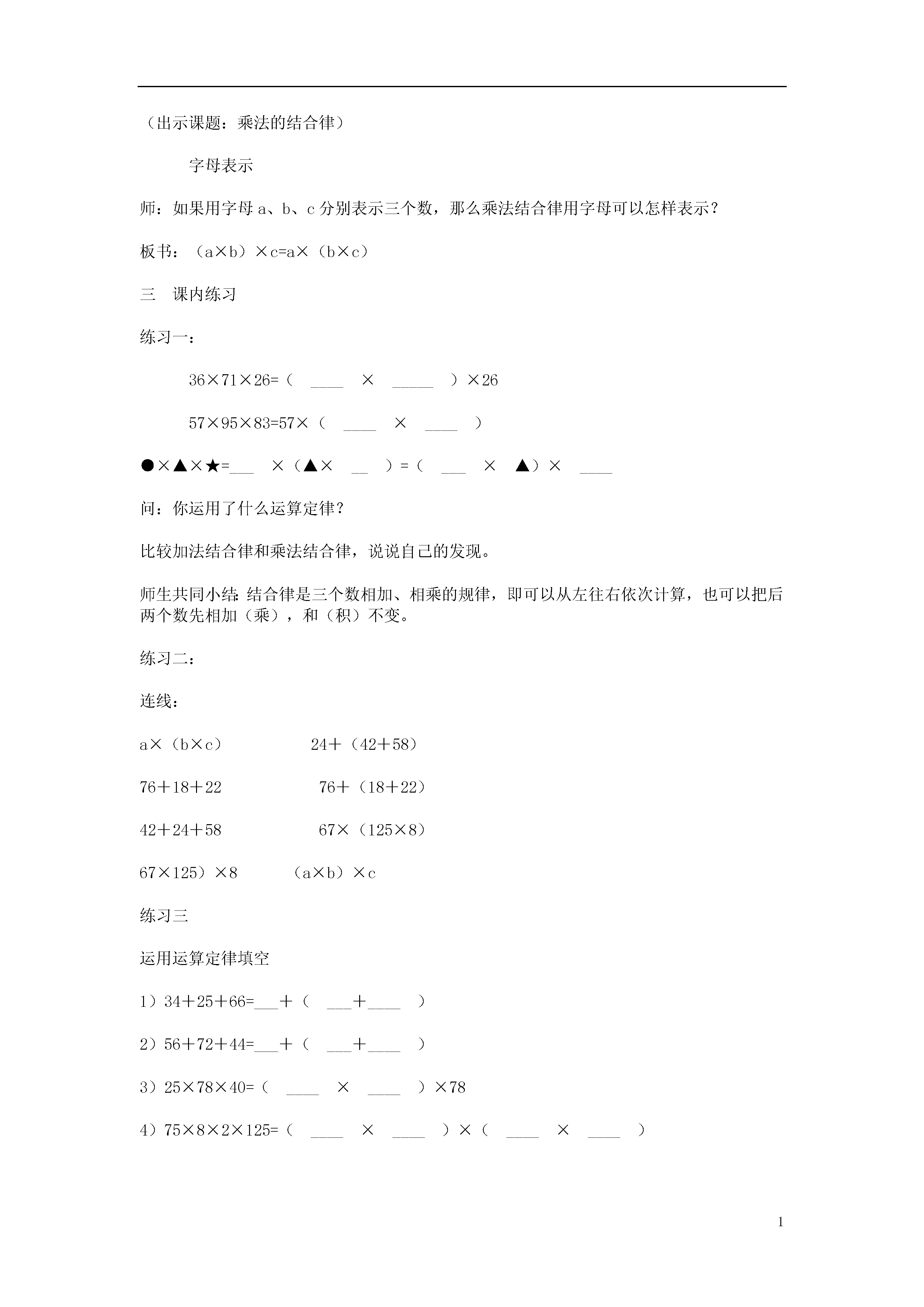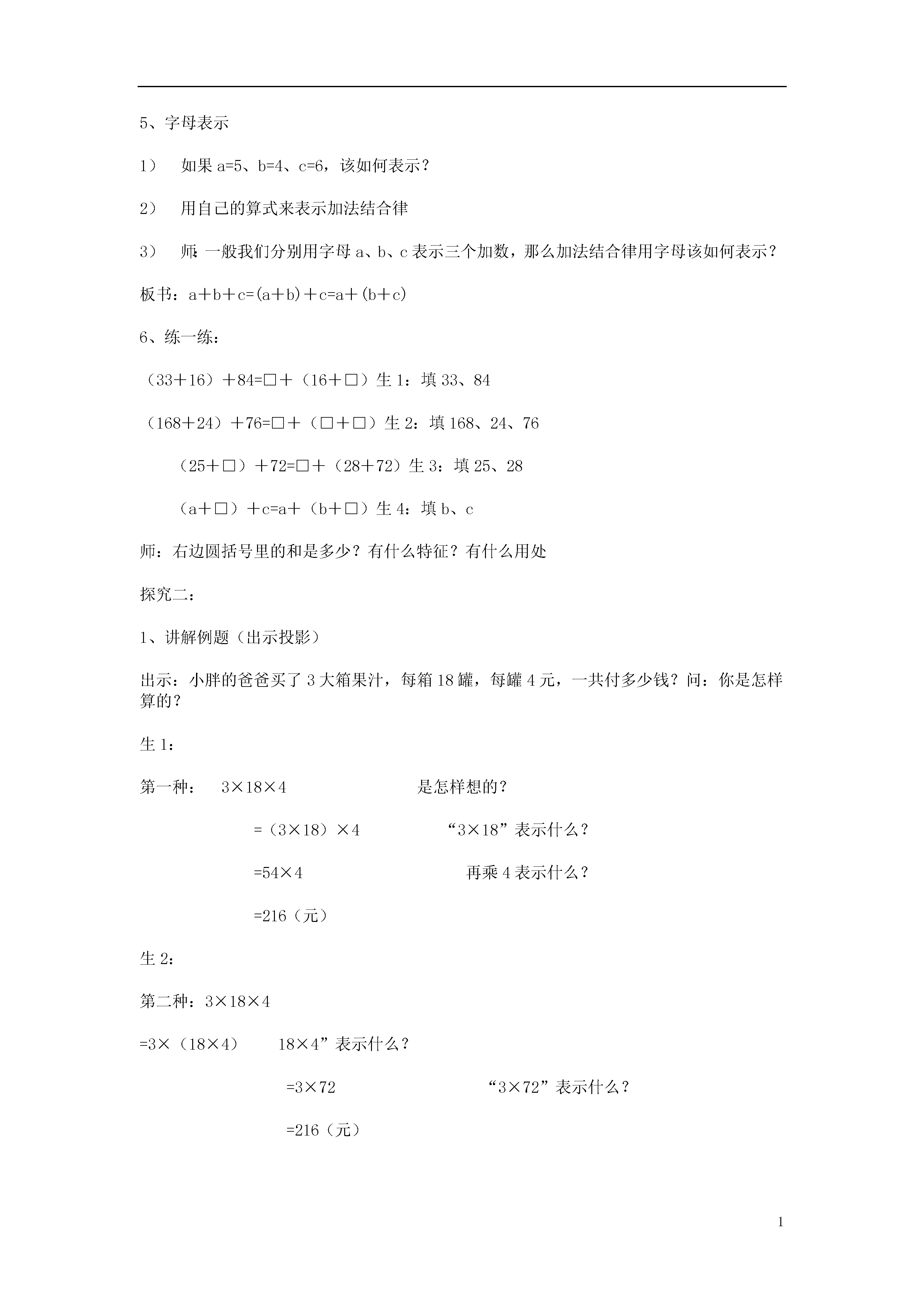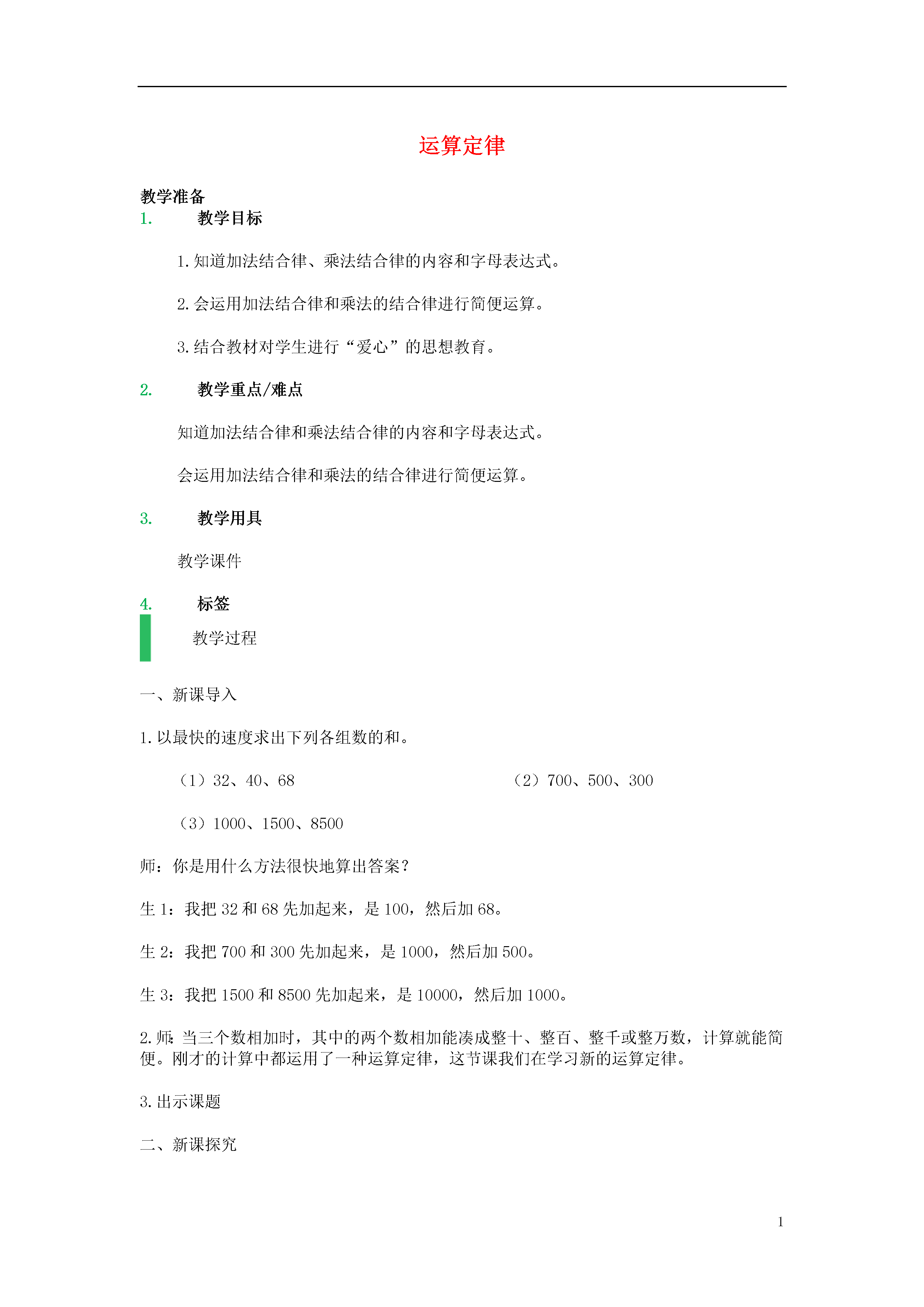 1运算定律教学准备1.教学目标1.知道加法结合律、乘法结合律的内容和字母表达式。2.会运用加法结合律和乘法的结合律进行简便运算。3.结合教材对学生进行“爱心”的思想教育。2.教学重点/难点知道加法结合律和乘法结合律的内容和字母表达式。会运用加法结合律和乘法的结合律进行简便运算。3.教学用具教学课件4.标签教学过程一、新课导入1.以最快的速度求出下列各组数的和。(1)32、40、68(2)700、500、300(3)1000、1500、8500师:你是用什么方法很快地算出答案?生1:我把32和68先加起来,是100,然后加68。生2:我把700和300先加起来,是1000,然后加500。生3:我把1500和8500先加起来,是10000,然后加1000。2.师:当三个数相加时,其中的两个数相加能凑成整十、整百、整千或整万数,计算就能简便。刚才的计算中都运用了一种运算定律,这节课我们在学习新的运算定律。3.出示课题二、新课探究探究一:1、师问:截止1月11上午,共卖出多少罐果汁?怎样计算?生1:463+455+545生2:463+455+545=(463+455)+545=463+(455+545)=918+545=463+1000=1463=1463师让学生比较后问:仔细观察这两个算式有什么相同之处和不同之处?生1:两个算式的结果是相同的。生2:我觉得第二种较好。2、师:这样我们就能得到一个什么结论呢?463+455+545=(463+455)+545=463+(455+545)师:谁还能再举一些类似的例子呢?生1:6+7+3=(6+7)+3=6+(7+3)生2:……3、出示:填空27+36+6427+36+64=(27+36)+64=27+(36+64)=63+64=27+100=127=127(□+□)+64=27+(□+□)4、概括结论:师:黑板上的这么多的例子,你发现了什么呢?请你们在小组里讨论一下。(上面两道是几个数相加?分别是哪两个数相加?结果怎样?)得到:三个数相加,先把前两个数相加,再加上第三个数,或者先把后两个数相加,再和第一个数相加,它们的和不变。师:这叫做加法结合律。(揭示课题:加法结合律)5、字母表示1)如果a=5、b=4、c=6,该如何表示?2)用自己的算式来表示加法结合律3)师:一般我们分别用字母a、b、c表示三个加数,那么加法结合律用字母该如何表示?板书:a+b+c=(a+b)+c=a+(b+c)6、练一练:(33+16)+84=□+(16+□)生1:填33、84(168+24)+76=□+(□+□)生2:填168、24、76(25+□)+72=□+(28+72)生3:填25、28(a+□)+c=a+(b+□)生4:填b、c师:右边圆括号里的和是多少?有什么特征?有什么用处探究二:1、讲解例题(出示投影)出示:小胖的爸爸买了3大箱果汁,每箱18罐,每罐4元,一共付多少钱?问:你是怎样算的?生1:第一种:3×18×4是怎样想的?=(3×18)×4“3×18”表示什么?=54×4再乘4表示什么?=216(元)生2:第二种:3×18×4=3×(18×4)18×4”表示什么?=3×72“3×72”表示什么?=216(元)师:请学生分别读一下两个算式,因为这两个算式计算结果相等,所以我们可以把这两个算式用等号师板书:3×18×4=(3×18)×4=3×(18×4)2、初步练习,比较归纳:1)出示:26×8×12526×8×125=26000=26000师:请左边的小朋友按照运算顺序算算左边的题,右边的小朋友按照运算顺序算算右边的题。看看谁算得快!生反馈:师问:为什么右边的同学算得都比较快呢?两种算法得到的答案都是26000,所以也可以用等式表示出来,谁来说说看!生1:因为8×125=1000,所以把它们放在一起先乘了。板书:26×8×125=(26×8)×125=26×(