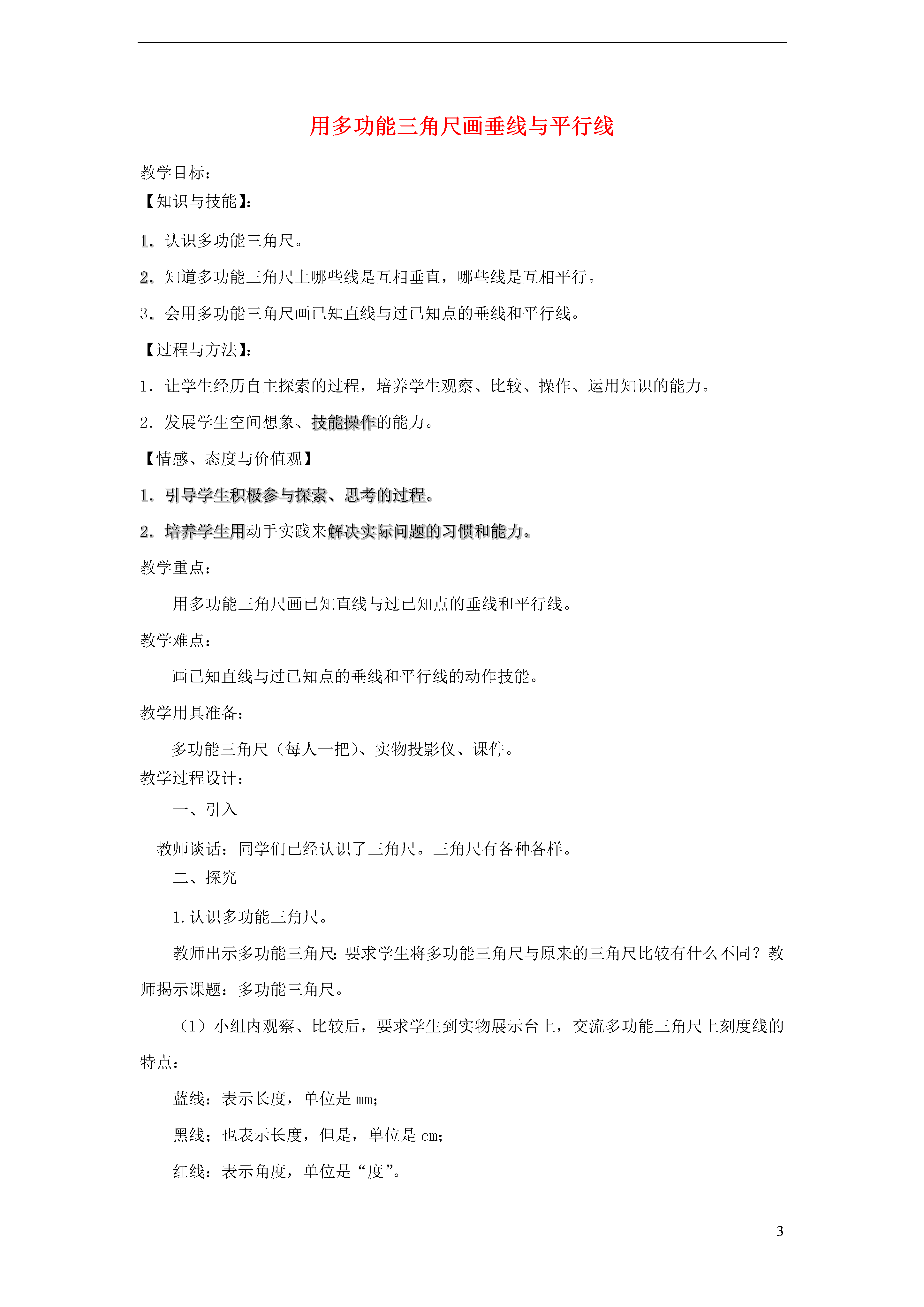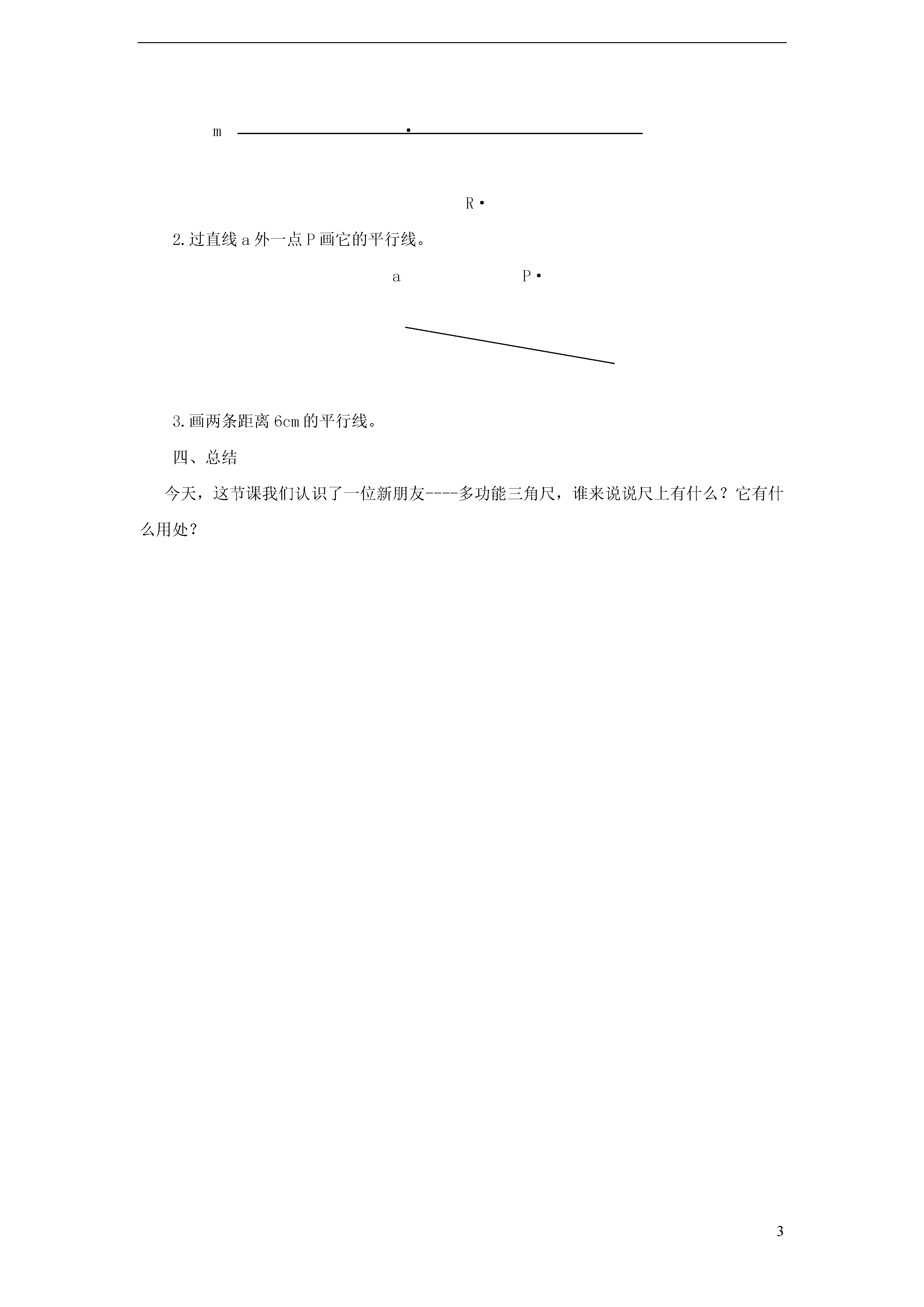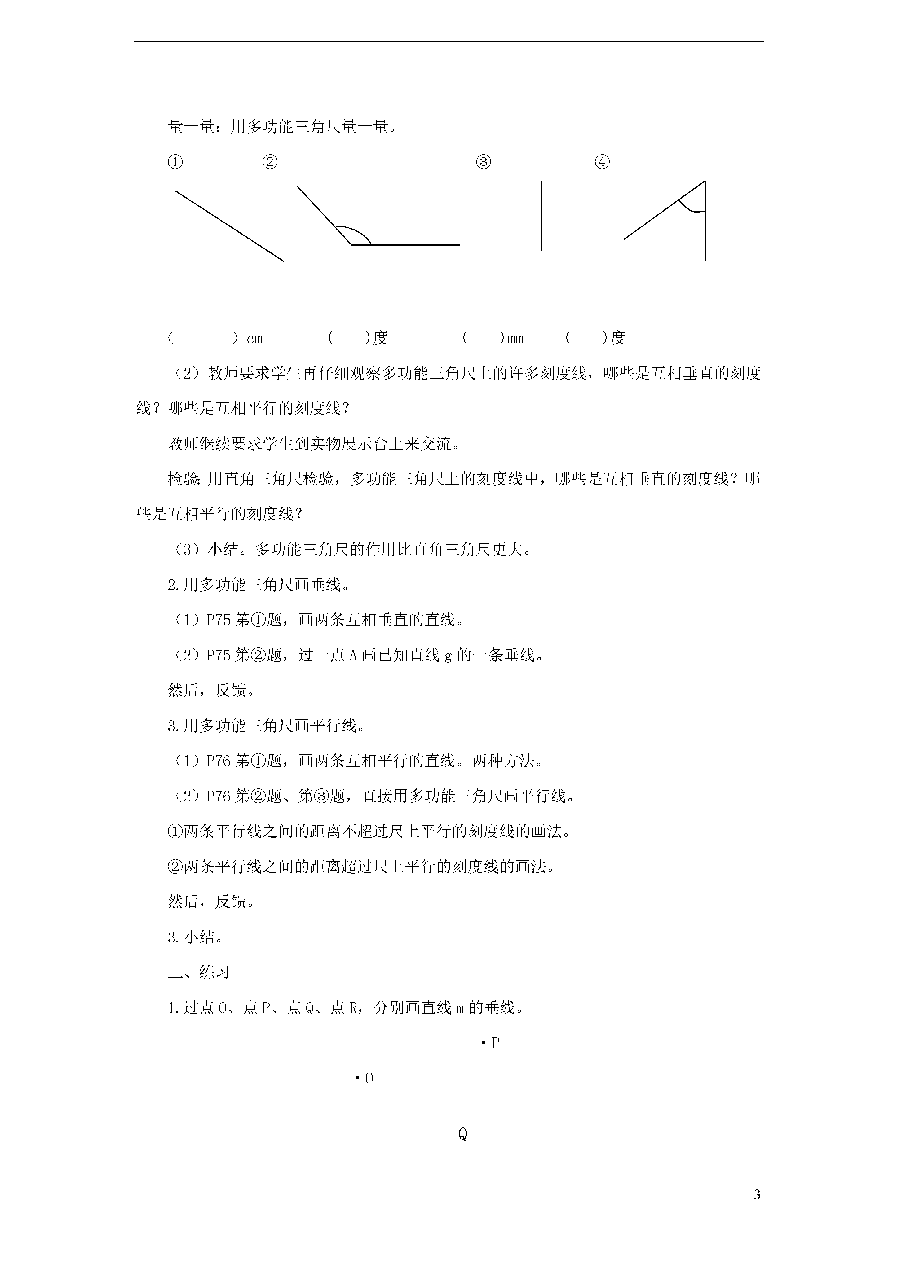 3用多功能三角尺画垂线与平行线教学目标:【知识与技能】:1.认识多功能三角尺。2.知道多功能三角尺上哪些线是互相垂直,哪些线是互相平行。3.会用多功能三角尺画已知直线与过已知点的垂线和平行线。【过程与方法】:1.让学生经历自主探索的过程,培养学生观察、比较、操作、运用知识的能力。2.发展学生空间想象、技能操作的能力。【情感、态度与价值观】1.引导学生积极参与探索、思考的过程。2.培养学生用动手实践来解决实际问题的习惯和能力。教学重点:用多功能三角尺画已知直线与过已知点的垂线和平行线。教学难点:画已知直线与过已知点的垂线和平行线的动作技能。教学用具准备:多功能三角尺(每人一把)、实物投影仪、课件。教学过程设计:一、引入教师谈话:同学们已经认识了三角尺。三角尺有各种各样。二、探究1.认识多功能三角尺。教师出示多功能三角尺:要求学生将多功能三角尺与原来的三角尺比较有什么不同?教师揭示课题:多功能三角尺。(1)小组内观察、比较后,要求学生到实物展示台上,交流多功能三角尺上刻度线的特点:蓝线:表示长度,单位是mm;黑线;也表示长度,但是,单位是cm;红线:表示角度,单位是“度”。量一量:用多功能三角尺量一量。①②③④()cm()度()mm()度(2)教师要求学生再仔细观察多功能三角尺上的许多刻度线,哪些是互相垂直的刻度线?哪些是互相平行的刻度线?教师继续要求学生到实物展示台上来交流。检验:用直角三角尺检验,多功能三角尺上的刻度线中,哪些是互相垂直的刻度线?哪些是互相平行的刻度线?(3)小结。多功能三角尺的作用比直角三角尺更大。2.用多功能三角尺画垂线。(1)P75第①题,画两条互相垂直的直线。(2)P75第②题,过一点A画已知直线g的一条垂线。然后,反馈。3.用多功能三角尺画平行线。(1)P76第①题,画两条互相平行的直线。两种方法。(2)P76第②题、第③题,直接用多功能三角尺画平行线。①两条平行线之间的距离不超过尺上平行的刻度线的画法。②两条平行线之间的距离超过尺上平行的刻度线的画法。然后,反馈。3.小结。三、练习1.过点O、点P、点Q、点R,分别画直线m的垂线。·P·OQm·R·2.过直线a外一点P画它的平行线。aP·3.画两条距离6cm的平行线。四、总结今天,这节课我们认识了一位新朋友----多功能三角尺,谁来说说尺上有什么?它有什么用处?