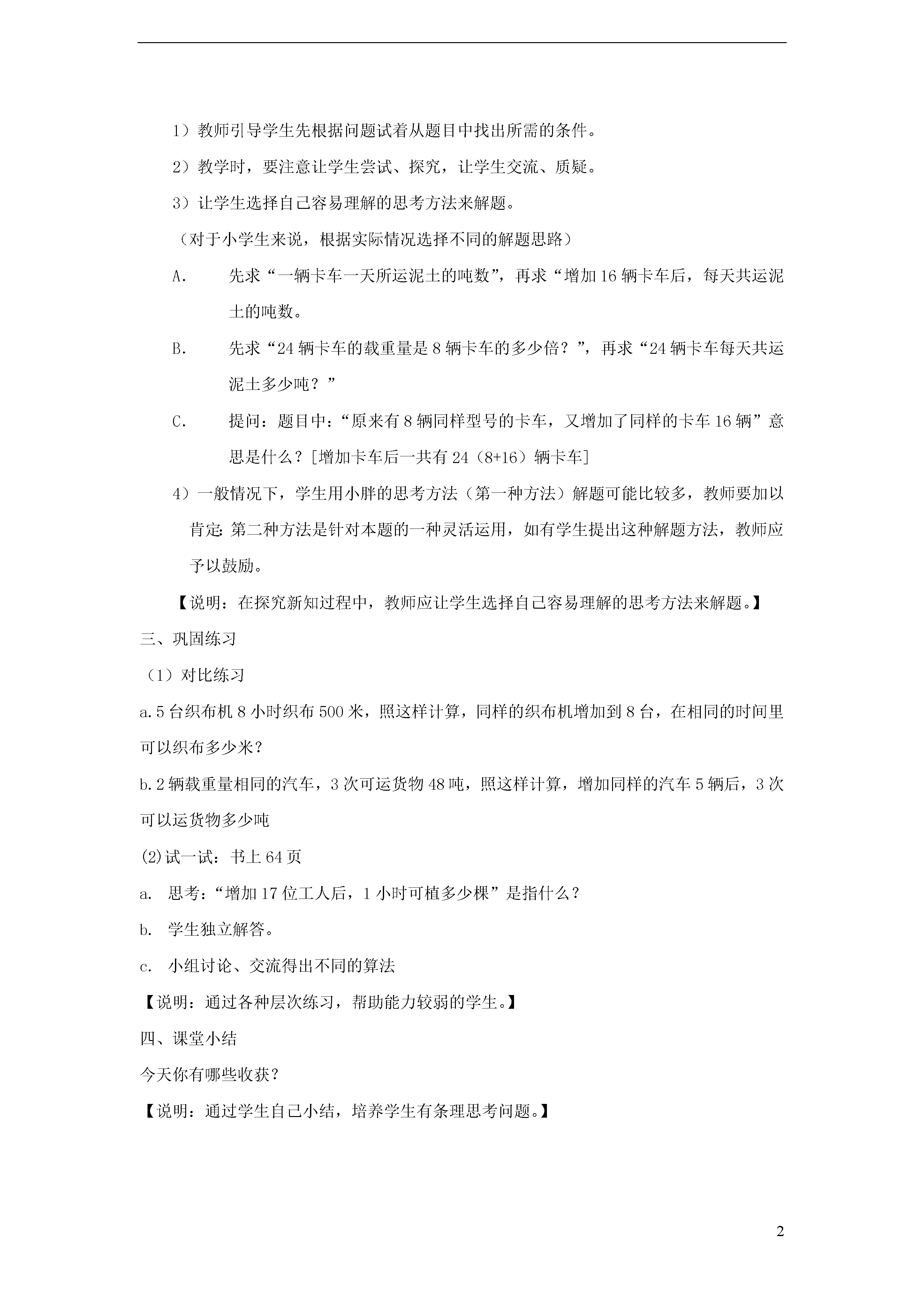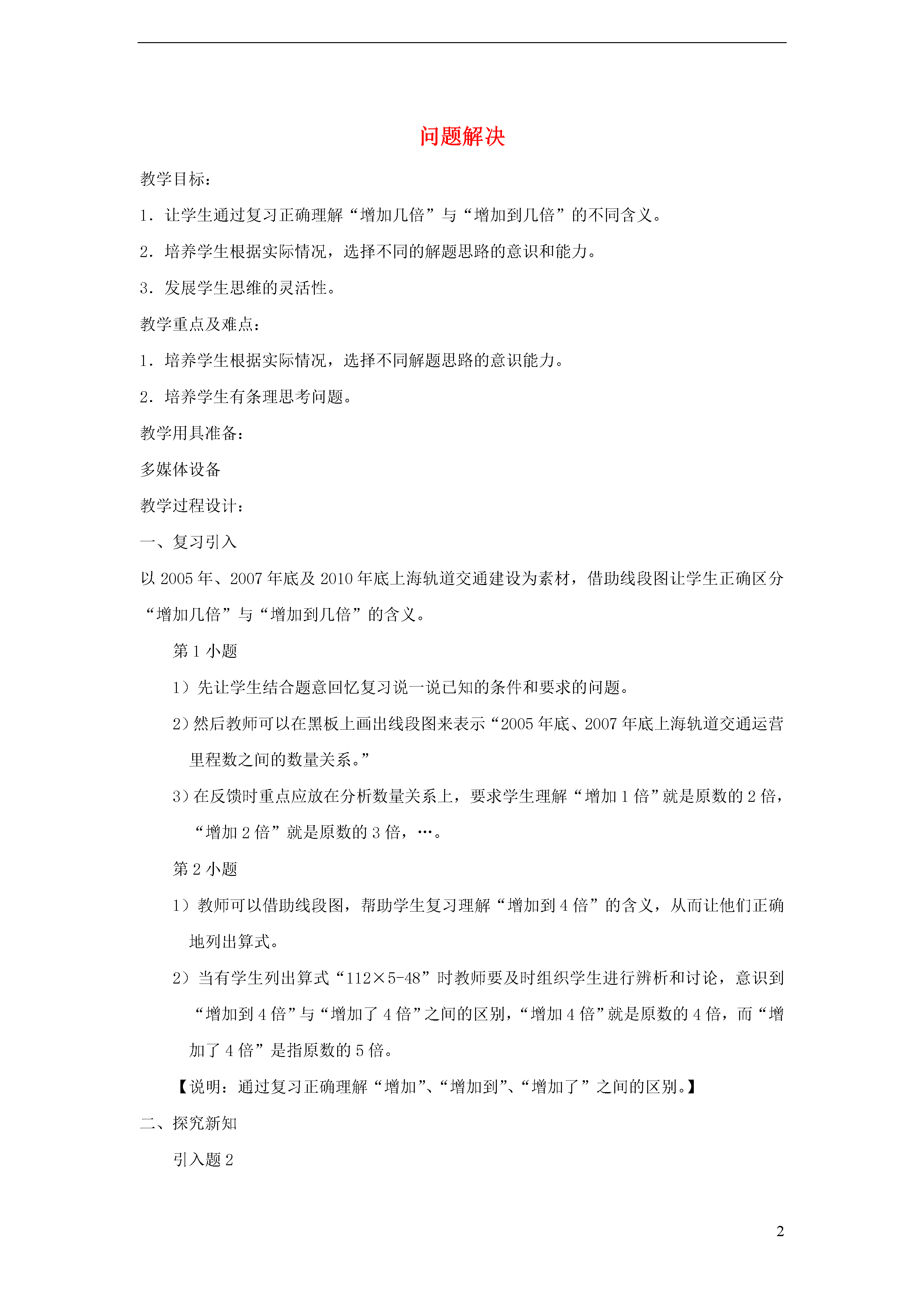 2问题解决教学目标:1.让学生通过复习正确理解“增加几倍”与“增加到几倍”的不同含义。2.培养学生根据实际情况,选择不同的解题思路的意识和能力。3.发展学生思维的灵活性。教学重点及难点:1.培养学生根据实际情况,选择不同解题思路的意识能力。2.培养学生有条理思考问题。教学用具准备:多媒体设备教学过程设计:一、复习引入以2005年、2007年底及2010年底上海轨道交通建设为素材,借助线段图让学生正确区分“增加几倍”与“增加到几倍”的含义。第1小题1)先让学生结合题意回忆复习说一说已知的条件和要求的问题。2)然后教师可以在黑板上画出线段图来表示“2005年底、2007年底上海轨道交通运营里程数之间的数量关系。”3)在反馈时重点应放在分析数量关系上,要求学生理解“增加1倍”就是原数的2倍,“增加2倍”就是原数的3倍,…。第2小题1)教师可以借助线段图,帮助学生复习理解“增加到4倍”的含义,从而让他们正确地列出算式。2)当有学生列出算式“112×5-48”时教师要及时组织学生进行辨析和讨论,意识到“增加到4倍”与“增加了4倍”之间的区别,“增加4倍”就是原数的4倍,而“增加了4倍”是指原数的5倍。【说明:通过复习正确理解“增加”、“增加到”、“增加了”之间的区别。】二、探究新知引入题21)教师引导学生先根据问题试着从题目中找出所需的条件。2)教学时,要注意让学生尝试、探究,让学生交流、质疑。3)让学生选择自己容易理解的思考方法来解题。(对于小学生来说,根据实际情况选择不同的解题思路)先求“一辆卡车一天所运泥土的吨数”,再求“增加16辆卡车后,每天共运泥土的吨数。先求“24辆卡车的载重量是8辆卡车的多少倍?”,再求“24辆卡车每天共运泥土多少吨?”提问:题目中:“原来有8辆同样型号的卡车,又增加了同样的卡车16辆”意思是什么?[增加卡车后一共有24(8+16)辆卡车]4)一般情况下,学生用小胖的思考方法(第一种方法)解题可能比较多,教师要加以肯定:第二种方法是针对本题的一种灵活运用,如有学生提出这种解题方法,教师应予以鼓励。【说明:在探究新知过程中,教师应让学生选择自己容易理解的思考方法来解题。】三、巩固练习(1)对比练习a.5台织布机8小时织布500米,照这样计算,同样的织布机增加到8台,在相同的时间里可以织布多少米?b.2辆载重量相同的汽车,3次可运货物48吨,照这样计算,增加同样的汽车5辆后,3次可以运货物多少吨(2)试一试:书上64页思考:“增加17位工人后,1小时可植多少棵”是指什么?学生独立解答。小组讨论、交流得出不同的算法【说明:通过各种层次练习,帮助能力较弱的学生。】四、课堂小结今天你有哪些收获?【说明:通过学生自己小结,培养学生有条理思考问题。】