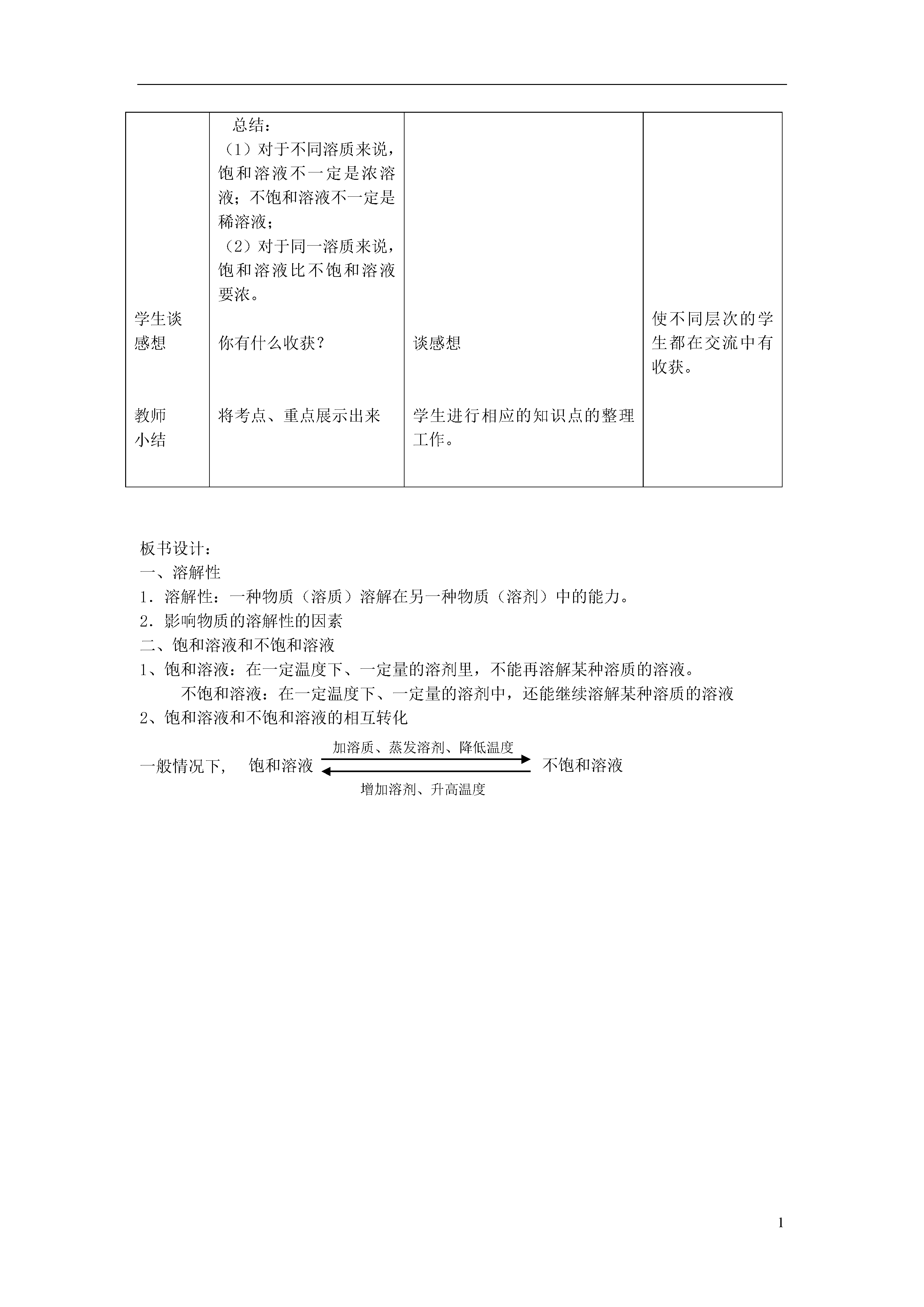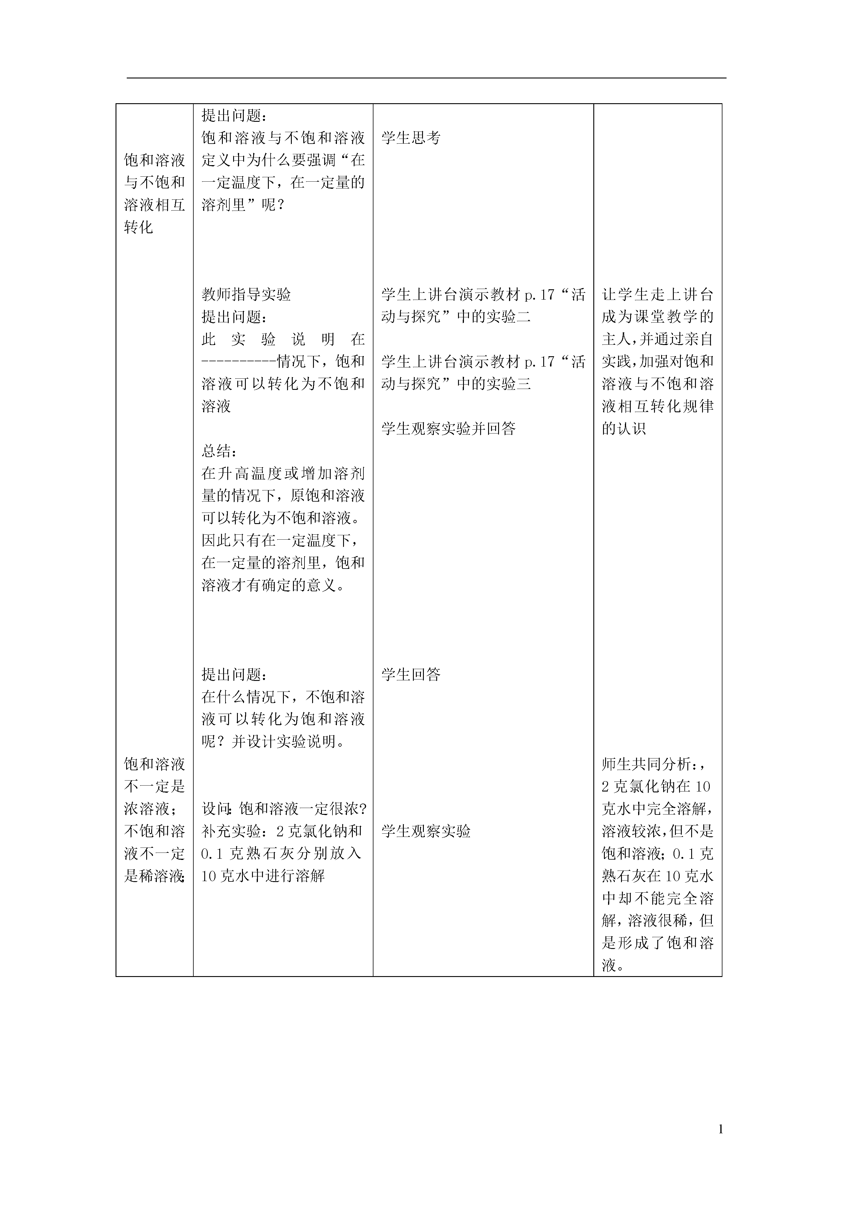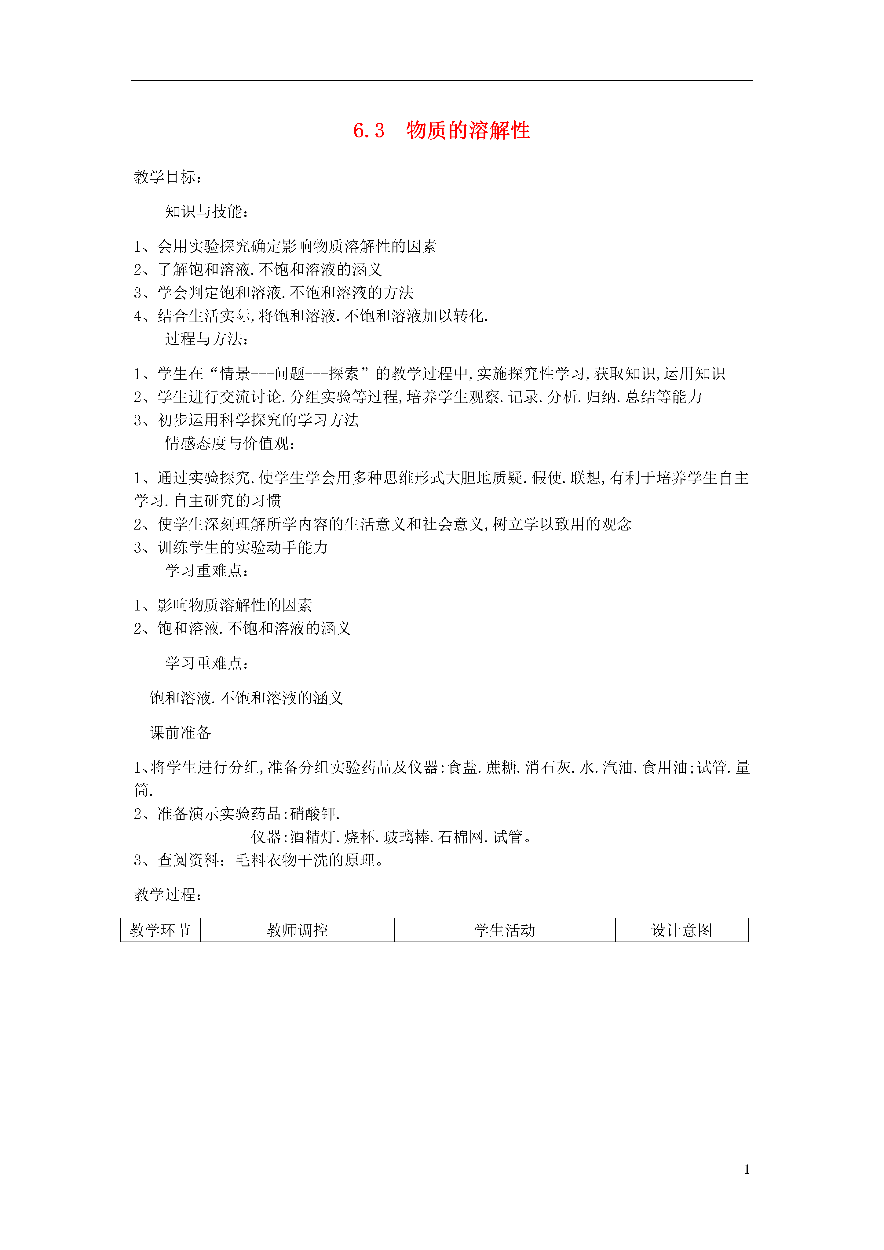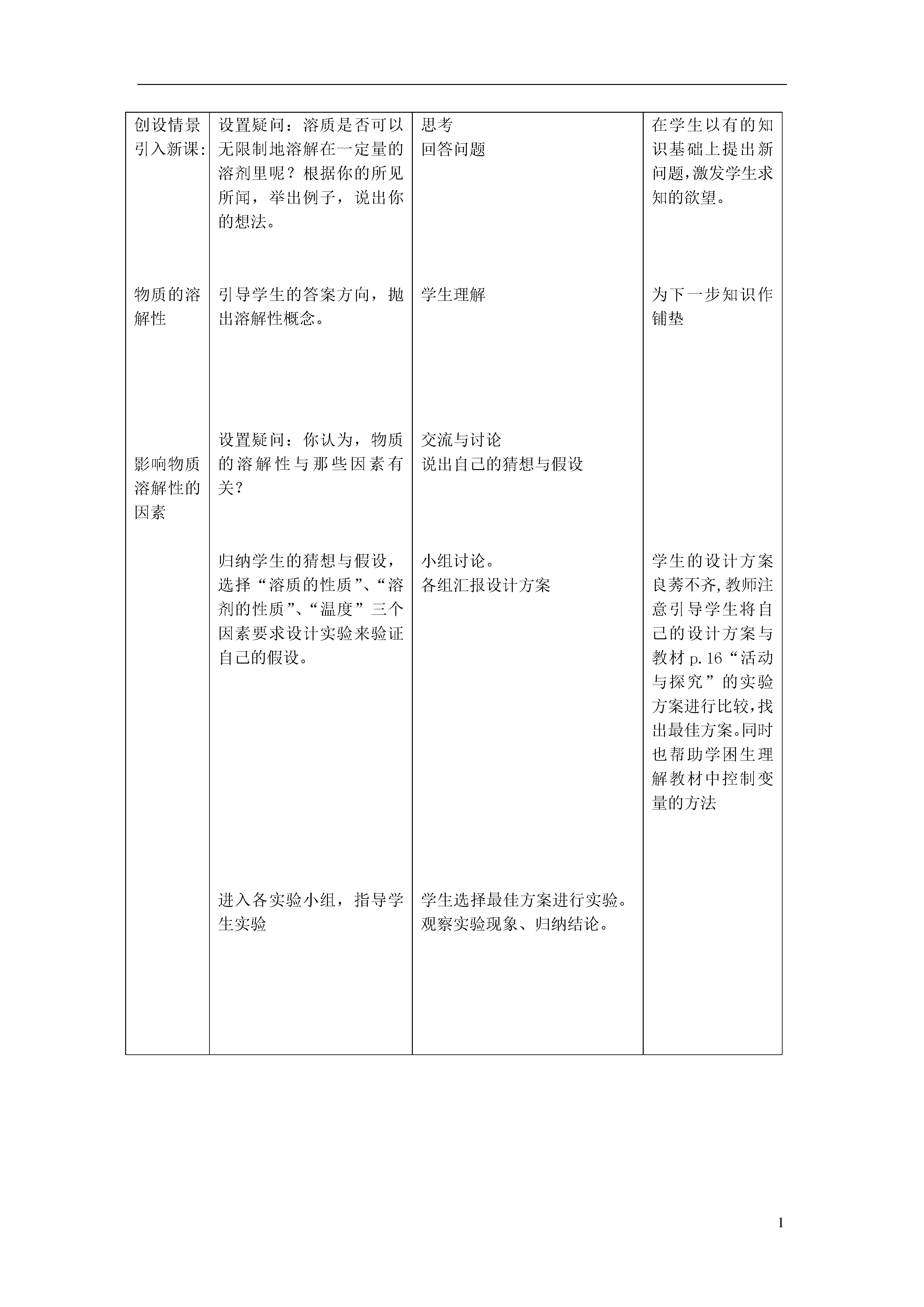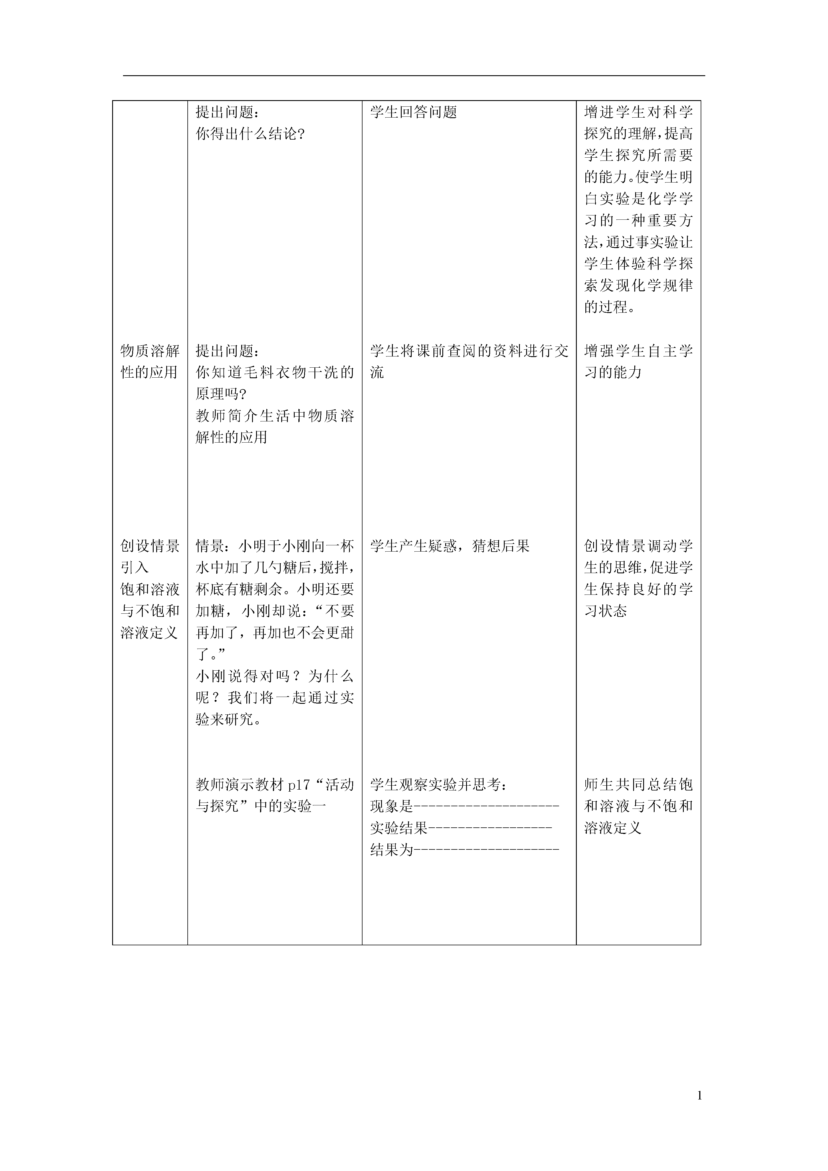 16.3物质的溶解性教学目标:知识与技能:1、会用实验探究确定影响物质溶解性的因素2、了解饱和溶液.不饱和溶液的涵义3、学会判定饱和溶液.不饱和溶液的方法4、结合生活实际,将饱和溶液.不饱和溶液加以转化.过程与方法:1、学生在“情景---问题---探索”的教学过程中,实施探究性学习,获取知识,运用知识2、学生进行交流讨论.分组实验等过程,培养学生观察.记录.分析.归纳.总结等能力3、初步运用科学探究的学习方法情感态度与价值观:1、通过实验探究,使学生学会用多种思维形式大胆地质疑.假使.联想,有利于培养学生自主学习.自主研究的习惯2、使学生深刻理解所学内容的生活意义和社会意义,树立学以致用的观念3、训练学生的实验动手能力学习重难点:1、影响物质溶解性的因素2、饱和溶液.不饱和溶液的涵义学习重难点:饱和溶液.不饱和溶液的涵义课前准备1、将学生进行分组,准备分组实验药品及仪器:食盐.蔗糖.消石灰.水.汽油.食用油;试管.量筒.2、准备演示实验药品:硝酸钾.仪器:酒精灯.烧杯.玻璃棒.石棉网.试管。3、查阅资料:毛料衣物干洗的原理。教学过程:教学环节教师调控学生活动设计意图创设情景引入新课:物质的溶解性影响物质溶解性的因素设置疑问:溶质是否可以无限制地溶解在一定量的溶剂里呢?根据你的所见所闻,举出例子,说出你的想法。引导学生的答案方向,抛出溶解性概念。设置疑问:你认为,物质的溶解性与那些因素有关?归纳学生的猜想与假设,选择“溶质的性质”、“溶剂的性质”、“温度”三个因素要求设计实验来验证自己的假设。进入各实验小组,指导学生实验思考回答问题学生理解交流与讨论说出自己的猜想与假设小组讨论。各组汇报设计方案学生选择最佳方案进行实验。观察实验现象、归纳结论。在学生以有的知识基础上提出新问题,激发学生求知的欲望。为下一步知识作铺垫学生的设计方案良莠不齐,教师注意引导学生将自己的设计方案与教材p.16“活动与探究”的实验方案进行比较,找出最佳方案。同时也帮助学困生理解教材中控制变量的方法物质溶解性的应用创设情景引入饱和溶液与不饱和溶液定义提出问题:你得出什么结论?提出问题:你知道毛料衣物干洗的原理吗?教师简介生活中物质溶解性的应用情景:小明于小刚向一杯水中加了几勺糖后,搅拌,杯底有糖剩余。小明还要加糖,小刚却说:“不要再加了,再加也不会更甜了。”小刚说得对吗?为什么呢?我们将一起通过实验来研究。教师演示教材p17“活动与探究”中的实验一学生回答问题学生将课前查阅的资料进行交流学生产生疑惑,猜想后果学生观察实验并思考:现象是--------------------实验结果-----------------结果为--------------------增进学生对科学探究的理解,提高学生探究所需要的能力。使学生明白实验是化学学习的一种重要方法,通过事实验让学生体验科学探索发现化学规律的过程。增强学生自主学习的能力创设情景调动学生的思维,促进学生保持良好的学习状态师生共同总结饱和溶液与不饱和溶液定义饱和溶液与不饱和溶液相互转化饱和溶液不一定是浓溶液;不饱和溶液不一定是稀溶液;提出问题:饱和溶液与不饱和溶液定义中为什么要强调“在一定温度下,在一定量的溶剂里”呢?教师指导实验提出问题:此实验说明在----------情况下,饱和溶液可以转化为不饱和溶液总结:在升高温度或增加溶剂量的情况下,原饱和溶液可以转化为不饱和溶液。因此只有在一定温度下,在一定量的溶剂里,饱和溶液才有确定的意义。提出问题:在什么情况下,不饱和溶液可以转化为饱和溶液呢?并设计实验说明。设问:饱和溶液一定很浓?补充实验:2克氯化钠和0.1克熟石灰分别放入10克水中进行溶解学生思考学生上讲台演示教材p.17“活动与探究”中的实验二学生上讲台演示教材p.17“活动与探究”中的实验三学生观察实验并回答学生回答学生观察实验让学生走上讲台成为课堂教学的主人,并通过亲自实践,加强对饱和溶液与不饱和溶液相互转化规律的认识师生共同分析:,2克氯化钠在10克水中完全溶解,溶液较浓,