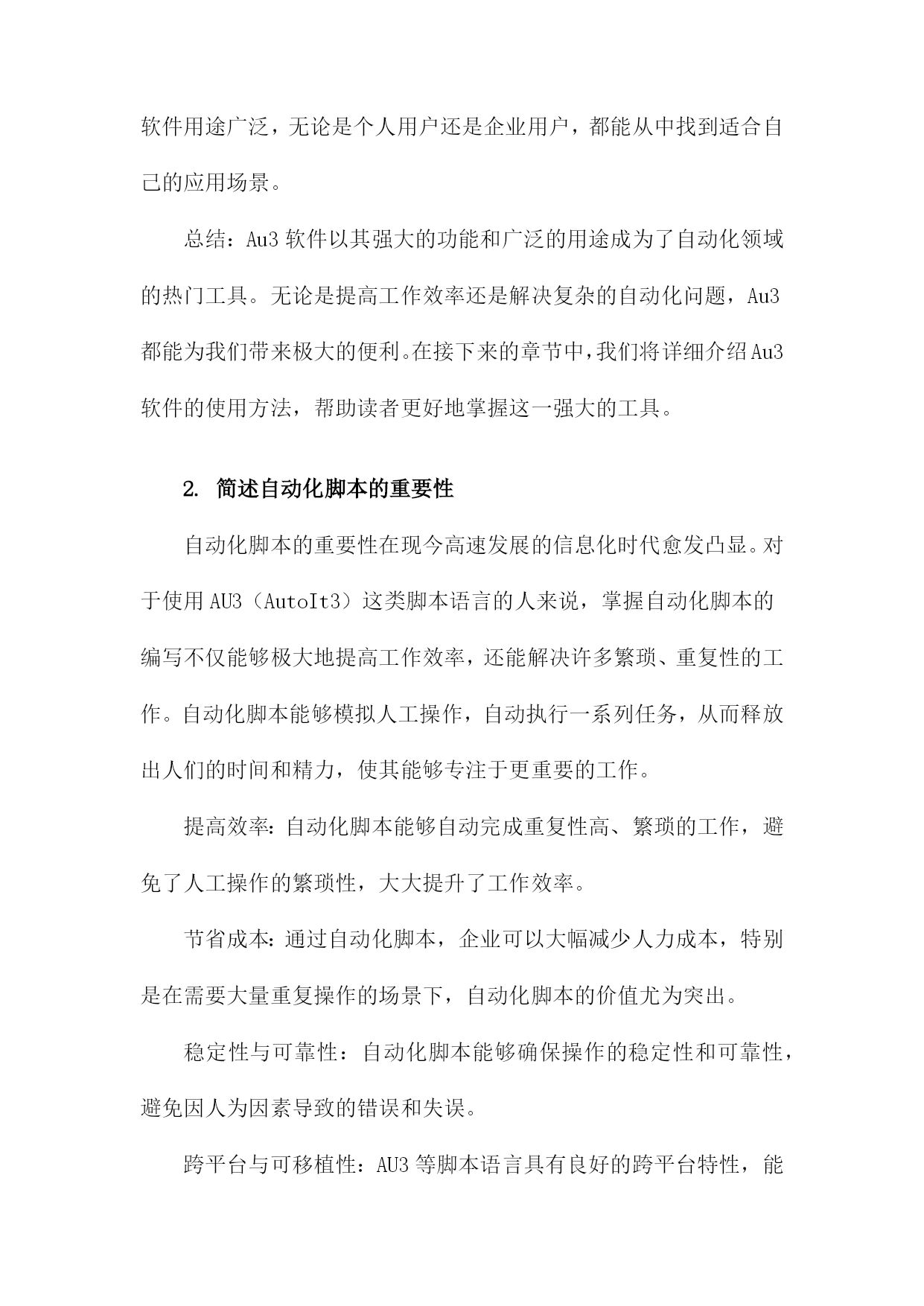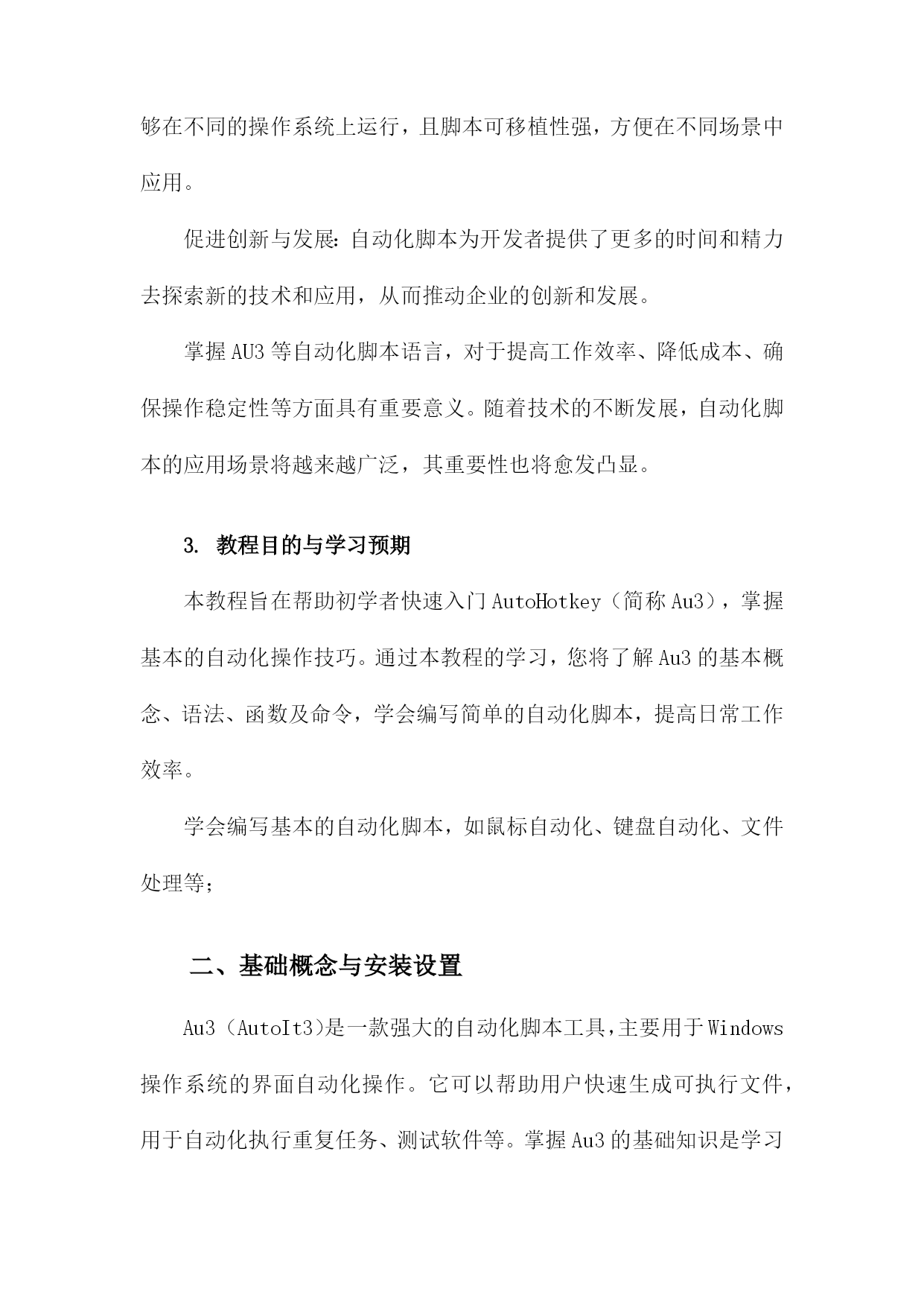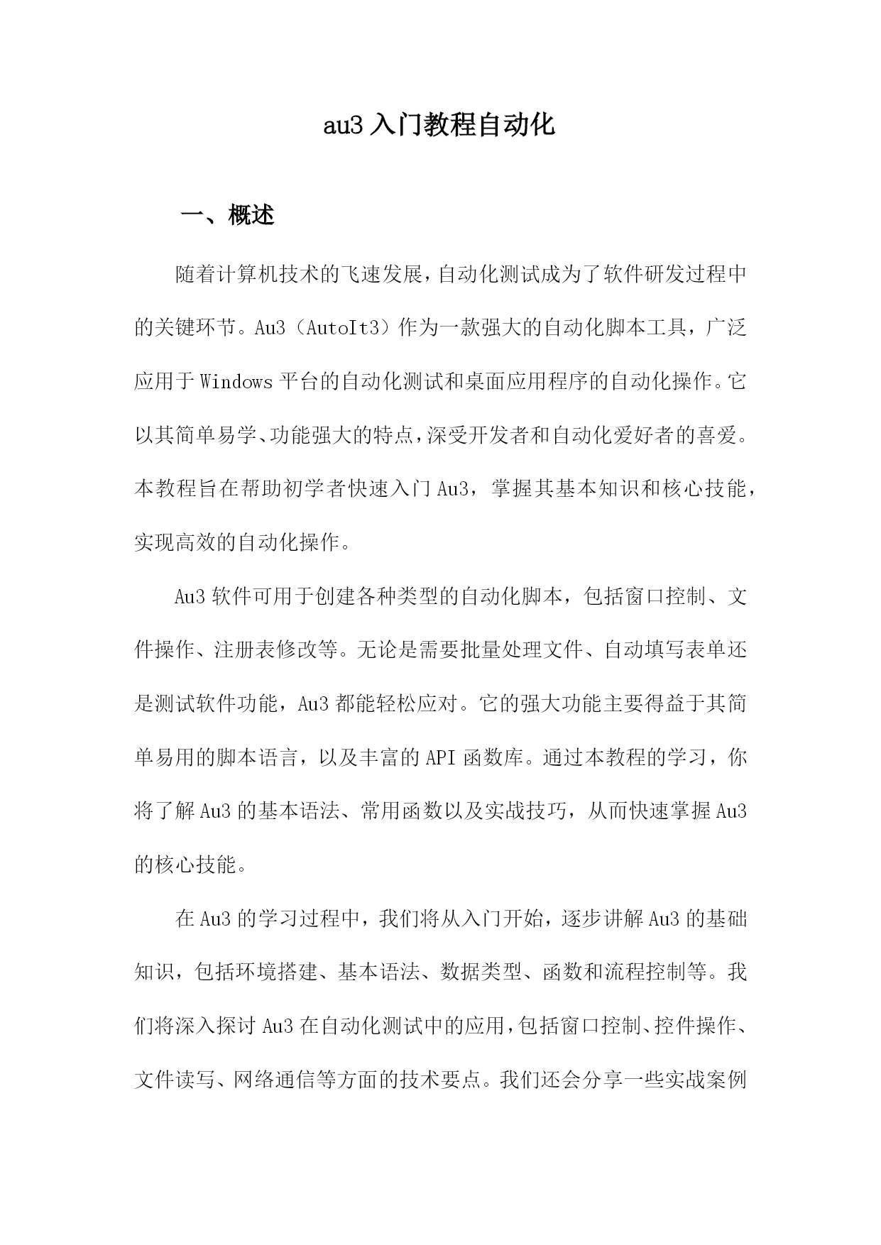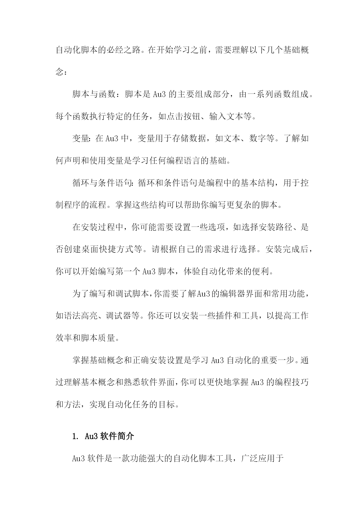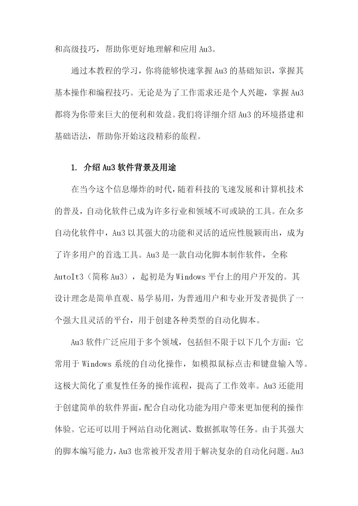 au3入门教程自动化一、概述随着计算机技术的飞速发展,自动化测试成为了软件研发过程中的关键环节。Au3(AutoIt3)作为一款强大的自动化脚本工具,广泛应用于Windows平台的自动化测试和桌面应用程序的自动化操作。它以其简单易学、功能强大的特点,深受开发者和自动化爱好者的喜爱。本教程旨在帮助初学者快速入门Au3,掌握其基本知识和核心技能,实现高效的自动化操作。Au3软件可用于创建各种类型的自动化脚本,包括窗口控制、文件操作、注册表修改等。无论是需要批量处理文件、自动填写表单还是测试软件功能,Au3都能轻松应对。它的强大功能主要得益于其简单易用的脚本语言,以及丰富的API函数库。通过本教程的学习,你将了解Au3的基本语法、常用函数以及实战技巧,从而快速掌握Au3的核心技能。在Au3的学习过程中,我们将从入门开始,逐步讲解Au3的基础知识,包括环境搭建、基本语法、数据类型、函数和流程控制等。我们将深入探讨Au3在自动化测试中的应用,包括窗口控制、控件操作、文件读写、网络通信等方面的技术要点。我们还会分享一些实战案例和高级技巧,帮助你更好地理解和应用Au3。通过本教程的学习,你将能够快速掌握Au3的基础知识,掌握其基本操作和编程技巧。无论是为了工作需求还是个人兴趣,掌握Au3都将为你带来巨大的便利和效益。我们将详细介绍Au3的环境搭建和基础语法,帮助你开始这段精彩的旅程。1.介绍Au3软件背景及用途在当今这个信息爆炸的时代,随着科技的飞速发展和计算机技术的普及,自动化软件已成为许多行业和领域不可或缺的工具。在众多自动化软件中,Au3以其强大的功能和灵活的适应性脱颖而出,成为了许多用户的首选工具。Au3是一款自动化脚本制作软件,全称AutoIt3(简称Au3),起初是为Windows平台上的用户开发的。其设计理念是简单直观、易学易用,为普通用户和专业开发者提供了一个强大且灵活的平台,用于创建各种类型的自动化脚本。Au3软件广泛应用于多个领域,包括但不限于以下几个方面:它常用于Windows系统的自动化操作,如模拟鼠标点击和键盘输入等。这极大简化了重复性任务的操作流程,提高了工作效率。Au3还能用于创建简单的软件界面,配合自动化功能为用户带来更加便利的操作体验。它还可以用于网站自动化测试、数据抓取等任务。由于其强大的脚本编写能力,Au3也常被开发者用于解决复杂的自动化问题。Au3软件用途广泛,无论是个人用户还是企业用户,都能从中找到适合自己的应用场景。总结:Au3软件以其强大的功能和广泛的用途成为了自动化领域的热门工具。无论是提高工作效率还是解决复杂的自动化问题,Au3都能为我们带来极大的便利。在接下来的章节中,我们将详细介绍Au3软件的使用方法,帮助读者更好地掌握这一强大的工具。2.简述自动化脚本的重要性自动化脚本的重要性在现今高速发展的信息化时代愈发凸显。对于使用AU3(AutoIt3)这类脚本语言的人来说,掌握自动化脚本的编写不仅能够极大地提高工作效率,还能解决许多繁琐、重复性的工作。自动化脚本能够模拟人工操作,自动执行一系列任务,从而释放出人们的时间和精力,使其能够专注于更重要的工作。提高效率:自动化脚本能够自动完成重复性高、繁琐的工作,避免了人工操作的繁琐性,大大提升了工作效率。节省成本:通过自动化脚本,企业可以大幅减少人力成本,特别是在需要大量重复操作的场景下,自动化脚本的价值尤为突出。稳定性与可靠性:自动化脚本能够确保操作的稳定性和可靠性,避免因人为因素导致的错误和失误。跨平台与可移植性:AU3等脚本语言具有良好的跨平台特性,能够在不同的操作系统上运行,且脚本可移植性强,方便在不同场景中应用。促进创新与发展:自动化脚本为开发者提供了更多的时间和精力去探索新的技术和应用,从而推动企业的创新和发展。掌握AU3等自动化脚本语言,对于提高工作效率、降低成本、确保操作稳定性等方面具有重要意义。随着技术的不断发展,自动化脚本的应用场景将越来越广泛,其重要性也将愈发凸显。3.教程目的与学习预期本教程旨在帮助初学者快速入门AutoHotkey(简称Au3),掌握基本的自动化操作技巧。通过本教程的学习,您将了解Au3的基本概念、语法、函数及命令,学会编写简单的自动化脚本,提高日常工作效率。学会编写基本的自动化脚本,如鼠标自动化、键盘自动化、文件处理等;二、基础概念与安装设置Au3(AutoIt3)是一款强大的自动化脚本工具,主要用于Windows操作系统的界面自动化操作。它可以帮助用户快速生成可执行文件,用于自动化执行重复任务、测试软件等。掌握Au3的基础知识是学习自动化脚本的必经之路。在开始学习之前,需要理解以下几个基础概念:脚本与函数:脚本是Au3的主要组成部分,由一系列函数组成。每个函数执行特定的任务,如点击按钮、输入文本等。变量