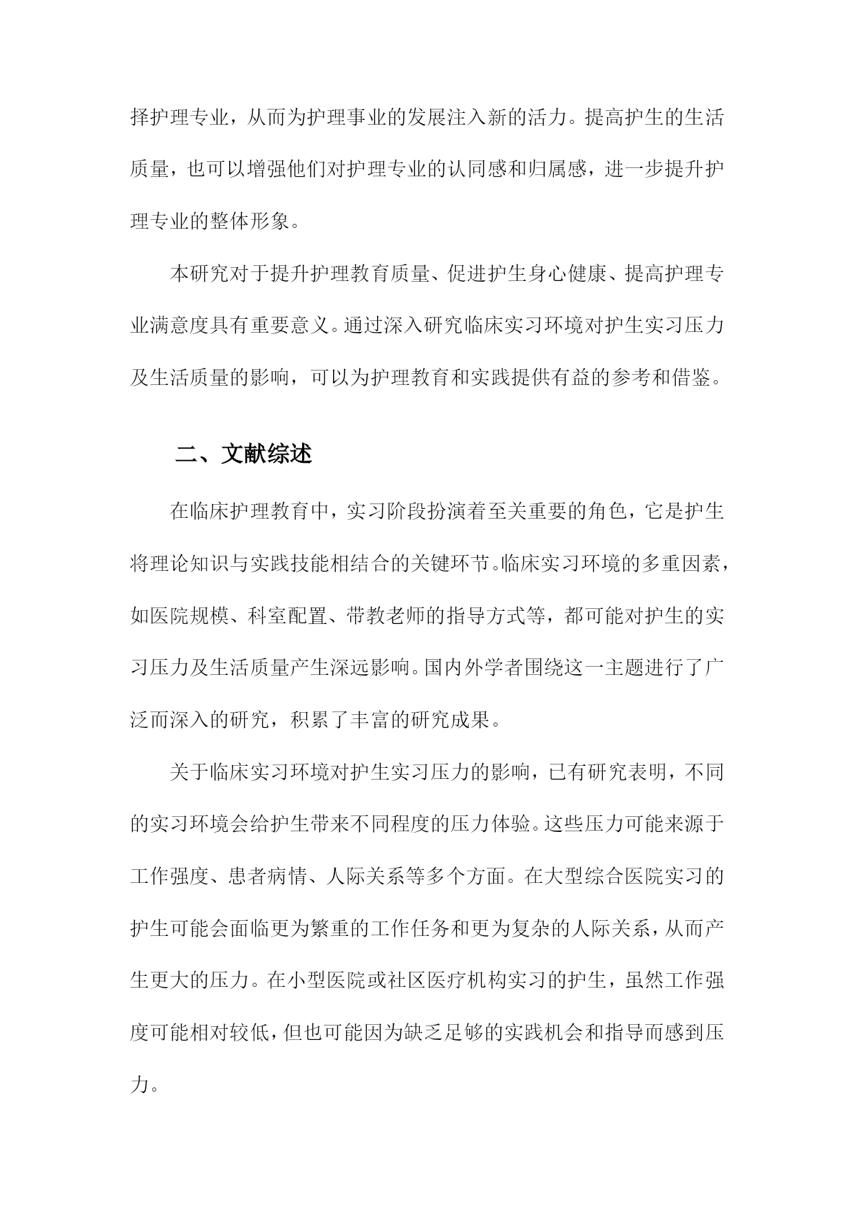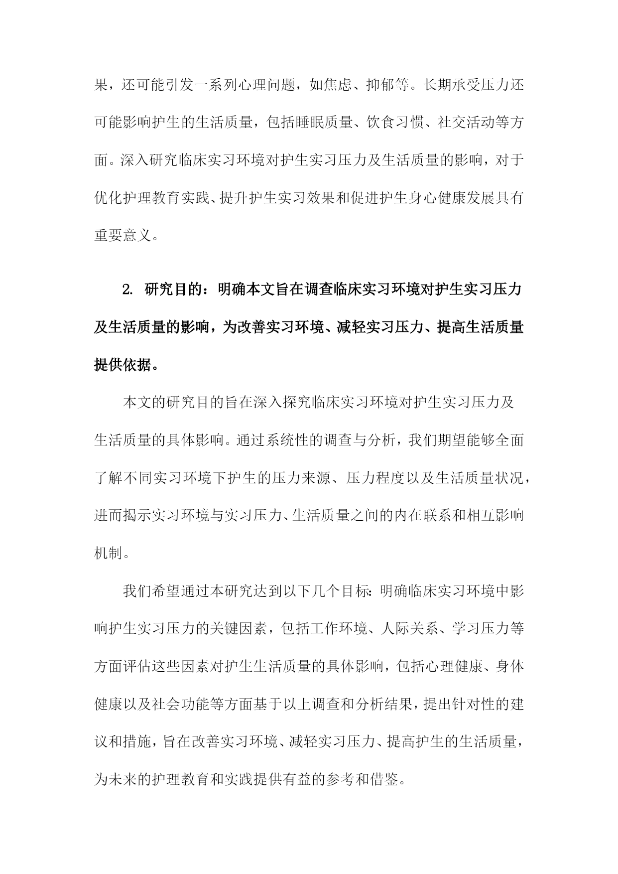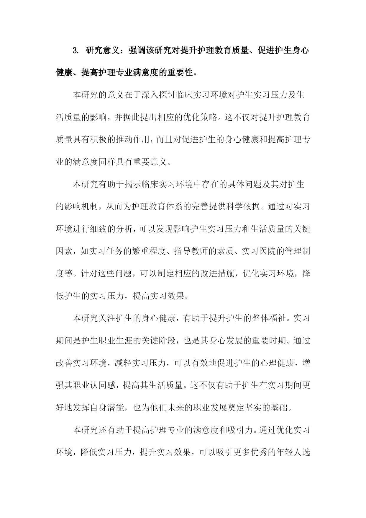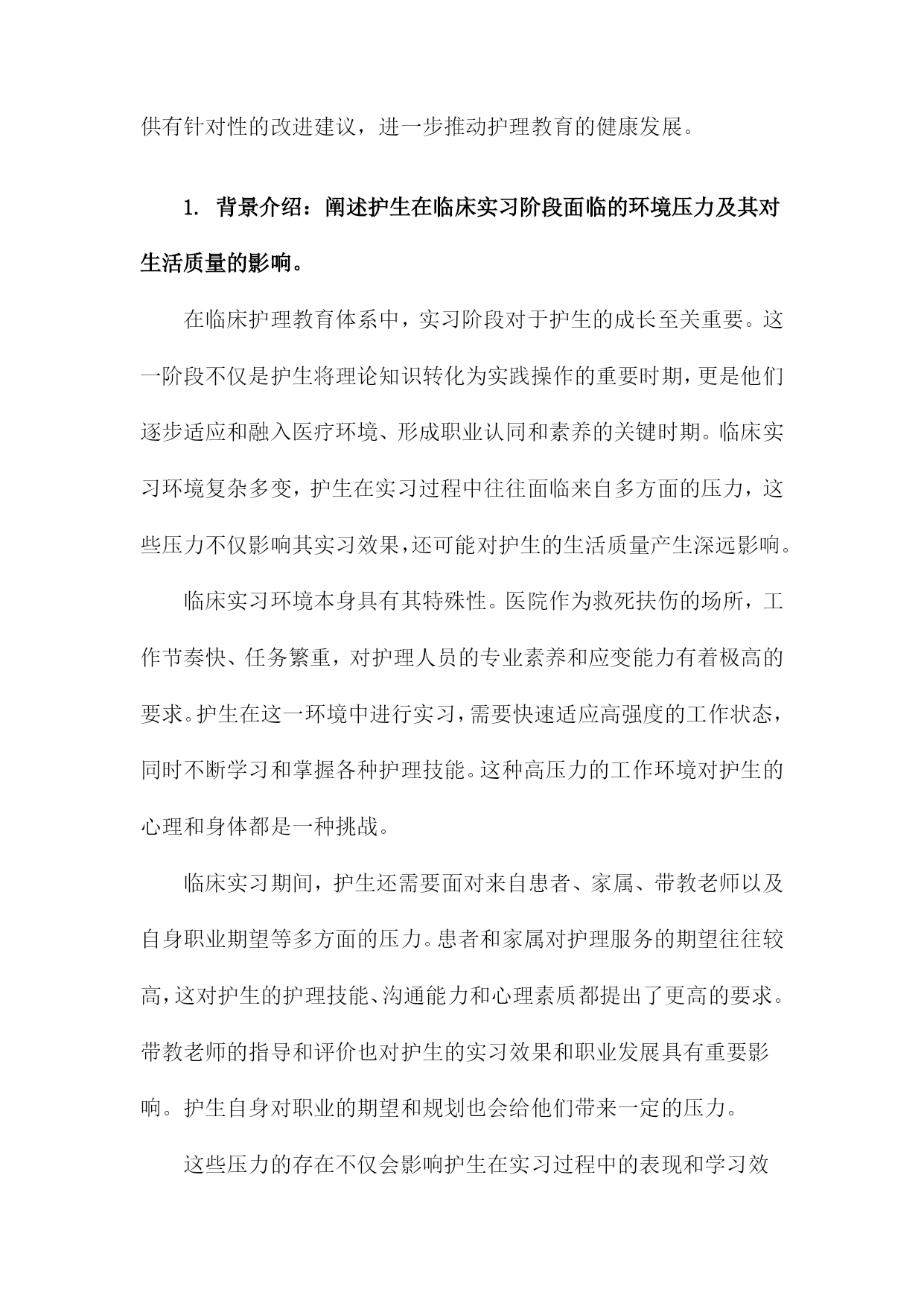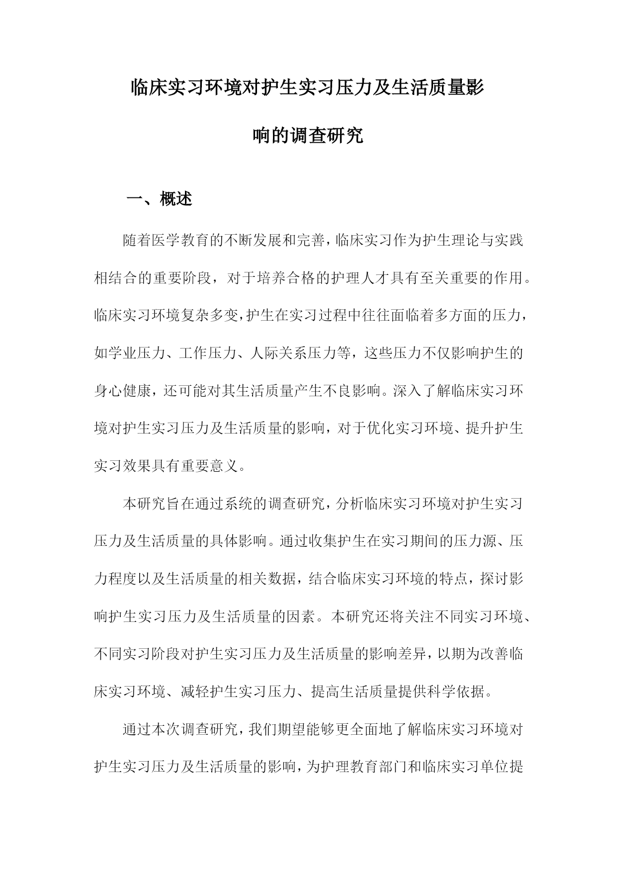 临床实习环境对护生实习压力及生活质量影响的调查研究一、概述随着医学教育的不断发展和完善,临床实习作为护生理论与实践相结合的重要阶段,对于培养合格的护理人才具有至关重要的作用。临床实习环境复杂多变,护生在实习过程中往往面临着多方面的压力,如学业压力、工作压力、人际关系压力等,这些压力不仅影响护生的身心健康,还可能对其生活质量产生不良影响。深入了解临床实习环境对护生实习压力及生活质量的影响,对于优化实习环境、提升护生实习效果具有重要意义。本研究旨在通过系统的调查研究,分析临床实习环境对护生实习压力及生活质量的具体影响。通过收集护生在实习期间的压力源、压力程度以及生活质量的相关数据,结合临床实习环境的特点,探讨影响护生实习压力及生活质量的因素。本研究还将关注不同实习环境、不同实习阶段对护生实习压力及生活质量的影响差异,以期为改善临床实习环境、减轻护生实习压力、提高生活质量提供科学依据。通过本次调查研究,我们期望能够更全面地了解临床实习环境对护生实习压力及生活质量的影响,为护理教育部门和临床实习单位提供有针对性的改进建议,进一步推动护理教育的健康发展。1.背景介绍:阐述护生在临床实习阶段面临的环境压力及其对生活质量的影响。在临床护理教育体系中,实习阶段对于护生的成长至关重要。这一阶段不仅是护生将理论知识转化为实践操作的重要时期,更是他们逐步适应和融入医疗环境、形成职业认同和素养的关键时期。临床实习环境复杂多变,护生在实习过程中往往面临来自多方面的压力,这些压力不仅影响其实习效果,还可能对护生的生活质量产生深远影响。临床实习环境本身具有其特殊性。医院作为救死扶伤的场所,工作节奏快、任务繁重,对护理人员的专业素养和应变能力有着极高的要求。护生在这一环境中进行实习,需要快速适应高强度的工作状态,同时不断学习和掌握各种护理技能。这种高压力的工作环境对护生的心理和身体都是一种挑战。临床实习期间,护生还需要面对来自患者、家属、带教老师以及自身职业期望等多方面的压力。患者和家属对护理服务的期望往往较高,这对护生的护理技能、沟通能力和心理素质都提出了更高的要求。带教老师的指导和评价也对护生的实习效果和职业发展具有重要影响。护生自身对职业的期望和规划也会给他们带来一定的压力。这些压力的存在不仅会影响护生在实习过程中的表现和学习效果,还可能引发一系列心理问题,如焦虑、抑郁等。长期承受压力还可能影响护生的生活质量,包括睡眠质量、饮食习惯、社交活动等方面。深入研究临床实习环境对护生实习压力及生活质量的影响,对于优化护理教育实践、提升护生实习效果和促进护生身心健康发展具有重要意义。2.研究目的:明确本文旨在调查临床实习环境对护生实习压力及生活质量的影响,为改善实习环境、减轻实习压力、提高生活质量提供依据。本文的研究目的旨在深入探究临床实习环境对护生实习压力及生活质量的具体影响。通过系统性的调查与分析,我们期望能够全面了解不同实习环境下护生的压力来源、压力程度以及生活质量状况,进而揭示实习环境与实习压力、生活质量之间的内在联系和相互影响机制。我们希望通过本研究达到以下几个目标:明确临床实习环境中影响护生实习压力的关键因素,包括工作环境、人际关系、学习压力等方面评估这些因素对护生生活质量的具体影响,包括心理健康、身体健康以及社会功能等方面基于以上调查和分析结果,提出针对性的建议和措施,旨在改善实习环境、减轻实习压力、提高护生的生活质量,为未来的护理教育和实践提供有益的参考和借鉴。3.研究意义:强调该研究对提升护理教育质量、促进护生身心健康、提高护理专业满意度的重要性。本研究的意义在于深入探讨临床实习环境对护生实习压力及生活质量的影响,并据此提出相应的优化策略。这不仅对提升护理教育质量具有积极的推动作用,而且对促进护生的身心健康和提高护理专业的满意度同样具有重要意义。本研究有助于揭示临床实习环境中存在的具体问题及其对护生的影响机制,从而为护理教育体系的完善提供科学依据。通过对实习环境进行细致的分析,可以发现影响护生实习压力和生活质量的关键因素,如实习任务的繁重程度、指导教师的素质、实习医院的管理制度等。针对这些问题,可以制定相应的改进措施,优化实习环境,降低护生的实习压力,提高实习效果。本研究关注护生的身心健康,有助于提升护生的整体福祉。实习期间是护生职业生涯的关键阶段,也是其身心发展的重要时期。通过改善实习环境,减轻实习压力,可以有效地促进护生的心理健康,增强其职业认同感,提高其生活质量。这不仅有助于护生在实习期间更好地发挥自身潜能,也为他们未来的职业发展奠定坚实的基础。本研究还有助于提高护理专业的满意度和吸引力。通过优化实习环境,降低实习压力,提升实习效果,可以吸引更多优秀的年轻人选择护理专业,从而为护理事业的发展注入新的活力。提高护生的生活质量,也可以增强他们