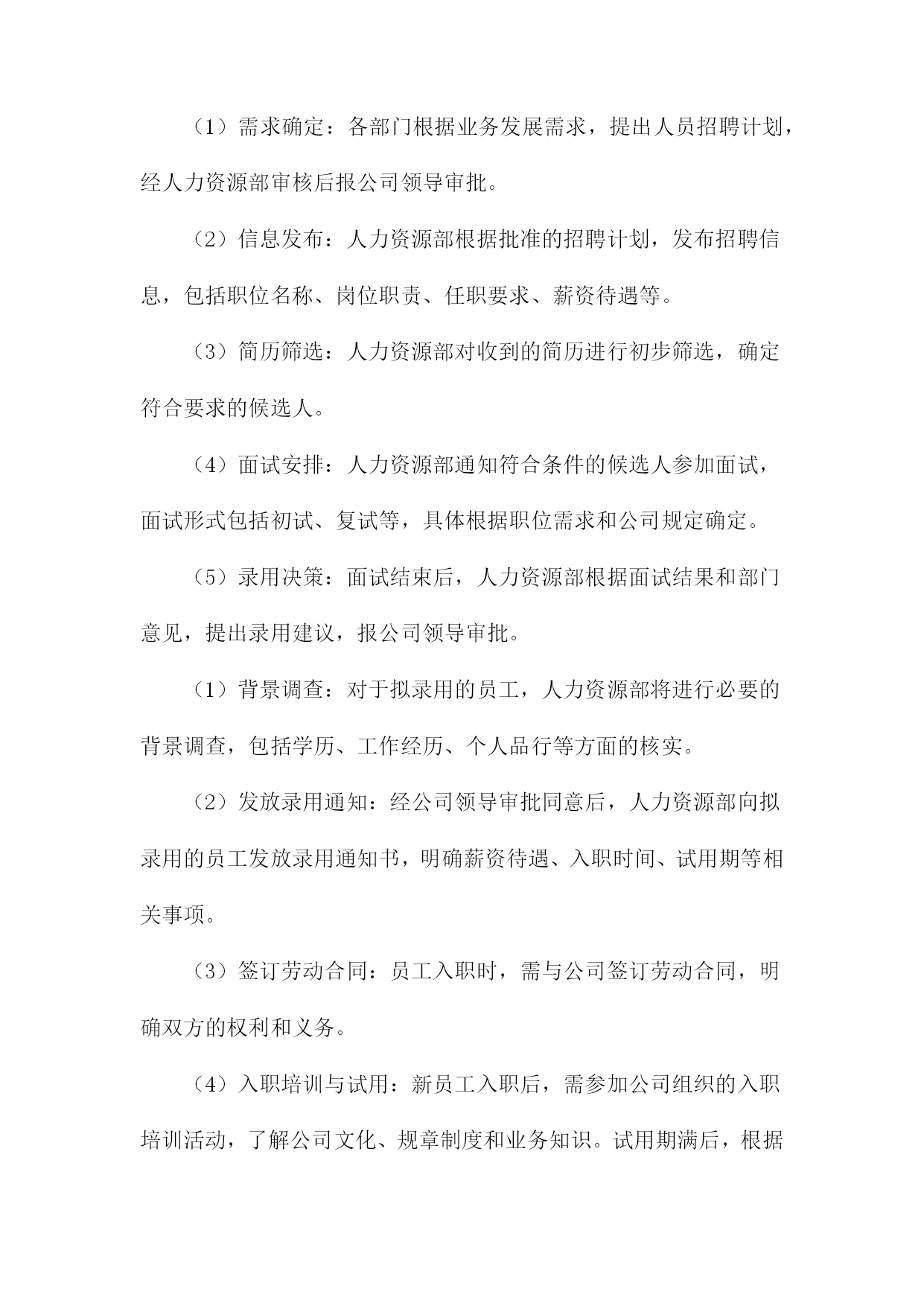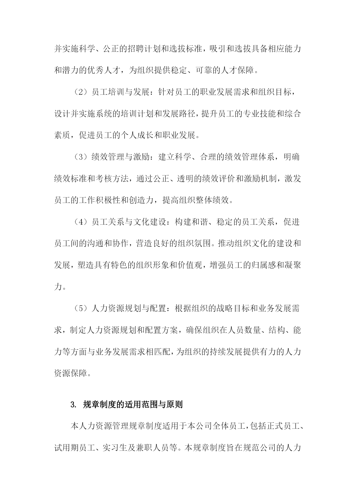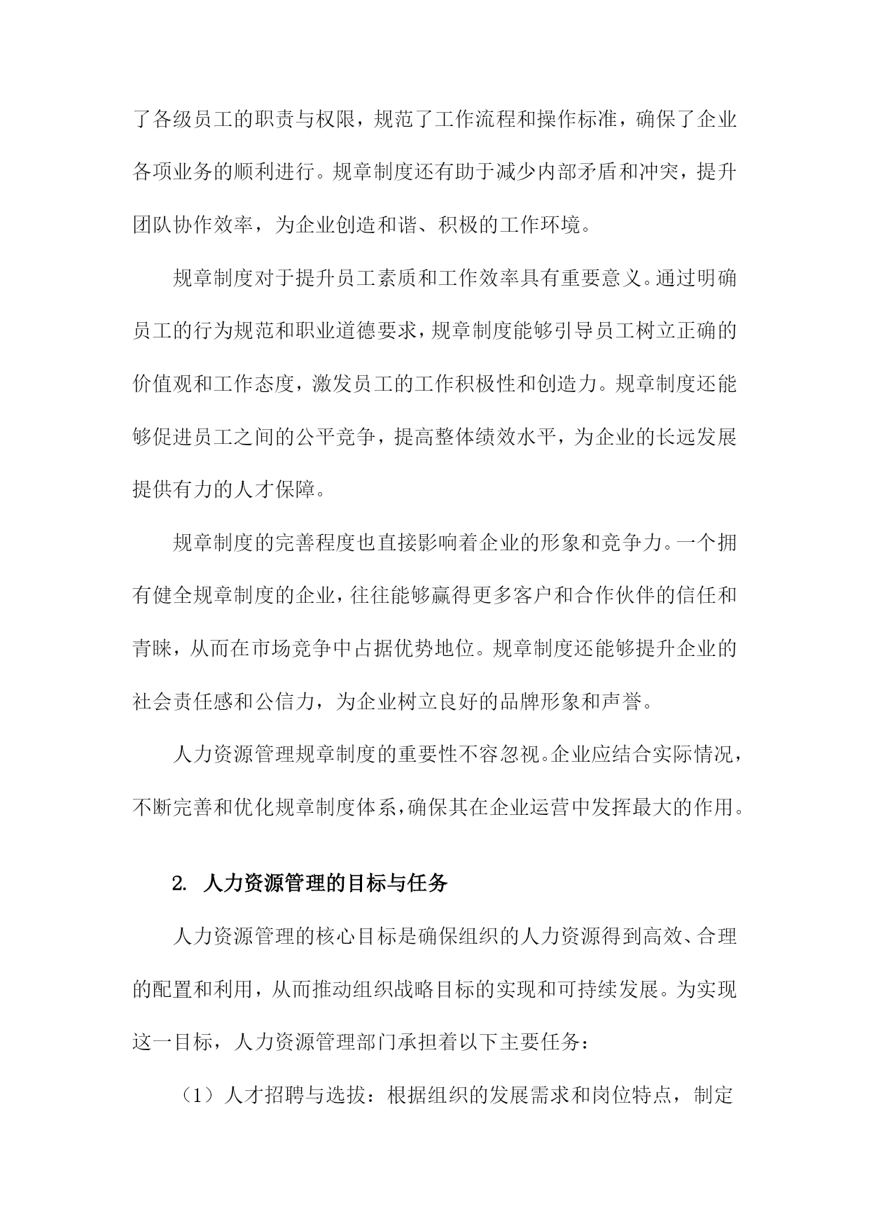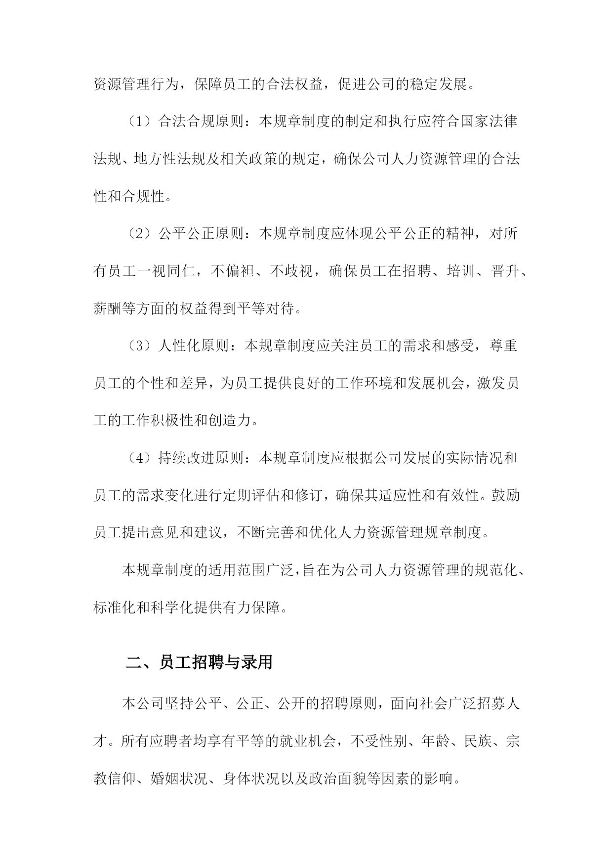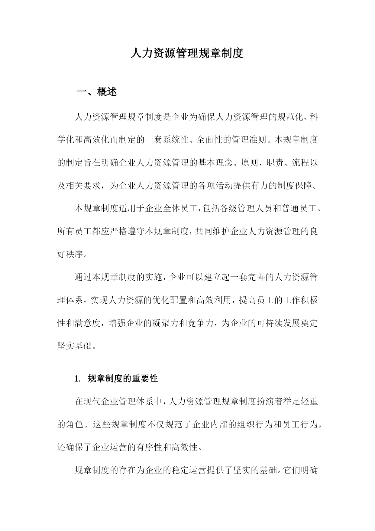 人力资源管理规章制度一、概述人力资源管理规章制度是企业为确保人力资源管理的规范化、科学化和高效化而制定的一套系统性、全面性的管理准则。本规章制度的制定旨在明确企业人力资源管理的基本理念、原则、职责、流程以及相关要求,为企业人力资源管理的各项活动提供有力的制度保障。本规章制度适用于企业全体员工,包括各级管理人员和普通员工。所有员工都应严格遵守本规章制度,共同维护企业人力资源管理的良好秩序。通过本规章制度的实施,企业可以建立起一套完善的人力资源管理体系,实现人力资源的优化配置和高效利用,提高员工的工作积极性和满意度,增强企业的凝聚力和竞争力,为企业的可持续发展奠定坚实基础。1.规章制度的重要性在现代企业管理体系中,人力资源管理规章制度扮演着举足轻重的角色。这些规章制度不仅规范了企业内部的组织行为和员工行为,还确保了企业运营的有序性和高效性。规章制度的存在为企业的稳定运营提供了坚实的基础。它们明确了各级员工的职责与权限,规范了工作流程和操作标准,确保了企业各项业务的顺利进行。规章制度还有助于减少内部矛盾和冲突,提升团队协作效率,为企业创造和谐、积极的工作环境。规章制度对于提升员工素质和工作效率具有重要意义。通过明确员工的行为规范和职业道德要求,规章制度能够引导员工树立正确的价值观和工作态度,激发员工的工作积极性和创造力。规章制度还能够促进员工之间的公平竞争,提高整体绩效水平,为企业的长远发展提供有力的人才保障。规章制度的完善程度也直接影响着企业的形象和竞争力。一个拥有健全规章制度的企业,往往能够赢得更多客户和合作伙伴的信任和青睐,从而在市场竞争中占据优势地位。规章制度还能够提升企业的社会责任感和公信力,为企业树立良好的品牌形象和声誉。人力资源管理规章制度的重要性不容忽视。企业应结合实际情况,不断完善和优化规章制度体系,确保其在企业运营中发挥最大的作用。2.人力资源管理的目标与任务人力资源管理的核心目标是确保组织的人力资源得到高效、合理的配置和利用,从而推动组织战略目标的实现和可持续发展。为实现这一目标,人力资源管理部门承担着以下主要任务:(1)人才招聘与选拔:根据组织的发展需求和岗位特点,制定并实施科学、公正的招聘计划和选拔标准,吸引和选拔具备相应能力和潜力的优秀人才,为组织提供稳定、可靠的人才保障。(2)员工培训与发展:针对员工的职业发展需求和组织目标,设计并实施系统的培训计划和发展路径,提升员工的专业技能和综合素质,促进员工的个人成长和职业发展。(3)绩效管理与激励:建立科学、合理的绩效管理体系,明确绩效标准和考核方法,通过公正、透明的绩效评价和激励机制,激发员工的工作积极性和创造力,提高组织整体绩效。(4)员工关系与文化建设:构建和谐、稳定的员工关系,促进员工间的沟通和协作,营造良好的组织氛围。推动组织文化的建设和发展,塑造具有特色的组织形象和价值观,增强员工的归属感和凝聚力。(5)人力资源规划与配置:根据组织的战略目标和业务发展需求,制定人力资源规划和配置方案,确保组织在人员数量、结构、能力等方面与业务发展需求相匹配,为组织的持续发展提供有力的人力资源保障。3.规章制度的适用范围与原则本人力资源管理规章制度适用于本公司全体员工,包括正式员工、试用期员工、实习生及兼职人员等。本规章制度旨在规范公司的人力资源管理行为,保障员工的合法权益,促进公司的稳定发展。(1)合法合规原则:本规章制度的制定和执行应符合国家法律法规、地方性法规及相关政策的规定,确保公司人力资源管理的合法性和合规性。(2)公平公正原则:本规章制度应体现公平公正的精神,对所有员工一视同仁,不偏袒、不歧视,确保员工在招聘、培训、晋升、薪酬等方面的权益得到平等对待。(3)人性化原则:本规章制度应关注员工的需求和感受,尊重员工的个性和差异,为员工提供良好的工作环境和发展机会,激发员工的工作积极性和创造力。(4)持续改进原则:本规章制度应根据公司发展的实际情况和员工的需求变化进行定期评估和修订,确保其适应性和有效性。鼓励员工提出意见和建议,不断完善和优化人力资源管理规章制度。本规章制度的适用范围广泛,旨在为公司人力资源管理的规范化、标准化和科学化提供有力保障。二、员工招聘与录用本公司坚持公平、公正、公开的招聘原则,面向社会广泛招募人才。所有应聘者均享有平等的就业机会,不受性别、年龄、民族、宗教信仰、婚姻状况、身体状况以及政治面貌等因素的影响。(1)需求确定:各部门根据业务发展需求,提出人员招聘计划,经人力资源部审核后报公司领导审批。(2)信息发布:人力资源部根据批准的招聘计划,发布招聘信息,包括职位名称、岗位职责、任职要求、薪资待遇等。(3)简历筛选:人力资源部对收到的简历进行初步筛选,确定符合要求的候选人。(4)面试安排:人力资源部通知符合条件的候选人参加面试,面试形式