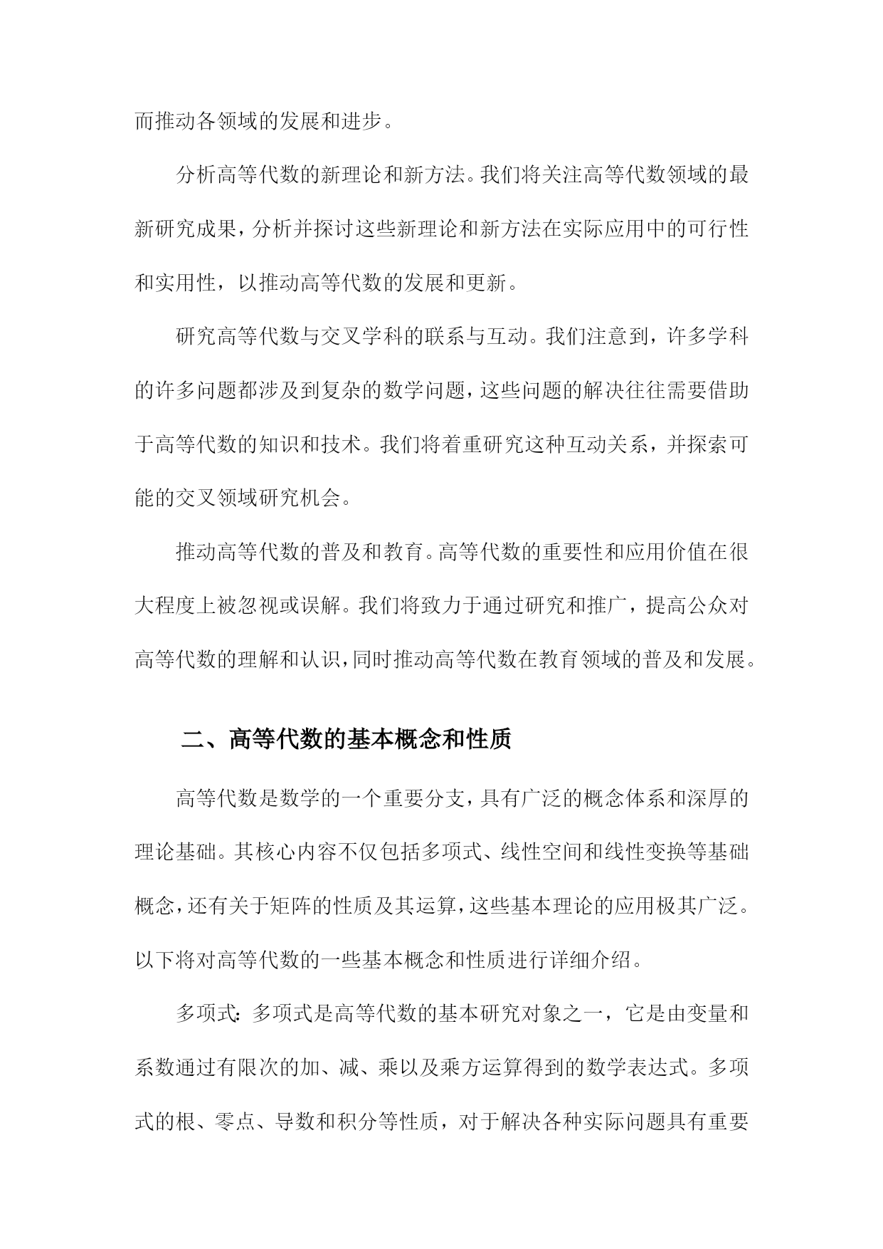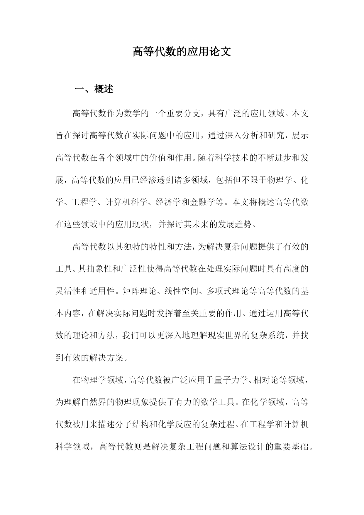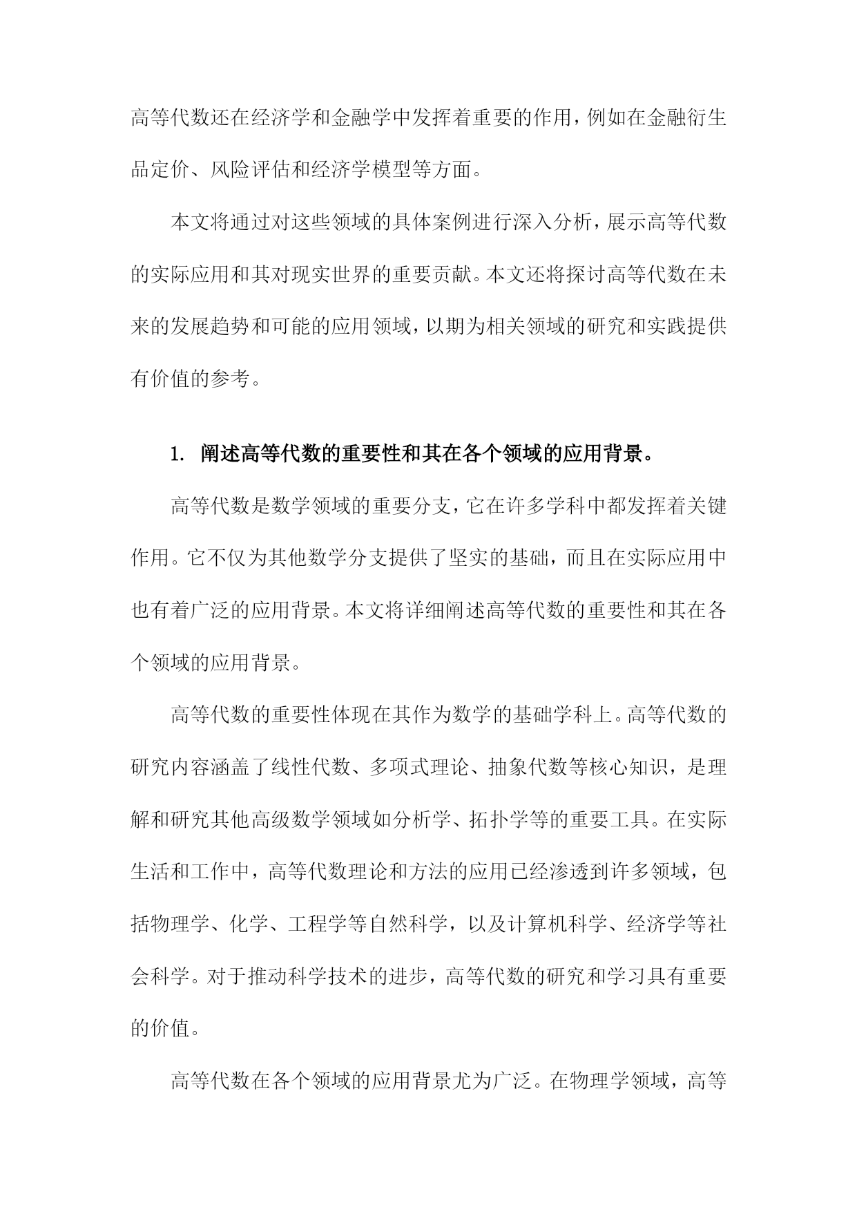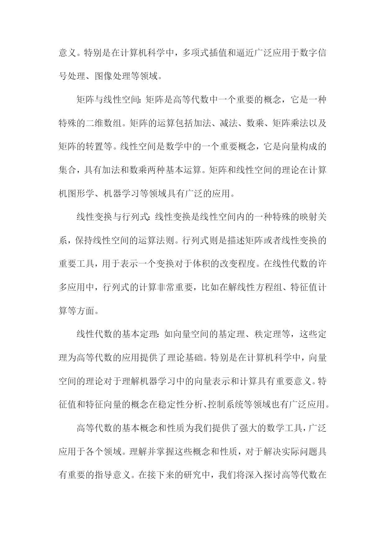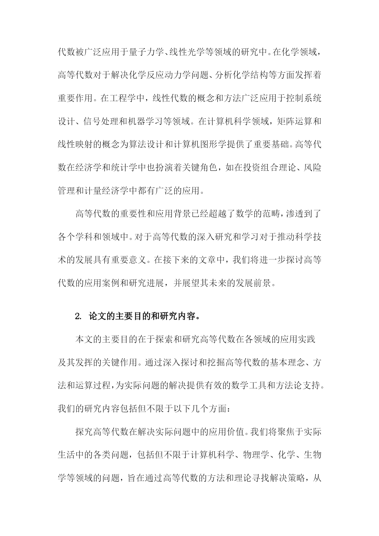 高等代数的应用论文一、概述高等代数作为数学的一个重要分支,具有广泛的应用领域。本文旨在探讨高等代数在实际问题中的应用,通过深入分析和研究,展示高等代数在各个领域中的价值和作用。随着科学技术的不断进步和发展,高等代数的应用已经渗透到诸多领域,包括但不限于物理学、化学、工程学、计算机科学、经济学和金融学等。本文将概述高等代数在这些领域中的应用现状,并探讨其未来的发展趋势。高等代数以其独特的特性和方法,为解决复杂问题提供了有效的工具。其抽象性和广泛性使得高等代数在处理实际问题时具有高度的灵活性和适用性。矩阵理论、线性空间、多项式理论等高等代数的基本内容,在解决实际问题时发挥着至关重要的作用。通过运用高等代数的理论和方法,我们可以更深入地理解现实世界的复杂系统,并找到有效的解决方案。在物理学领域,高等代数被广泛应用于量子力学、相对论等领域,为理解自然界的物理现象提供了有力的数学工具。在化学领域,高等代数被用来描述分子结构和化学反应的复杂过程。在工程学和计算机科学领域,高等代数则是解决复杂工程问题和算法设计的重要基础。高等代数还在经济学和金融学中发挥着重要的作用,例如在金融衍生品定价、风险评估和经济学模型等方面。本文将通过对这些领域的具体案例进行深入分析,展示高等代数的实际应用和其对现实世界的重要贡献。本文还将探讨高等代数在未来的发展趋势和可能的应用领域,以期为相关领域的研究和实践提供有价值的参考。1.阐述高等代数的重要性和其在各个领域的应用背景。高等代数是数学领域的重要分支,它在许多学科中都发挥着关键作用。它不仅为其他数学分支提供了坚实的基础,而且在实际应用中也有着广泛的应用背景。本文将详细阐述高等代数的重要性和其在各个领域的应用背景。高等代数的重要性体现在其作为数学的基础学科上。高等代数的研究内容涵盖了线性代数、多项式理论、抽象代数等核心知识,是理解和研究其他高级数学领域如分析学、拓扑学等的重要工具。在实际生活和工作中,高等代数理论和方法的应用已经渗透到许多领域,包括物理学、化学、工程学等自然科学,以及计算机科学、经济学等社会科学。对于推动科学技术的进步,高等代数的研究和学习具有重要的价值。高等代数在各个领域的应用背景尤为广泛。在物理学领域,高等代数被广泛应用于量子力学、线性光学等领域的研究中。在化学领域,高等代数对于解决化学反应动力学问题、分析化学结构等方面发挥着重要作用。在工程学中,线性代数的概念和方法广泛应用于控制系统设计、信号处理和机器学习等领域。在计算机科学领域,矩阵运算和线性映射的概念为算法设计和计算机图形学提供了重要基础。高等代数在经济学和统计学中也扮演着关键角色,如在投资组合理论、风险管理和计量经济学中都有广泛的应用。高等代数的重要性和应用背景已经超越了数学的范畴,渗透到了各个学科和领域中。对于高等代数的深入研究和学习对于推动科学技术的发展具有重要意义。在接下来的文章中,我们将进一步探讨高等代数的应用案例和研究进展,并展望其未来的发展前景。2.论文的主要目的和研究内容。本文的主要目的在于探索和研究高等代数在各领域的应用实践及其发挥的关键作用。通过深入探讨和挖掘高等代数的基本理念、方法和运算过程,为实际问题的解决提供有效的数学工具和方法论支持。我们的研究内容包括但不限于以下几个方面:探究高等代数在解决实际问题中的应用价值。我们将聚焦于实际生活中的各类问题,包括但不限于计算机科学、物理学、化学、生物学等领域的问题,旨在通过高等代数的方法和理论寻找解决策略,从而推动各领域的发展和进步。分析高等代数的新理论和新方法。我们将关注高等代数领域的最新研究成果,分析并探讨这些新理论和新方法在实际应用中的可行性和实用性,以推动高等代数的发展和更新。研究高等代数与交叉学科的联系与互动。我们注意到,许多学科的许多问题都涉及到复杂的数学问题,这些问题的解决往往需要借助于高等代数的知识和技术。我们将着重研究这种互动关系,并探索可能的交叉领域研究机会。推动高等代数的普及和教育。高等代数的重要性和应用价值在很大程度上被忽视或误解。我们将致力于通过研究和推广,提高公众对高等代数的理解和认识,同时推动高等代数在教育领域的普及和发展。二、高等代数的基本概念和性质高等代数是数学的一个重要分支,具有广泛的概念体系和深厚的理论基础。其核心内容不仅包括多项式、线性空间和线性变换等基础概念,还有关于矩阵的性质及其运算,这些基本理论的应用极其广泛。以下将对高等代数的一些基本概念和性质进行详细介绍。多项式:多项式是高等代数的基本研究对象之一,它是由变量和系数通过有限次的加、减、乘以及乘方运算得到的数学表达式。多项式的根、零点、导数和积分等性质,对于解决各种实际问题具有重要意义。特别是在计算机科学中,多项式插值和逼近广泛应用于数字信号处理、图像处理等领域。矩阵与线性空