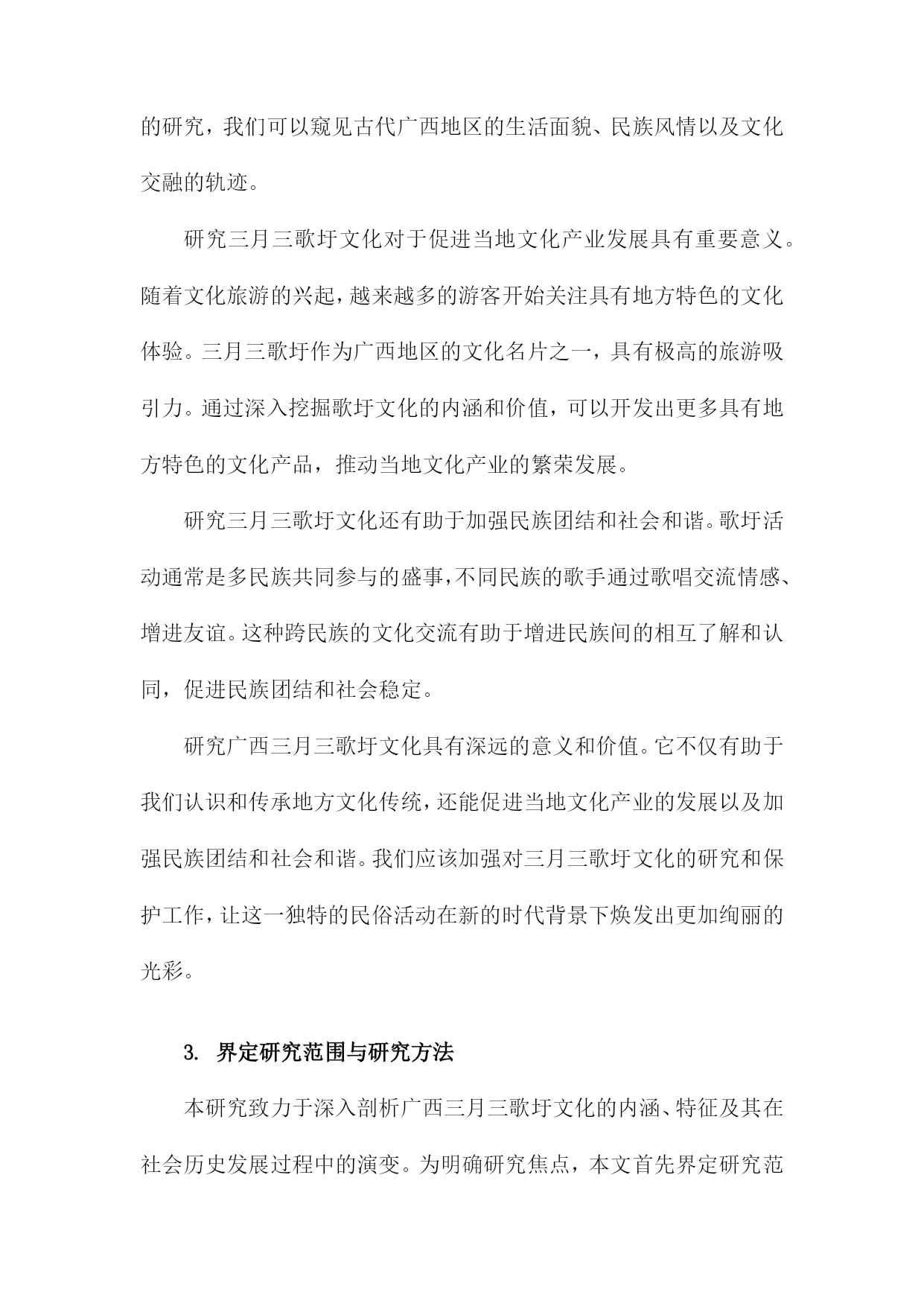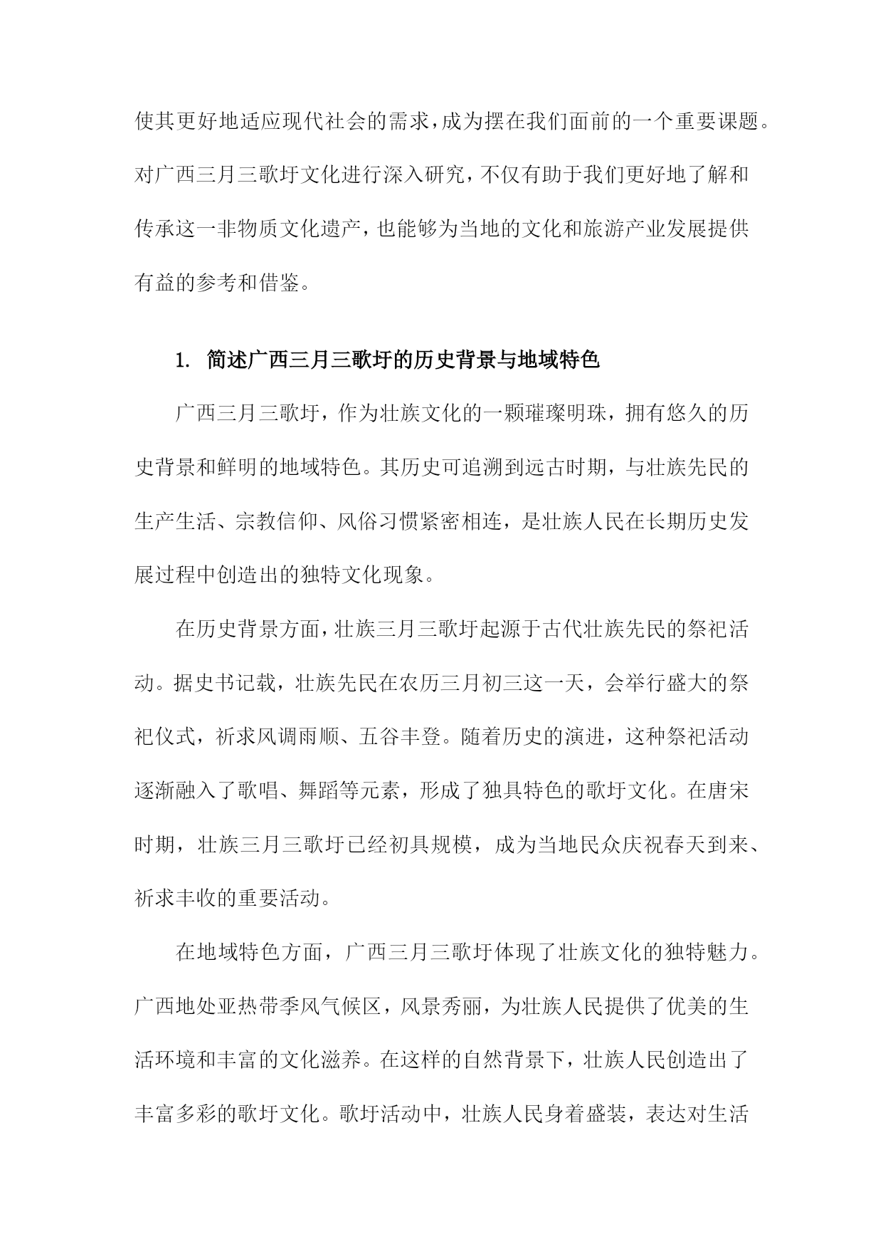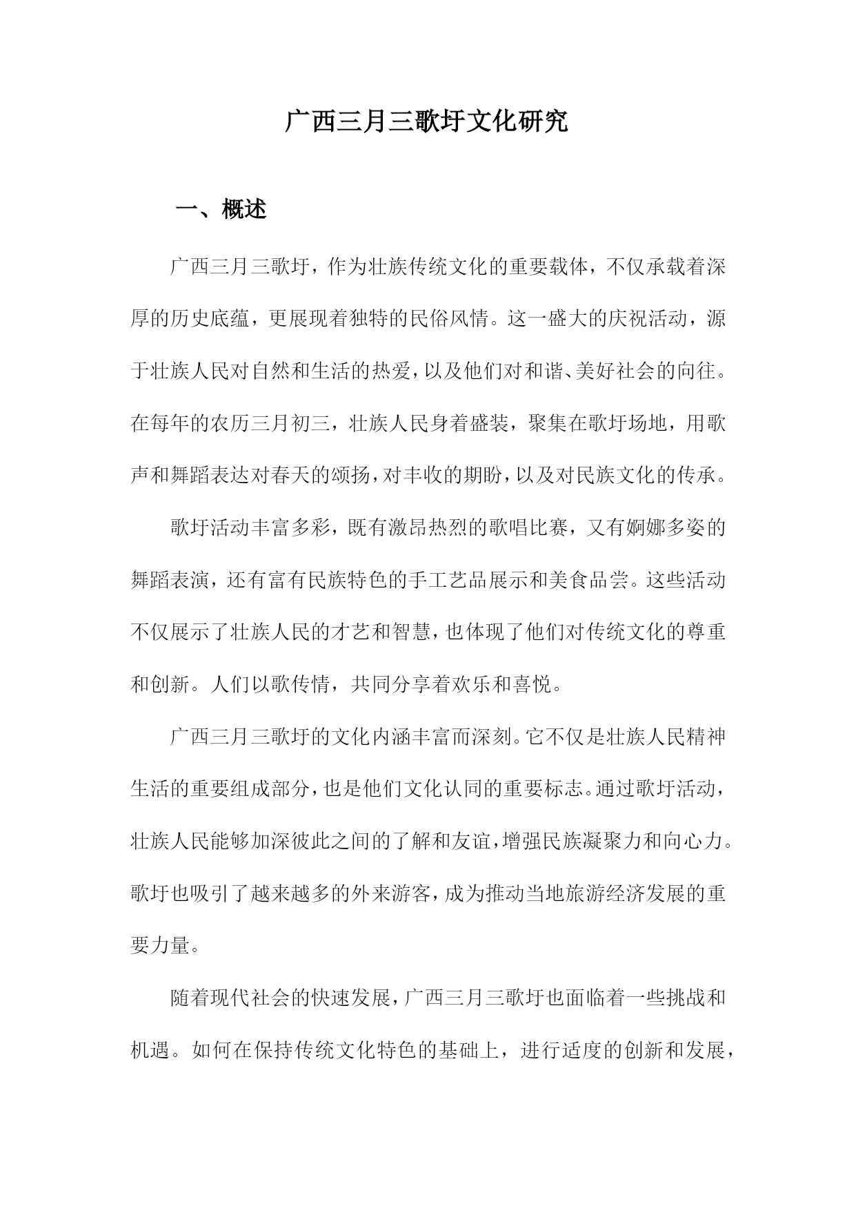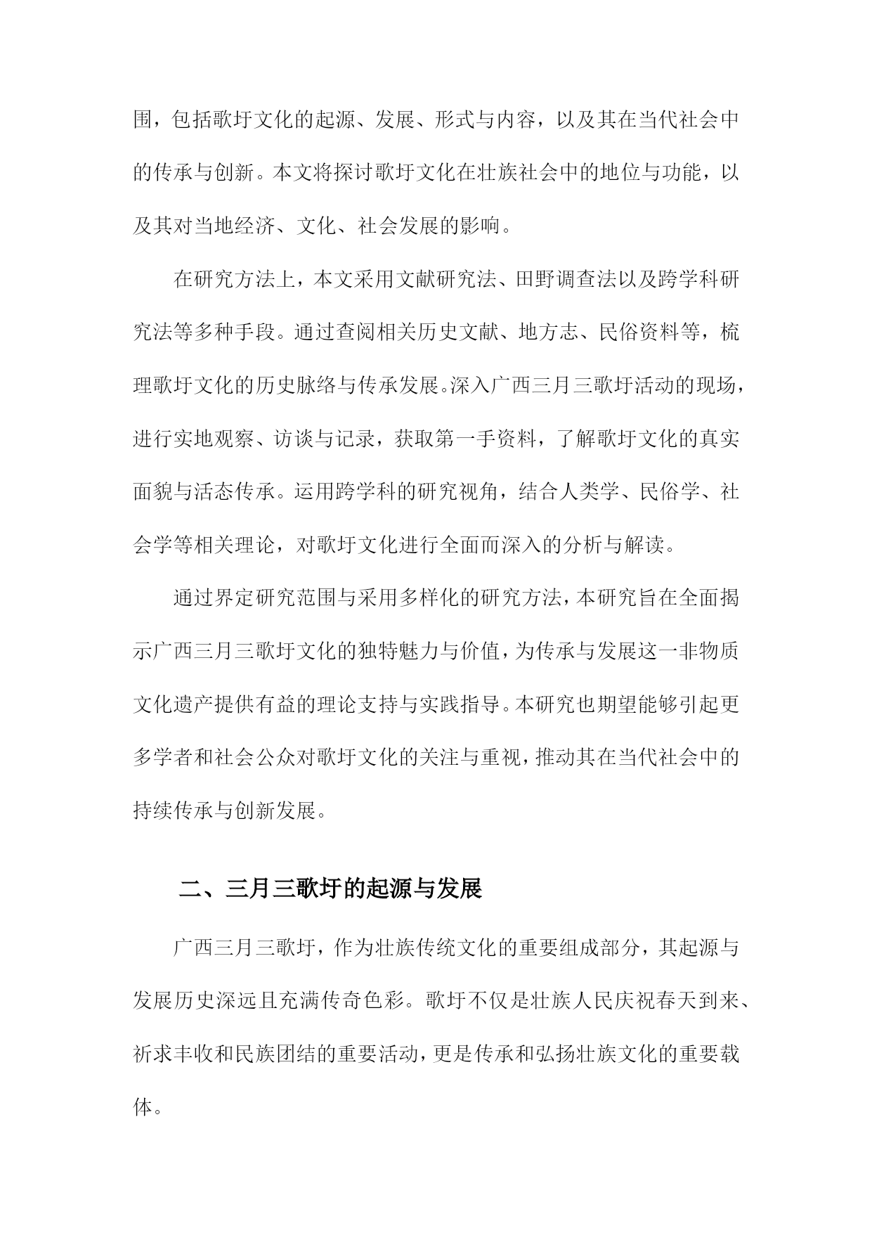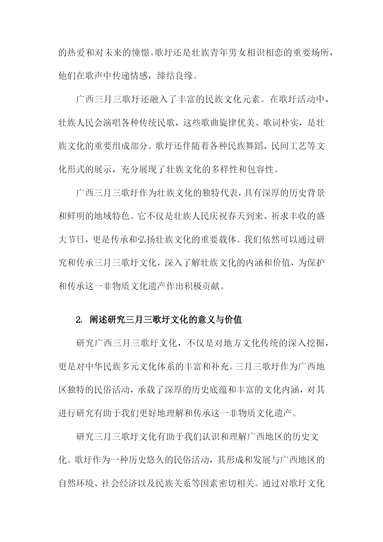 广西三月三歌圩文化研究一、概述广西三月三歌圩,作为壮族传统文化的重要载体,不仅承载着深厚的历史底蕴,更展现着独特的民俗风情。这一盛大的庆祝活动,源于壮族人民对自然和生活的热爱,以及他们对和谐、美好社会的向往。在每年的农历三月初三,壮族人民身着盛装,聚集在歌圩场地,用歌声和舞蹈表达对春天的颂扬,对丰收的期盼,以及对民族文化的传承。歌圩活动丰富多彩,既有激昂热烈的歌唱比赛,又有婀娜多姿的舞蹈表演,还有富有民族特色的手工艺品展示和美食品尝。这些活动不仅展示了壮族人民的才艺和智慧,也体现了他们对传统文化的尊重和创新。人们以歌传情,共同分享着欢乐和喜悦。广西三月三歌圩的文化内涵丰富而深刻。它不仅是壮族人民精神生活的重要组成部分,也是他们文化认同的重要标志。通过歌圩活动,壮族人民能够加深彼此之间的了解和友谊,增强民族凝聚力和向心力。歌圩也吸引了越来越多的外来游客,成为推动当地旅游经济发展的重要力量。随着现代社会的快速发展,广西三月三歌圩也面临着一些挑战和机遇。如何在保持传统文化特色的基础上,进行适度的创新和发展,使其更好地适应现代社会的需求,成为摆在我们面前的一个重要课题。对广西三月三歌圩文化进行深入研究,不仅有助于我们更好地了解和传承这一非物质文化遗产,也能够为当地的文化和旅游产业发展提供有益的参考和借鉴。1.简述广西三月三歌圩的历史背景与地域特色广西三月三歌圩,作为壮族文化的一颗璀璨明珠,拥有悠久的历史背景和鲜明的地域特色。其历史可追溯到远古时期,与壮族先民的生产生活、宗教信仰、风俗习惯紧密相连,是壮族人民在长期历史发展过程中创造出的独特文化现象。在历史背景方面,壮族三月三歌圩起源于古代壮族先民的祭祀活动。据史书记载,壮族先民在农历三月初三这一天,会举行盛大的祭祀仪式,祈求风调雨顺、五谷丰登。随着历史的演进,这种祭祀活动逐渐融入了歌唱、舞蹈等元素,形成了独具特色的歌圩文化。在唐宋时期,壮族三月三歌圩已经初具规模,成为当地民众庆祝春天到来、祈求丰收的重要活动。在地域特色方面,广西三月三歌圩体现了壮族文化的独特魅力。广西地处亚热带季风气候区,风景秀丽,为壮族人民提供了优美的生活环境和丰富的文化滋养。在这样的自然背景下,壮族人民创造出了丰富多彩的歌圩文化。歌圩活动中,壮族人民身着盛装,表达对生活的热爱和对未来的憧憬。歌圩还是壮族青年男女相识相恋的重要场所,他们在歌声中传递情感,缔结良缘。广西三月三歌圩还融入了丰富的民族文化元素。在歌圩活动中,壮族人民会演唱各种传统民歌,这些歌曲旋律优美、歌词朴实,是壮族文化的重要组成部分。歌圩还伴随着各种民族舞蹈、民间工艺等文化形式的展示,充分展现了壮族文化的多样性和包容性。广西三月三歌圩作为壮族文化的独特代表,具有深厚的历史背景和鲜明的地域特色。它不仅是壮族人民庆祝春天到来、祈求丰收的盛大节日,更是传承和弘扬壮族文化的重要载体。我们依然可以通过研究和传承三月三歌圩文化,深入了解壮族文化的内涵和价值,为保护和传承这一非物质文化遗产作出积极贡献。2.阐述研究三月三歌圩文化的意义与价值研究广西三月三歌圩文化,不仅是对地方文化传统的深入挖掘,更是对中华民族多元文化体系的丰富和补充。三月三歌圩作为广西地区独特的民俗活动,承载了深厚的历史底蕴和丰富的文化内涵,对其进行研究有助于我们更好地理解和传承这一非物质文化遗产。研究三月三歌圩文化有助于我们认识和理解广西地区的历史文化。歌圩作为一种历史悠久的民俗活动,其形成和发展与广西地区的自然环境、社会经济以及民族关系等因素密切相关。通过对歌圩文化的研究,我们可以窥见古代广西地区的生活面貌、民族风情以及文化交融的轨迹。研究三月三歌圩文化对于促进当地文化产业发展具有重要意义。随着文化旅游的兴起,越来越多的游客开始关注具有地方特色的文化体验。三月三歌圩作为广西地区的文化名片之一,具有极高的旅游吸引力。通过深入挖掘歌圩文化的内涵和价值,可以开发出更多具有地方特色的文化产品,推动当地文化产业的繁荣发展。研究三月三歌圩文化还有助于加强民族团结和社会和谐。歌圩活动通常是多民族共同参与的盛事,不同民族的歌手通过歌唱交流情感、增进友谊。这种跨民族的文化交流有助于增进民族间的相互了解和认同,促进民族团结和社会稳定。研究广西三月三歌圩文化具有深远的意义和价值。它不仅有助于我们认识和传承地方文化传统,还能促进当地文化产业的发展以及加强民族团结和社会和谐。我们应该加强对三月三歌圩文化的研究和保护工作,让这一独特的民俗活动在新的时代背景下焕发出更加绚丽的光彩。3.界定研究范围与研究方法本研究致力于深入剖析广西三月三歌圩文化的内涵、特征及其在社会历史发展过程中的演变。为明确研究焦点,本文首先界定研究范围,包括歌圩文化的起源、发展、形式与内容,以及其在当代社会中的传承与创新。本文将探讨歌圩文化在壮族社会中的