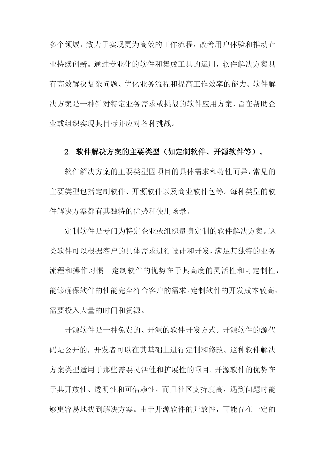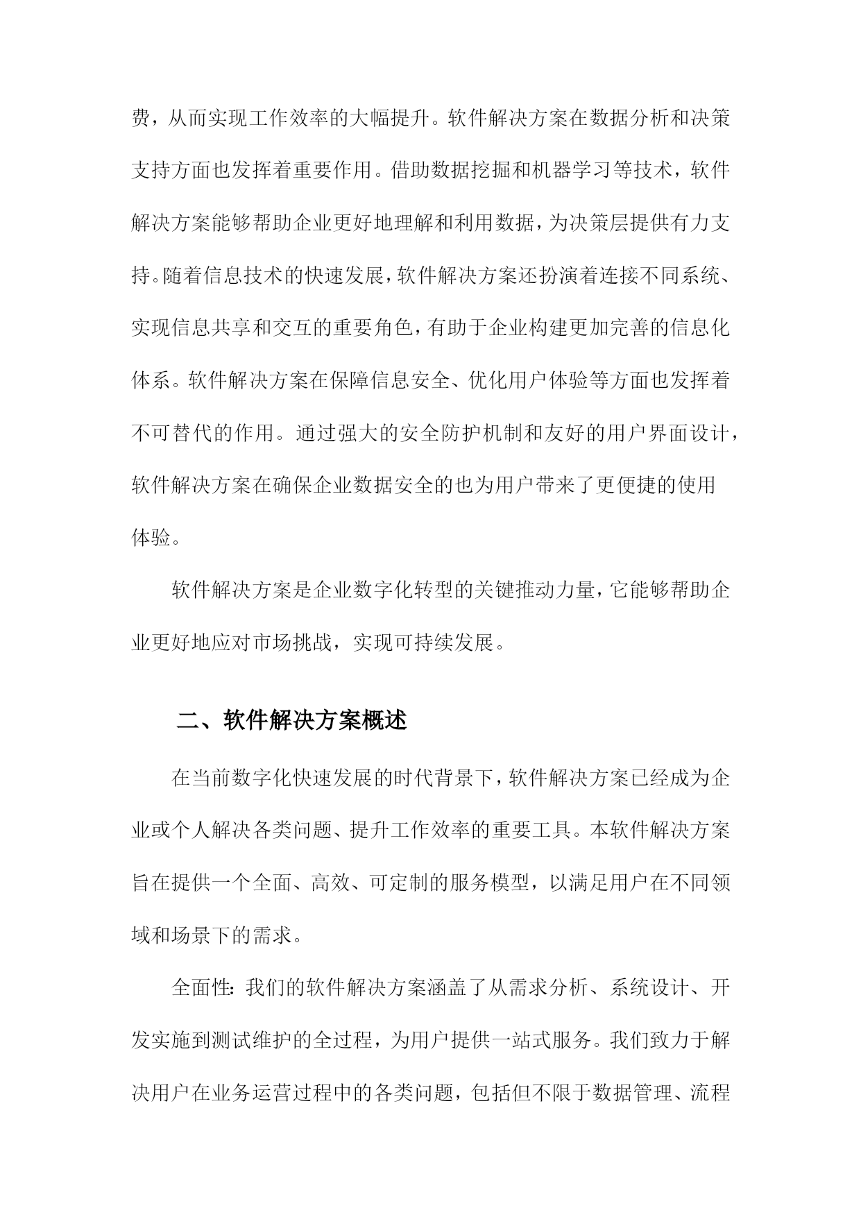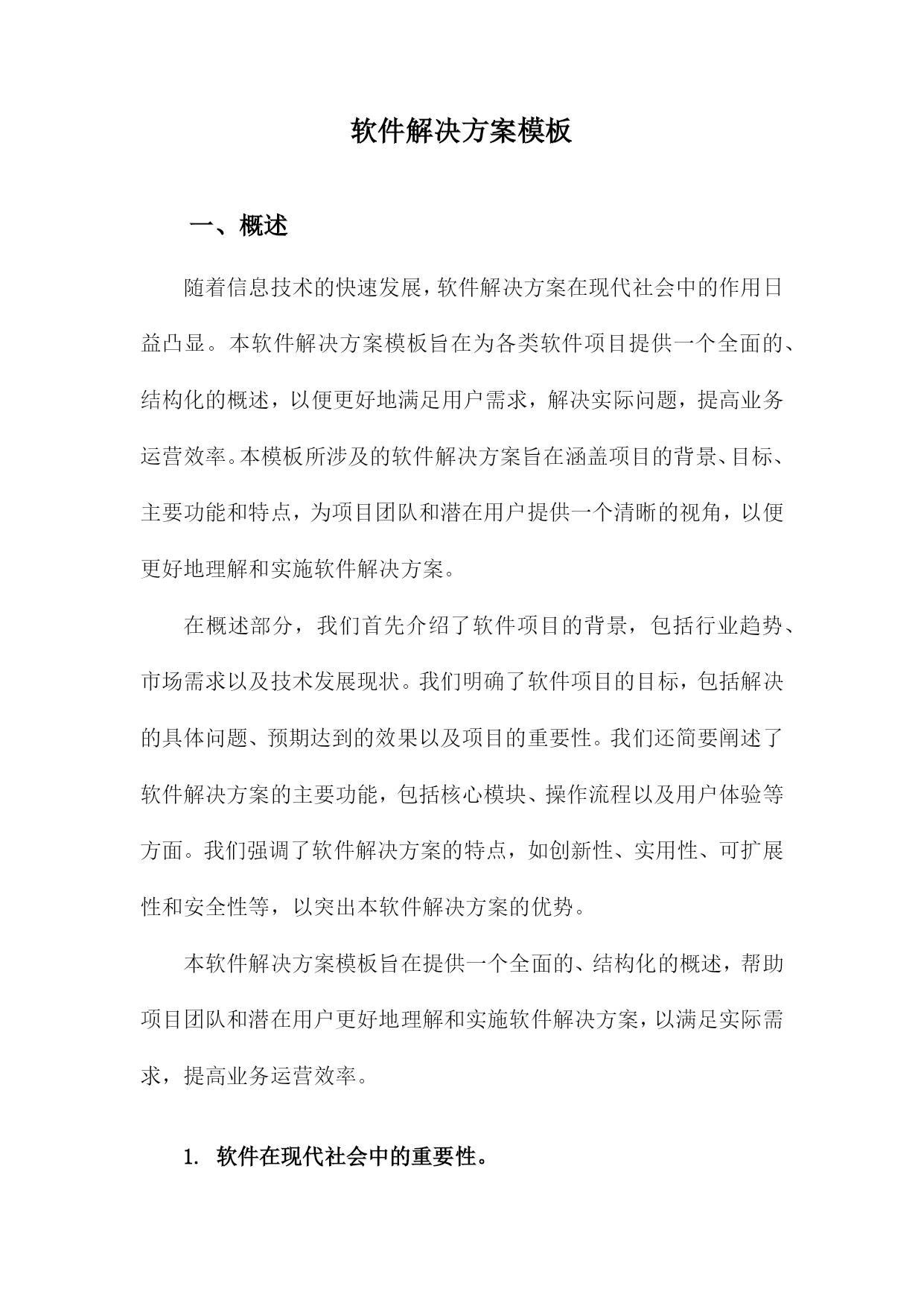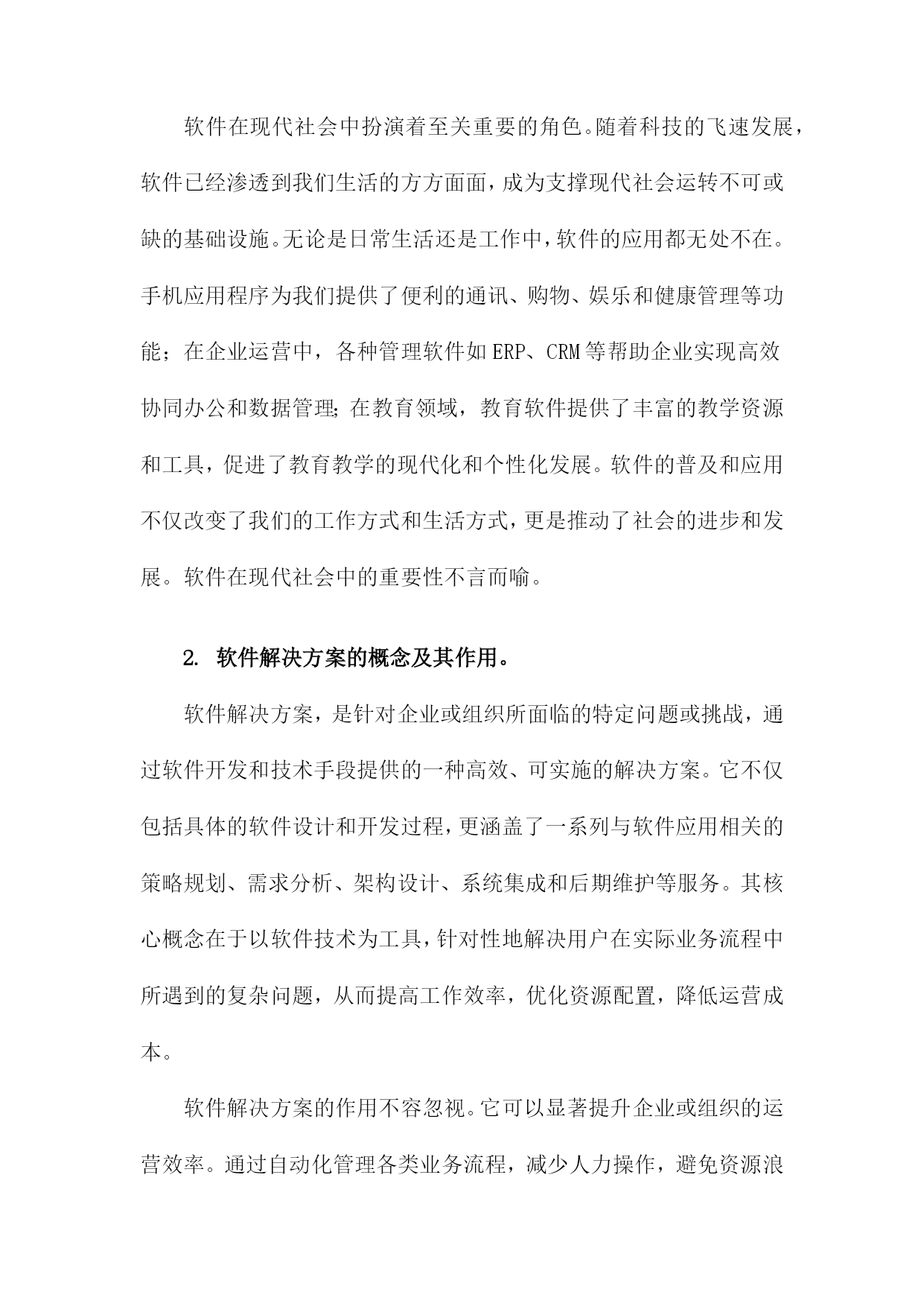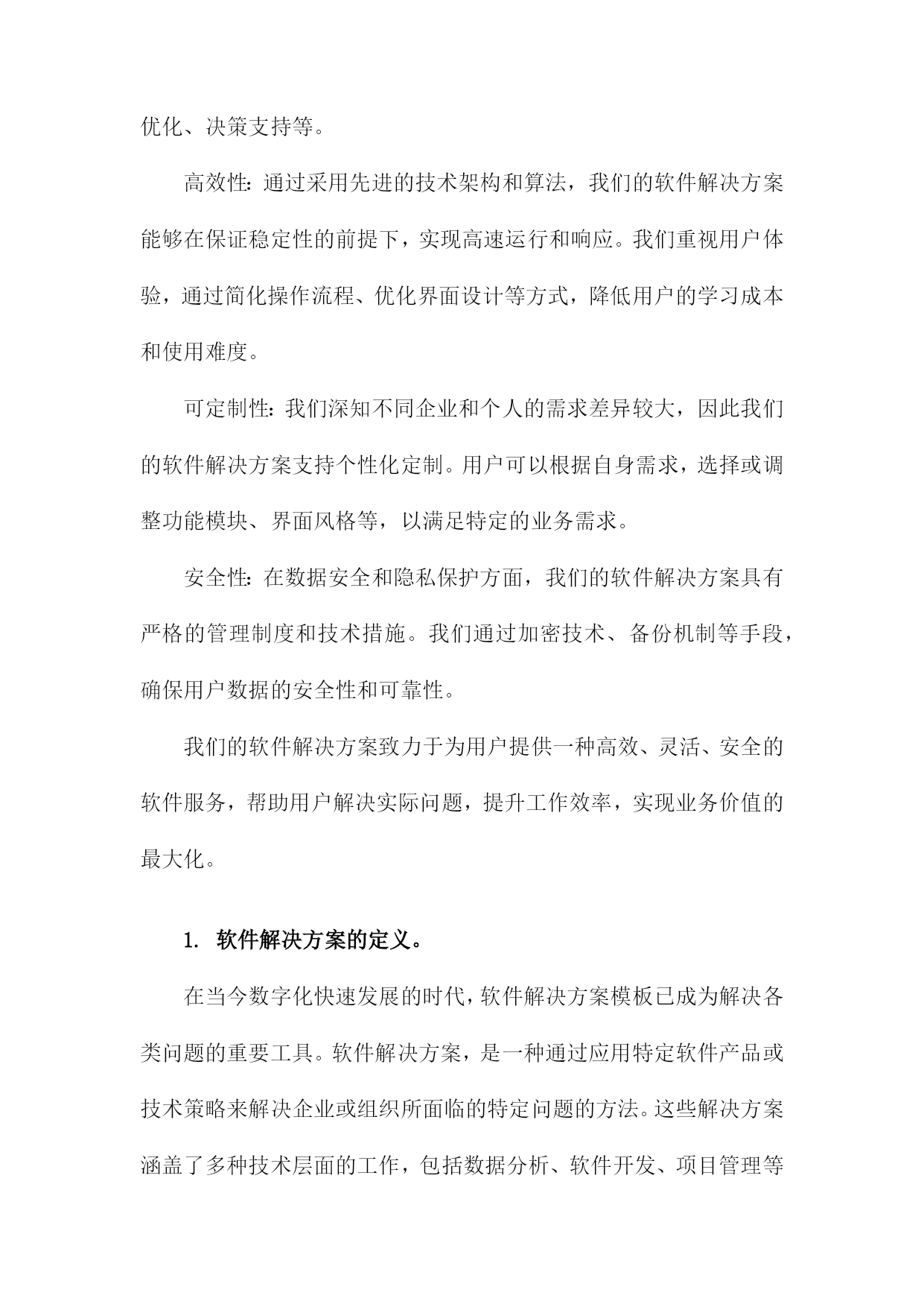 软件解决方案模板一、概述随着信息技术的快速发展,软件解决方案在现代社会中的作用日益凸显。本软件解决方案模板旨在为各类软件项目提供一个全面的、结构化的概述,以便更好地满足用户需求,解决实际问题,提高业务运营效率。本模板所涉及的软件解决方案旨在涵盖项目的背景、目标、主要功能和特点,为项目团队和潜在用户提供一个清晰的视角,以便更好地理解和实施软件解决方案。在概述部分,我们首先介绍了软件项目的背景,包括行业趋势、市场需求以及技术发展现状。我们明确了软件项目的目标,包括解决的具体问题、预期达到的效果以及项目的重要性。我们还简要阐述了软件解决方案的主要功能,包括核心模块、操作流程以及用户体验等方面。我们强调了软件解决方案的特点,如创新性、实用性、可扩展性和安全性等,以突出本软件解决方案的优势。本软件解决方案模板旨在提供一个全面的、结构化的概述,帮助项目团队和潜在用户更好地理解和实施软件解决方案,以满足实际需求,提高业务运营效率。1.软件在现代社会中的重要性。软件在现代社会中扮演着至关重要的角色。随着科技的飞速发展,软件已经渗透到我们生活的方方面面,成为支撑现代社会运转不可或缺的基础设施。无论是日常生活还是工作中,软件的应用都无处不在。手机应用程序为我们提供了便利的通讯、购物、娱乐和健康管理等功能;在企业运营中,各种管理软件如ERP、CRM等帮助企业实现高效协同办公和数据管理;在教育领域,教育软件提供了丰富的教学资源和工具,促进了教育教学的现代化和个性化发展。软件的普及和应用不仅改变了我们的工作方式和生活方式,更是推动了社会的进步和发展。软件在现代社会中的重要性不言而喻。2.软件解决方案的概念及其作用。软件解决方案,是针对企业或组织所面临的特定问题或挑战,通过软件开发和技术手段提供的一种高效、可实施的解决方案。它不仅包括具体的软件设计和开发过程,更涵盖了一系列与软件应用相关的策略规划、需求分析、架构设计、系统集成和后期维护等服务。其核心概念在于以软件技术为工具,针对性地解决用户在实际业务流程中所遇到的复杂问题,从而提高工作效率,优化资源配置,降低运营成本。软件解决方案的作用不容忽视。它可以显著提升企业或组织的运营效率。通过自动化管理各类业务流程,减少人力操作,避免资源浪费,从而实现工作效率的大幅提升。软件解决方案在数据分析和决策支持方面也发挥着重要作用。借助数据挖掘和机器学习等技术,软件解决方案能够帮助企业更好地理解和利用数据,为决策层提供有力支持。随着信息技术的快速发展,软件解决方案还扮演着连接不同系统、实现信息共享和交互的重要角色,有助于企业构建更加完善的信息化体系。软件解决方案在保障信息安全、优化用户体验等方面也发挥着不可替代的作用。通过强大的安全防护机制和友好的用户界面设计,软件解决方案在确保企业数据安全的也为用户带来了更便捷的使用体验。软件解决方案是企业数字化转型的关键推动力量,它能够帮助企业更好地应对市场挑战,实现可持续发展。二、软件解决方案概述在当前数字化快速发展的时代背景下,软件解决方案已经成为企业或个人解决各类问题、提升工作效率的重要工具。本软件解决方案旨在提供一个全面、高效、可定制的服务模型,以满足用户在不同领域和场景下的需求。全面性:我们的软件解决方案涵盖了从需求分析、系统设计、开发实施到测试维护的全过程,为用户提供一站式服务。我们致力于解决用户在业务运营过程中的各类问题,包括但不限于数据管理、流程优化、决策支持等。高效性:通过采用先进的技术架构和算法,我们的软件解决方案能够在保证稳定性的前提下,实现高速运行和响应。我们重视用户体验,通过简化操作流程、优化界面设计等方式,降低用户的学习成本和使用难度。可定制性:我们深知不同企业和个人的需求差异较大,因此我们的软件解决方案支持个性化定制。用户可以根据自身需求,选择或调整功能模块、界面风格等,以满足特定的业务需求。安全性:在数据安全和隐私保护方面,我们的软件解决方案具有严格的管理制度和技术措施。我们通过加密技术、备份机制等手段,确保用户数据的安全性和可靠性。我们的软件解决方案致力于为用户提供一种高效、灵活、安全的软件服务,帮助用户解决实际问题,提升工作效率,实现业务价值的最大化。1.软件解决方案的定义。在当今数字化快速发展的时代,软件解决方案模板已成为解决各类问题的重要工具。软件解决方案,是一种通过应用特定软件产品或技术策略来解决企业或组织所面临的特定问题的方法。这些解决方案涵盖了多种技术层面的工作,包括数据分析、软件开发、项目管理等多个领域,致力于实现更为高效的工作流程,改善用户体验和推动企业持续创新。通过专业化的软件和集成工具的运用,软件解决方案具有高效解决复杂问题、优化业务流程和提高工作效率的能力。软件解决方案是一种针对特定业务需求或挑战的软件应用方案,旨在帮助企业或