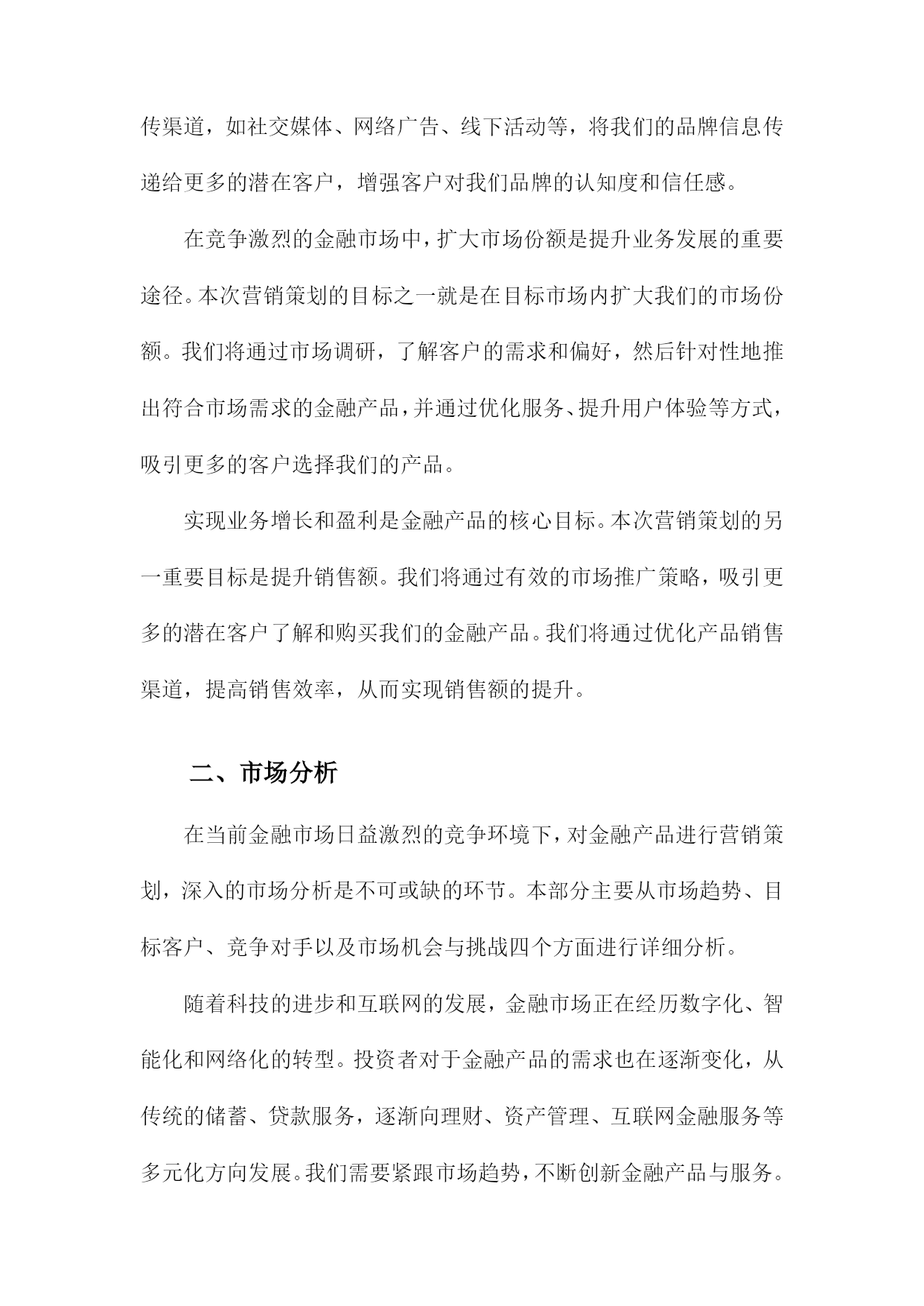 金融产品营销策划方案一、概述在当前金融市场日益繁荣的背景下,我们即将开展的金融产品营销策划方案致力于通过创新和差异化的策略,增强金融产品的市场竞争力。本次营销策划方案主要围绕一个核心理念展开:将客户的需求和市场的发展趋势紧密结合,以提供高品质、高附加值的金融产品与服务为核心目标。在此背景下,我们将结合市场分析,详细阐述我们的营销策略、推广方式、执行流程以及预期的成果和影响。我们深知金融市场的竞争日趋激烈,客户对于金融产品的需求也日益多元化和个性化。本营销策划方案旨在通过精准的市场定位,创新的产品设计,以及全方位的营销推广,实现金融产品的市场渗透和品牌提升。我们的目标不仅是满足客户的需求,更是要超越客户的期待,打造一流的金融产品与服务,实现业务持续发展和品牌价值的提升。我们也认识到营销挑战的严峻性,将通过精细化的市场分析和策略布局,应对市场的挑战和机遇。在接下来的方案中,我们将详细阐述我们的策略与行动计划。1.背景介绍:介绍当前金融市场的现状和发展趋势,阐述本营销策划方案的重要性和必要性。金融市场日新月异,互联网技术、大数据分析和人工智能等新兴科技的快速发展为金融行业带来了前所未有的变革。在这样的时代背景下,金融市场呈现出多元化、智能化、个性化的特点。客户需求日趋复杂化、个性化,金融市场也变得越来越竞争激烈的态势,传统的金融产品营销方式已经难以适应现代市场的需求。为了保持竞争优势,迎合市场发展趋势,我们迫切需要提出一套具有前瞻性和创新性的金融产品营销策划方案。在此背景下,本营销策划方案的重要性和必要性显而易见。随着金融市场的竞争日益加剧,金融机构必须积极主动地开展营销策划活动,以提高自身的品牌知名度和市场占有率。客户需求的变化和新兴科技的发展要求金融机构不断创新产品和服务,以满足客户的个性化需求。本营销策划方案旨在通过深入的市场分析、精准的目标定位、创新的营销策略和高效的执行管理,帮助金融机构实现产品营销的精准化和高效化,从而取得市场竞争的主动权。制定一套科学合理的金融产品营销策划方案对于金融机构的长远发展至关重要。2.营销目标:明确本次营销策划的目标,如提高品牌知名度、扩大市场份额、提升销售额等。品牌知名度是金融产品营销的基础。通过本次营销策划活动,我们旨在提升金融产品的品牌知名度和影响力。我们将通过多元化的宣传渠道,如社交媒体、网络广告、线下活动等,将我们的品牌信息传递给更多的潜在客户,增强客户对我们品牌的认知度和信任感。在竞争激烈的金融市场中,扩大市场份额是提升业务发展的重要途径。本次营销策划的目标之一就是在目标市场内扩大我们的市场份额。我们将通过市场调研,了解客户的需求和偏好,然后针对性地推出符合市场需求的金融产品,并通过优化服务、提升用户体验等方式,吸引更多的客户选择我们的产品。实现业务增长和盈利是金融产品的核心目标。本次营销策划的另一重要目标是提升销售额。我们将通过有效的市场推广策略,吸引更多的潜在客户了解和购买我们的金融产品。我们将通过优化产品销售渠道,提高销售效率,从而实现销售额的提升。二、市场分析在当前金融市场日益激烈的竞争环境下,对金融产品进行营销策划,深入的市场分析是不可或缺的环节。本部分主要从市场趋势、目标客户、竞争对手以及市场机会与挑战四个方面进行详细分析。随着科技的进步和互联网的发展,金融市场正在经历数字化、智能化和网络化的转型。投资者对于金融产品的需求也在逐渐变化,从传统的储蓄、贷款服务,逐渐向理财、资产管理、互联网金融服务等多元化方向发展。我们需要紧跟市场趋势,不断创新金融产品与服务。我们的目标客户主要包括高净值个人客户、中小企业以及金融机构。高净值个人客户注重资产保值增值,追求个性化服务;中小企业需要便捷、灵活的金融服务支持其业务发展;金融机构则寻求合作共赢,共同开拓市场。针对不同客户群体,我们需要制定差异化的营销策略。当前金融市场竞争激烈,主要竞争对手包括传统银行、互联网金融公司以及其他金融机构。他们拥有丰富的产品线、强大的客户基础以及先进的科技手段。我们需要密切关注竞争对手的动态,发挥自身竞争优势。金融市场的发展带来了诸多机遇,如科技创新、政策红利、消费升级等。也面临着诸多挑战,如市场竞争加剧、政策风险、技术风险等。我们需要准确把握市场机遇,积极应对挑战,不断提高金融产品的市场竞争力。通过对市场的深入分析,我们可以更好地了解市场需求,把握市场机遇,为金融产品的营销策划提供有力支持。1.目标市场分析:分析目标市场的特征,包括客户群体、市场规模、市场需求等。在我们的金融产品和服务推广过程中,对目标市场的深入分析是制定有效营销策略的关键。以下是关于目标市场的详细分析:客户群体:我们的金融产品服务的客户群体主要涵盖了广泛的年龄段和不同的社会阶层。包括但不限于年轻的白领工作者、中小企业主、高净值个人以