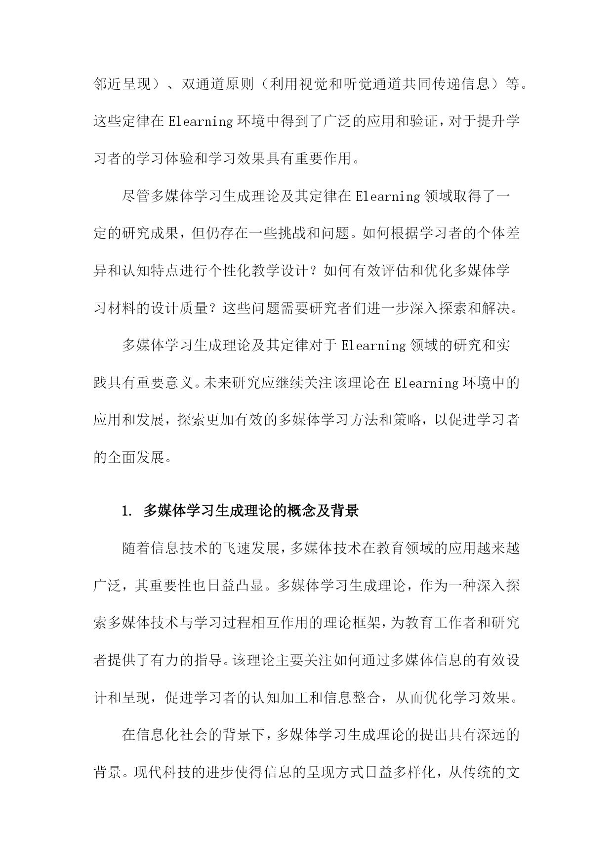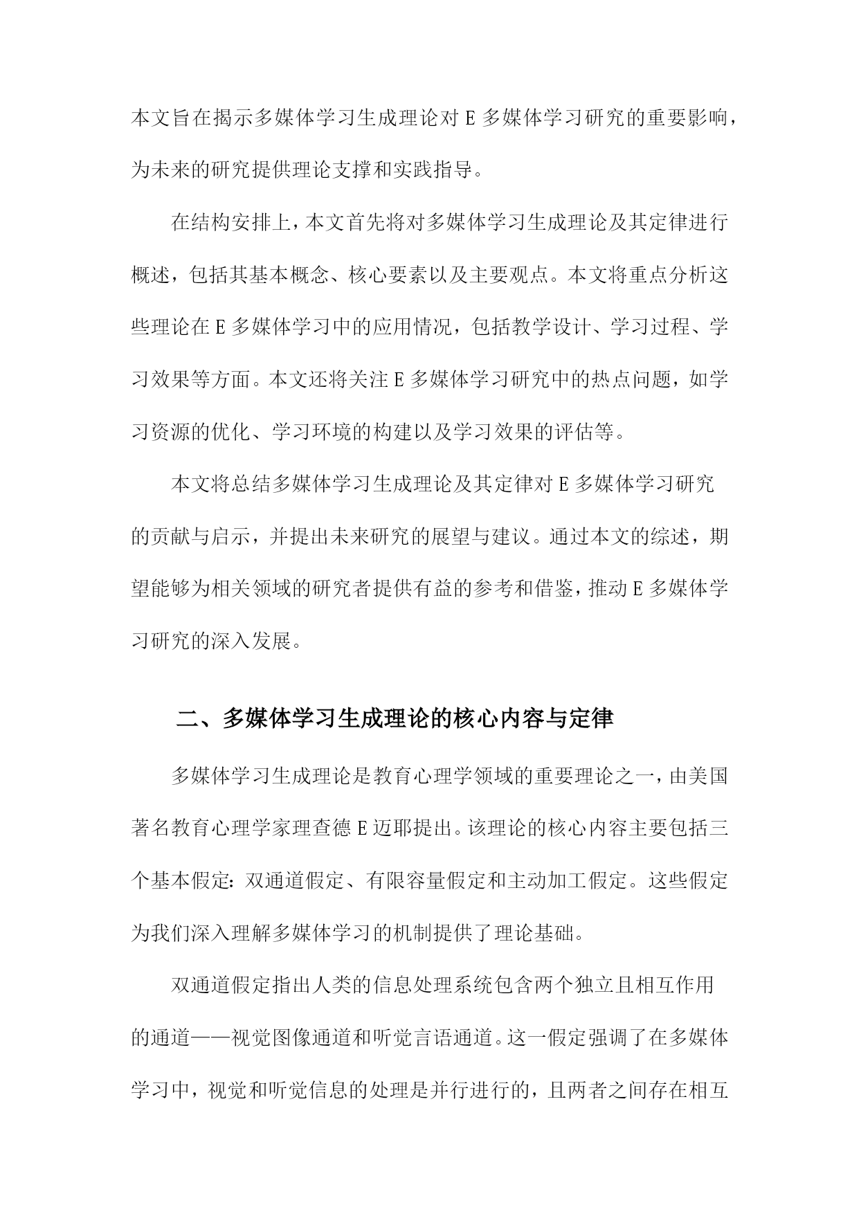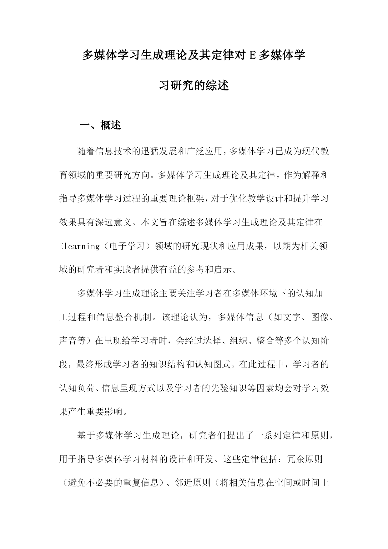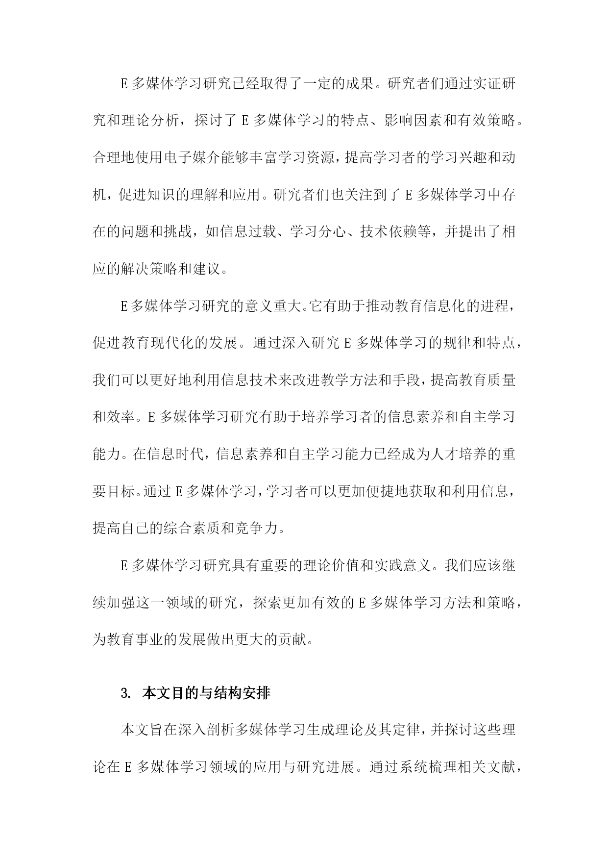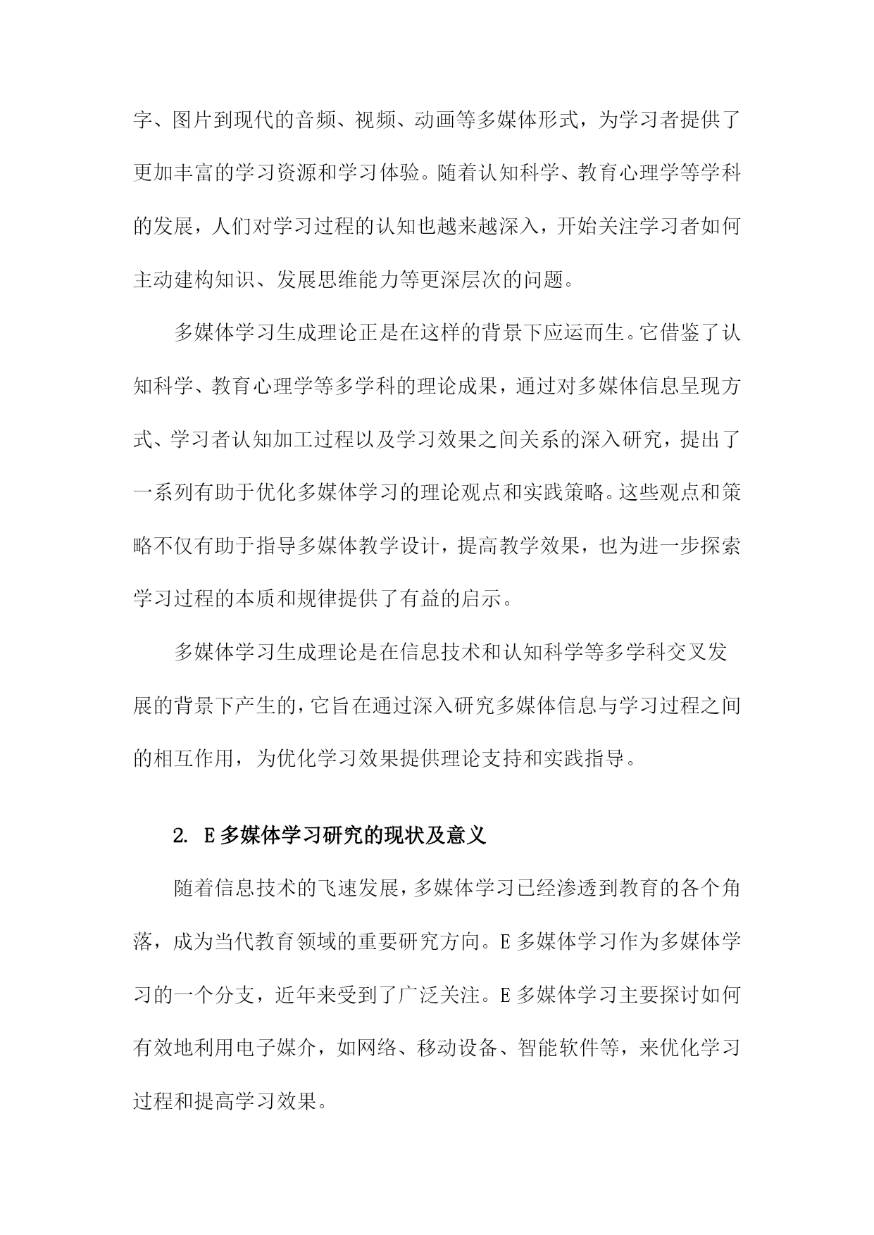 多媒体学习生成理论及其定律对E多媒体学习研究的综述一、概述随着信息技术的迅猛发展和广泛应用,多媒体学习已成为现代教育领域的重要研究方向。多媒体学习生成理论及其定律,作为解释和指导多媒体学习过程的重要理论框架,对于优化教学设计和提升学习效果具有深远意义。本文旨在综述多媒体学习生成理论及其定律在Elearning(电子学习)领域的研究现状和应用成果,以期为相关领域的研究者和实践者提供有益的参考和启示。多媒体学习生成理论主要关注学习者在多媒体环境下的认知加工过程和信息整合机制。该理论认为,多媒体信息(如文字、图像、声音等)在呈现给学习者时,会经过选择、组织、整合等多个认知阶段,最终形成学习者的知识结构和认知图式。在此过程中,学习者的认知负荷、信息呈现方式以及学习者的先验知识等因素均会对学习效果产生重要影响。基于多媒体学习生成理论,研究者们提出了一系列定律和原则,用于指导多媒体学习材料的设计和开发。这些定律包括:冗余原则(避免不必要的重复信息)、邻近原则(将相关信息在空间或时间上邻近呈现)、双通道原则(利用视觉和听觉通道共同传递信息)等。这些定律在Elearning环境中得到了广泛的应用和验证,对于提升学习者的学习体验和学习效果具有重要作用。尽管多媒体学习生成理论及其定律在Elearning领域取得了一定的研究成果,但仍存在一些挑战和问题。如何根据学习者的个体差异和认知特点进行个性化教学设计?如何有效评估和优化多媒体学习材料的设计质量?这些问题需要研究者们进一步深入探索和解决。多媒体学习生成理论及其定律对于Elearning领域的研究和实践具有重要意义。未来研究应继续关注该理论在Elearning环境中的应用和发展,探索更加有效的多媒体学习方法和策略,以促进学习者的全面发展。1.多媒体学习生成理论的概念及背景随着信息技术的飞速发展,多媒体技术在教育领域的应用越来越广泛,其重要性也日益凸显。多媒体学习生成理论,作为一种深入探索多媒体技术与学习过程相互作用的理论框架,为教育工作者和研究者提供了有力的指导。该理论主要关注如何通过多媒体信息的有效设计和呈现,促进学习者的认知加工和信息整合,从而优化学习效果。在信息化社会的背景下,多媒体学习生成理论的提出具有深远的背景。现代科技的进步使得信息的呈现方式日益多样化,从传统的文字、图片到现代的音频、视频、动画等多媒体形式,为学习者提供了更加丰富的学习资源和学习体验。随着认知科学、教育心理学等学科的发展,人们对学习过程的认知也越来越深入,开始关注学习者如何主动建构知识、发展思维能力等更深层次的问题。多媒体学习生成理论正是在这样的背景下应运而生。它借鉴了认知科学、教育心理学等多学科的理论成果,通过对多媒体信息呈现方式、学习者认知加工过程以及学习效果之间关系的深入研究,提出了一系列有助于优化多媒体学习的理论观点和实践策略。这些观点和策略不仅有助于指导多媒体教学设计,提高教学效果,也为进一步探索学习过程的本质和规律提供了有益的启示。多媒体学习生成理论是在信息技术和认知科学等多学科交叉发展的背景下产生的,它旨在通过深入研究多媒体信息与学习过程之间的相互作用,为优化学习效果提供理论支持和实践指导。2.E多媒体学习研究的现状及意义随着信息技术的飞速发展,多媒体学习已经渗透到教育的各个角落,成为当代教育领域的重要研究方向。E多媒体学习作为多媒体学习的一个分支,近年来受到了广泛关注。E多媒体学习主要探讨如何有效地利用电子媒介,如网络、移动设备、智能软件等,来优化学习过程和提高学习效果。E多媒体学习研究已经取得了一定的成果。研究者们通过实证研究和理论分析,探讨了E多媒体学习的特点、影响因素和有效策略。合理地使用电子媒介能够丰富学习资源,提高学习者的学习兴趣和动机,促进知识的理解和应用。研究者们也关注到了E多媒体学习中存在的问题和挑战,如信息过载、学习分心、技术依赖等,并提出了相应的解决策略和建议。E多媒体学习研究的意义重大。它有助于推动教育信息化的进程,促进教育现代化的发展。通过深入研究E多媒体学习的规律和特点,我们可以更好地利用信息技术来改进教学方法和手段,提高教育质量和效率。E多媒体学习研究有助于培养学习者的信息素养和自主学习能力。在信息时代,信息素养和自主学习能力已经成为人才培养的重要目标。通过E多媒体学习,学习者可以更加便捷地获取和利用信息,提高自己的综合素质和竞争力。E多媒体学习研究具有重要的理论价值和实践意义。我们应该继续加强这一领域的研究,探索更加有效的E多媒体学习方法和策略,为教育事业的发展做出更大的贡献。3.本文目的与结构安排本文旨在深入剖析多媒体学习生成理论及其定律,并探讨这些理论在E多媒体学习领域的应用与研究进展。通过系统梳理相关文献,本文旨在揭示多媒体学习生成理论对E多媒体学习研究的重要影响,为