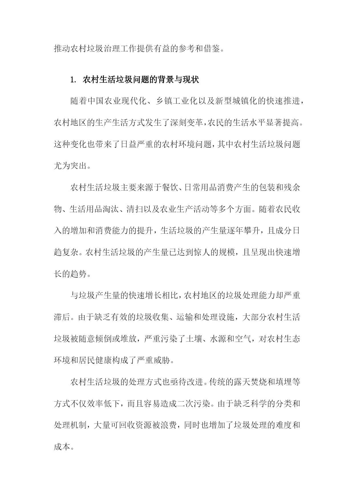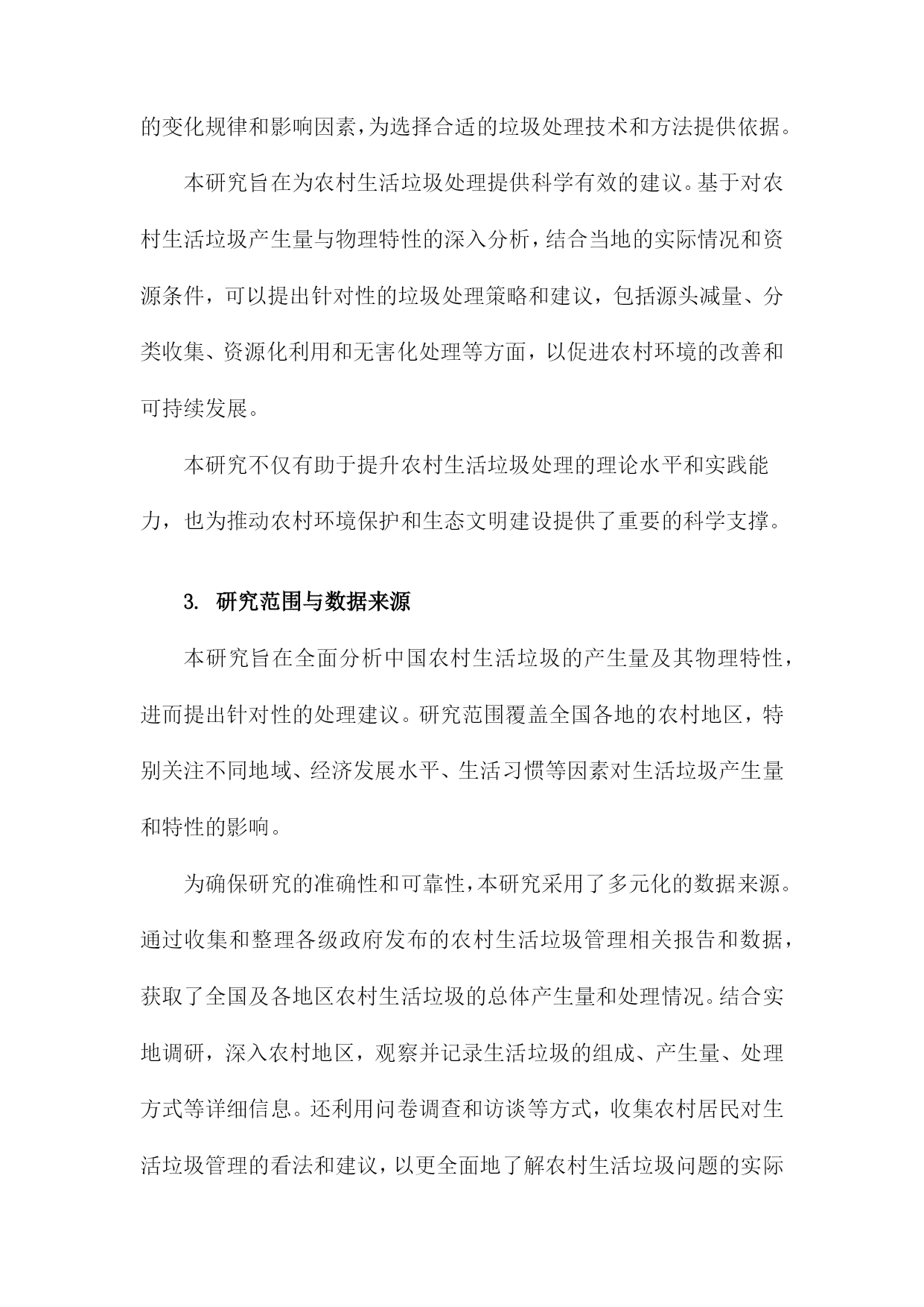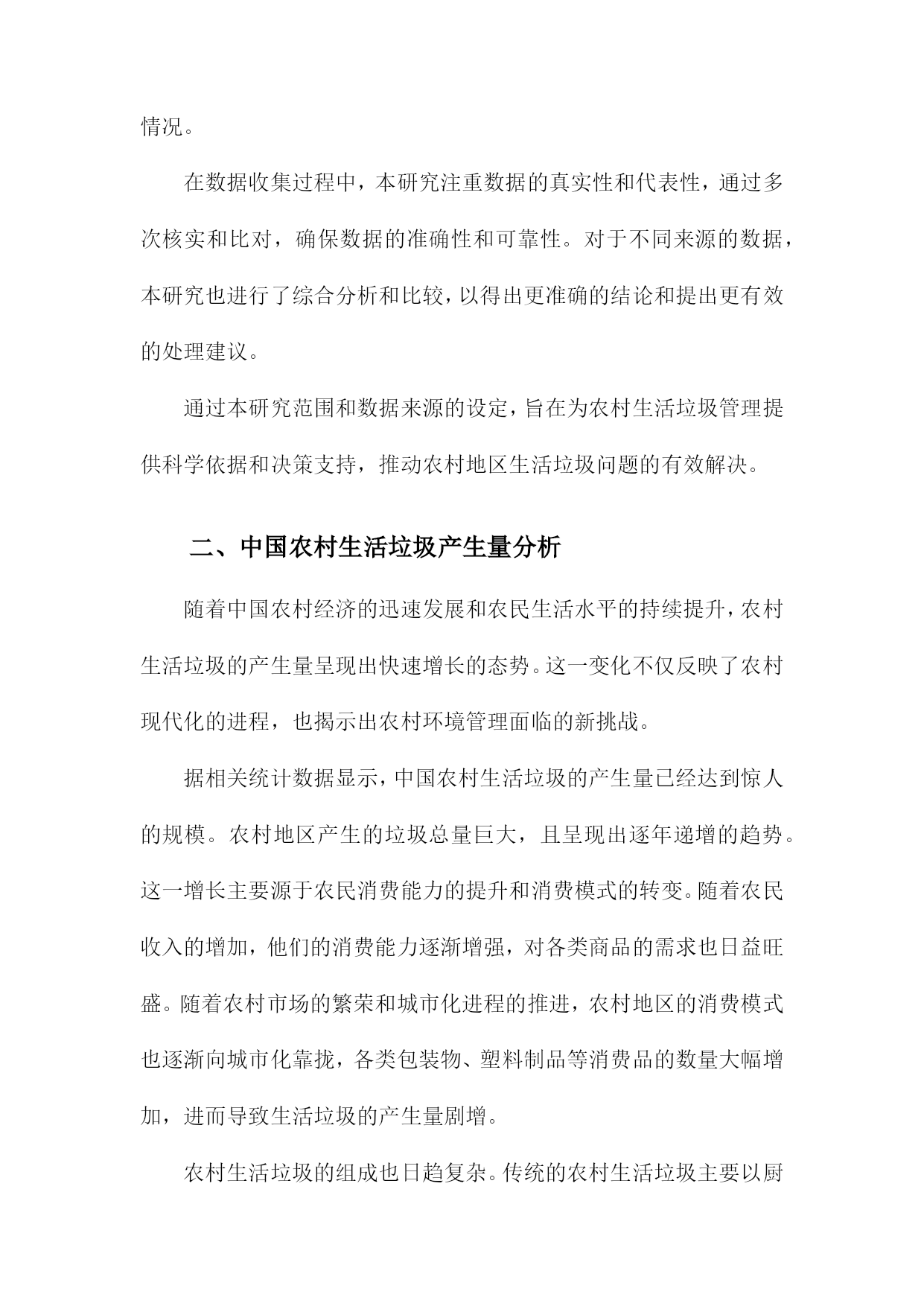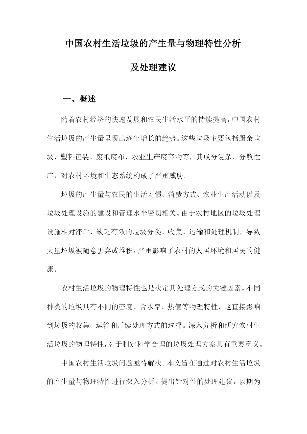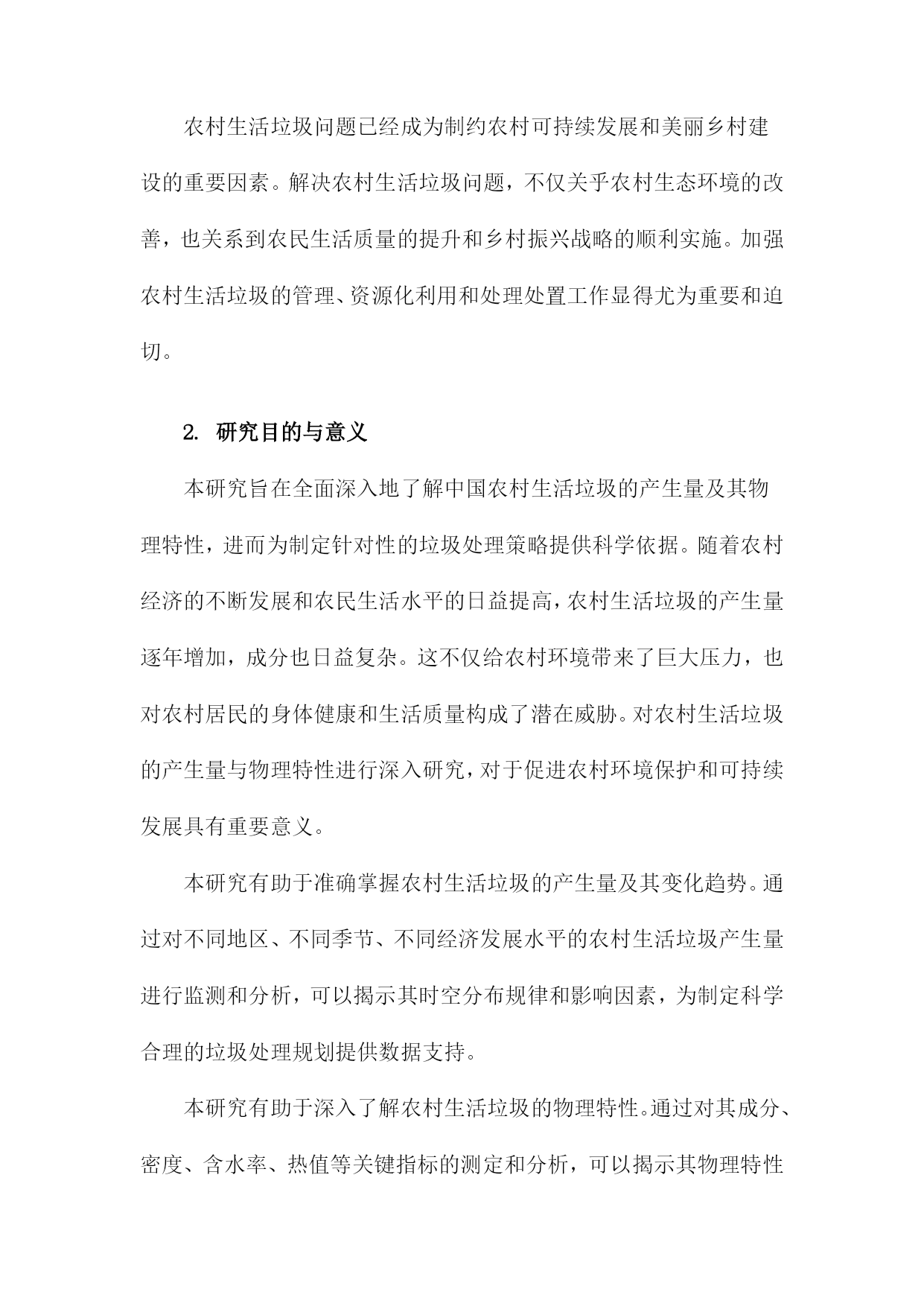 中国农村生活垃圾的产生量与物理特性分析及处理建议一、概述随着农村经济的快速发展和农民生活水平的持续提高,中国农村生活垃圾的产生量呈现出逐年增长的趋势。这些垃圾主要包括厨余垃圾、塑料包装、废纸废布、农业生产废弃物等,其成分复杂、分散性广,对农村环境和生态系统构成了严重威胁。垃圾的产生量与农民的生活习惯、消费方式、农业生产活动以及垃圾处理设施的建设和管理水平密切相关。由于农村地区的垃圾处理设施相对滞后,缺乏有效的垃圾分类、收集、运输和处理机制,导致大量垃圾被随意丢弃或堆积,严重影响了农村的人居环境和居民的健康。农村生活垃圾的物理特性也是决定其处理方式的关键因素。不同种类的垃圾具有不同的密度、含水率、热值等物理特性,这直接影响到垃圾的收集、运输和后续处理方式的选择。深入分析和研究农村生活垃圾的物理特性,对于制定科学合理的垃圾处理方案具有重要意义。中国农村生活垃圾问题亟待解决。本文旨在通过对农村生活垃圾的产生量与物理特性进行深入分析,提出针对性的处理建议,以期为推动农村垃圾治理工作提供有益的参考和借鉴。1.农村生活垃圾问题的背景与现状随着中国农业现代化、乡镇工业化以及新型城镇化的快速推进,农村地区的生产生活方式发生了深刻变革,农民的生活水平显著提高。这种变化也带来了日益严重的农村环境问题,其中农村生活垃圾问题尤为突出。农村生活垃圾主要来源于餐饮、日常用品消费产生的包装和残余物、生活用品淘汰、清扫以及农业生产活动等多个方面。随着农民收入的增加和消费能力的提升,生活垃圾的产生量逐年攀升,且成分日趋复杂。农村生活垃圾的产生量已达到惊人的规模,且呈现出快速增长的趋势。与垃圾产生量的快速增长相比,农村地区的垃圾处理能力却严重滞后。由于缺乏有效的垃圾收集、运输和处理设施,大部分农村生活垃圾被随意倾倒或堆放,严重污染了土壤、水源和空气,对农村生态环境和居民健康构成了严重威胁。农村生活垃圾的处理方式也亟待改进。传统的露天焚烧和填埋等方式不仅效率低下,而且容易造成二次污染。由于缺乏科学的分类和处理机制,大量可回收资源被浪费,同时也增加了垃圾处理的难度和成本。农村生活垃圾问题已经成为制约农村可持续发展和美丽乡村建设的重要因素。解决农村生活垃圾问题,不仅关乎农村生态环境的改善,也关系到农民生活质量的提升和乡村振兴战略的顺利实施。加强农村生活垃圾的管理、资源化利用和处理处置工作显得尤为重要和迫切。2.研究目的与意义本研究旨在全面深入地了解中国农村生活垃圾的产生量及其物理特性,进而为制定针对性的垃圾处理策略提供科学依据。随着农村经济的不断发展和农民生活水平的日益提高,农村生活垃圾的产生量逐年增加,成分也日益复杂。这不仅给农村环境带来了巨大压力,也对农村居民的身体健康和生活质量构成了潜在威胁。对农村生活垃圾的产生量与物理特性进行深入研究,对于促进农村环境保护和可持续发展具有重要意义。本研究有助于准确掌握农村生活垃圾的产生量及其变化趋势。通过对不同地区、不同季节、不同经济发展水平的农村生活垃圾产生量进行监测和分析,可以揭示其时空分布规律和影响因素,为制定科学合理的垃圾处理规划提供数据支持。本研究有助于深入了解农村生活垃圾的物理特性。通过对其成分、密度、含水率、热值等关键指标的测定和分析,可以揭示其物理特性的变化规律和影响因素,为选择合适的垃圾处理技术和方法提供依据。本研究旨在为农村生活垃圾处理提供科学有效的建议。基于对农村生活垃圾产生量与物理特性的深入分析,结合当地的实际情况和资源条件,可以提出针对性的垃圾处理策略和建议,包括源头减量、分类收集、资源化利用和无害化处理等方面,以促进农村环境的改善和可持续发展。本研究不仅有助于提升农村生活垃圾处理的理论水平和实践能力,也为推动农村环境保护和生态文明建设提供了重要的科学支撑。3.研究范围与数据来源本研究旨在全面分析中国农村生活垃圾的产生量及其物理特性,进而提出针对性的处理建议。研究范围覆盖全国各地的农村地区,特别关注不同地域、经济发展水平、生活习惯等因素对生活垃圾产生量和特性的影响。为确保研究的准确性和可靠性,本研究采用了多元化的数据来源。通过收集和整理各级政府发布的农村生活垃圾管理相关报告和数据,获取了全国及各地区农村生活垃圾的总体产生量和处理情况。结合实地调研,深入农村地区,观察并记录生活垃圾的组成、产生量、处理方式等详细信息。还利用问卷调查和访谈等方式,收集农村居民对生活垃圾管理的看法和建议,以更全面地了解农村生活垃圾问题的实际情况。在数据收集过程中,本研究注重数据的真实性和代表性,通过多次核实和比对,确保数据的准确性和可靠性。对于不同来源的数据,本研究也进行了综合分析和比较,以得出更准确的结论和提出更有效的处理建议。通过本研究范围和数据来源的设定,旨在为农村生活垃圾管理提供科学依据和决策支持,推动农村地区生活垃
