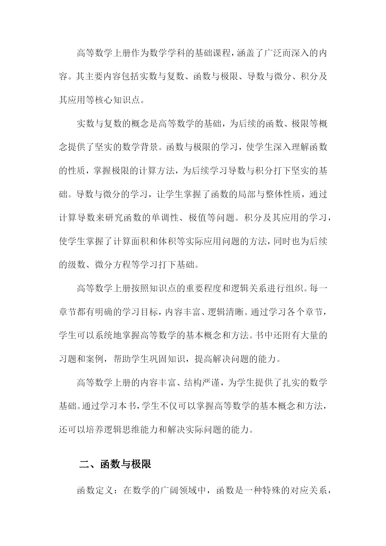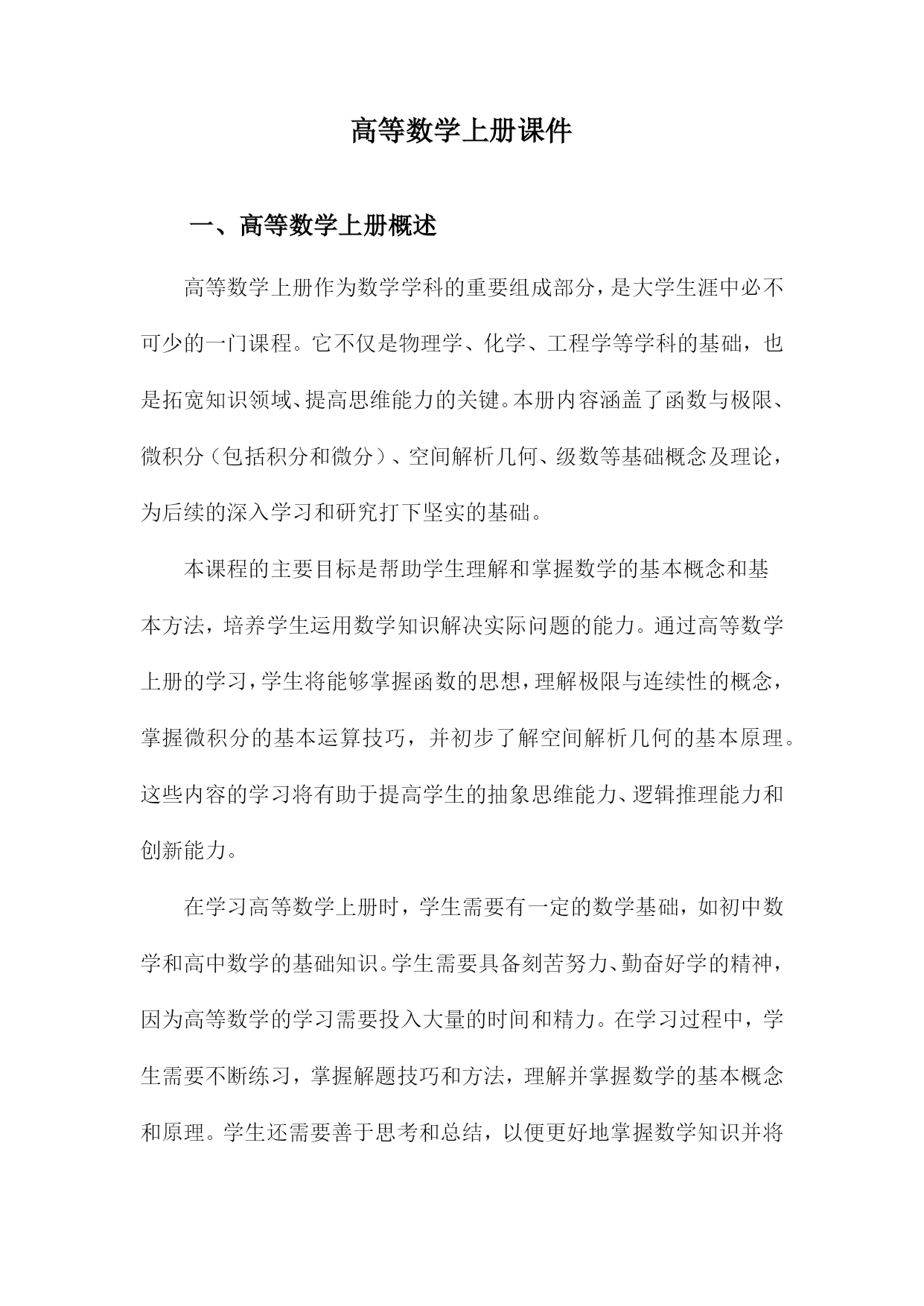 高等数学上册课件一、高等数学上册概述高等数学上册作为数学学科的重要组成部分,是大学生涯中必不可少的一门课程。它不仅是物理学、化学、工程学等学科的基础,也是拓宽知识领域、提高思维能力的关键。本册内容涵盖了函数与极限、微积分(包括积分和微分)、空间解析几何、级数等基础概念及理论,为后续的深入学习和研究打下坚实的基础。本课程的主要目标是帮助学生理解和掌握数学的基本概念和基本方法,培养学生运用数学知识解决实际问题的能力。通过高等数学上册的学习,学生将能够掌握函数的思想,理解极限与连续性的概念,掌握微积分的基本运算技巧,并初步了解空间解析几何的基本原理。这些内容的学习将有助于提高学生的抽象思维能力、逻辑推理能力和创新能力。在学习高等数学上册时,学生需要有一定的数学基础,如初中数学和高中数学的基础知识。学生需要具备刻苦努力、勤奋好学的精神,因为高等数学的学习需要投入大量的时间和精力。在学习过程中,学生需要不断练习,掌握解题技巧和方法,理解并掌握数学的基本概念和原理。学生还需要善于思考和总结,以便更好地掌握数学知识并将其应用于实际问题中。在教学方面,高等数学上册应注重理论与实践相结合的教学方法。教师可以通过讲解、演示和练习相结合的方式,帮助学生理解和掌握数学知识。教师还可以引导学生参与课堂讨论和互动,激发学生的学习兴趣和主动性。通过这种方法,学生可以更好地理解和掌握数学知识,提高学习效果。高等数学上册是数学学科的重要组成部分,它为后续的学习和研究打下坚实的基础。通过学习本课程,学生将掌握数学的基本概念和基本方法,提高数学思维能力,为未来的学习和工作打下坚实的基础。1.高等数学的重要性及其应用领域在高等教育体系中,高等数学上册作为一门重要的基础课程,具有举足轻重的地位。高等数学的重要性不仅体现在其作为一门基础学科的理论价值上,更在于其在各个领域中的广泛应用。高等数学是数学的一个重要分支,主要研究微积分、线性代数、常微分方程等基础理论。高等数学作为高等教育的核心课程之一,具有培养学生逻辑思维、问题解决能力、抽象思维能力等重要功能。通过高等数学的学习,学生不仅能够掌握数学基础知识,还能够培养科学精神和创新思维,为未来的学术研究和职业发展打下坚实的基础。高等数学的应用领域非常广泛,几乎渗透到所有科学和工程领域。以下是一些主要的应用领域:自然科学领域:高等数学在物理、化学、生物学等自然科学领域中有着广泛的应用。微积分在物理中用于描述物体的运动规律,线性代数在量子力学的矩阵表示中起到关键作用。工程领域:高等数学是工程学科的基础工具。在机械工程、土木工程、电子工程等领域,常微分方程和偏微分方程用于描述各种工程问题的数学模型,为工程设计提供理论支持。经济学与金融学:高等数学在经济学和金融学中也有着重要的应用。微积分和线性规划等工具被广泛应用于财务分析、风险评估和投资决策等领域。计算机科学:高等数学为计算机科学提供了算法和数学模型的基础。如微积分和线性代数在计算机图形学、机器学习等领域发挥着重要作用。医学领域:医学研究和诊断过程中也广泛应用高等数学的知识,如统计学和数学建模在疾病研究、药物研发和临床试验等方面的应用。高等数学的重要性体现在其作为一门基础学科的理论价值及其在各个领域中的广泛应用。通过学习和掌握高等数学的知识,可以为未来的学术研究和职业发展打下坚实的基础。2.高等数学上册的主要内容与结构高等数学上册作为数学学科的基础课程,涵盖了广泛而深入的内容。其主要内容包括实数与复数、函数与极限、导数与微分、积分及其应用等核心知识点。实数与复数的概念是高等数学的基础,为后续的函数、极限等概念提供了坚实的数学背景。函数与极限的学习,使学生深入理解函数的性质,掌握极限的计算方法,为后续学习导数与积分打下坚实的基础。导数与微分的学习,让学生掌握了函数的局部与整体性质,通过计算导数来研究函数的单调性、极值等问题。积分及其应用的学习,使学生掌握了计算面积和体积等实际应用问题的方法,同时也为后续的级数、微分方程等学习打下基础。高等数学上册按照知识点的重要程度和逻辑关系进行组织。每一章节都有明确的学习目标,内容丰富、逻辑清晰。通过学习各个章节,学生可以系统地掌握高等数学的基本概念和方法。书中还附有大量的习题和案例,帮助学生巩固知识,提高解决问题的能力。高等数学上册的内容丰富、结构严谨,为学生提供了扎实的数学基础。通过学习本书,学生不仅可以掌握高等数学的基本概念和方法,还可以培养逻辑思维能力和解决实际问题的能力。二、函数与极限函数定义:在数学的广阔领域中,函数是一种特殊的对应关系,对于定义域内的每一个自变量值,按照规则都有唯一确定的值与之对应。函数的定义域和值域分别限制了自变量和函数值的取值范围。函数的基本性质:包括有界性、单调性、奇偶性、周期性等。这些性质对于理解函数的图像