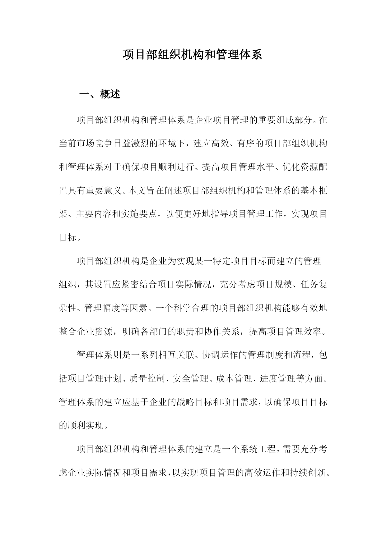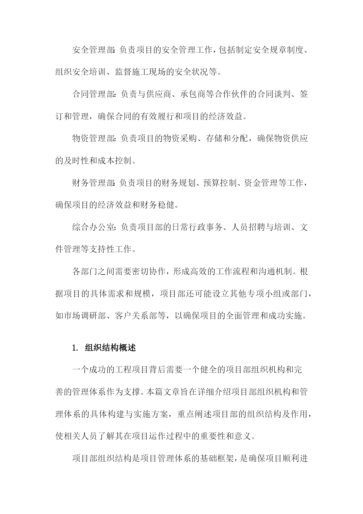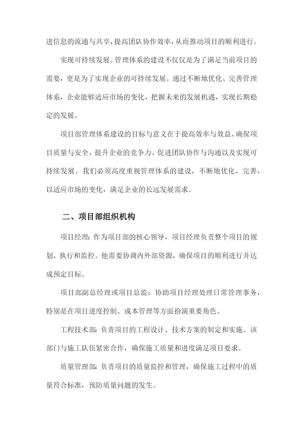 项目部组织机构和管理体系一、概述项目部组织机构和管理体系是企业项目管理的重要组成部分。在当前市场竞争日益激烈的环境下,建立高效、有序的项目部组织机构和管理体系对于确保项目顺利进行、提高项目管理水平、优化资源配置具有重要意义。本文旨在阐述项目部组织机构和管理体系的基本框架、主要内容和实施要点,以便更好地指导项目管理工作,实现项目目标。项目部组织机构是企业为实现某一特定项目目标而建立的管理组织,其设置应紧密结合项目实际情况,充分考虑项目规模、任务复杂性、管理幅度等因素。一个科学合理的项目部组织机构能够有效地整合企业资源,明确各部门的职责和协作关系,提高项目管理效率。管理体系则是一系列相互关联、协调运作的管理制度和流程,包括项目管理计划、质量控制、安全管理、成本管理、进度管理等方面。管理体系的建立应基于企业的战略目标和项目需求,以确保项目目标的顺利实现。项目部组织机构和管理体系的建立是一个系统工程,需要充分考虑企业实际情况和项目需求,以实现项目管理的高效运作和持续创新。本文将详细介绍项目部组织机构的设置原则、各部门职责以及管理体系的核心内容。1.项目部的重要性及其作用项目部在项目管理中扮演着至关重要的角色,其重要性不容忽视。它是项目实施的核心团队,承担着将项目从规划转化为实际运作的重要任务。项目部的设立是为了确保项目的顺利进行,实现项目目标,同时确保项目过程中的各项任务得以高效、有序地完成。项目管理实施:项目部负责项目的具体实施,包括项目策划、组织、协调、控制和评估等各个环节。通过科学的管理方法和手段,确保项目按计划进行,达到预定的质量、成本和时间目标。团队协调与沟通:项目部是项目团队成员之间的沟通和协调中心。由于项目通常涉及多个部门和领域,项目部的角色就在于促进各团队之间的信息共享和协作,确保项目的顺利进行。风险管理:项目部负责识别项目过程中的风险,并制定相应的应对策略和措施。通过风险评估和管理,减少项目风险对项目目标的影响。决策与执行:项目部在项目实施过程中需要做出各种决策,包括资源分配、问题解决和方案调整等。这些决策对于项目的成功至关重要,而项目部则是这些决策的执行者。项目部是项目管理中的核心力量,其作用贯穿项目的始终。从项目启动到结束,项目部都需要发挥关键作用,确保项目的顺利进行和目标的达成。建立高效的项目部组织机构和管理体系对于项目的成功至关重要。2.管理体系建设的目标与意义项目部管理体系的建设不仅关乎项目的顺利进行,更关乎整个企业的长远发展。其目标与意义主要体现在以下几个方面:提高效率与效益。通过构建科学、合理的管理体系,我们能够有效地整合项目资源,优化工作流程,提高项目管理效率,从而在保障项目质量的实现项目经济效益的最大化。确保项目质量与安全。管理体系的建设旨在通过明确的职责划分、严格的过程控制以及有效的监控机制,确保项目的质量与安全。通过规范化、标准化的管理,能够最大程度地减少项目风险,保障项目的顺利实施。提升企业的竞争力。一个健全的管理体系是提升企业核心竞争力的重要基础。通过管理体系的建设,企业能够形成自身的管理优势,从而在激烈的市场竞争中脱颖而出。促进团队协作与沟通。管理体系的建设不仅关注个体的作用,更强调团队的合作与沟通。通过明确各部门、各岗位的职责与权限,促进信息的流通与共享,提高团队协作效率,从而推动项目的顺利进行。实现可持续发展。管理体系的建设不仅仅是为了满足当前项目的需要,更是为了实现企业的可持续发展。通过不断地优化、完善管理体系,企业能够适应市场的变化,把握未来的发展机遇,实现长期稳定的发展。项目部管理体系建设的目标与意义在于提高效率与效益、确保项目质量与安全、提升企业的竞争力、促进团队协作与沟通以及实现可持续发展。我们必须高度重视管理体系的建设,不断地优化、完善,以适应市场的变化,满足企业的长远发展需求。二、项目部组织机构项目经理:作为项目部的核心领导,项目经理负责整个项目的规划、执行和监控。他需要协调内外部资源,确保项目的顺利进行并达成预定目标。项目部副总经理或项目总监:协助项目经理处理日常管理事务,特别是在项目进度控制、成本管理等方面扮演重要角色。工程技术部:负责项目的工程设计、技术方案的制定和实施。该部门与施工队伍紧密合作,确保施工质量和进度满足项目要求。质量管理部:负责项目的质量监控和管理,确保施工过程中的质量符合标准,预防质量问题的发生。安全管理部:负责项目的安全管理工作,包括制定安全规章制度、组织安全培训、监督施工现场的安全状况等。合同管理部:负责与供应商、承包商等合作伙伴的合同谈判、签订和管理,确保合同的有效履行和项目的经济效益。物资管理部:负责项目的物资采购、存储和分配,确保物资供应的及时性和成本控制。财务管理部:负责项目的财务规划、预算控制、资金管理等工作,确保项目的经济效益和财务
