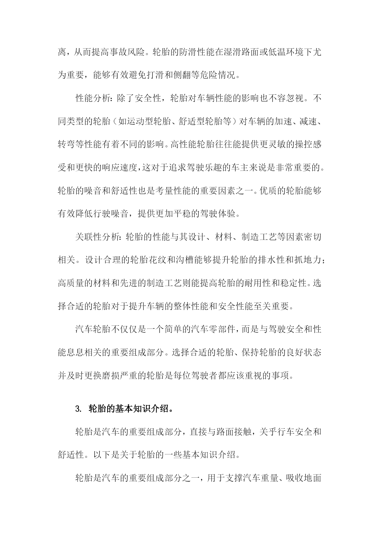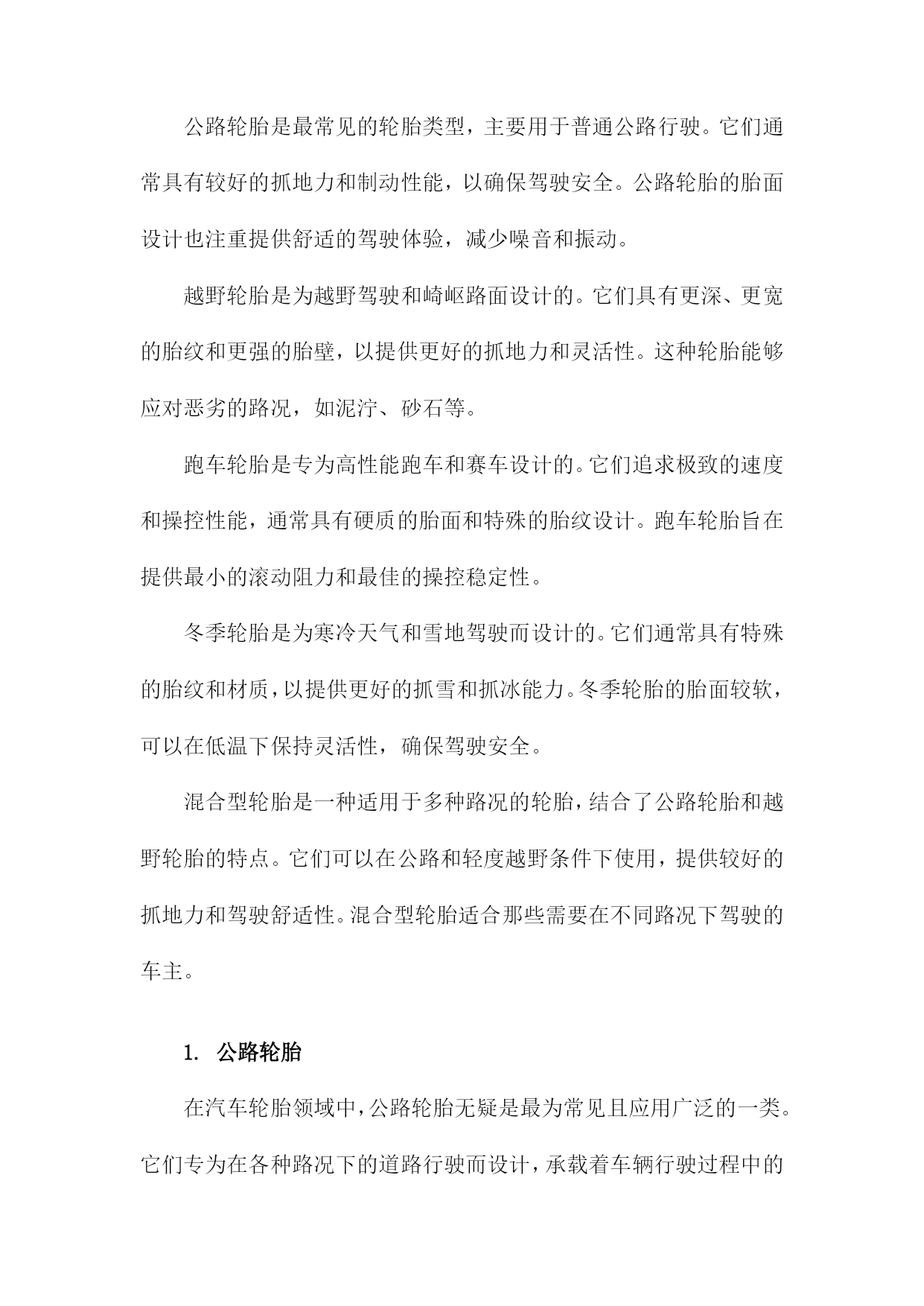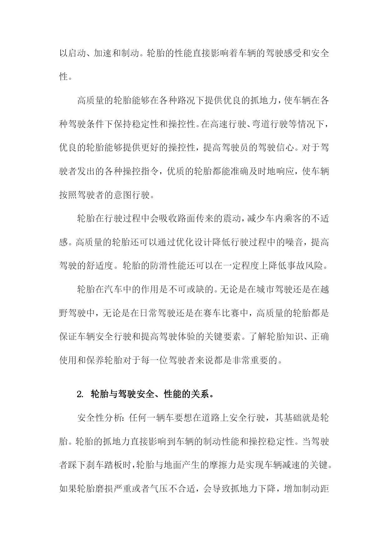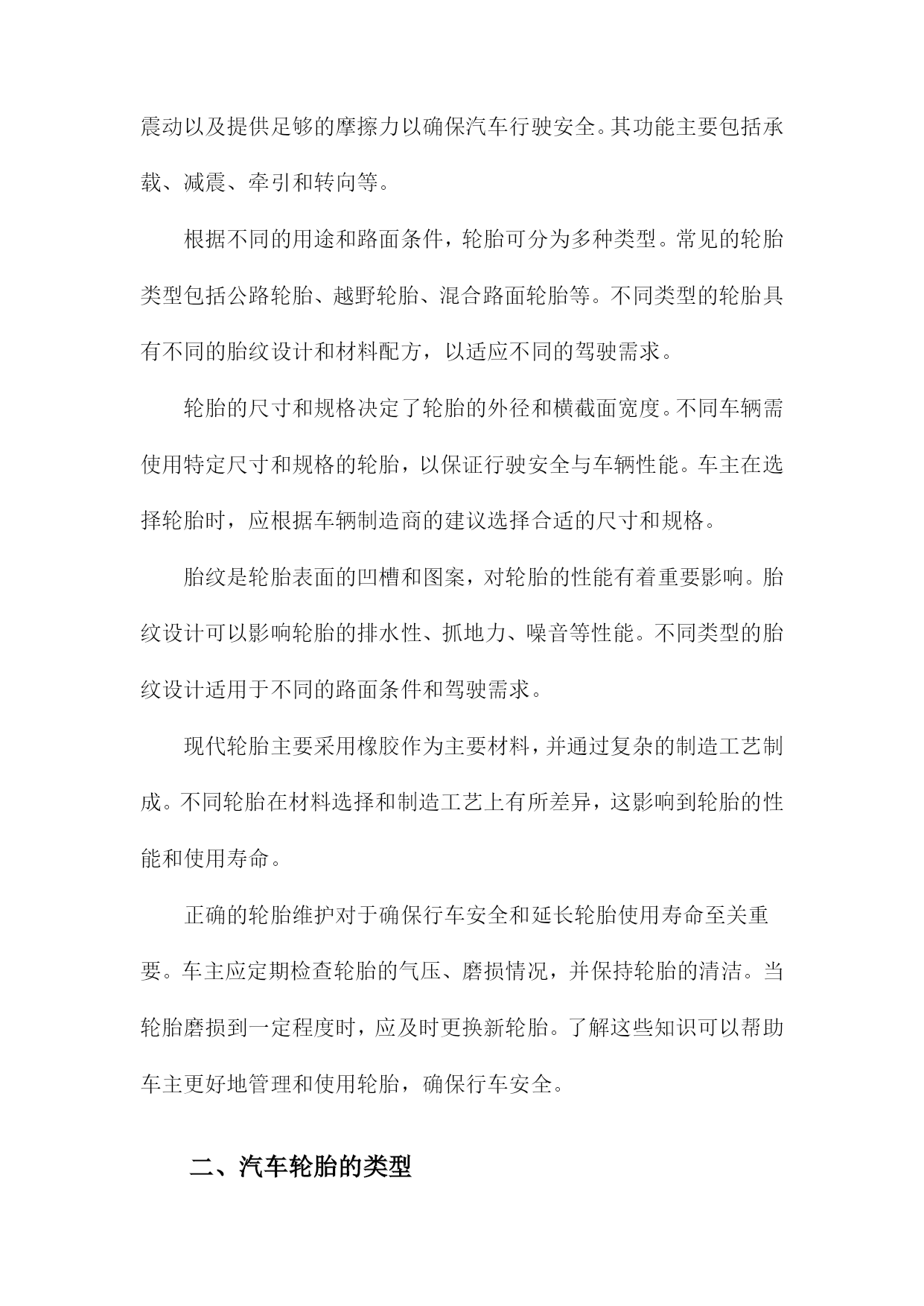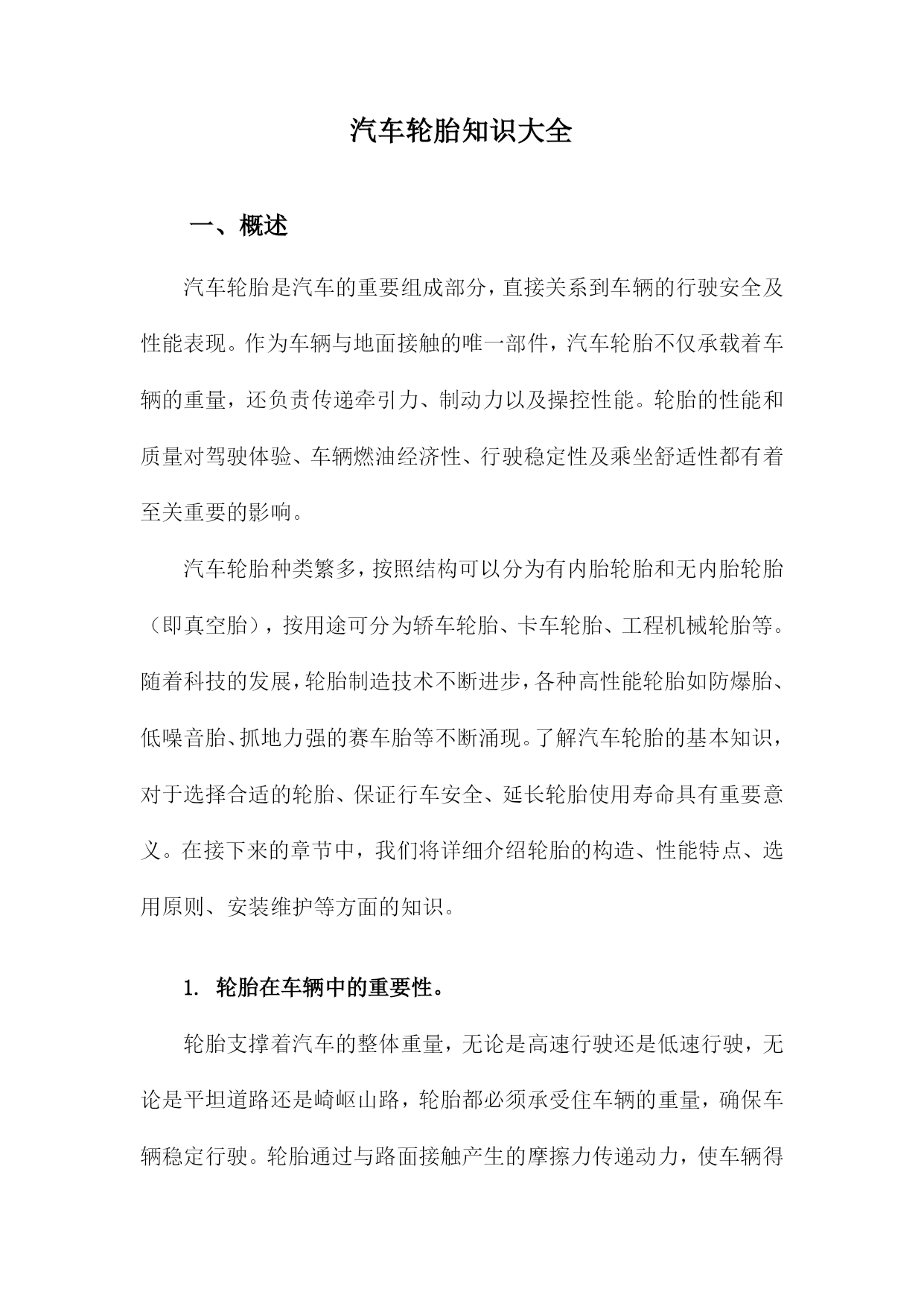 汽车轮胎知识大全一、概述汽车轮胎是汽车的重要组成部分,直接关系到车辆的行驶安全及性能表现。作为车辆与地面接触的唯一部件,汽车轮胎不仅承载着车辆的重量,还负责传递牵引力、制动力以及操控性能。轮胎的性能和质量对驾驶体验、车辆燃油经济性、行驶稳定性及乘坐舒适性都有着至关重要的影响。汽车轮胎种类繁多,按照结构可以分为有内胎轮胎和无内胎轮胎(即真空胎),按用途可分为轿车轮胎、卡车轮胎、工程机械轮胎等。随着科技的发展,轮胎制造技术不断进步,各种高性能轮胎如防爆胎、低噪音胎、抓地力强的赛车胎等不断涌现。了解汽车轮胎的基本知识,对于选择合适的轮胎、保证行车安全、延长轮胎使用寿命具有重要意义。在接下来的章节中,我们将详细介绍轮胎的构造、性能特点、选用原则、安装维护等方面的知识。1.轮胎在车辆中的重要性。轮胎支撑着汽车的整体重量,无论是高速行驶还是低速行驶,无论是平坦道路还是崎岖山路,轮胎都必须承受住车辆的重量,确保车辆稳定行驶。轮胎通过与路面接触产生的摩擦力传递动力,使车辆得以启动、加速和制动。轮胎的性能直接影响着车辆的驾驶感受和安全性。高质量的轮胎能够在各种路况下提供优良的抓地力,使车辆在各种驾驶条件下保持稳定性和操控性。在高速行驶、弯道行驶等情况下,优良的轮胎能够提供更好的操控性,提高驾驶员的驾驶信心。对于驾驶者发出的各种操控指令,优质的轮胎都能准确及时地响应,使车辆按照驾驶者的意图行驶。轮胎在行驶过程中会吸收路面传来的震动,减少车内乘客的不适感。高质量的轮胎还可以通过优化设计降低行驶过程中的噪音,提高驾驶的舒适度。轮胎的防滑性能还可以在一定程度上降低事故风险。轮胎在汽车中的作用是不可或缺的。无论是在城市驾驶还是在越野驾驶中,无论是在日常驾驶还是在赛车比赛中,高质量的轮胎都是保证车辆安全行驶和提高驾驶体验的关键要素。了解轮胎知识、正确使用和保养轮胎对于每一位驾驶者来说都是非常重要的。2.轮胎与驾驶安全、性能的关系。安全性分析:任何一辆车要想在道路上安全行驶,其基础就是轮胎。轮胎的抓地力直接影响到车辆的制动性能和操控稳定性。当驾驶者踩下刹车踏板时,轮胎与地面产生的摩擦力是实现车辆减速的关键。如果轮胎磨损严重或者气压不合适,会导致抓地力下降,增加制动距离,从而提高事故风险。轮胎的防滑性能在湿滑路面或低温环境下尤为重要,能够有效避免打滑和侧翻等危险情况。性能分析:除了安全性,轮胎对车辆性能的影响也不容忽视。不同类型的轮胎(如运动型轮胎、舒适型轮胎等)对车辆的加速、减速、转弯等性能有着不同的影响。高性能轮胎往往能提供更灵敏的操控感受和更快的响应速度,这对于追求驾驶乐趣的车主来说是非常重要的。轮胎的噪音和舒适性也是考量性能的重要因素之一。优质的轮胎能够有效降低行驶噪音,提供更加平稳的驾驶体验。关联性分析:轮胎的性能与其设计、材料、制造工艺等因素密切相关。设计合理的轮胎花纹和沟槽能够提升轮胎的排水性和抓地力;高质量的材料和先进的制造工艺则能提高轮胎的耐用性和稳定性。选择合适的轮胎对于提升车辆的整体性能和安全性能至关重要。汽车轮胎不仅仅是一个简单的汽车零部件,而是与驾驶安全和性能息息相关的重要组成部分。选择合适的轮胎、保持轮胎的良好状态并及时更换磨损严重的轮胎是每位驾驶者都应该重视的事项。3.轮胎的基本知识介绍。轮胎是汽车的重要组成部分,直接与路面接触,关乎行车安全和舒适性。以下是关于轮胎的一些基本知识介绍。轮胎是汽车的重要组成部分之一,用于支撑汽车重量、吸收地面震动以及提供足够的摩擦力以确保汽车行驶安全。其功能主要包括承载、减震、牵引和转向等。根据不同的用途和路面条件,轮胎可分为多种类型。常见的轮胎类型包括公路轮胎、越野轮胎、混合路面轮胎等。不同类型的轮胎具有不同的胎纹设计和材料配方,以适应不同的驾驶需求。轮胎的尺寸和规格决定了轮胎的外径和横截面宽度。不同车辆需使用特定尺寸和规格的轮胎,以保证行驶安全与车辆性能。车主在选择轮胎时,应根据车辆制造商的建议选择合适的尺寸和规格。胎纹是轮胎表面的凹槽和图案,对轮胎的性能有着重要影响。胎纹设计可以影响轮胎的排水性、抓地力、噪音等性能。不同类型的胎纹设计适用于不同的路面条件和驾驶需求。现代轮胎主要采用橡胶作为主要材料,并通过复杂的制造工艺制成。不同轮胎在材料选择和制造工艺上有所差异,这影响到轮胎的性能和使用寿命。正确的轮胎维护对于确保行车安全和延长轮胎使用寿命至关重要。车主应定期检查轮胎的气压、磨损情况,并保持轮胎的清洁。当轮胎磨损到一定程度时,应及时更换新轮胎。了解这些知识可以帮助车主更好地管理和使用轮胎,确保行车安全。二、汽车轮胎的类型公路轮胎是最常见的轮胎类型,主要用于普通公路行驶。它们通常具有较好的抓地力和制动性能,以确保驾驶安全。公路轮胎的胎面设计也注重提供舒适的驾驶体验,减少噪音和振动。越野轮胎是为越