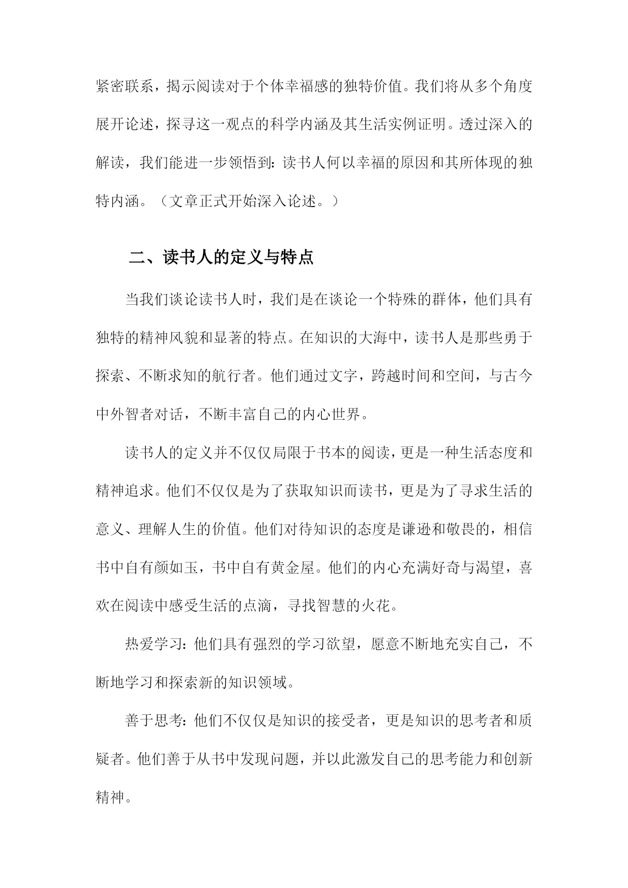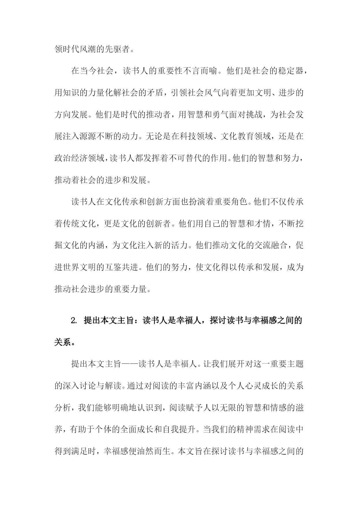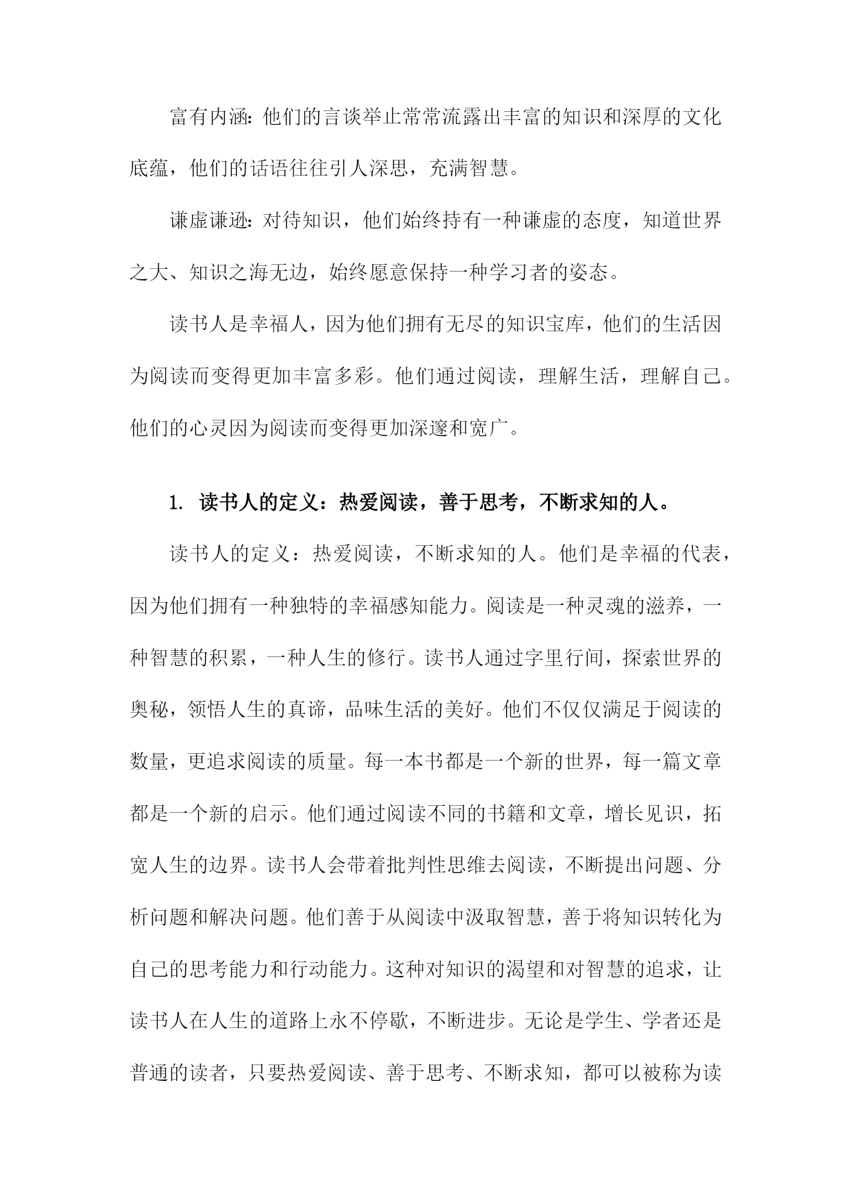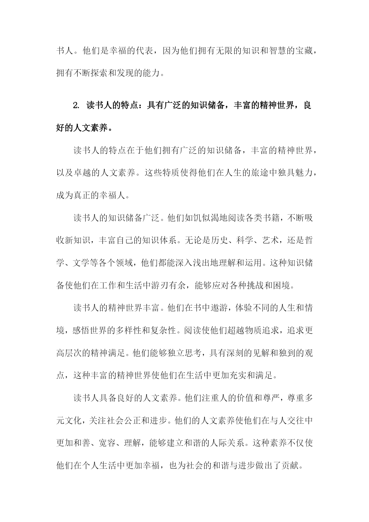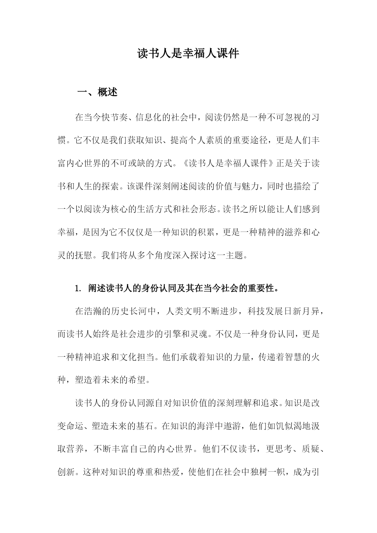 读书人是幸福人课件一、概述在当今快节奏、信息化的社会中,阅读仍然是一种不可忽视的习惯。它不仅是我们获取知识、提高个人素质的重要途径,更是人们丰富内心世界的不可或缺的方式。《读书人是幸福人课件》正是关于读书和人生的探索。该课件深刻阐述阅读的价值与魅力,同时也描绘了一个以阅读为核心的生活方式和社会形态。读书之所以能让人们感到幸福,是因为它不仅仅是一种知识的积累,更是一种精神的滋养和心灵的抚慰。我们将从多个角度深入探讨这一主题。1.阐述读书人的身份认同及其在当今社会的重要性。在浩瀚的历史长河中,人类文明不断进步,科技发展日新月异,而读书人始终是社会进步的引擎和灵魂。不仅是一种身份认同,更是一种精神追求和文化担当。他们承载着知识的力量,传递着智慧的火种,塑造着未来的希望。读书人的身份认同源自对知识价值的深刻理解和追求。知识是改变命运、塑造未来的基石。在知识的海洋中遨游,他们如饥似渴地汲取营养,不断丰富自己的内心世界。他们不仅读书,更思考、质疑、创新。这种对知识的尊重和热爱,使他们在社会中独树一帜,成为引领时代风潮的先驱者。在当今社会,读书人的重要性不言而喻。他们是社会的稳定器,用知识的力量化解社会的矛盾,引领社会风气向着更加文明、进步的方向发展。他们是时代的推动者,用智慧和勇气面对挑战,为社会发展注入源源不断的动力。无论是在科技领域、文化教育领域,还是在政治经济领域,读书人都发挥着不可替代的作用。他们的智慧和努力,推动着社会的进步和发展。读书人在文化传承和创新方面也扮演着重要角色。他们不仅传承着传统文化,更是文化的创新者。他们用自己的智慧和才情,不断挖掘文化的内涵,为文化注入新的活力。他们推动文化的交流融合,促进世界文明的互鉴共进。他们的努力,使文化得以传承和发展,成为推动社会进步的重要力量。2.提出本文主旨:读书人是幸福人,探讨读书与幸福感之间的关系。提出本文主旨——读书人是幸福人。让我们展开对这一重要主题的深入讨论与解读。通过对阅读的丰富内涵以及个人心灵成长的关系分析,我们能够明确地认识到,阅读赋予人以无限的智慧和情感的滋养,有助于个体的全面成长和自我提升。当我们的精神需求在阅读中得到满足时,幸福感便油然而生。本文旨在探讨读书与幸福感之间的紧密联系,揭示阅读对于个体幸福感的独特价值。我们将从多个角度展开论述,探寻这一观点的科学内涵及其生活实例证明。透过深入的解读,我们能进一步领悟到:读书人何以幸福的原因和其所体现的独特内涵。(文章正式开始深入论述。)二、读书人的定义与特点当我们谈论读书人时,我们是在谈论一个特殊的群体,他们具有独特的精神风貌和显著的特点。在知识的大海中,读书人是那些勇于探索、不断求知的航行者。他们通过文字,跨越时间和空间,与古今中外智者对话,不断丰富自己的内心世界。读书人的定义并不仅仅局限于书本的阅读,更是一种生活态度和精神追求。他们不仅仅是为了获取知识而读书,更是为了寻求生活的意义、理解人生的价值。他们对待知识的态度是谦逊和敬畏的,相信书中自有颜如玉,书中自有黄金屋。他们的内心充满好奇与渴望,喜欢在阅读中感受生活的点滴,寻找智慧的火花。热爱学习:他们具有强烈的学习欲望,愿意不断地充实自己,不断地学习和探索新的知识领域。善于思考:他们不仅仅是知识的接受者,更是知识的思考者和质疑者。他们善于从书中发现问题,并以此激发自己的思考能力和创新精神。富有内涵:他们的言谈举止常常流露出丰富的知识和深厚的文化底蕴,他们的话语往往引人深思,充满智慧。谦虚谦逊:对待知识,他们始终持有一种谦虚的态度,知道世界之大、知识之海无边,始终愿意保持一种学习者的姿态。读书人是幸福人,因为他们拥有无尽的知识宝库,他们的生活因为阅读而变得更加丰富多彩。他们通过阅读,理解生活,理解自己。他们的心灵因为阅读而变得更加深邃和宽广。1.读书人的定义:热爱阅读,善于思考,不断求知的人。读书人的定义:热爱阅读,不断求知的人。他们是幸福的代表,因为他们拥有一种独特的幸福感知能力。阅读是一种灵魂的滋养,一种智慧的积累,一种人生的修行。读书人通过字里行间,探索世界的奥秘,领悟人生的真谛,品味生活的美好。他们不仅仅满足于阅读的数量,更追求阅读的质量。每一本书都是一个新的世界,每一篇文章都是一个新的启示。他们通过阅读不同的书籍和文章,增长见识,拓宽人生的边界。读书人会带着批判性思维去阅读,不断提出问题、分析问题和解决问题。他们善于从阅读中汲取智慧,善于将知识转化为自己的思考能力和行动能力。这种对知识的渴望和对智慧的追求,让读书人在人生的道路上永不停歇,不断进步。无论是学生、学者还是普通的读者,只要热爱阅读、善于思考、不断求知,都可以被称为读书人。他们是幸福的代表,因为他们拥有无限的知识和智慧的宝藏,拥有不断探索和发现的能力。2.读书人的特点:具有广泛的知识储备,丰富的精