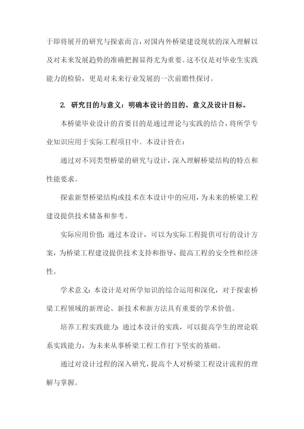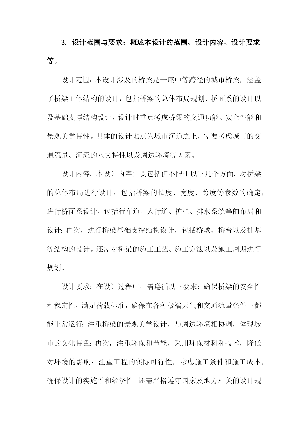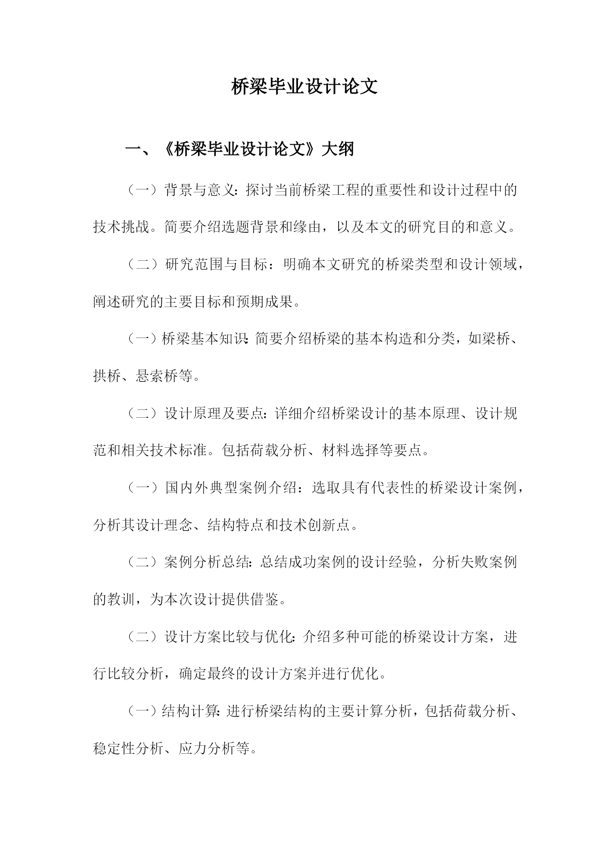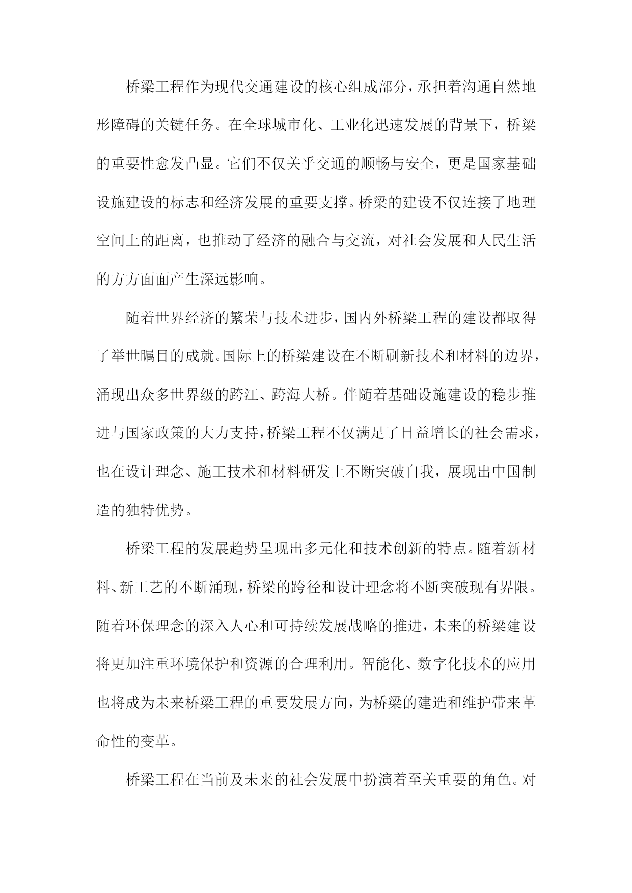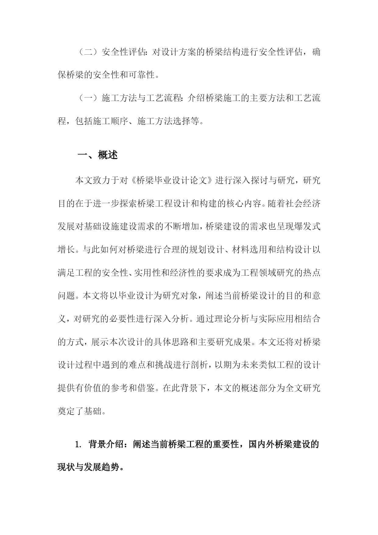 桥梁毕业设计论文一、《桥梁毕业设计论文》大纲(一)背景与意义:探讨当前桥梁工程的重要性和设计过程中的技术挑战。简要介绍选题背景和缘由,以及本文的研究目的和意义。(二)研究范围与目标:明确本文研究的桥梁类型和设计领域,阐述研究的主要目标和预期成果。(一)桥梁基本知识:简要介绍桥梁的基本构造和分类,如梁桥、拱桥、悬索桥等。(二)设计原理及要点:详细介绍桥梁设计的基本原理、设计规范和相关技术标准。包括荷载分析、材料选择等要点。(一)国内外典型案例介绍:选取具有代表性的桥梁设计案例,分析其设计理念、结构特点和技术创新点。(二)案例分析总结:总结成功案例的设计经验,分析失败案例的教训,为本次设计提供借鉴。(二)设计方案比较与优化:介绍多种可能的桥梁设计方案,进行比较分析,确定最终的设计方案并进行优化。(一)结构计算:进行桥梁结构的主要计算分析,包括荷载分析、稳定性分析、应力分析等。(二)安全性评估:对设计方案的桥梁结构进行安全性评估,确保桥梁的安全性和可靠性。(一)施工方法与工艺流程:介绍桥梁施工的主要方法和工艺流程,包括施工顺序、施工方法选择等。一、概述本文致力于对《桥梁毕业设计论文》进行深入探讨与研究,研究目的在于进一步探索桥梁工程设计和构建的核心内容。随着社会经济发展对基础设施建设需求的不断增加,桥梁建设的需求也呈现爆发式增长。与此如何对桥梁进行合理的规划设计、材料选用和结构设计以满足工程的安全性、实用性和经济性的要求成为工程领域研究的热点问题。本文将以毕业设计为研究对象,阐述当前桥梁设计的目的和意义,对研究的必要性进行深入分析。通过理论分析与实际应用相结合的方式,展示本次设计的具体思路和主要研究成果。本文还将对桥梁设计过程中遇到的难点和挑战进行剖析,以期为未来类似工程的设计提供有价值的参考和借鉴。在此背景下,本文的概述部分为全文研究奠定了基础。1.背景介绍:阐述当前桥梁工程的重要性,国内外桥梁建设的现状与发展趋势。桥梁工程作为现代交通建设的核心组成部分,承担着沟通自然地形障碍的关键任务。在全球城市化、工业化迅速发展的背景下,桥梁的重要性愈发凸显。它们不仅关乎交通的顺畅与安全,更是国家基础设施建设的标志和经济发展的重要支撑。桥梁的建设不仅连接了地理空间上的距离,也推动了经济的融合与交流,对社会发展和人民生活的方方面面产生深远影响。随着世界经济的繁荣与技术进步,国内外桥梁工程的建设都取得了举世瞩目的成就。国际上的桥梁建设在不断刷新技术和材料的边界,涌现出众多世界级的跨江、跨海大桥。伴随着基础设施建设的稳步推进与国家政策的大力支持,桥梁工程不仅满足了日益增长的社会需求,也在设计理念、施工技术和材料研发上不断突破自我,展现出中国制造的独特优势。桥梁工程的发展趋势呈现出多元化和技术创新的特点。随着新材料、新工艺的不断涌现,桥梁的跨径和设计理念将不断突破现有界限。随着环保理念的深入人心和可持续发展战略的推进,未来的桥梁建设将更加注重环境保护和资源的合理利用。智能化、数字化技术的应用也将成为未来桥梁工程的重要发展方向,为桥梁的建造和维护带来革命性的变革。桥梁工程在当前及未来的社会发展中扮演着至关重要的角色。对于即将展开的研究与探索而言,对国内外桥梁建设现状的深入理解以及对未来发展趋势的准确把握显得尤为重要。这不仅是对毕业生实践能力的检验,更是对未来行业发展的一次前瞻性探讨。2.研究目的与意义:明确本设计的目的、意义及设计目标。本桥梁毕业设计的首要目的是通过理论与实践的结合,将所学专业知识应用于实际工程项目中。本设计旨在:通过对不同类型桥梁的研究与设计,深入理解桥梁结构的特点和性能要求。探索新型桥梁结构或技术在本设计中的应用,为未来的桥梁工程建设提供技术储备和参考。实际应用价值:通过本设计,可以为实际工程提供可行的设计方案,为桥梁工程建设提供技术支持和指导,提高工程的安全性和经济性。学术意义:本设计是对所学知识的综合运用和深化,对于探索桥梁工程领域的新理论、新技术和新方法具有重要的学术价值。培养工程实践能力:通过本设计的实践,可以提高学生的理论联系实践能力,为未来从事桥梁工程工作打下坚实的基础。通过对设计过程的深入研究,提高个人对桥梁工程设计流程的理解与掌握。3.设计范围与要求:概述本设计的范围、设计内容、设计要求等。设计范围:本设计涉及的桥梁是一座中等跨径的城市桥梁,涵盖了桥梁主体结构的设计,包括桥梁的总体布局规划、桥面系的设计以及基础支撑结构设计。设计时重点考虑桥梁的交通功能、安全性能和景观美学特性。具体的设计地点为城市河道之上,需要考虑城市的交通流量、河流的水文特性以及周边环境等因素。设计内容:本设计内容主要包括但不限于以下几个方面:对桥梁的总体布局进行设计,包括桥梁的长度、宽度、跨度等参数的确定;进行桥面系设计,包括行车道、人行道、护栏