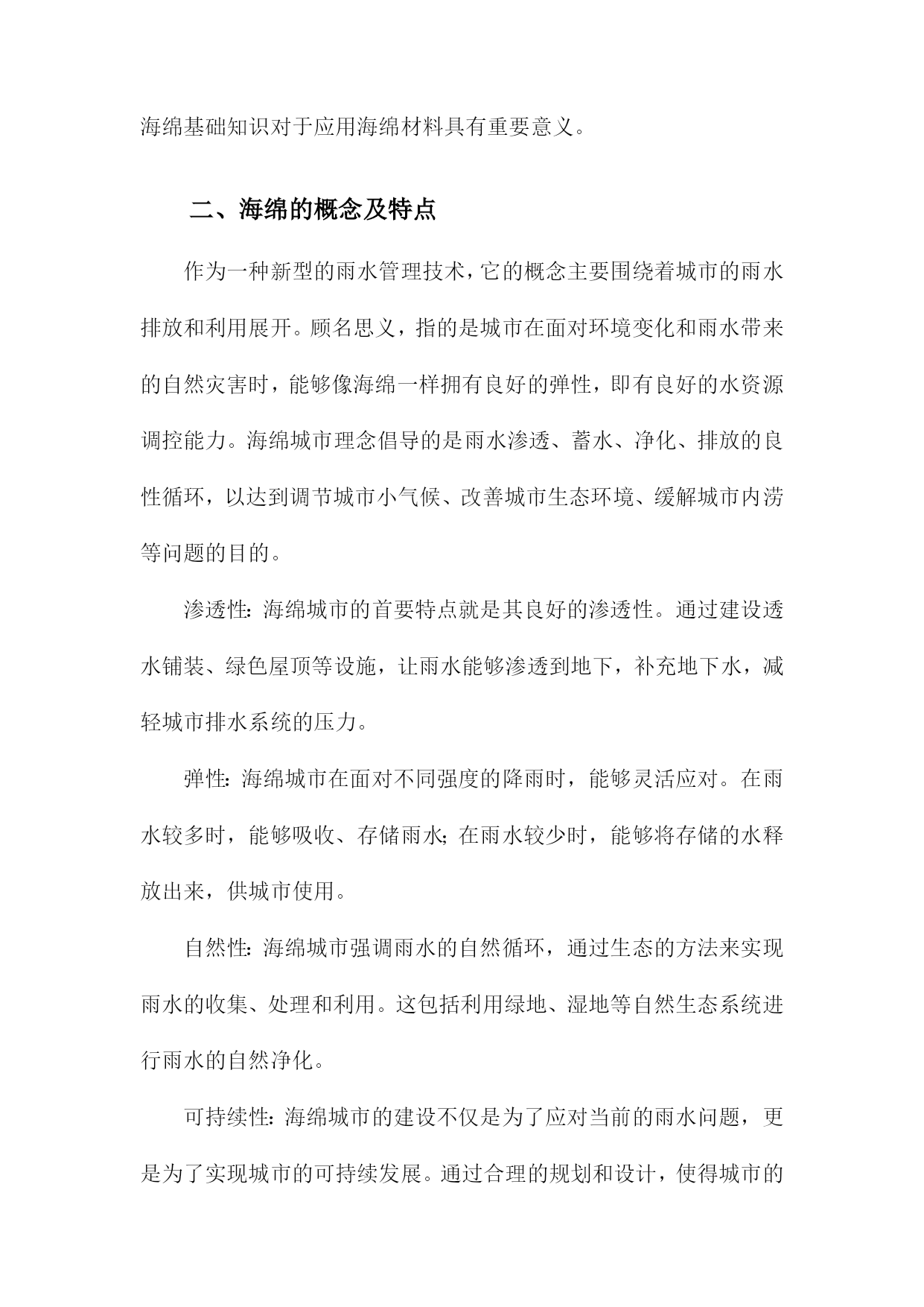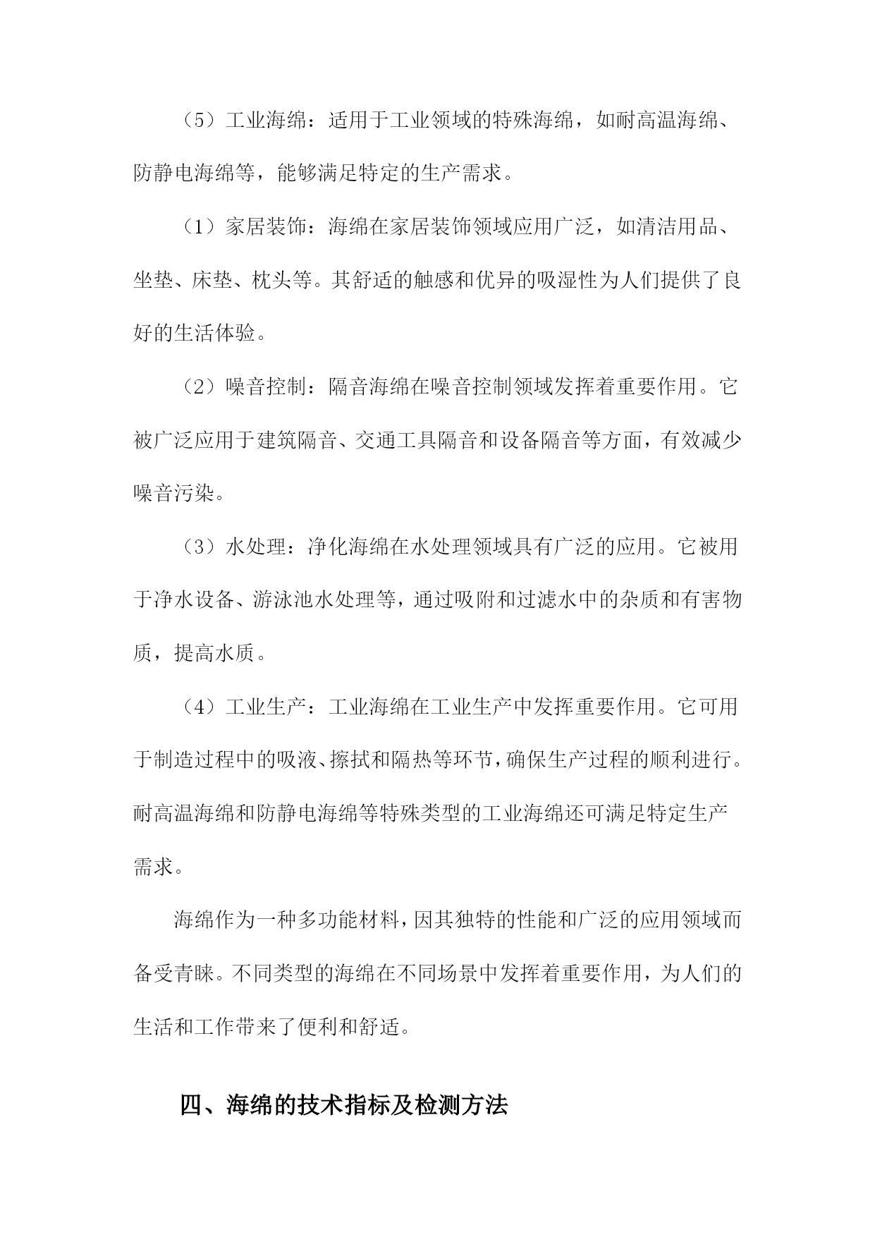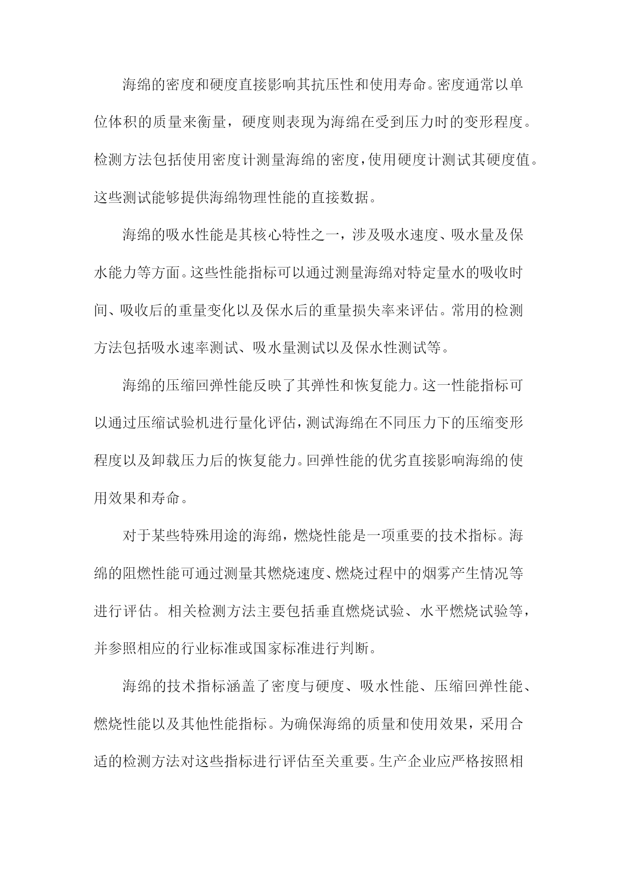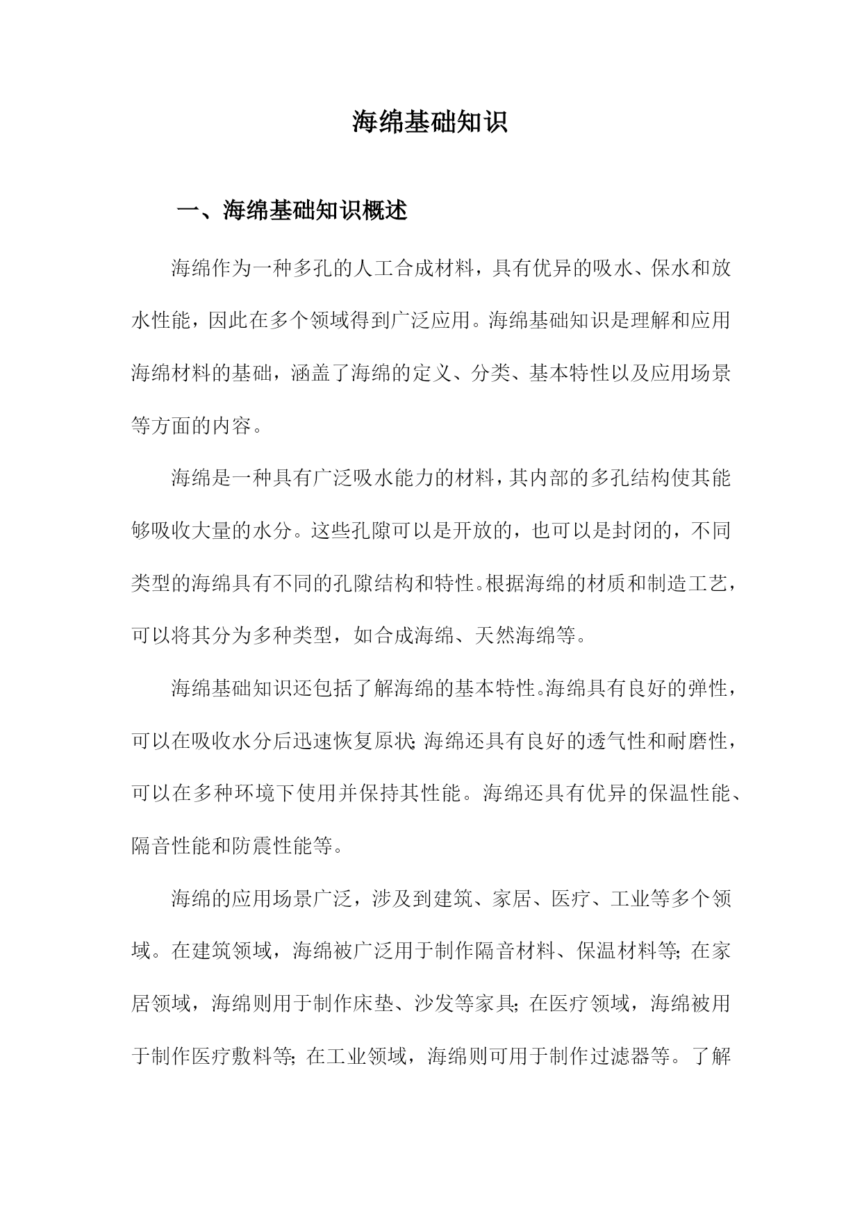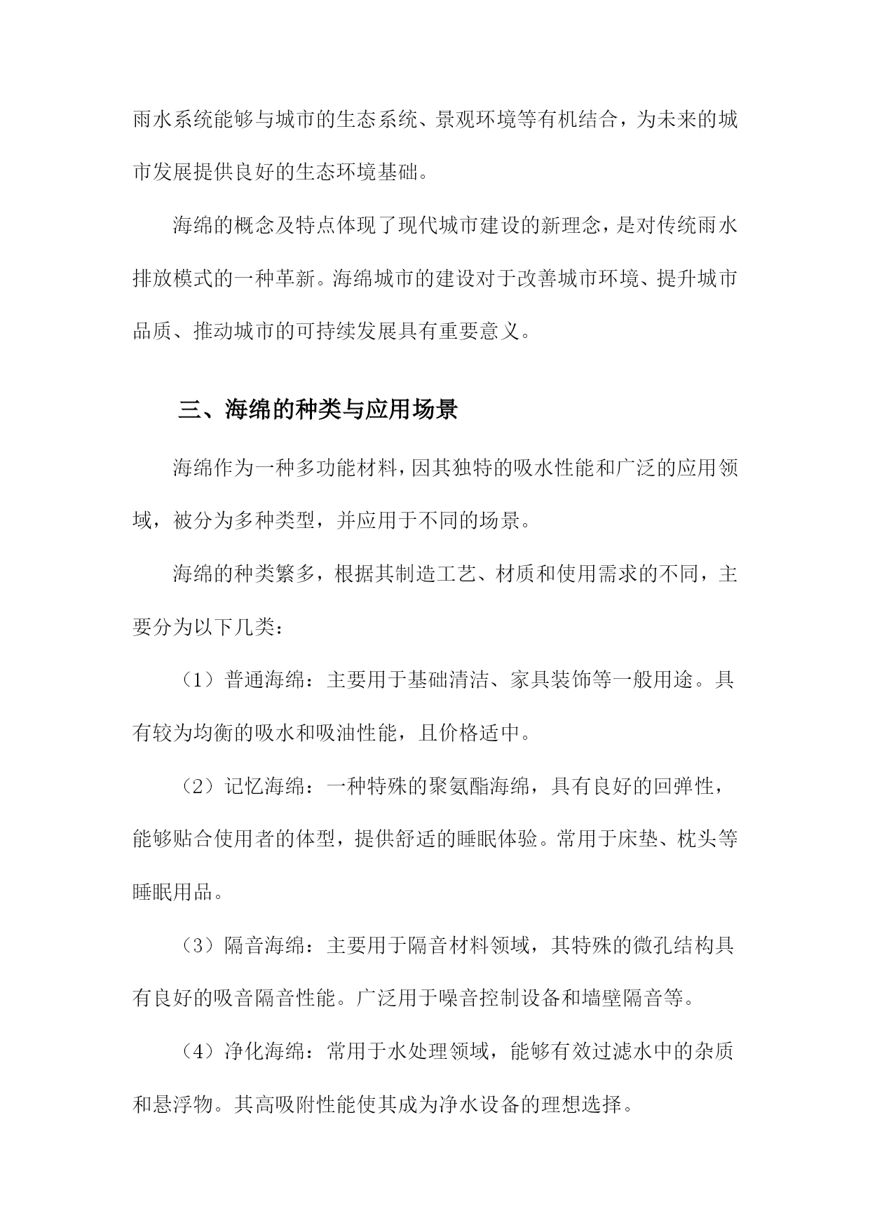 海绵基础知识一、海绵基础知识概述海绵作为一种多孔的人工合成材料,具有优异的吸水、保水和放水性能,因此在多个领域得到广泛应用。海绵基础知识是理解和应用海绵材料的基础,涵盖了海绵的定义、分类、基本特性以及应用场景等方面的内容。海绵是一种具有广泛吸水能力的材料,其内部的多孔结构使其能够吸收大量的水分。这些孔隙可以是开放的,也可以是封闭的,不同类型的海绵具有不同的孔隙结构和特性。根据海绵的材质和制造工艺,可以将其分为多种类型,如合成海绵、天然海绵等。海绵基础知识还包括了解海绵的基本特性。海绵具有良好的弹性,可以在吸收水分后迅速恢复原状;海绵还具有良好的透气性和耐磨性,可以在多种环境下使用并保持其性能。海绵还具有优异的保温性能、隔音性能和防震性能等。海绵的应用场景广泛,涉及到建筑、家居、医疗、工业等多个领域。在建筑领域,海绵被广泛用于制作隔音材料、保温材料等;在家居领域,海绵则用于制作床垫、沙发等家具;在医疗领域,海绵被用于制作医疗敷料等;在工业领域,海绵则可用于制作过滤器等。了解海绵基础知识对于应用海绵材料具有重要意义。二、海绵的概念及特点作为一种新型的雨水管理技术,它的概念主要围绕着城市的雨水排放和利用展开。顾名思义,指的是城市在面对环境变化和雨水带来的自然灾害时,能够像海绵一样拥有良好的弹性,即有良好的水资源调控能力。海绵城市理念倡导的是雨水渗透、蓄水、净化、排放的良性循环,以达到调节城市小气候、改善城市生态环境、缓解城市内涝等问题的目的。渗透性:海绵城市的首要特点就是其良好的渗透性。通过建设透水铺装、绿色屋顶等设施,让雨水能够渗透到地下,补充地下水,减轻城市排水系统的压力。弹性:海绵城市在面对不同强度的降雨时,能够灵活应对。在雨水较多时,能够吸收、存储雨水;在雨水较少时,能够将存储的水释放出来,供城市使用。自然性:海绵城市强调雨水的自然循环,通过生态的方法来实现雨水的收集、处理和利用。这包括利用绿地、湿地等自然生态系统进行雨水的自然净化。可持续性:海绵城市的建设不仅是为了应对当前的雨水问题,更是为了实现城市的可持续发展。通过合理的规划和设计,使得城市的雨水系统能够与城市的生态系统、景观环境等有机结合,为未来的城市发展提供良好的生态环境基础。海绵的概念及特点体现了现代城市建设的新理念,是对传统雨水排放模式的一种革新。海绵城市的建设对于改善城市环境、提升城市品质、推动城市的可持续发展具有重要意义。三、海绵的种类与应用场景海绵作为一种多功能材料,因其独特的吸水性能和广泛的应用领域,被分为多种类型,并应用于不同的场景。海绵的种类繁多,根据其制造工艺、材质和使用需求的不同,主要分为以下几类:(1)普通海绵:主要用于基础清洁、家具装饰等一般用途。具有较为均衡的吸水和吸油性能,且价格适中。(2)记忆海绵:一种特殊的聚氨酯海绵,具有良好的回弹性,能够贴合使用者的体型,提供舒适的睡眠体验。常用于床垫、枕头等睡眠用品。(3)隔音海绵:主要用于隔音材料领域,其特殊的微孔结构具有良好的吸音隔音性能。广泛用于噪音控制设备和墙壁隔音等。(4)净化海绵:常用于水处理领域,能够有效过滤水中的杂质和悬浮物。其高吸附性能使其成为净水设备的理想选择。(5)工业海绵:适用于工业领域的特殊海绵,如耐高温海绵、防静电海绵等,能够满足特定的生产需求。(1)家居装饰:海绵在家居装饰领域应用广泛,如清洁用品、坐垫、床垫、枕头等。其舒适的触感和优异的吸湿性为人们提供了良好的生活体验。(2)噪音控制:隔音海绵在噪音控制领域发挥着重要作用。它被广泛应用于建筑隔音、交通工具隔音和设备隔音等方面,有效减少噪音污染。(3)水处理:净化海绵在水处理领域具有广泛的应用。它被用于净水设备、游泳池水处理等,通过吸附和过滤水中的杂质和有害物质,提高水质。(4)工业生产:工业海绵在工业生产中发挥重要作用。它可用于制造过程中的吸液、擦拭和隔热等环节,确保生产过程的顺利进行。耐高温海绵和防静电海绵等特殊类型的工业海绵还可满足特定生产需求。海绵作为一种多功能材料,因其独特的性能和广泛的应用领域而备受青睐。不同类型的海绵在不同场景中发挥着重要作用,为人们的生活和工作带来了便利和舒适。四、海绵的技术指标及检测方法海绵的密度和硬度直接影响其抗压性和使用寿命。密度通常以单位体积的质量来衡量,硬度则表现为海绵在受到压力时的变形程度。检测方法包括使用密度计测量海绵的密度,使用硬度计测试其硬度值。这些测试能够提供海绵物理性能的直接数据。海绵的吸水性能是其核心特性之一,涉及吸水速度、吸水量及保水能力等方面。这些性能指标可以通过测量海绵对特定量水的吸收时间、吸收后的重量变化以及保水后的重量损失率来评估。常用的检测方法包括吸水速率测试、吸水量测试以及保水性测试等。海绵的压缩回弹性能反映了其弹性和恢复能力。这一性能指标可以通过压