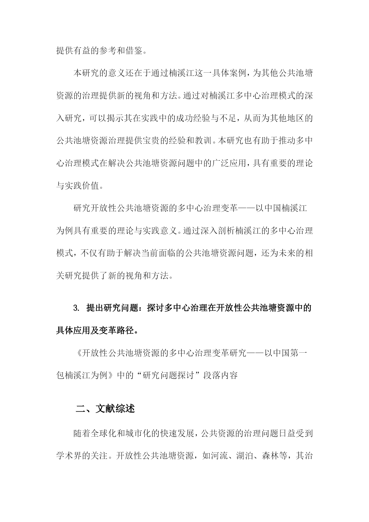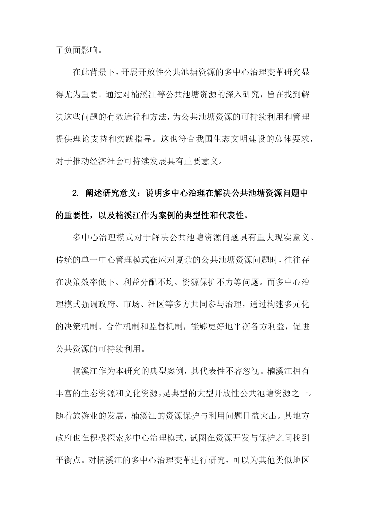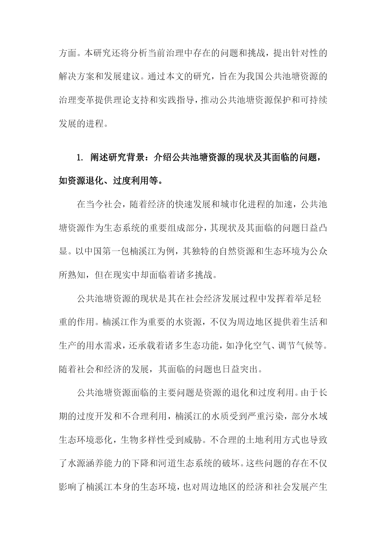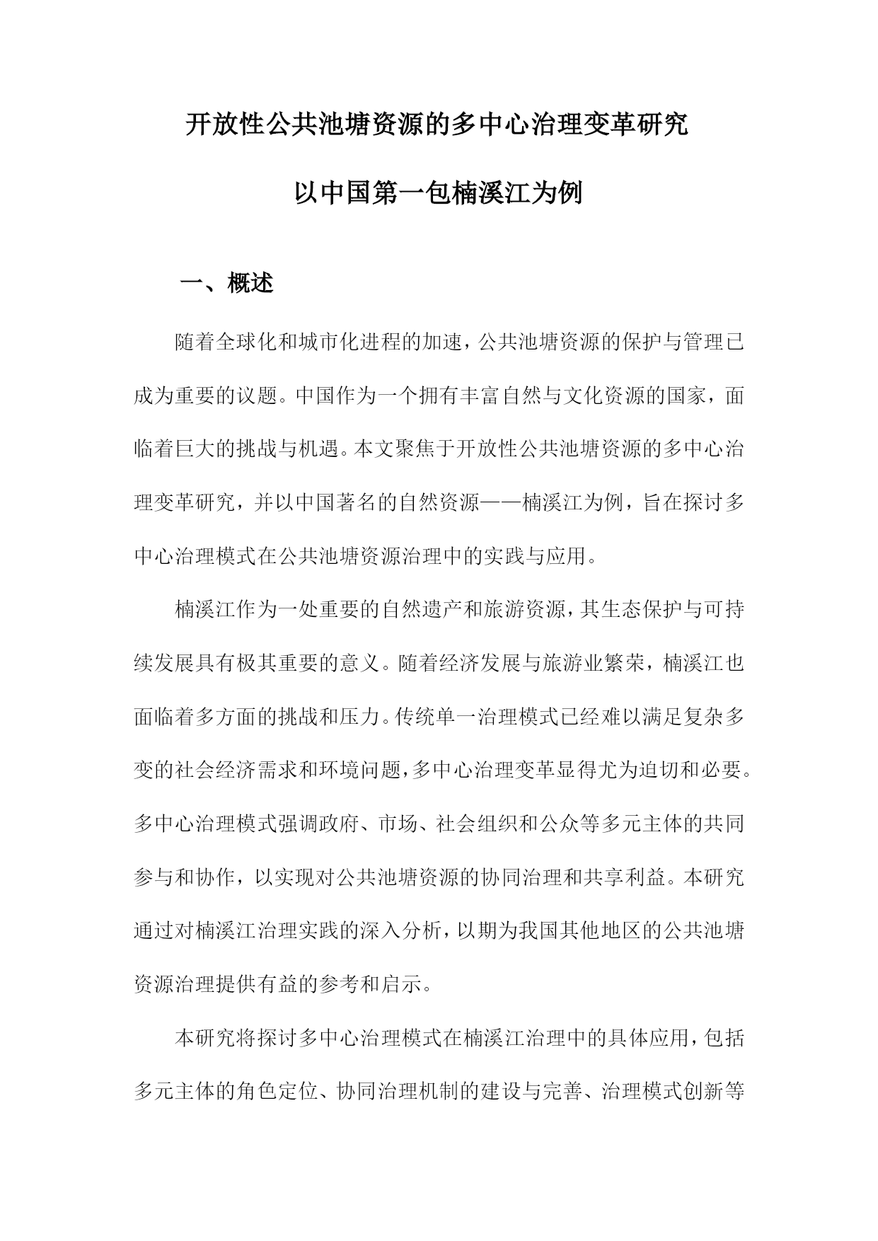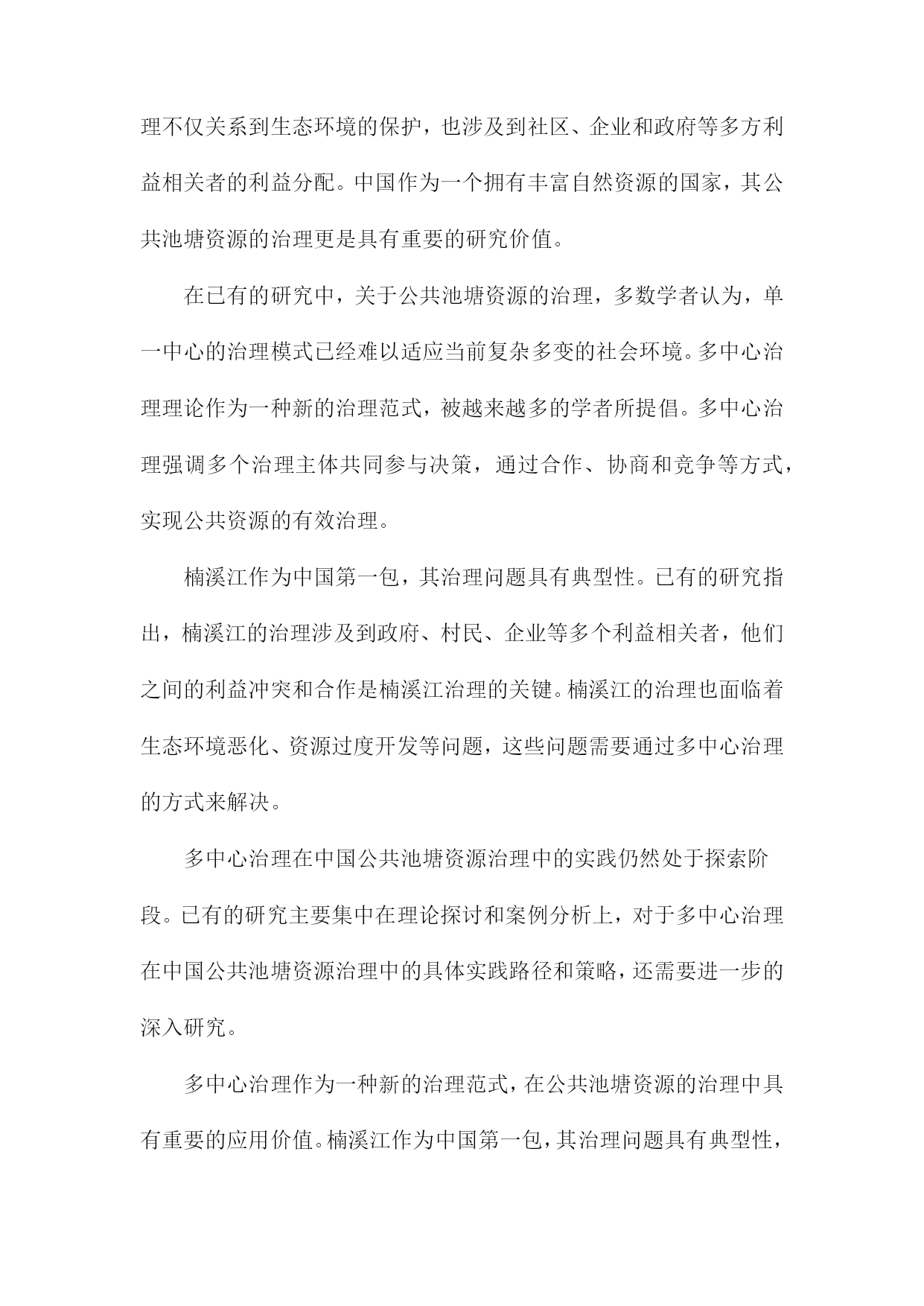 开放性公共池塘资源的多中心治理变革研究以中国第一包楠溪江为例一、概述随着全球化和城市化进程的加速,公共池塘资源的保护与管理已成为重要的议题。中国作为一个拥有丰富自然与文化资源的国家,面临着巨大的挑战与机遇。本文聚焦于开放性公共池塘资源的多中心治理变革研究,并以中国著名的自然资源——楠溪江为例,旨在探讨多中心治理模式在公共池塘资源治理中的实践与应用。楠溪江作为一处重要的自然遗产和旅游资源,其生态保护与可持续发展具有极其重要的意义。随着经济发展与旅游业繁荣,楠溪江也面临着多方面的挑战和压力。传统单一治理模式已经难以满足复杂多变的社会经济需求和环境问题,多中心治理变革显得尤为迫切和必要。多中心治理模式强调政府、市场、社会组织和公众等多元主体的共同参与和协作,以实现对公共池塘资源的协同治理和共享利益。本研究通过对楠溪江治理实践的深入分析,以期为我国其他地区的公共池塘资源治理提供有益的参考和启示。本研究将探讨多中心治理模式在楠溪江治理中的具体应用,包括多元主体的角色定位、协同治理机制的建设与完善、治理模式创新等方面。本研究还将分析当前治理中存在的问题和挑战,提出针对性的解决方案和发展建议。通过本文的研究,旨在为我国公共池塘资源的治理变革提供理论支持和实践指导,推动公共池塘资源保护和可持续发展的进程。1.阐述研究背景:介绍公共池塘资源的现状及其面临的问题,如资源退化、过度利用等。在当今社会,随着经济的快速发展和城市化进程的加速,公共池塘资源作为生态系统的重要组成部分,其现状及其面临的问题日益凸显。以中国第一包楠溪江为例,其独特的自然资源和生态环境为公众所熟知,但在现实中却面临着诸多挑战。公共池塘资源的现状是其在社会经济发展过程中发挥着举足轻重的作用。楠溪江作为重要的水资源,不仅为周边地区提供着生活和生产的用水需求,还承载着诸多生态功能,如净化空气、调节气候等。随着社会和经济的发展,其面临的问题也日益突出。公共池塘资源面临的主要问题是资源的退化和过度利用。由于长期的过度开发和不合理利用,楠溪江的水质受到严重污染,部分水域生态环境恶化,生物多样性受到威胁。不合理的土地利用方式也导致了水源涵养能力的下降和河道生态系统的破坏。这些问题的存在不仅影响了楠溪江本身的生态环境,也对周边地区的经济和社会发展产生了负面影响。在此背景下,开展开放性公共池塘资源的多中心治理变革研究显得尤为重要。通过对楠溪江等公共池塘资源的深入研究,旨在找到解决这些问题的有效途径和方法,为公共池塘资源的可持续利用和管理提供理论支持和实践指导。这也符合我国生态文明建设的总体要求,对于推动经济社会可持续发展具有重要意义。2.阐述研究意义:说明多中心治理在解决公共池塘资源问题中的重要性,以及楠溪江作为案例的典型性和代表性。多中心治理模式对于解决公共池塘资源问题具有重大现实意义。传统的单一中心管理模式在应对复杂的公共池塘资源问题时,往往存在决策效率低下、利益分配不均、资源保护不力等问题。而多中心治理模式强调政府、市场、社区等多方共同参与治理,通过构建多元化的决策机制、合作机制和监督机制,能够更好地平衡各方利益,促进公共资源的可持续利用。楠溪江作为本研究的典型案例,其代表性不容忽视。楠溪江拥有丰富的生态资源和文化资源,是典型的大型开放性公共池塘资源之一。随着旅游业的发展,楠溪江的资源保护与利用问题日益突出。其地方政府也在积极探索多中心治理模式,试图在资源开发与保护之间找到平衡点。对楠溪江的多中心治理变革进行研究,可以为其他类似地区提供有益的参考和借鉴。本研究的意义还在于通过楠溪江这一具体案例,为其他公共池塘资源的治理提供新的视角和方法。通过对楠溪江多中心治理模式的深入研究,可以揭示其在实践中的成功经验与不足,从而为其他地区的公共池塘资源治理提供宝贵的经验和教训。本研究也有助于推动多中心治理模式在解决公共池塘资源问题中的广泛应用,具有重要的理论与实践价值。研究开放性公共池塘资源的多中心治理变革——以中国楠溪江为例具有重要的理论与实践意义。通过深入剖析楠溪江的多中心治理模式,不仅有助于解决当前面临的公共池塘资源问题,还为未来的相关研究提供了新的视角和方法。3.提出研究问题:探讨多中心治理在开放性公共池塘资源中的具体应用及变革路径。《开放性公共池塘资源的多中心治理变革研究——以中国第一包楠溪江为例》中的“研究问题探讨”段落内容二、文献综述随着全球化和城市化的快速发展,公共资源的治理问题日益受到学术界的关注。开放性公共池塘资源,如河流、湖泊、森林等,其治理不仅关系到生态环境的保护,也涉及到社区、企业和政府等多方利益相关者的利益分配。中国作为一个拥有丰富自然资源的国家,其公共池塘资源的治理更是具有重要的研究价值。在已有的研究中,关于公共池塘资源的治理,多数学者认为,单一中心的治理模式已经难以适应当