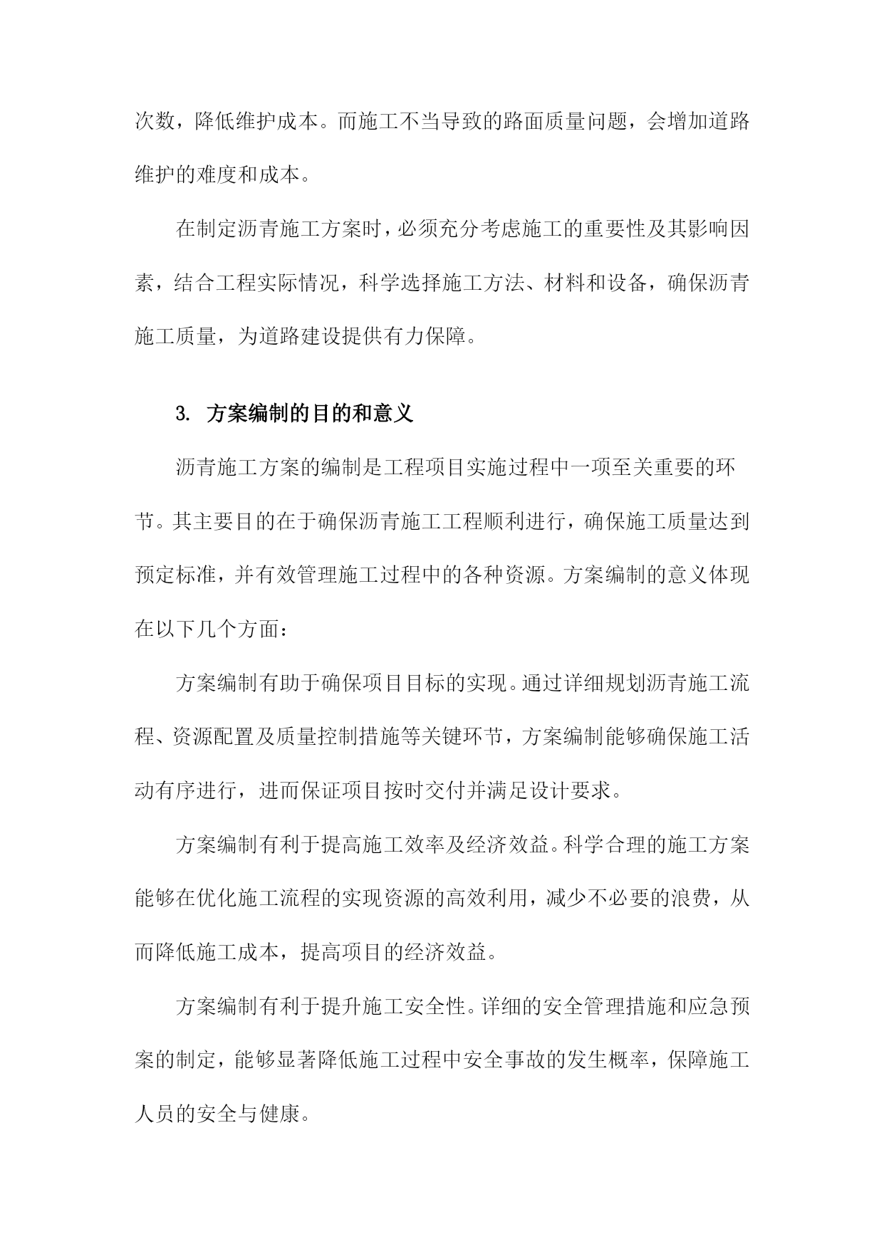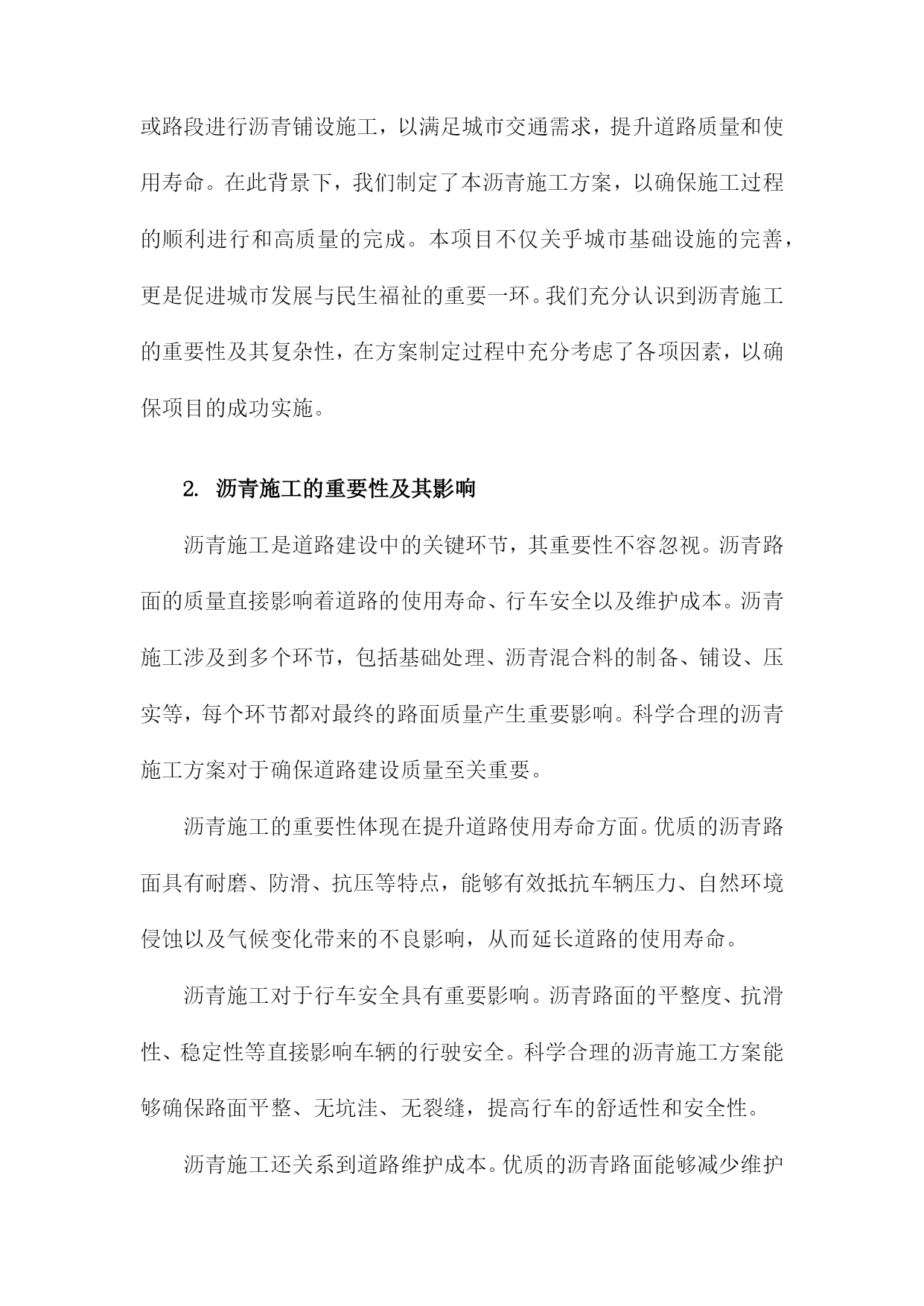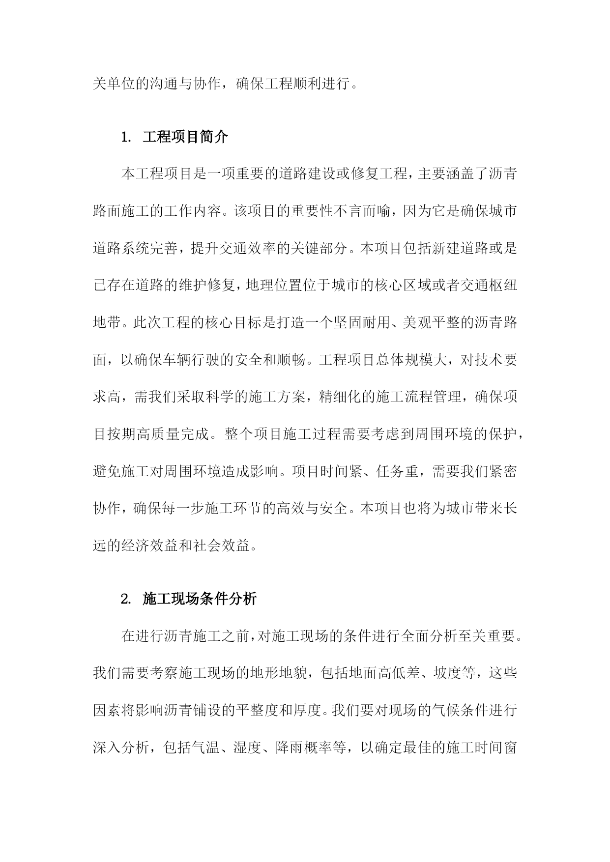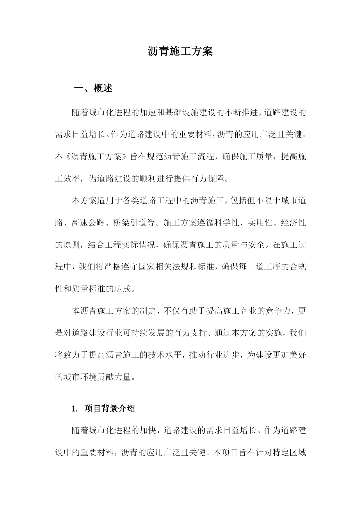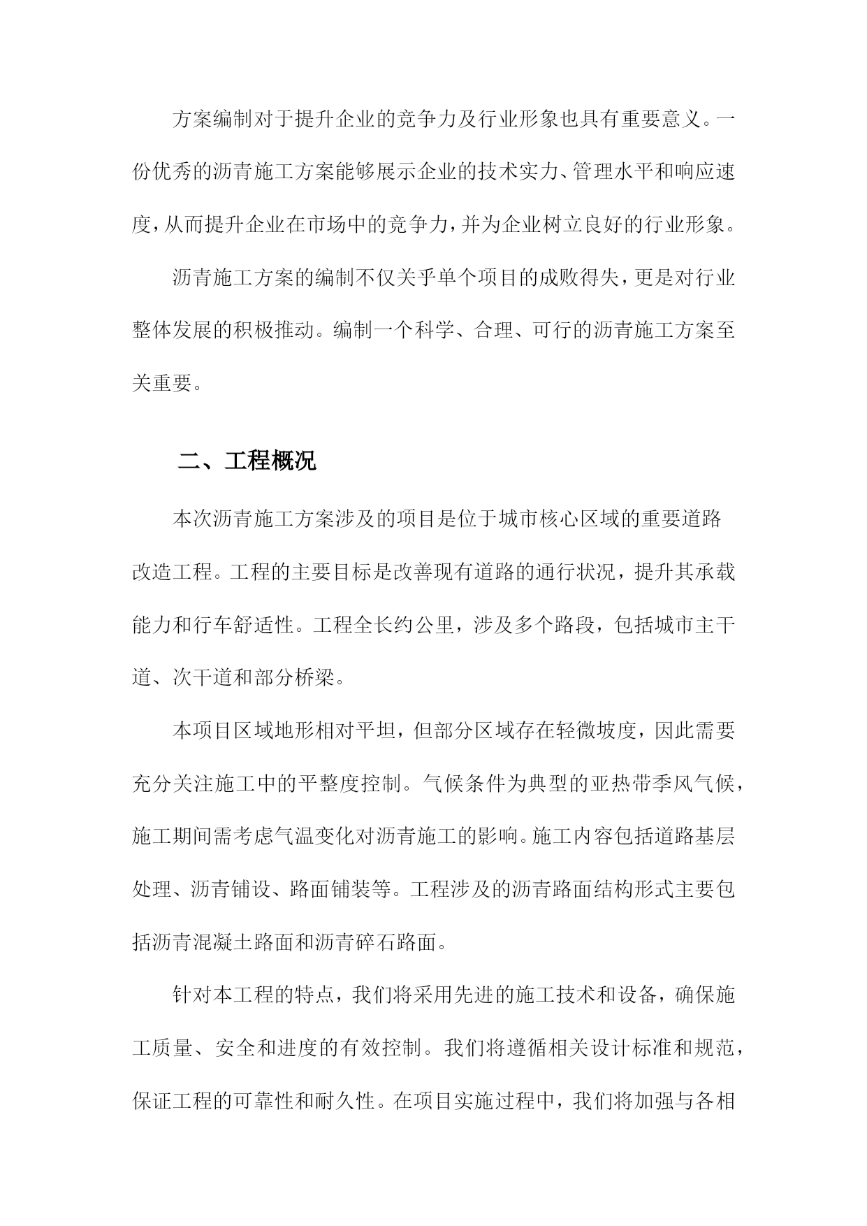 沥青施工方案一、概述随着城市化进程的加速和基础设施建设的不断推进,道路建设的需求日益增长。作为道路建设中的重要材料,沥青的应用广泛且关键。本《沥青施工方案》旨在规范沥青施工流程,确保施工质量,提高施工效率,为道路建设的顺利进行提供有力保障。本方案适用于各类道路工程中的沥青施工,包括但不限于城市道路、高速公路、桥梁引道等。施工方案遵循科学性、实用性、经济性的原则,结合工程实际情况,确保沥青施工的质量与安全。在施工过程中,我们将严格遵守国家相关法规和标准,确保每一道工序的合规性和质量标准的达成。本沥青施工方案的制定,不仅有助于提高施工企业的竞争力,更是对道路建设行业可持续发展的有力支持。通过本方案的实施,我们将致力于提高沥青施工的技术水平,推动行业进步,为建设更加美好的城市环境贡献力量。1.项目背景介绍随着城市化进程的加快,道路建设的需求日益增长。作为道路建设中的重要材料,沥青的应用广泛且关键。本项目旨在针对特定区域或路段进行沥青铺设施工,以满足城市交通需求,提升道路质量和使用寿命。在此背景下,我们制定了本沥青施工方案,以确保施工过程的顺利进行和高质量的完成。本项目不仅关乎城市基础设施的完善,更是促进城市发展与民生福祉的重要一环。我们充分认识到沥青施工的重要性及其复杂性,在方案制定过程中充分考虑了各项因素,以确保项目的成功实施。2.沥青施工的重要性及其影响沥青施工是道路建设中的关键环节,其重要性不容忽视。沥青路面的质量直接影响着道路的使用寿命、行车安全以及维护成本。沥青施工涉及到多个环节,包括基础处理、沥青混合料的制备、铺设、压实等,每个环节都对最终的路面质量产生重要影响。科学合理的沥青施工方案对于确保道路建设质量至关重要。沥青施工的重要性体现在提升道路使用寿命方面。优质的沥青路面具有耐磨、防滑、抗压等特点,能够有效抵抗车辆压力、自然环境侵蚀以及气候变化带来的不良影响,从而延长道路的使用寿命。沥青施工对于行车安全具有重要影响。沥青路面的平整度、抗滑性、稳定性等直接影响车辆的行驶安全。科学合理的沥青施工方案能够确保路面平整、无坑洼、无裂缝,提高行车的舒适性和安全性。沥青施工还关系到道路维护成本。优质的沥青路面能够减少维护次数,降低维护成本。而施工不当导致的路面质量问题,会增加道路维护的难度和成本。在制定沥青施工方案时,必须充分考虑施工的重要性及其影响因素,结合工程实际情况,科学选择施工方法、材料和设备,确保沥青施工质量,为道路建设提供有力保障。3.方案编制的目的和意义沥青施工方案的编制是工程项目实施过程中一项至关重要的环节。其主要目的在于确保沥青施工工程顺利进行,确保施工质量达到预定标准,并有效管理施工过程中的各种资源。方案编制的意义体现在以下几个方面:方案编制有助于确保项目目标的实现。通过详细规划沥青施工流程、资源配置及质量控制措施等关键环节,方案编制能够确保施工活动有序进行,进而保证项目按时交付并满足设计要求。方案编制有利于提高施工效率及经济效益。科学合理的施工方案能够在优化施工流程的实现资源的高效利用,减少不必要的浪费,从而降低施工成本,提高项目的经济效益。方案编制有利于提升施工安全性。详细的安全管理措施和应急预案的制定,能够显著降低施工过程中安全事故的发生概率,保障施工人员的安全与健康。方案编制对于提升企业的竞争力及行业形象也具有重要意义。一份优秀的沥青施工方案能够展示企业的技术实力、管理水平和响应速度,从而提升企业在市场中的竞争力,并为企业树立良好的行业形象。沥青施工方案的编制不仅关乎单个项目的成败得失,更是对行业整体发展的积极推动。编制一个科学、合理、可行的沥青施工方案至关重要。二、工程概况本次沥青施工方案涉及的项目是位于城市核心区域的重要道路改造工程。工程的主要目标是改善现有道路的通行状况,提升其承载能力和行车舒适性。工程全长约公里,涉及多个路段,包括城市主干道、次干道和部分桥梁。本项目区域地形相对平坦,但部分区域存在轻微坡度,因此需要充分关注施工中的平整度控制。气候条件为典型的亚热带季风气候,施工期间需考虑气温变化对沥青施工的影响。施工内容包括道路基层处理、沥青铺设、路面铺装等。工程涉及的沥青路面结构形式主要包括沥青混凝土路面和沥青碎石路面。针对本工程的特点,我们将采用先进的施工技术和设备,确保施工质量、安全和进度的有效控制。我们将遵循相关设计标准和规范,保证工程的可靠性和耐久性。在项目实施过程中,我们将加强与各相关单位的沟通与协作,确保工程顺利进行。1.工程项目简介本工程项目是一项重要的道路建设或修复工程,主要涵盖了沥青路面施工的工作内容。该项目的重要性不言而喻,因为它是确保城市道路系统完善,提升交通效率的关键部分。本项目包括新建道路或是已存在道路的维护修复,地理位置位于城市的核心区域或者交通枢纽地带。此次工程的核