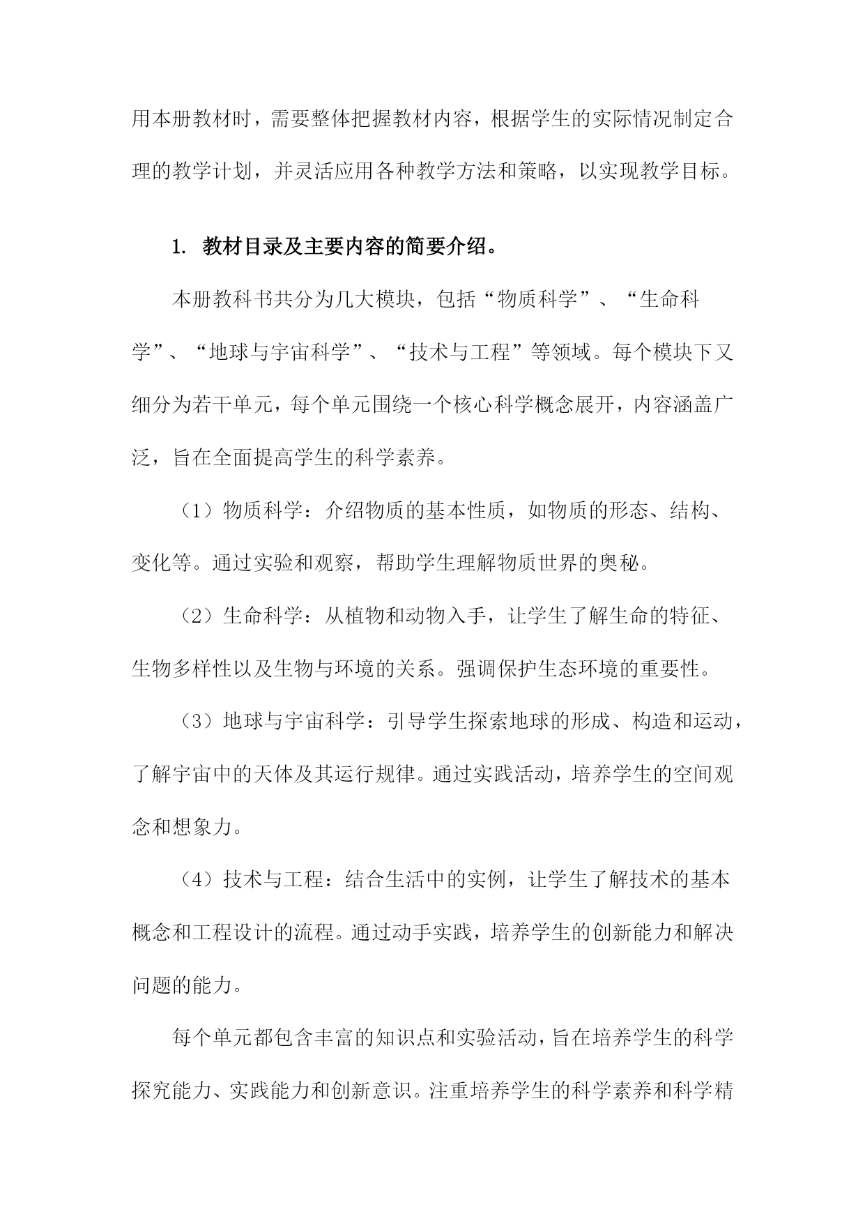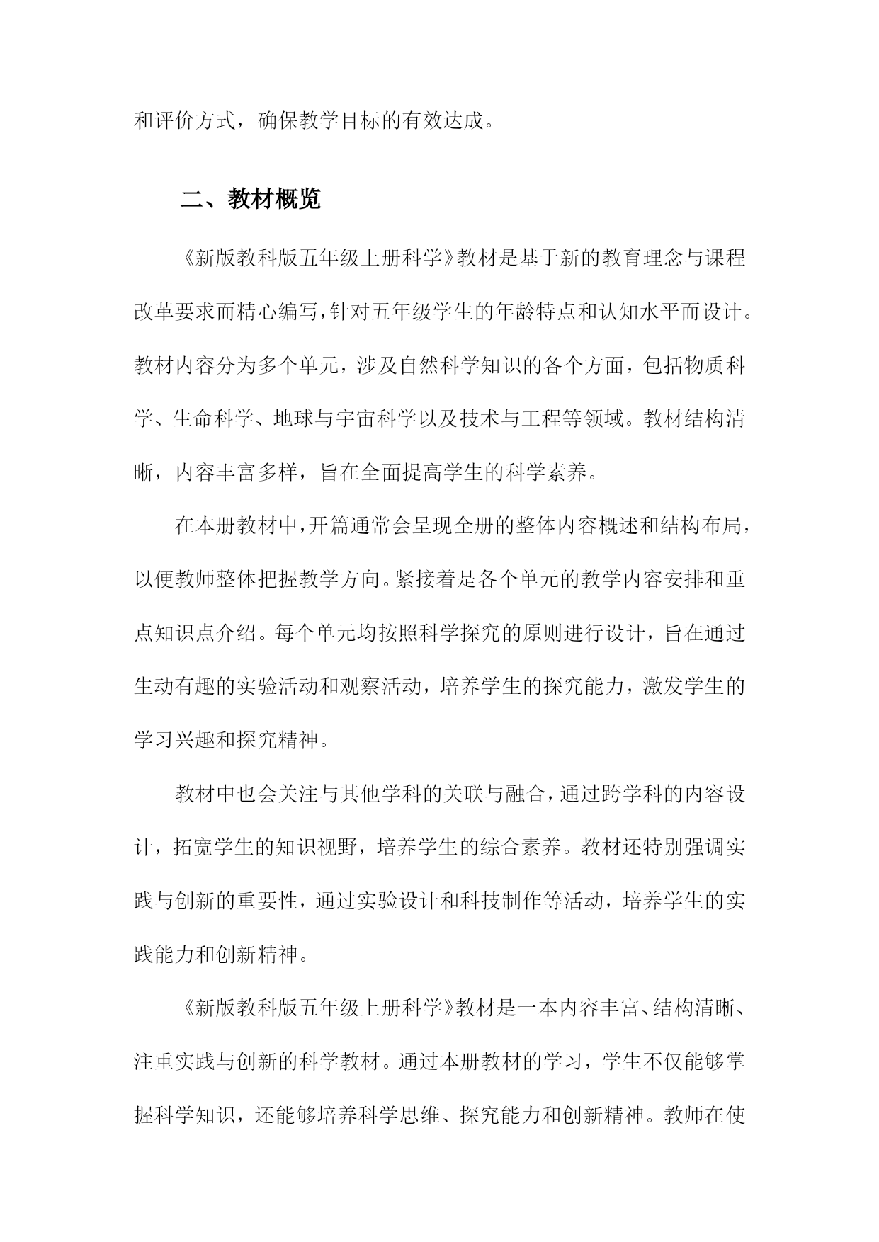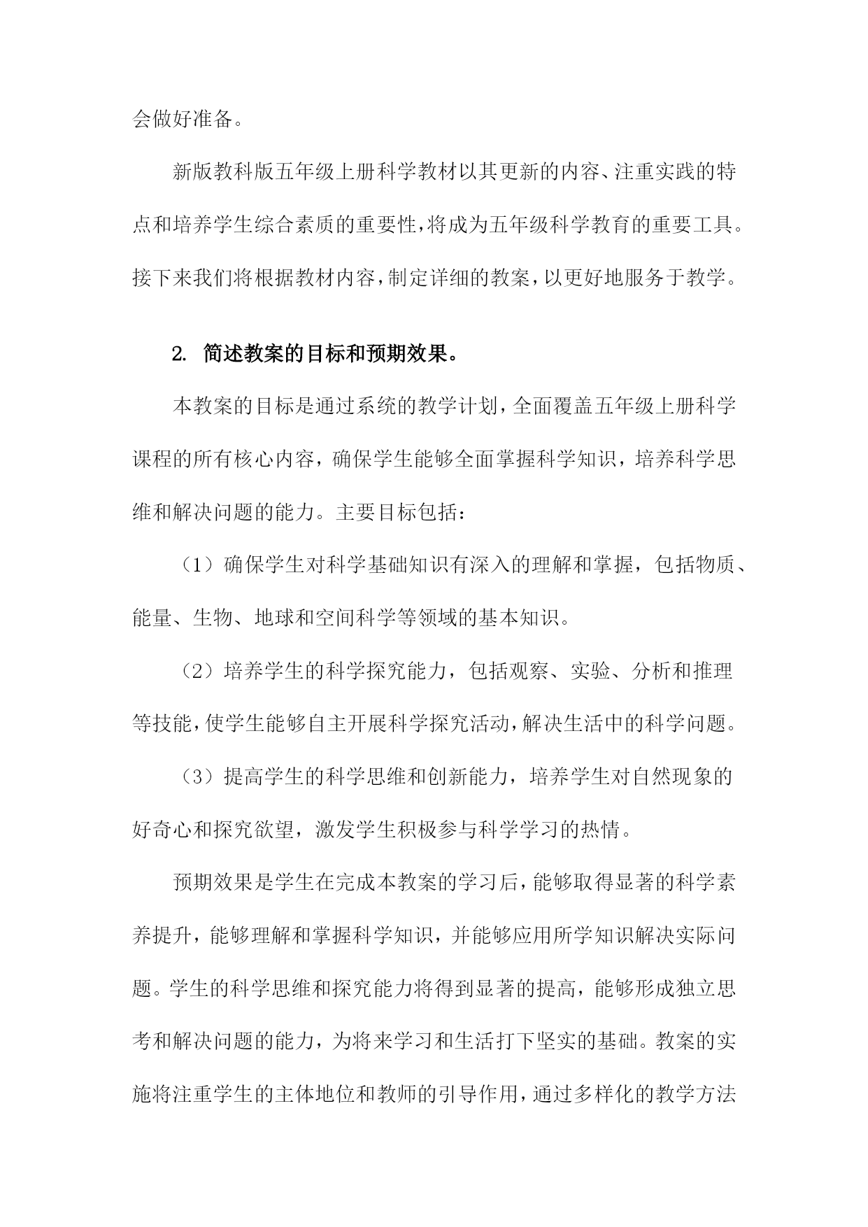 新版教科版五年级上册科学全册教案一、概述本课程是五年级上册科学,教材采用了新版教科版,涵盖了丰富多样的科学知识和实验探究内容。本课程旨在通过系统的科学教育,培养学生的科学素养,提高学生的科学探究能力,激发学生对科学的兴趣和热爱。课程内容包括物质科学、生命科学、地球科学等多个领域,注重培养学生的观察能力、实验能力、思维能力和创新能力。本课程将采用启发式教学法和探究式教学,注重学生的参与和实践,让学生在实践中学习科学知识,提高科学素养。教案设计以学生为中心,注重启发式教学,引导学生主动探究科学知识,培养学生的科学素养和综合能力。教学目标是通过系统的教学活动和实验教学,使学生掌握基本的科学知识,培养学生的科学素养和科学思维能力,为学生的未来发展打下坚实的基础。接下来我们将详细探讨各个章节的教学内容以及具体的教学计划和方法。1.介绍新版教科版五年级上册科学教材的特点和重要性。《新版教科版五年级上册科学全册教案》第一章:介绍新版教科版五年级上册科学教材的特点和重要性随着教育改革的不断深化,科学教育在新时代背景下显得尤为重要。本次我们推出新版教科版五年级上册科学教材,致力于全面提升学生的科学素养和探究能力。其特点如下:内容更新与升级:紧扣时代发展脉搏,融合最新的科学技术研究成果与趋势,丰富教材内容,以更全面、更新的角度展示科学世界的奥秘。强化实践性:通过大量的实验、观察、调查等实践活动,让学生亲身体验科学探究过程,增强实践能力和创新思维。注重能力培养:强调学生的科学探究能力、问题解决能力、批判性思维的培养,提高学生的综合素质。跨学科融合:结合物理、化学、生物、地理等多学科知识,形成跨学科的科学教育内容,培养学生的综合科学素养。五年级是学生学习科学的关键时期,新版教科版五年级上册科学教材的重要性体现在以下几个方面:奠基科学素养:通过系统的科学学习,培养学生的科学观念、科学方法和科学精神,为学生未来的学习和生活奠定坚实的科学素养。培养创新思维:通过丰富的科学探究活动,激发学生的创新精神和探究欲望,培养学生的创新思维和解决问题的能力。衔接学校教育与社会发展:教材内容紧跟时代步伐,使学生更好地理解科学技术对社会发展的影响,为将来更好地适应社会、服务社会做好准备。新版教科版五年级上册科学教材以其更新的内容、注重实践的特点和培养学生综合素质的重要性,将成为五年级科学教育的重要工具。接下来我们将根据教材内容,制定详细的教案,以更好地服务于教学。2.简述教案的目标和预期效果。本教案的目标是通过系统的教学计划,全面覆盖五年级上册科学课程的所有核心内容,确保学生能够全面掌握科学知识,培养科学思维和解决问题的能力。主要目标包括:(1)确保学生对科学基础知识有深入的理解和掌握,包括物质、能量、生物、地球和空间科学等领域的基本知识。(2)培养学生的科学探究能力,包括观察、实验、分析和推理等技能,使学生能够自主开展科学探究活动,解决生活中的科学问题。(3)提高学生的科学思维和创新能力,培养学生对自然现象的好奇心和探究欲望,激发学生积极参与科学学习的热情。预期效果是学生在完成本教案的学习后,能够取得显著的科学素养提升,能够理解和掌握科学知识,并能够应用所学知识解决实际问题。学生的科学思维和探究能力将得到显著的提高,能够形成独立思考和解决问题的能力,为将来学习和生活打下坚实的基础。教案的实施将注重学生的主体地位和教师的引导作用,通过多样化的教学方法和评价方式,确保教学目标的有效达成。二、教材概览《新版教科版五年级上册科学》教材是基于新的教育理念与课程改革要求而精心编写,针对五年级学生的年龄特点和认知水平而设计。教材内容分为多个单元,涉及自然科学知识的各个方面,包括物质科学、生命科学、地球与宇宙科学以及技术与工程等领域。教材结构清晰,内容丰富多样,旨在全面提高学生的科学素养。在本册教材中,开篇通常会呈现全册的整体内容概述和结构布局,以便教师整体把握教学方向。紧接着是各个单元的教学内容安排和重点知识点介绍。每个单元均按照科学探究的原则进行设计,旨在通过生动有趣的实验活动和观察活动,培养学生的探究能力,激发学生的学习兴趣和探究精神。教材中也会关注与其他学科的关联与融合,通过跨学科的内容设计,拓宽学生的知识视野,培养学生的综合素养。教材还特别强调实践与创新的重要性,通过实验设计和科技制作等活动,培养学生的实践能力和创新精神。《新版教科版五年级上册科学》教材是一本内容丰富、结构清晰、注重实践与创新的科学教材。通过本册教材的学习,学生不仅能够掌握科学知识,还能够培养科学思维、探究能力和创新精神。教师在使用本册教材时,需要整体把握教材内容,根据学生的实际情况制定合理的教学计划,并灵活应用各种教学方法和策略,以实现教学目标。1.教材目录及主要内容的简要介绍。本册教科书共分为几大模块,包