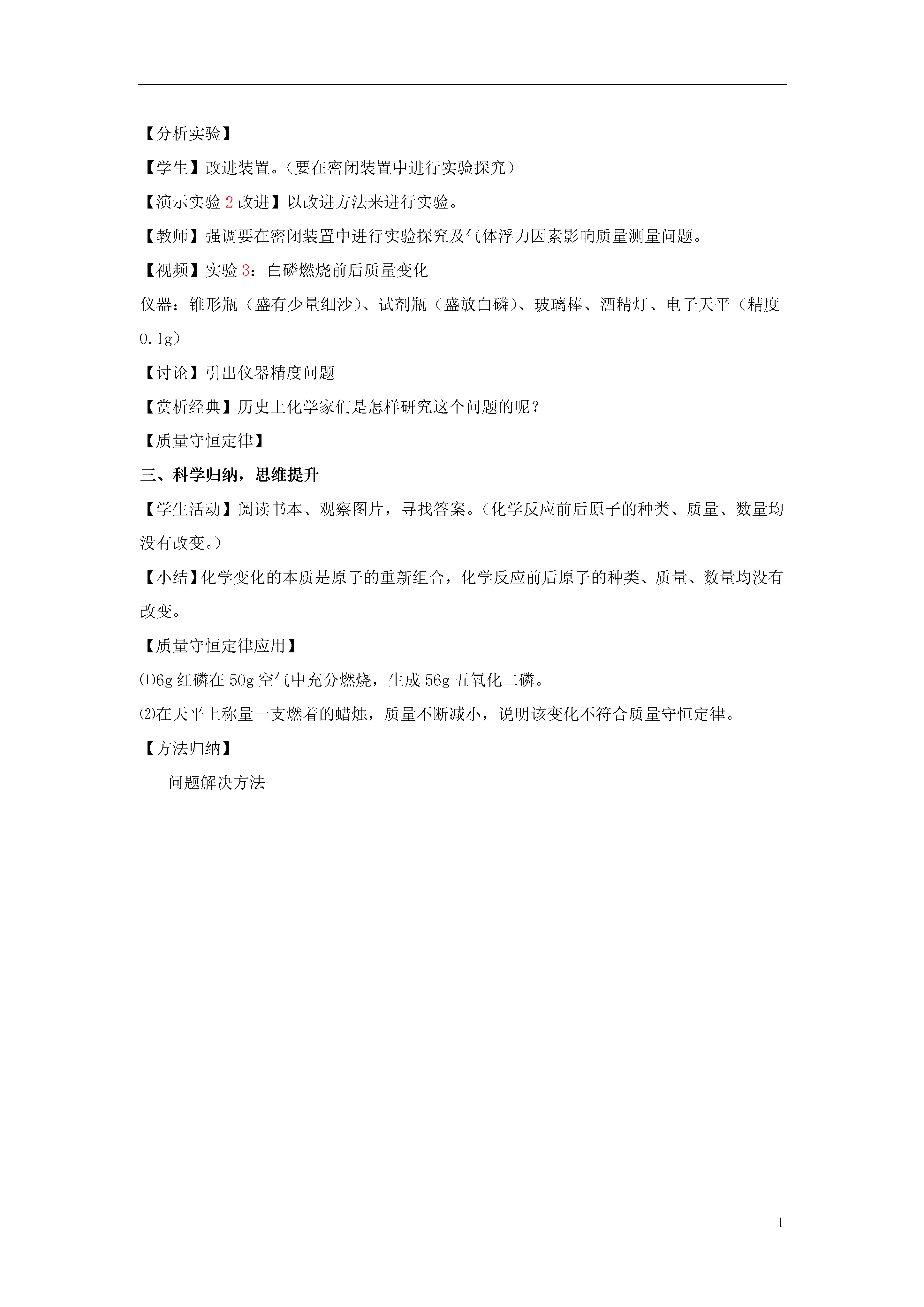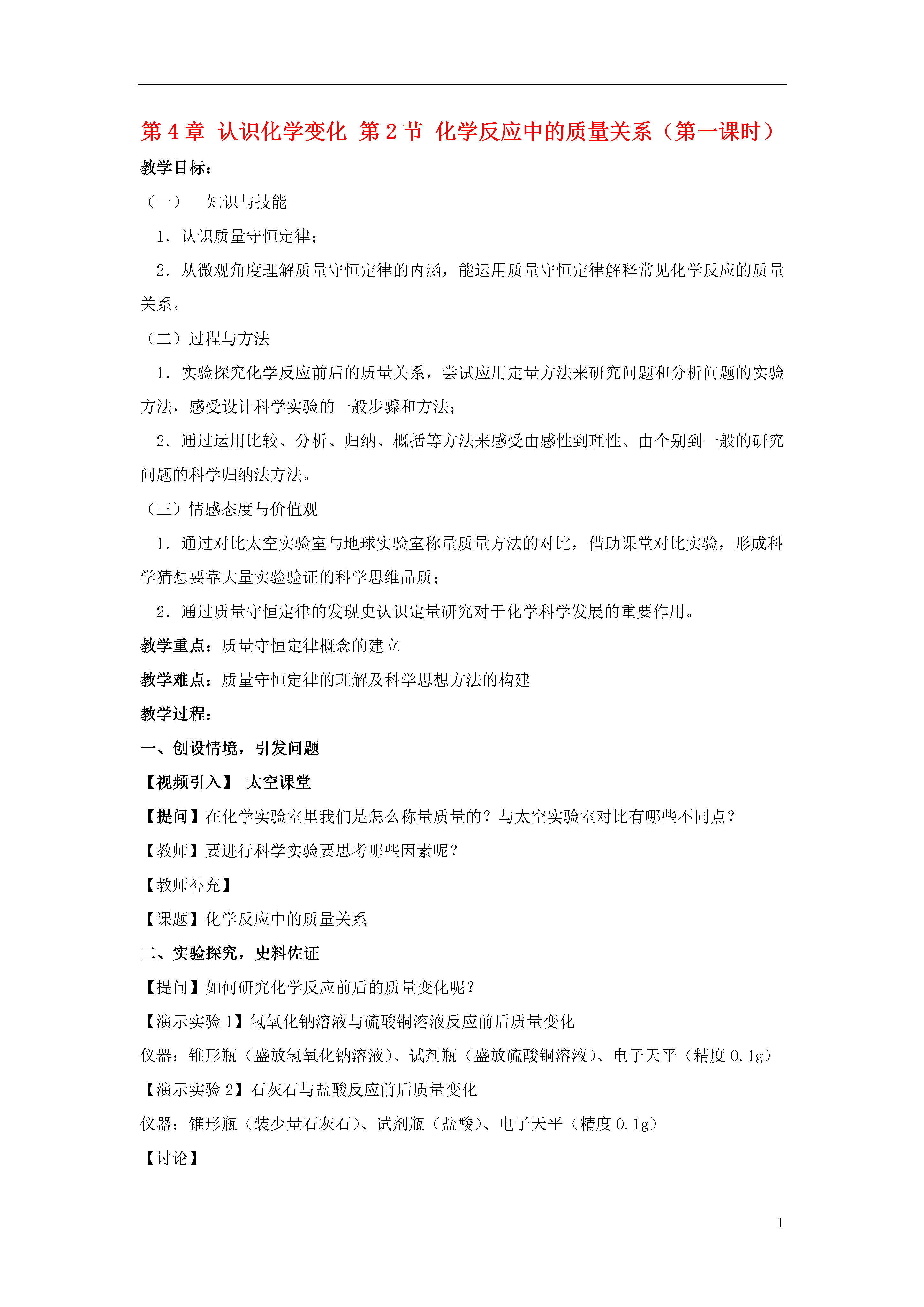 1第4章认识化学变化第2节化学反应中的质量关系(第一课时)教学目标:知识与技能1.认识质量守恒定律;2.从微观角度理解质量守恒定律的内涵,能运用质量守恒定律解释常见化学反应的质量关系。(二)过程与方法1.实验探究化学反应前后的质量关系,尝试应用定量方法来研究问题和分析问题的实验方法,感受设计科学实验的一般步骤和方法;2.通过运用比较、分析、归纳、概括等方法来感受由感性到理性、由个别到一般的研究问题的科学归纳法方法。(三)情感态度与价值观1.通过对比太空实验室与地球实验室称量质量方法的对比,借助课堂对比实验,形成科学猜想要靠大量实验验证的科学思维品质;2.通过质量守恒定律的发现史认识定量研究对于化学科学发展的重要作用。教学重点:质量守恒定律概念的建立教学难点:质量守恒定律的理解及科学思想方法的构建教学过程:一、创设情境,引发问题【视频引入】太空课堂【提问】在化学实验室里我们是怎么称量质量的?与太空实验室对比有哪些不同点?【教师】要进行科学实验要思考哪些因素呢?【教师补充】【课题】化学反应中的质量关系二、实验探究,史料佐证【提问】如何研究化学反应前后的质量变化呢?【演示实验1】氢氧化钠溶液与硫酸铜溶液反应前后质量变化仪器:锥形瓶(盛放氢氧化钠溶液)、试剂瓶(盛放硫酸铜溶液)、电子天平(精度0.1g)【演示实验2】石灰石与盐酸反应前后质量变化仪器:锥形瓶(装少量石灰石)、试剂瓶(盐酸)、电子天平(精度0.1g)【讨论】【分析实验】【学生】改进装置。(要在密闭装置中进行实验探究)【演示实验2改进】以改进方法来进行实验。【教师】强调要在密闭装置中进行实验探究及气体浮力因素影响质量测量问题。【视频】实验3:白磷燃烧前后质量变化仪器:锥形瓶(盛有少量细沙)、试剂瓶(盛放白磷)、玻璃棒、酒精灯、电子天平(精度0.1g)【讨论】引出仪器精度问题【赏析经典】历史上化学家们是怎样研究这个问题的呢?【质量守恒定律】三、科学归纳,思维提升【学生活动】阅读书本、观察图片,寻找答案。(化学反应前后原子的种类、质量、数量均没有改变。)【小结】化学变化的本质是原子的重新组合,化学反应前后原子的种类、质量、数量均没有改变。【质量守恒定律应用】⑴6g红磷在50g空气中充分燃烧,生成56g五氧化二磷。⑵在天平上称量一支燃着的蜡烛,质量不断减小,说明该变化不符合质量守恒定律。【方法归纳】问题解决方法