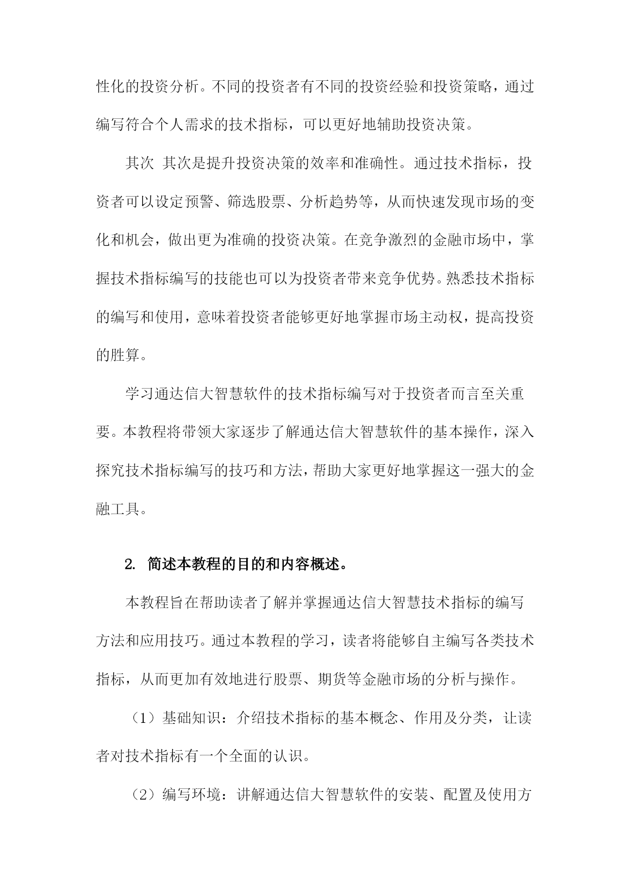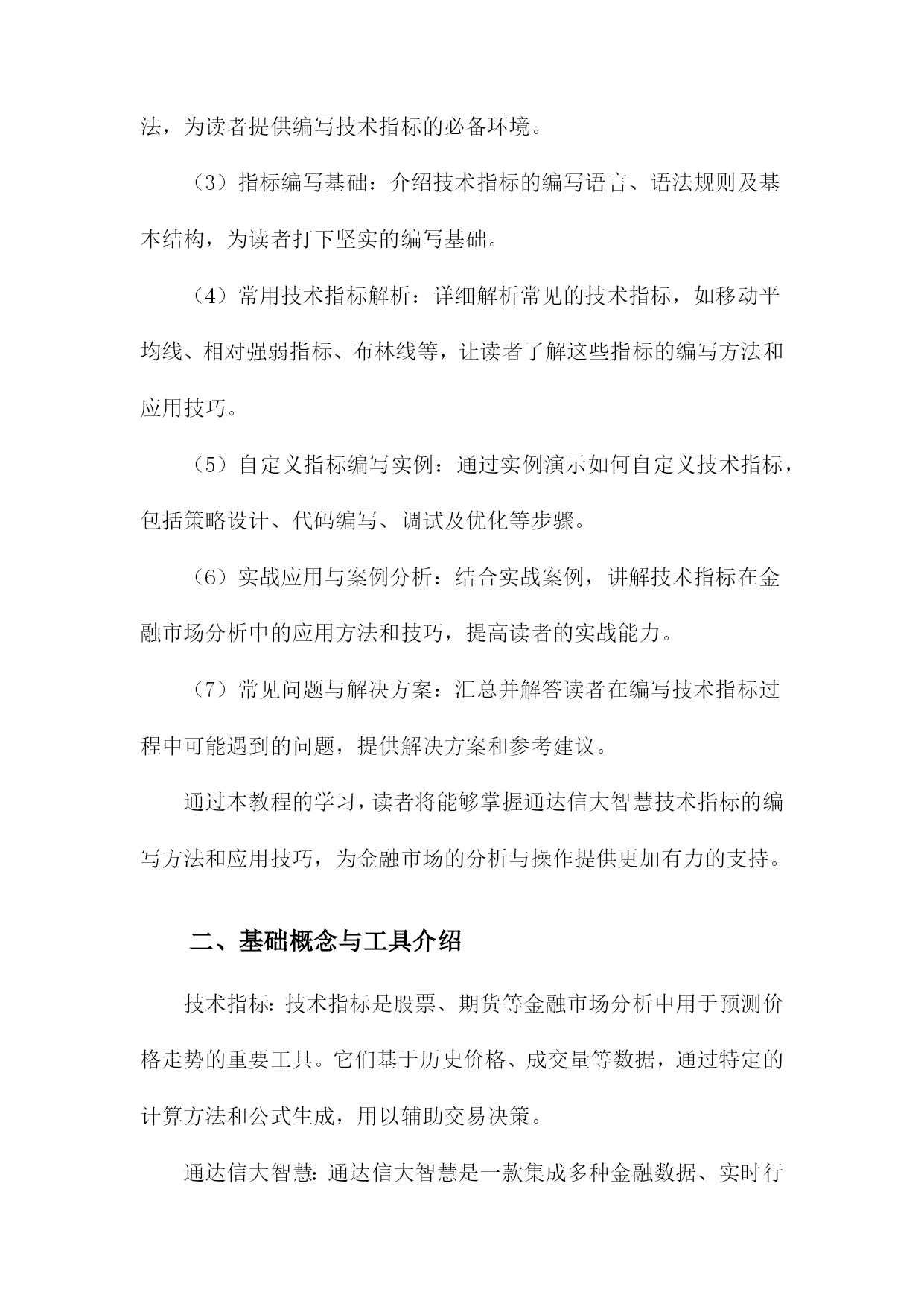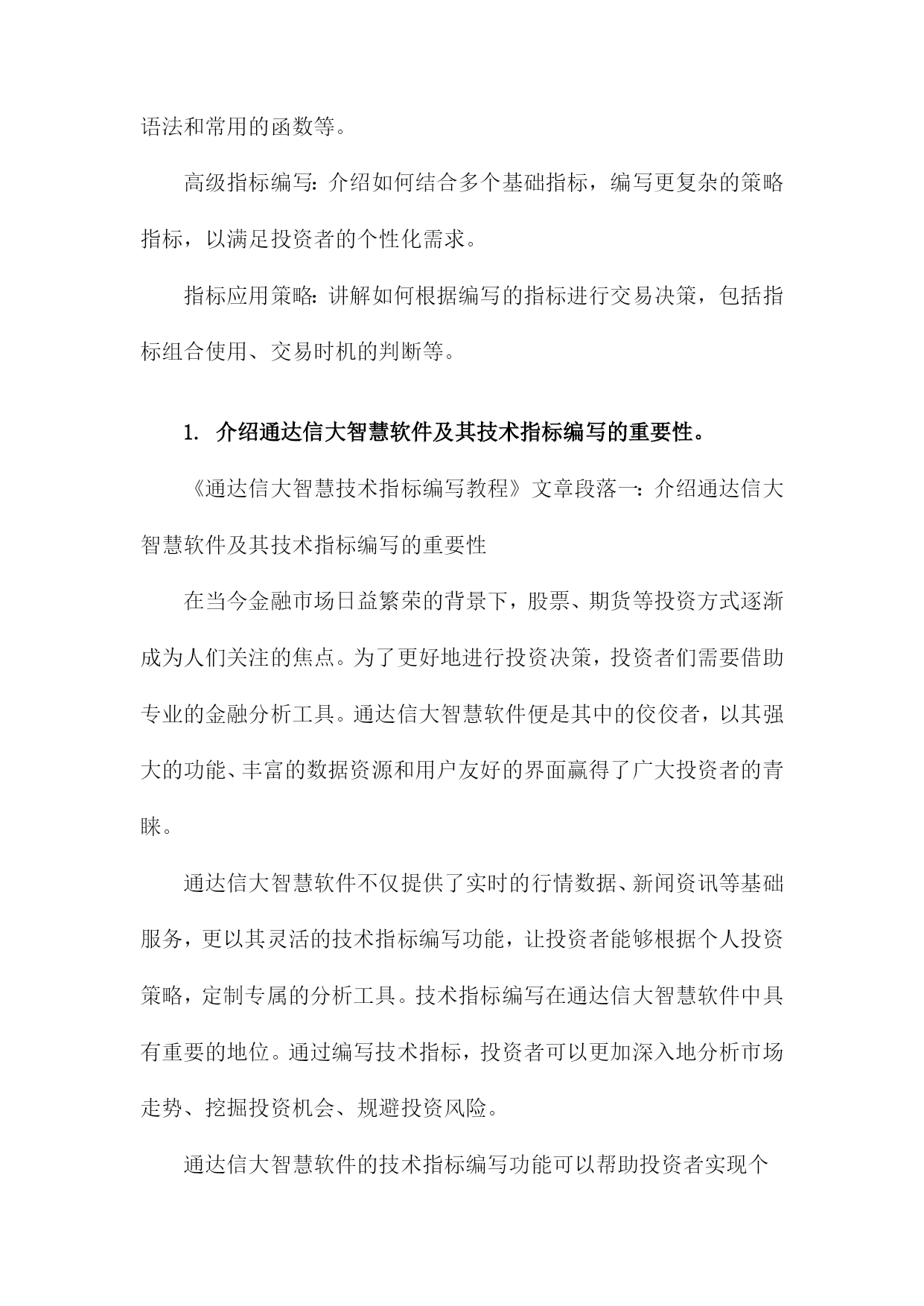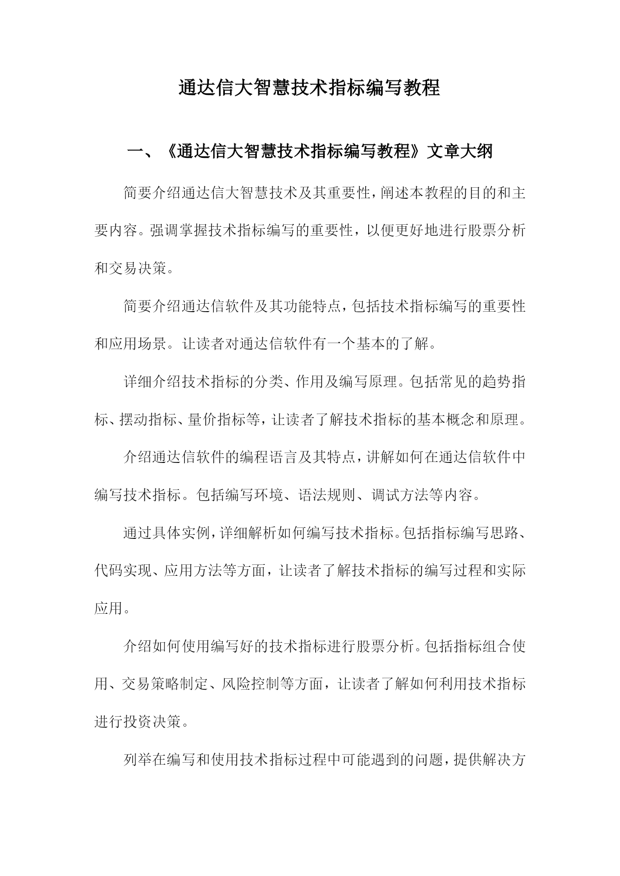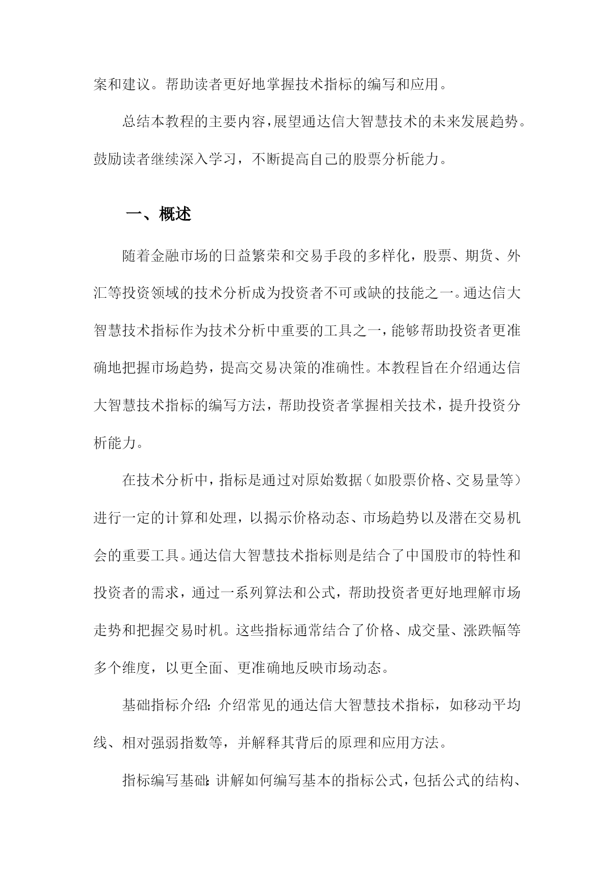 通达信大智慧技术指标编写教程一、《通达信大智慧技术指标编写教程》文章大纲简要介绍通达信大智慧技术及其重要性,阐述本教程的目的和主要内容。强调掌握技术指标编写的重要性,以便更好地进行股票分析和交易决策。简要介绍通达信软件及其功能特点,包括技术指标编写的重要性和应用场景。让读者对通达信软件有一个基本的了解。详细介绍技术指标的分类、作用及编写原理。包括常见的趋势指标、摆动指标、量价指标等,让读者了解技术指标的基本概念和原理。介绍通达信软件的编程语言及其特点,讲解如何在通达信软件中编写技术指标。包括编写环境、语法规则、调试方法等内容。通过具体实例,详细解析如何编写技术指标。包括指标编写思路、代码实现、应用方法等方面,让读者了解技术指标的编写过程和实际应用。介绍如何使用编写好的技术指标进行股票分析。包括指标组合使用、交易策略制定、风险控制等方面,让读者了解如何利用技术指标进行投资决策。列举在编写和使用技术指标过程中可能遇到的问题,提供解决方案和建议。帮助读者更好地掌握技术指标的编写和应用。总结本教程的主要内容,展望通达信大智慧技术的未来发展趋势。鼓励读者继续深入学习,不断提高自己的股票分析能力。一、概述随着金融市场的日益繁荣和交易手段的多样化,股票、期货、外汇等投资领域的技术分析成为投资者不可或缺的技能之一。通达信大智慧技术指标作为技术分析中重要的工具之一,能够帮助投资者更准确地把握市场趋势,提高交易决策的准确性。本教程旨在介绍通达信大智慧技术指标的编写方法,帮助投资者掌握相关技术,提升投资分析能力。在技术分析中,指标是通过对原始数据(如股票价格、交易量等)进行一定的计算和处理,以揭示价格动态、市场趋势以及潜在交易机会的重要工具。通达信大智慧技术指标则是结合了中国股市的特性和投资者的需求,通过一系列算法和公式,帮助投资者更好地理解市场走势和把握交易时机。这些指标通常结合了价格、成交量、涨跌幅等多个维度,以更全面、更准确地反映市场动态。基础指标介绍:介绍常见的通达信大智慧技术指标,如移动平均线、相对强弱指数等,并解释其背后的原理和应用方法。指标编写基础:讲解如何编写基本的指标公式,包括公式的结构、语法和常用的函数等。高级指标编写:介绍如何结合多个基础指标,编写更复杂的策略指标,以满足投资者的个性化需求。指标应用策略:讲解如何根据编写的指标进行交易决策,包括指标组合使用、交易时机的判断等。1.介绍通达信大智慧软件及其技术指标编写的重要性。《通达信大智慧技术指标编写教程》文章段落一:介绍通达信大智慧软件及其技术指标编写的重要性在当今金融市场日益繁荣的背景下,股票、期货等投资方式逐渐成为人们关注的焦点。为了更好地进行投资决策,投资者们需要借助专业的金融分析工具。通达信大智慧软件便是其中的佼佼者,以其强大的功能、丰富的数据资源和用户友好的界面赢得了广大投资者的青睐。通达信大智慧软件不仅提供了实时的行情数据、新闻资讯等基础服务,更以其灵活的技术指标编写功能,让投资者能够根据个人投资策略,定制专属的分析工具。技术指标编写在通达信大智慧软件中具有重要的地位。通过编写技术指标,投资者可以更加深入地分析市场走势、挖掘投资机会、规避投资风险。通达信大智慧软件的技术指标编写功能可以帮助投资者实现个性化的投资分析。不同的投资者有不同的投资经验和投资策略,通过编写符合个人需求的技术指标,可以更好地辅助投资决策。其次其次是提升投资决策的效率和准确性。通过技术指标,投资者可以设定预警、筛选股票、分析趋势等,从而快速发现市场的变化和机会,做出更为准确的投资决策。在竞争激烈的金融市场中,掌握技术指标编写的技能也可以为投资者带来竞争优势。熟悉技术指标的编写和使用,意味着投资者能够更好地掌握市场主动权,提高投资的胜算。学习通达信大智慧软件的技术指标编写对于投资者而言至关重要。本教程将带领大家逐步了解通达信大智慧软件的基本操作,深入探究技术指标编写的技巧和方法,帮助大家更好地掌握这一强大的金融工具。2.简述本教程的目的和内容概述。本教程旨在帮助读者了解并掌握通达信大智慧技术指标的编写方法和应用技巧。通过本教程的学习,读者将能够自主编写各类技术指标,从而更加有效地进行股票、期货等金融市场的分析与操作。(1)基础知识:介绍技术指标的基本概念、作用及分类,让读者对技术指标有一个全面的认识。(2)编写环境:讲解通达信大智慧软件的安装、配置及使用方法,为读者提供编写技术指标的必备环境。(3)指标编写基础:介绍技术指标的编写语言、语法规则及基本结构,为读者打下坚实的编写基础。(4)常用技术指标解析:详细解析常见的技术指标,如移动平均线、相对强弱指标、布林线等,让读者了解这些指标的编写方法和应用技巧。(5)自定义指标编写实例:通过实例演示如何自定义技术指标,包括策略设计、代码编写、调试及优化