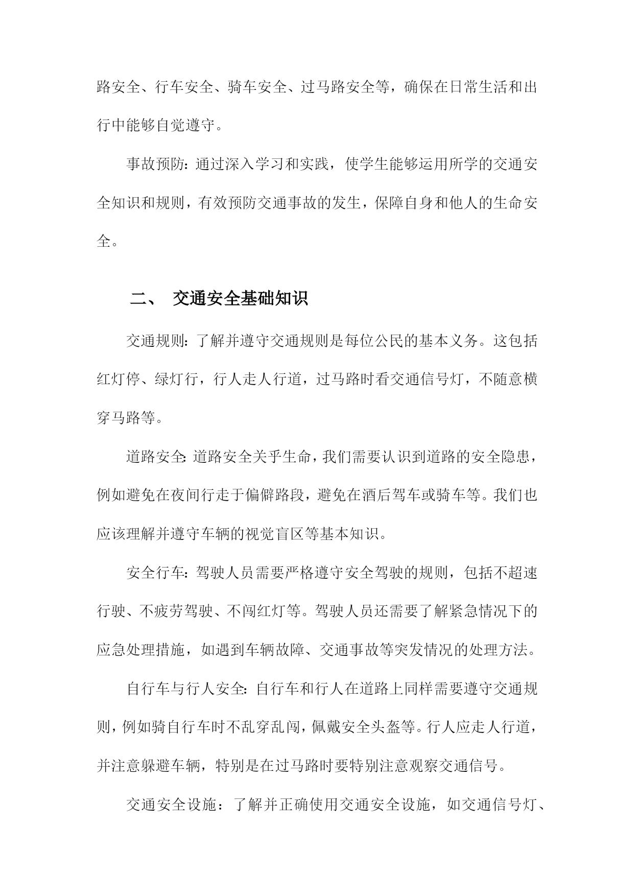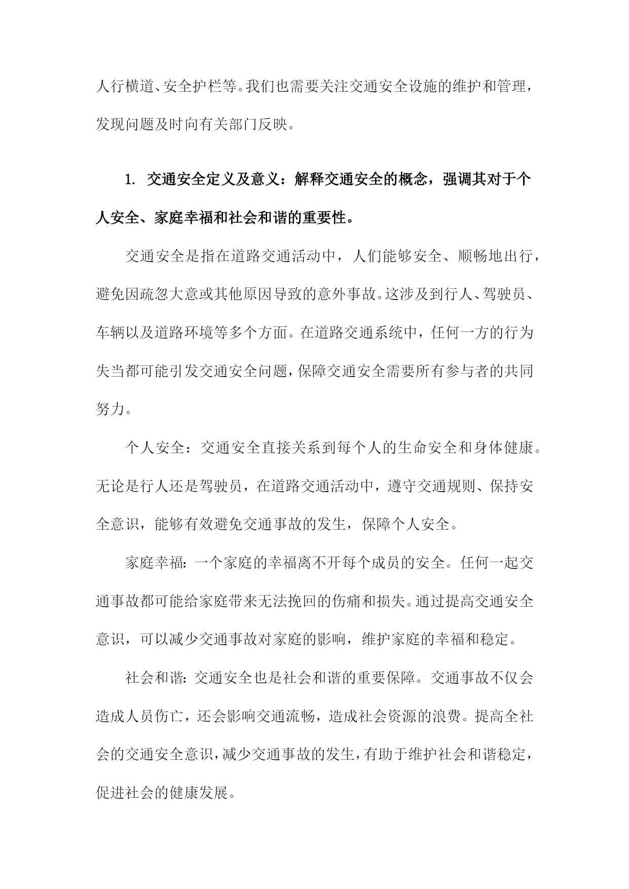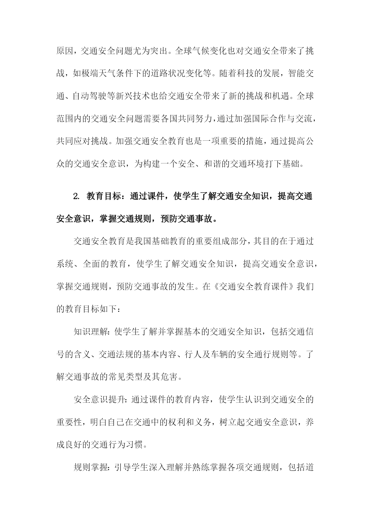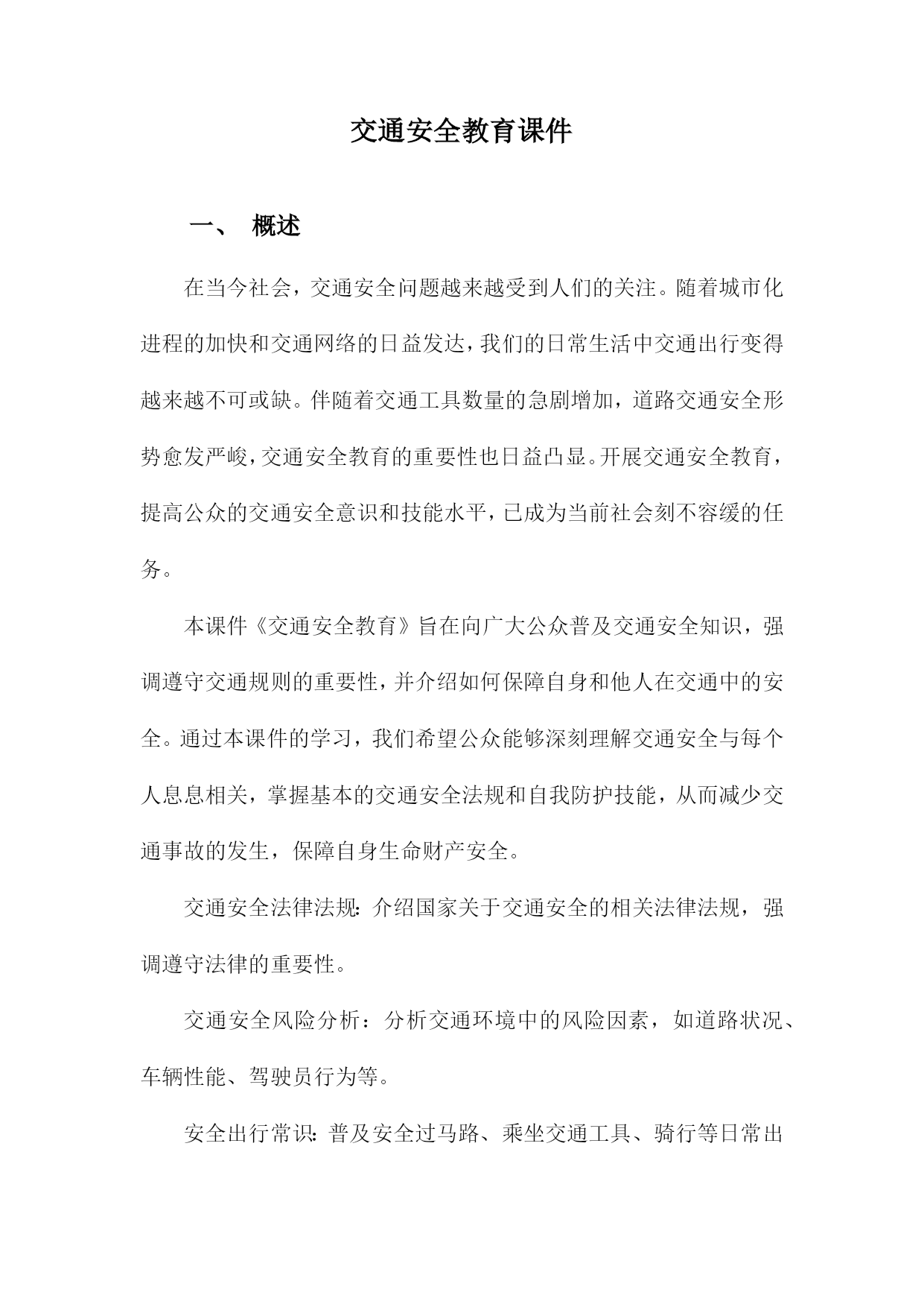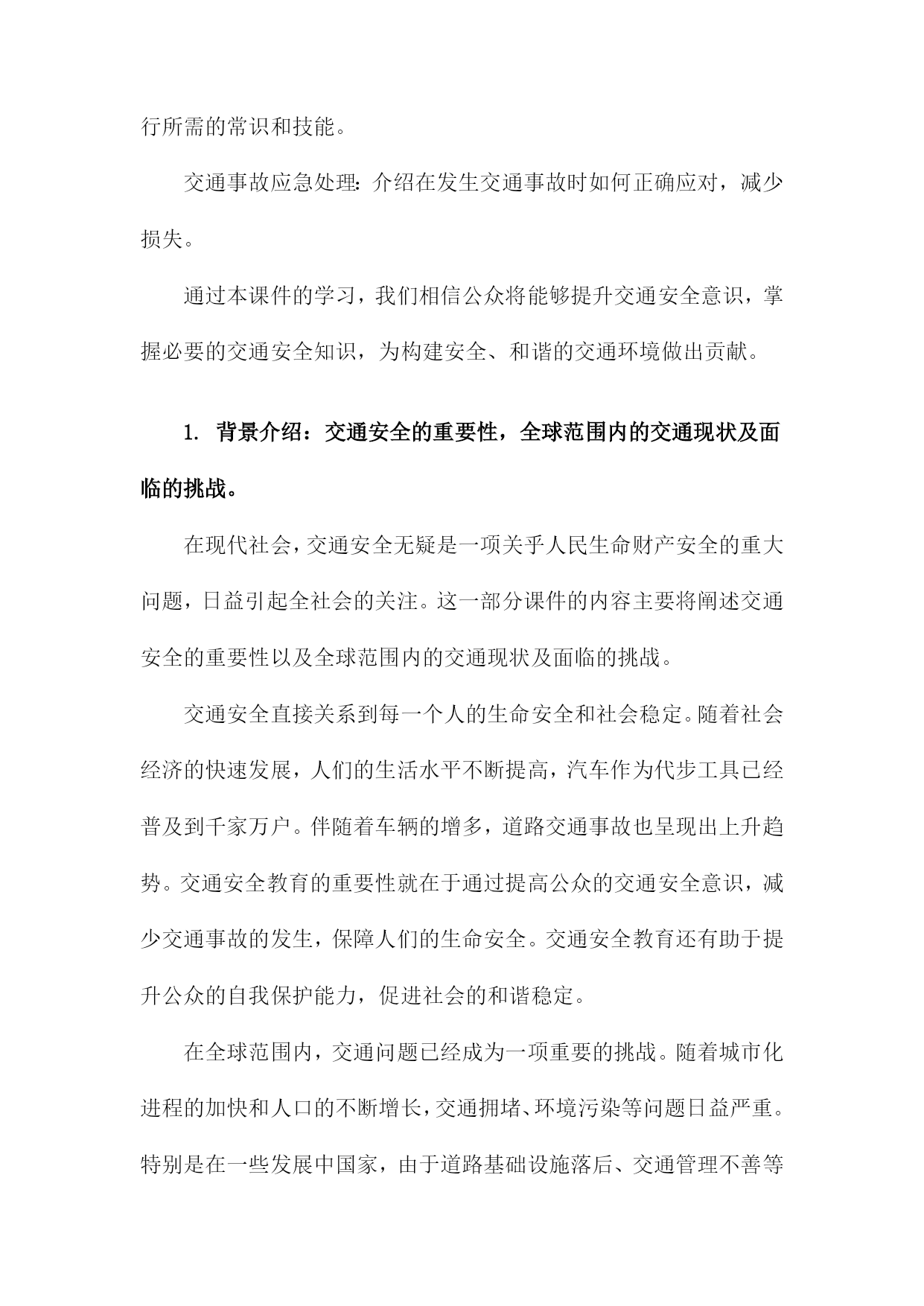 交通安全教育课件一、概述在当今社会,交通安全问题越来越受到人们的关注。随着城市化进程的加快和交通网络的日益发达,我们的日常生活中交通出行变得越来越不可或缺。伴随着交通工具数量的急剧增加,道路交通安全形势愈发严峻,交通安全教育的重要性也日益凸显。开展交通安全教育,提高公众的交通安全意识和技能水平,已成为当前社会刻不容缓的任务。本课件《交通安全教育》旨在向广大公众普及交通安全知识,强调遵守交通规则的重要性,并介绍如何保障自身和他人在交通中的安全。通过本课件的学习,我们希望公众能够深刻理解交通安全与每个人息息相关,掌握基本的交通安全法规和自我防护技能,从而减少交通事故的发生,保障自身生命财产安全。交通安全法律法规:介绍国家关于交通安全的相关法律法规,强调遵守法律的重要性。交通安全风险分析:分析交通环境中的风险因素,如道路状况、车辆性能、驾驶员行为等。安全出行常识:普及安全过马路、乘坐交通工具、骑行等日常出行所需的常识和技能。交通事故应急处理:介绍在发生交通事故时如何正确应对,减少损失。通过本课件的学习,我们相信公众将能够提升交通安全意识,掌握必要的交通安全知识,为构建安全、和谐的交通环境做出贡献。1.背景介绍:交通安全的重要性,全球范围内的交通现状及面临的挑战。在现代社会,交通安全无疑是一项关乎人民生命财产安全的重大问题,日益引起全社会的关注。这一部分课件的内容主要将阐述交通安全的重要性以及全球范围内的交通现状及面临的挑战。交通安全直接关系到每一个人的生命安全和社会稳定。随着社会经济的快速发展,人们的生活水平不断提高,汽车作为代步工具已经普及到千家万户。伴随着车辆的增多,道路交通事故也呈现出上升趋势。交通安全教育的重要性就在于通过提高公众的交通安全意识,减少交通事故的发生,保障人们的生命安全。交通安全教育还有助于提升公众的自我保护能力,促进社会的和谐稳定。在全球范围内,交通问题已经成为一项重要的挑战。随着城市化进程的加快和人口的不断增长,交通拥堵、环境污染等问题日益严重。特别是在一些发展中国家,由于道路基础设施落后、交通管理不善等原因,交通安全问题尤为突出。全球气候变化也对交通安全带来了挑战,如极端天气条件下的道路状况变化等。随着科技的发展,智能交通、自动驾驶等新兴技术也给交通安全带来了新的挑战和机遇。全球范围内的交通安全问题需要各国共同努力,通过加强国际合作与交流,共同应对挑战。加强交通安全教育也是一项重要的措施,通过提高公众的交通安全意识,为构建一个安全、和谐的交通环境打下基础。2.教育目标:通过课件,使学生了解交通安全知识,提高交通安全意识,掌握交通规则,预防交通事故。交通安全教育是我国基础教育的重要组成部分,其目的在于通过系统、全面的教育,使学生了解交通安全知识,提高交通安全意识,掌握交通规则,预防交通事故的发生。在《交通安全教育课件》我们的教育目标如下:知识理解:使学生了解并掌握基本的交通安全知识,包括交通信号的含义、交通法规的基本内容、行人及车辆的安全通行规则等。了解交通事故的常见类型及其危害。安全意识提升:通过课件的教育内容,使学生认识到交通安全的重要性,明白自己在交通中的权利和义务,树立起交通安全意识,养成良好的交通行为习惯。规则掌握:引导学生深入理解并熟练掌握各项交通规则,包括道路安全、行车安全、骑车安全、过马路安全等,确保在日常生活和出行中能够自觉遵守。事故预防:通过深入学习和实践,使学生能够运用所学的交通安全知识和规则,有效预防交通事故的发生,保障自身和他人的生命安全。二、交通安全基础知识交通规则:了解并遵守交通规则是每位公民的基本义务。这包括红灯停、绿灯行,行人走人行道,过马路时看交通信号灯,不随意横穿马路等。道路安全:道路安全关乎生命,我们需要认识到道路的安全隐患,例如避免在夜间行走于偏僻路段,避免在酒后驾车或骑车等。我们也应该理解并遵守车辆的视觉盲区等基本知识。安全行车:驾驶人员需要严格遵守安全驾驶的规则,包括不超速行驶、不疲劳驾驶、不闯红灯等。驾驶人员还需要了解紧急情况下的应急处理措施,如遇到车辆故障、交通事故等突发情况的处理方法。自行车与行人安全:自行车和行人在道路上同样需要遵守交通规则,例如骑自行车时不乱穿乱闯,佩戴安全头盔等。行人应走人行道,并注意躲避车辆,特别是在过马路时要特别注意观察交通信号。交通安全设施:了解并正确使用交通安全设施,如交通信号灯、人行横道、安全护栏等。我们也需要关注交通安全设施的维护和管理,发现问题及时向有关部门反映。1.交通安全定义及意义:解释交通安全的概念,强调其对于个人安全、家庭幸福和社会和谐的重要性。交通安全是指在道路交通活动中,人们能够安全、顺畅地出行,避免因疏忽大意或其他原因导致的意外事故。这涉及到行人、驾驶员、车辆以及道路环境等多个方面。在道路交通系统中,任何一