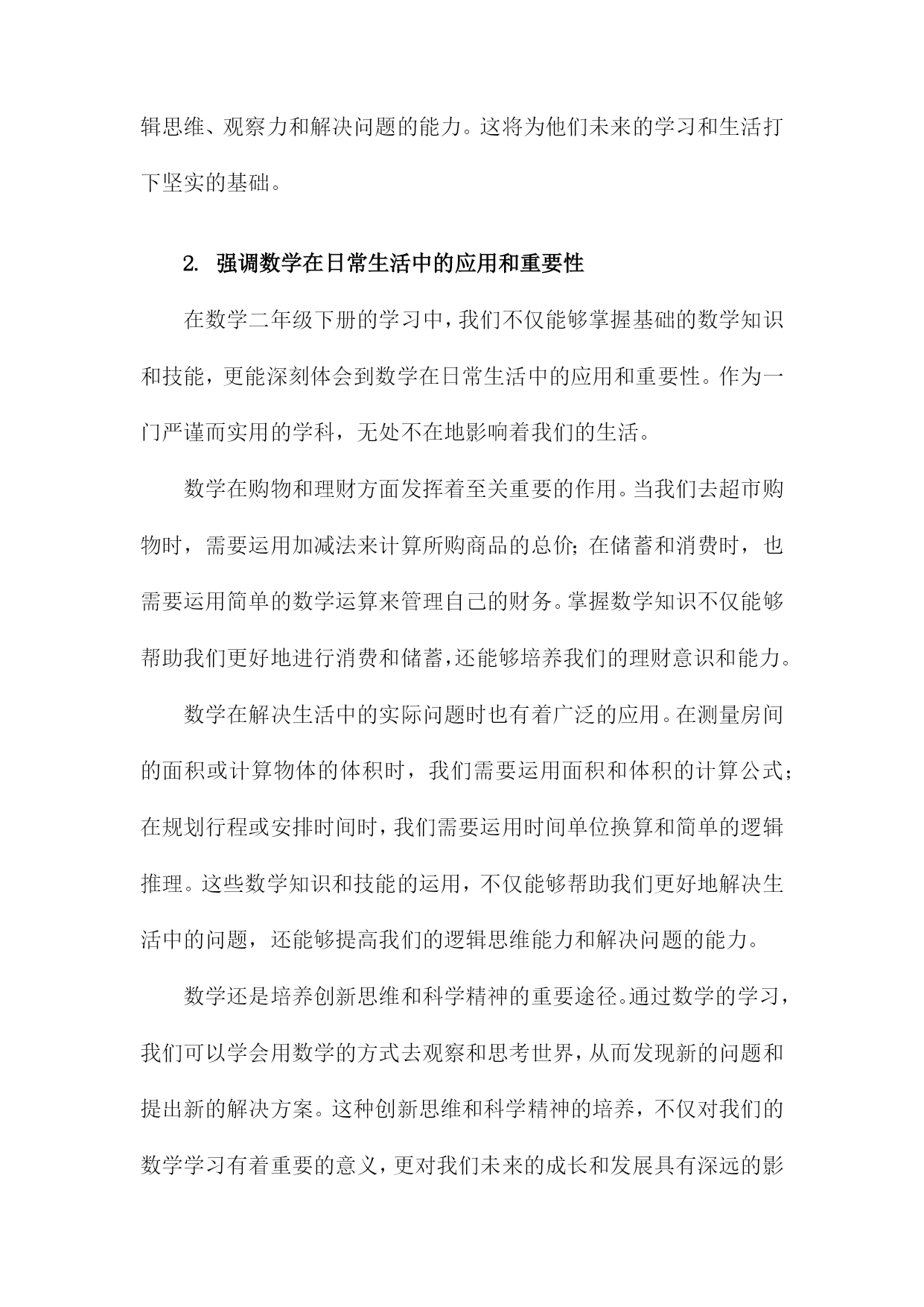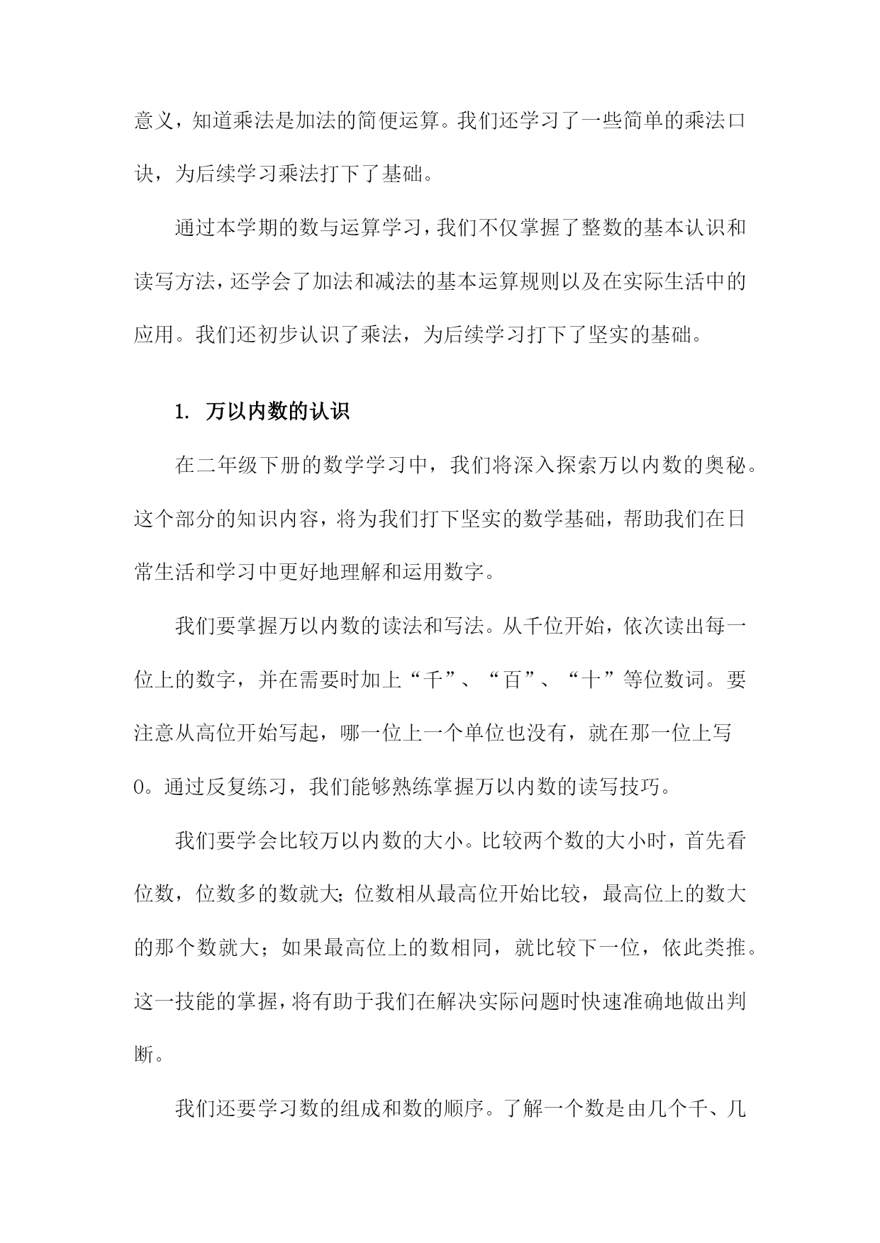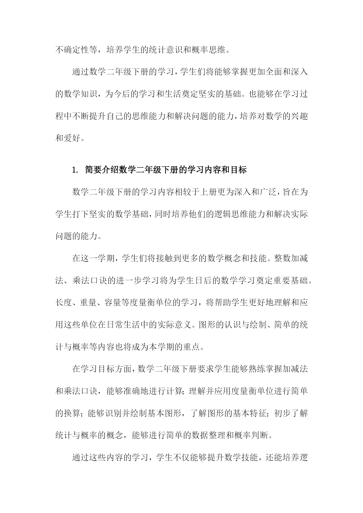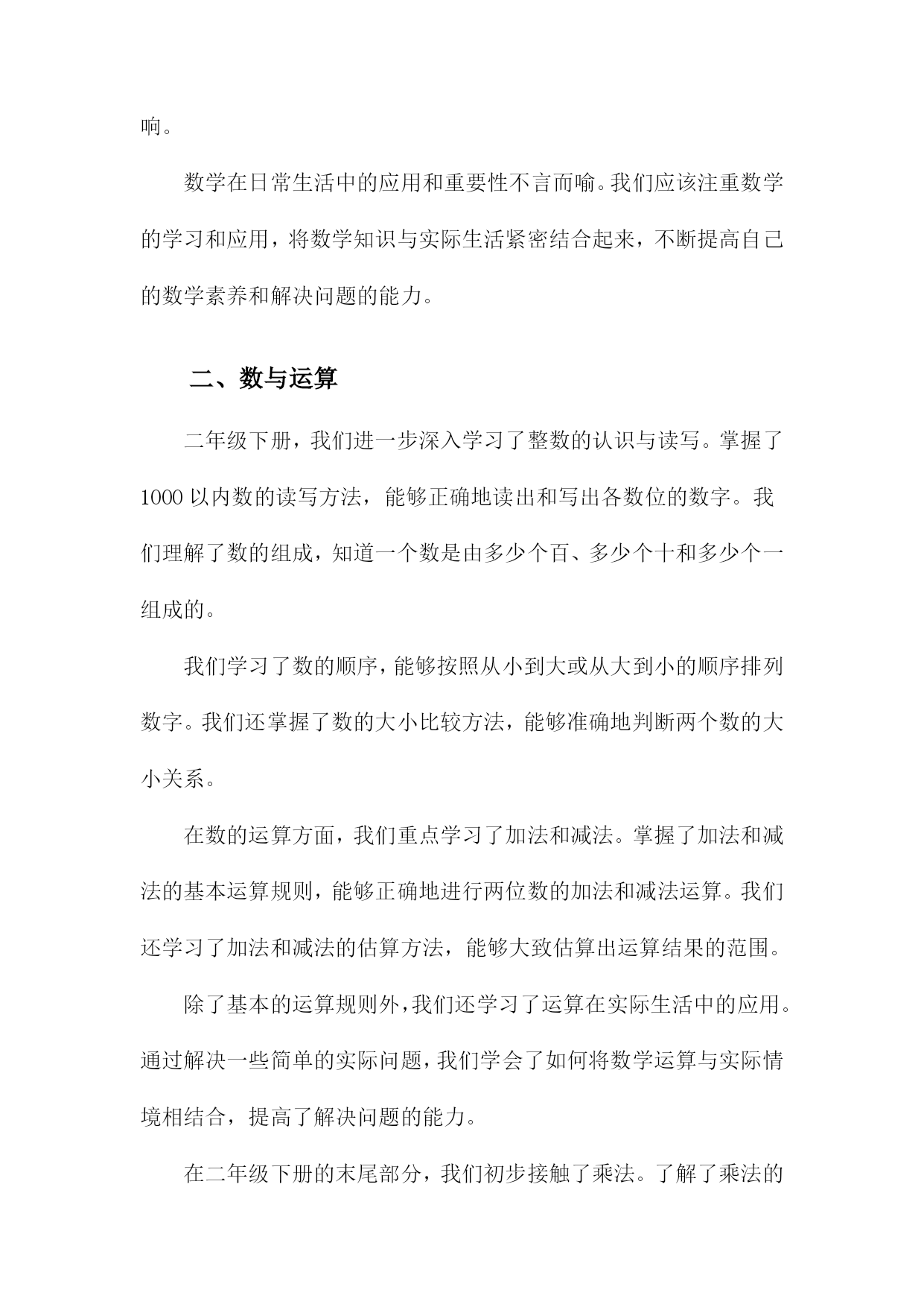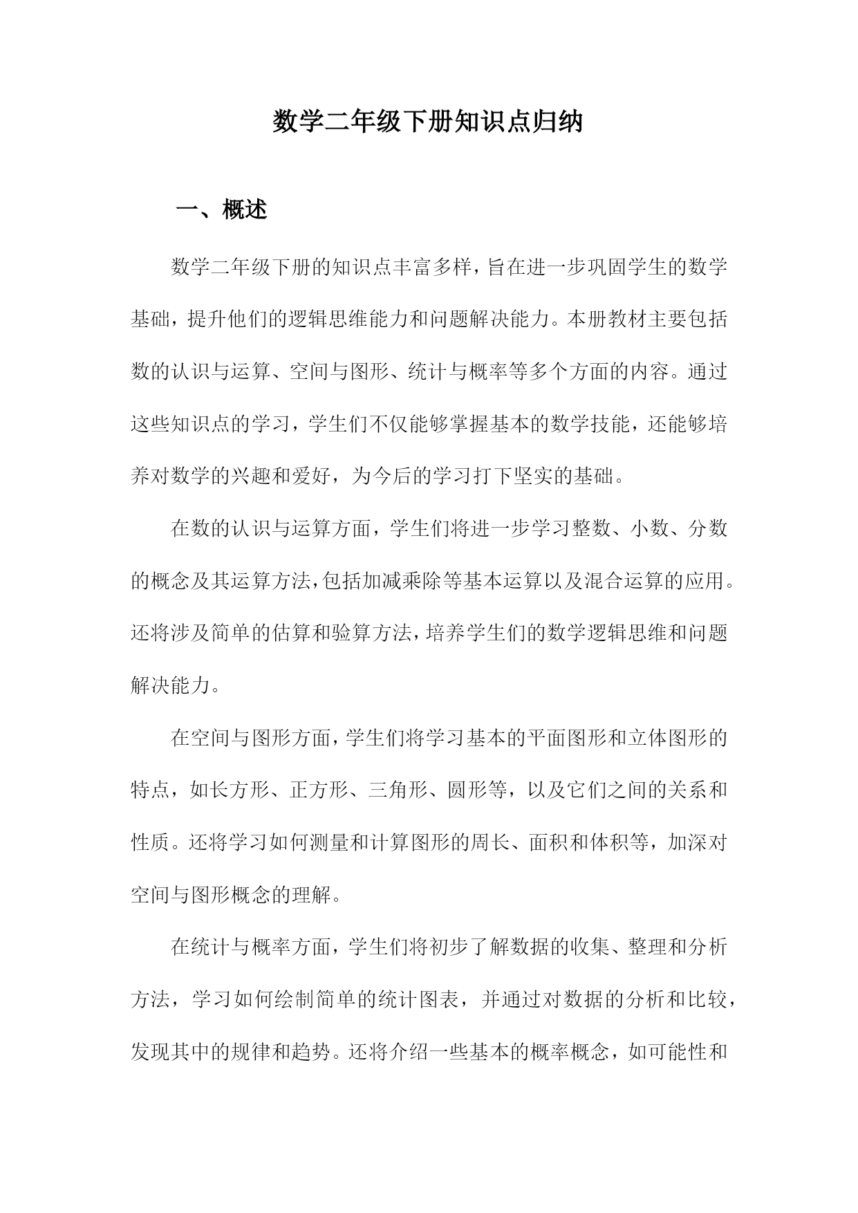 数学二年级下册知识点归纳一、概述数学二年级下册的知识点丰富多样,旨在进一步巩固学生的数学基础,提升他们的逻辑思维能力和问题解决能力。本册教材主要包括数的认识与运算、空间与图形、统计与概率等多个方面的内容。通过这些知识点的学习,学生们不仅能够掌握基本的数学技能,还能够培养对数学的兴趣和爱好,为今后的学习打下坚实的基础。在数的认识与运算方面,学生们将进一步学习整数、小数、分数的概念及其运算方法,包括加减乘除等基本运算以及混合运算的应用。还将涉及简单的估算和验算方法,培养学生们的数学逻辑思维和问题解决能力。在空间与图形方面,学生们将学习基本的平面图形和立体图形的特点,如长方形、正方形、三角形、圆形等,以及它们之间的关系和性质。还将学习如何测量和计算图形的周长、面积和体积等,加深对空间与图形概念的理解。在统计与概率方面,学生们将初步了解数据的收集、整理和分析方法,学习如何绘制简单的统计图表,并通过对数据的分析和比较,发现其中的规律和趋势。还将介绍一些基本的概率概念,如可能性和不确定性等,培养学生的统计意识和概率思维。通过数学二年级下册的学习,学生们将能够掌握更加全面和深入的数学知识,为今后的学习和生活奠定坚实的基础。也能够在学习过程中不断提升自己的思维能力和解决问题的能力,培养对数学的兴趣和爱好。1.简要介绍数学二年级下册的学习内容和目标数学二年级下册的学习内容相较于上册更为深入和广泛,旨在为学生打下坚实的数学基础,同时培养他们的逻辑思维能力和解决实际问题的能力。在这一学期,学生们将接触到更多的数学概念和技能。整数加减法、乘法口诀的进一步学习将为学生日后的数学学习奠定重要基础。长度、重量、容量等度量衡单位的学习,将帮助学生更好地理解和应用这些单位在日常生活中的实际意义。图形的认识与绘制、简单的统计与概率等内容也将成为本学期的重点。在学习目标方面,数学二年级下册要求学生能够熟练掌握加减法和乘法口诀,能够准确地进行计算;理解并应用度量衡单位进行简单的换算;能够识别并绘制基本图形,了解图形的基本特征;初步了解统计与概率的概念,能够进行简单的数据整理和概率判断。通过这些内容的学习,学生不仅能够提升数学技能,还能培养逻辑思维、观察力和解决问题的能力。这将为他们未来的学习和生活打下坚实的基础。2.强调数学在日常生活中的应用和重要性在数学二年级下册的学习中,我们不仅能够掌握基础的数学知识和技能,更能深刻体会到数学在日常生活中的应用和重要性。作为一门严谨而实用的学科,无处不在地影响着我们的生活。数学在购物和理财方面发挥着至关重要的作用。当我们去超市购物时,需要运用加减法来计算所购商品的总价;在储蓄和消费时,也需要运用简单的数学运算来管理自己的财务。掌握数学知识不仅能够帮助我们更好地进行消费和储蓄,还能够培养我们的理财意识和能力。数学在解决生活中的实际问题时也有着广泛的应用。在测量房间的面积或计算物体的体积时,我们需要运用面积和体积的计算公式;在规划行程或安排时间时,我们需要运用时间单位换算和简单的逻辑推理。这些数学知识和技能的运用,不仅能够帮助我们更好地解决生活中的问题,还能够提高我们的逻辑思维能力和解决问题的能力。数学还是培养创新思维和科学精神的重要途径。通过数学的学习,我们可以学会用数学的方式去观察和思考世界,从而发现新的问题和提出新的解决方案。这种创新思维和科学精神的培养,不仅对我们的数学学习有着重要的意义,更对我们未来的成长和发展具有深远的影响。数学在日常生活中的应用和重要性不言而喻。我们应该注重数学的学习和应用,将数学知识与实际生活紧密结合起来,不断提高自己的数学素养和解决问题的能力。二、数与运算二年级下册,我们进一步深入学习了整数的认识与读写。掌握了1000以内数的读写方法,能够正确地读出和写出各数位的数字。我们理解了数的组成,知道一个数是由多少个百、多少个十和多少个一组成的。我们学习了数的顺序,能够按照从小到大或从大到小的顺序排列数字。我们还掌握了数的大小比较方法,能够准确地判断两个数的大小关系。在数的运算方面,我们重点学习了加法和减法。掌握了加法和减法的基本运算规则,能够正确地进行两位数的加法和减法运算。我们还学习了加法和减法的估算方法,能够大致估算出运算结果的范围。除了基本的运算规则外,我们还学习了运算在实际生活中的应用。通过解决一些简单的实际问题,我们学会了如何将数学运算与实际情境相结合,提高了解决问题的能力。在二年级下册的末尾部分,我们初步接触了乘法。了解了乘法的意义,知道乘法是加法的简便运算。我们还学习了一些简单的乘法口诀,为后续学习乘法打下了基础。通过本学期的数与运算学习,我们不仅掌握了整数的基本认识和读写方法,还学会了加法和减法的基本运算规则以及在实际生活中的应用。我们还初步认识了乘法,为后续学习打下了坚实的基础。1.万以