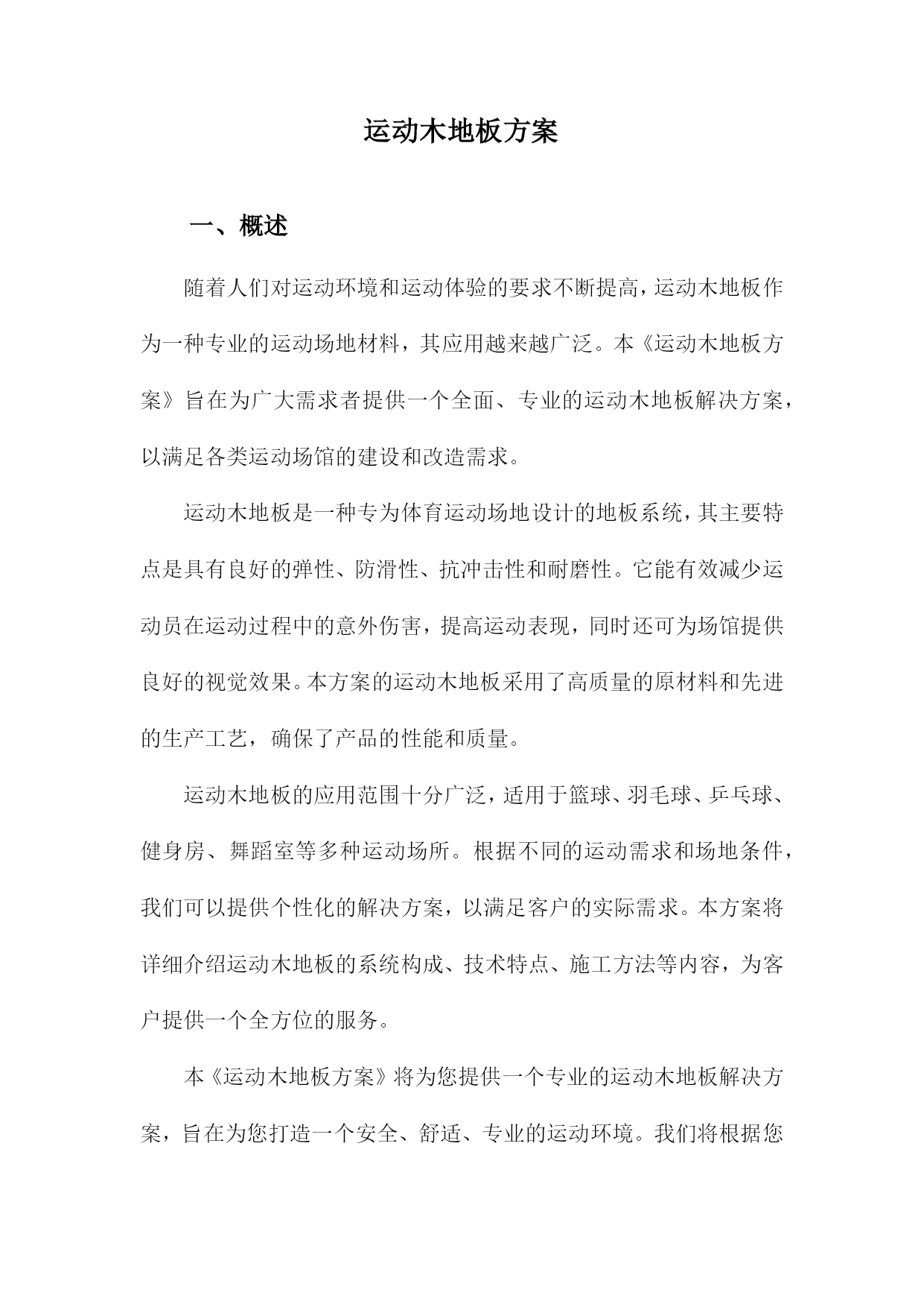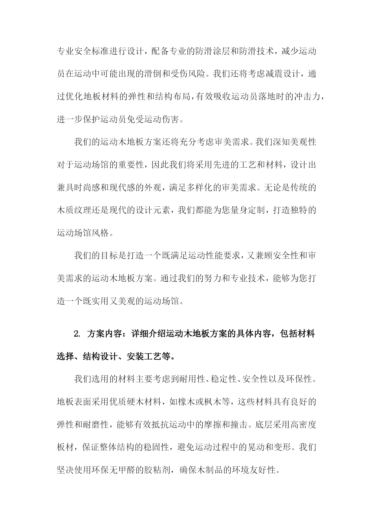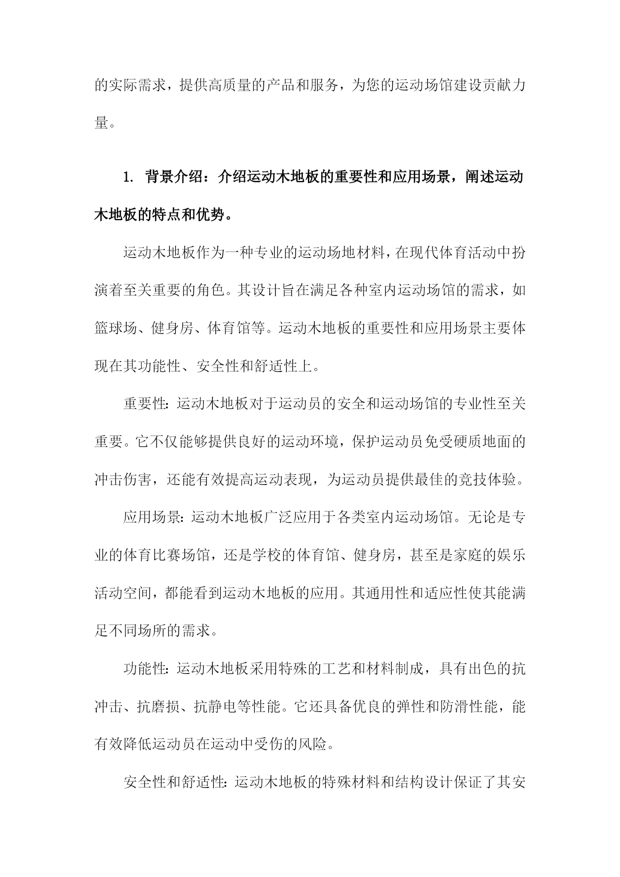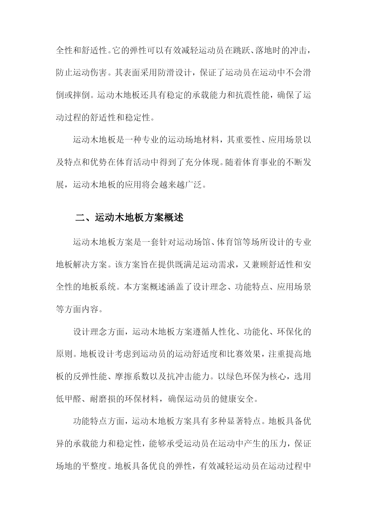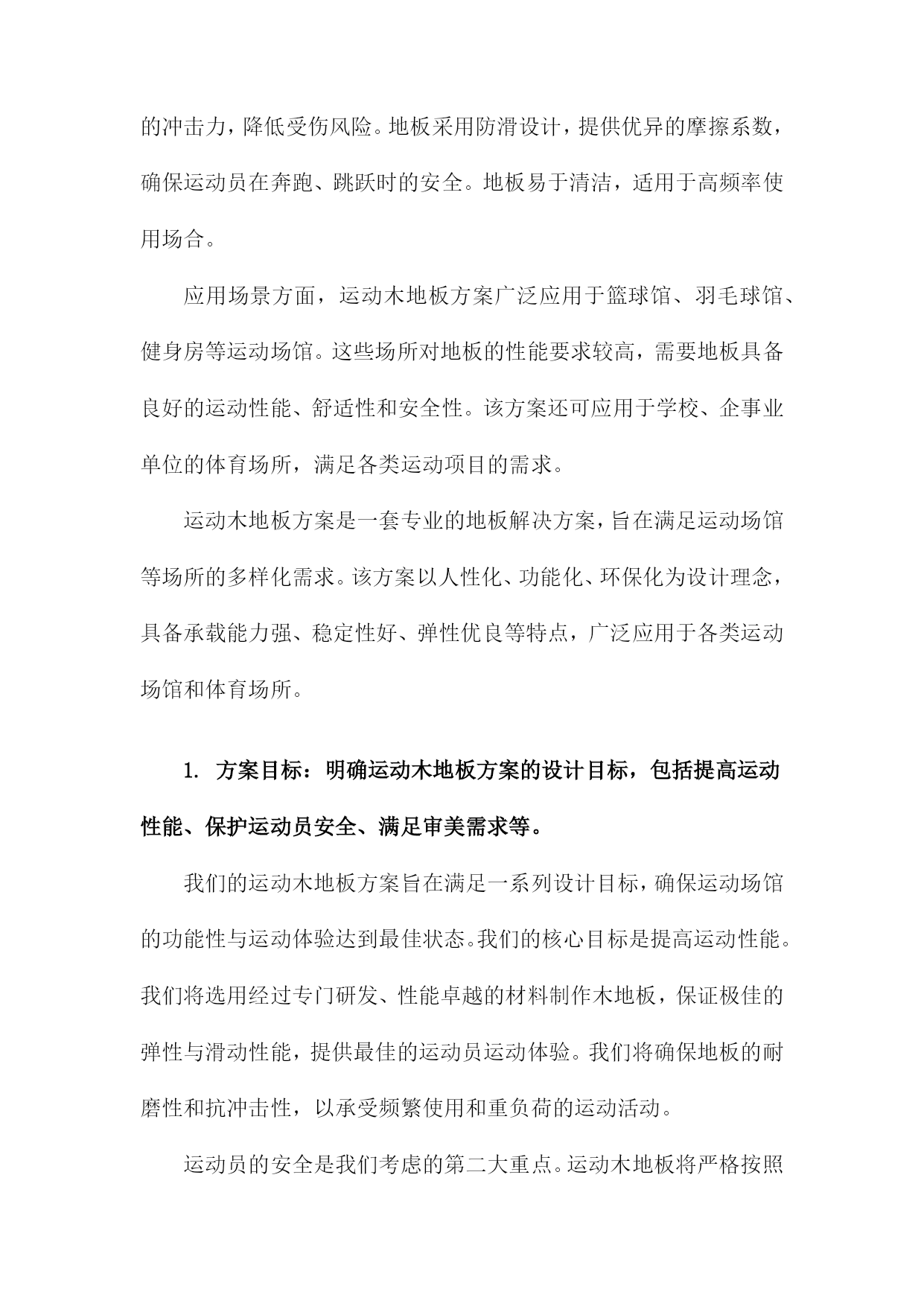 运动木地板方案一、概述随着人们对运动环境和运动体验的要求不断提高,运动木地板作为一种专业的运动场地材料,其应用越来越广泛。本《运动木地板方案》旨在为广大需求者提供一个全面、专业的运动木地板解决方案,以满足各类运动场馆的建设和改造需求。运动木地板是一种专为体育运动场地设计的地板系统,其主要特点是具有良好的弹性、防滑性、抗冲击性和耐磨性。它能有效减少运动员在运动过程中的意外伤害,提高运动表现,同时还可为场馆提供良好的视觉效果。本方案的运动木地板采用了高质量的原材料和先进的生产工艺,确保了产品的性能和质量。运动木地板的应用范围十分广泛,适用于篮球、羽毛球、乒乓球、健身房、舞蹈室等多种运动场所。根据不同的运动需求和场地条件,我们可以提供个性化的解决方案,以满足客户的实际需求。本方案将详细介绍运动木地板的系统构成、技术特点、施工方法等内容,为客户提供一个全方位的服务。本《运动木地板方案》将为您提供一个专业的运动木地板解决方案,旨在为您打造一个安全、舒适、专业的运动环境。我们将根据您的实际需求,提供高质量的产品和服务,为您的运动场馆建设贡献力量。1.背景介绍:介绍运动木地板的重要性和应用场景,阐述运动木地板的特点和优势。运动木地板作为一种专业的运动场地材料,在现代体育活动中扮演着至关重要的角色。其设计旨在满足各种室内运动场馆的需求,如篮球场、健身房、体育馆等。运动木地板的重要性和应用场景主要体现在其功能性、安全性和舒适性上。重要性:运动木地板对于运动员的安全和运动场馆的专业性至关重要。它不仅能够提供良好的运动环境,保护运动员免受硬质地面的冲击伤害,还能有效提高运动表现,为运动员提供最佳的竞技体验。应用场景:运动木地板广泛应用于各类室内运动场馆。无论是专业的体育比赛场馆,还是学校的体育馆、健身房,甚至是家庭的娱乐活动空间,都能看到运动木地板的应用。其通用性和适应性使其能满足不同场所的需求。功能性:运动木地板采用特殊的工艺和材料制成,具有出色的抗冲击、抗磨损、抗静电等性能。它还具备优良的弹性和防滑性能,能有效降低运动员在运动中受伤的风险。安全性和舒适性:运动木地板的特殊材料和结构设计保证了其安全性和舒适性。它的弹性可以有效减轻运动员在跳跃、落地时的冲击,防止运动伤害。其表面采用防滑设计,保证了运动员在运动中不会滑倒或摔倒。运动木地板还具有稳定的承载能力和抗震性能,确保了运动过程的舒适性和稳定性。运动木地板是一种专业的运动场地材料,其重要性、应用场景以及特点和优势在体育活动中得到了充分体现。随着体育事业的不断发展,运动木地板的应用将会越来越广泛。二、运动木地板方案概述运动木地板方案是一套针对运动场馆、体育馆等场所设计的专业地板解决方案。该方案旨在提供既满足运动需求,又兼顾舒适性和安全性的地板系统。本方案概述涵盖了设计理念、功能特点、应用场景等方面内容。设计理念方面,运动木地板方案遵循人性化、功能化、环保化的原则。地板设计考虑到运动员的运动舒适度和比赛效果,注重提高地板的反弹性能、摩擦系数以及抗冲击能力。以绿色环保为核心,选用低甲醛、耐磨损的环保材料,确保运动员的健康安全。功能特点方面,运动木地板方案具有多种显著特点。地板具备优异的承载能力和稳定性,能够承受运动员在运动中产生的压力,保证场地的平整度。地板具备优良的弹性,有效减轻运动员在运动过程中的冲击力,降低受伤风险。地板采用防滑设计,提供优异的摩擦系数,确保运动员在奔跑、跳跃时的安全。地板易于清洁,适用于高频率使用场合。应用场景方面,运动木地板方案广泛应用于篮球馆、羽毛球馆、健身房等运动场馆。这些场所对地板的性能要求较高,需要地板具备良好的运动性能、舒适性和安全性。该方案还可应用于学校、企事业单位的体育场所,满足各类运动项目的需求。运动木地板方案是一套专业的地板解决方案,旨在满足运动场馆等场所的多样化需求。该方案以人性化、功能化、环保化为设计理念,具备承载能力强、稳定性好、弹性优良等特点,广泛应用于各类运动场馆和体育场所。1.方案目标:明确运动木地板方案的设计目标,包括提高运动性能、保护运动员安全、满足审美需求等。我们的运动木地板方案旨在满足一系列设计目标,确保运动场馆的功能性与运动体验达到最佳状态。我们的核心目标是提高运动性能。我们将选用经过专门研发、性能卓越的材料制作木地板,保证极佳的弹性与滑动性能,提供最佳的运动员运动体验。我们将确保地板的耐磨性和抗冲击性,以承受频繁使用和重负荷的运动活动。运动员的安全是我们考虑的第二大重点。运动木地板将严格按照专业安全标准进行设计,配备专业的防滑涂层和防滑技术,减少运动员在运动中可能出现的滑倒和受伤风险。我们还将考虑减震设计,通过优化地板材料的弹性和结构布局,有效吸收运动员落地时的冲击力,进一步保护运动员免受运动伤害。我们的运动木地板方案还将充分考虑审