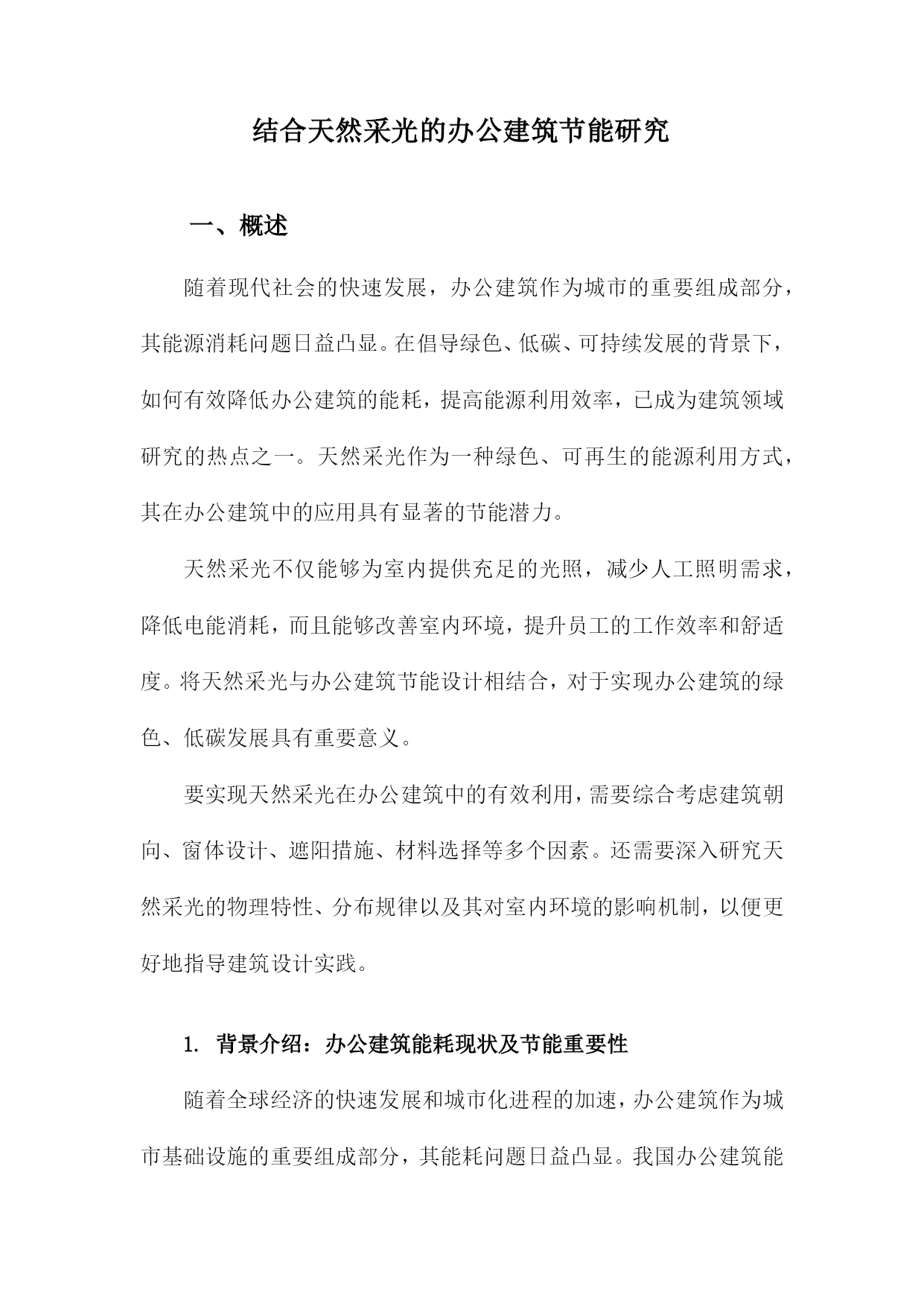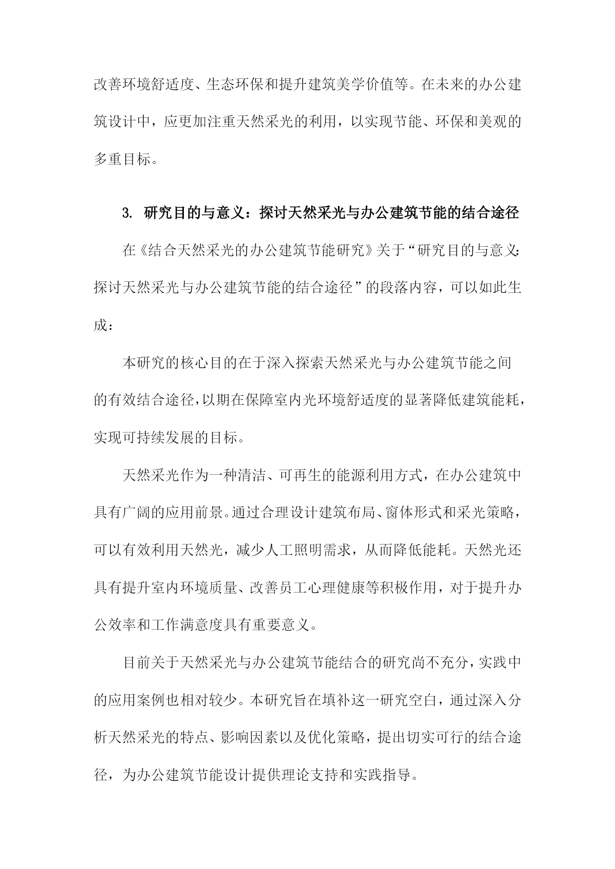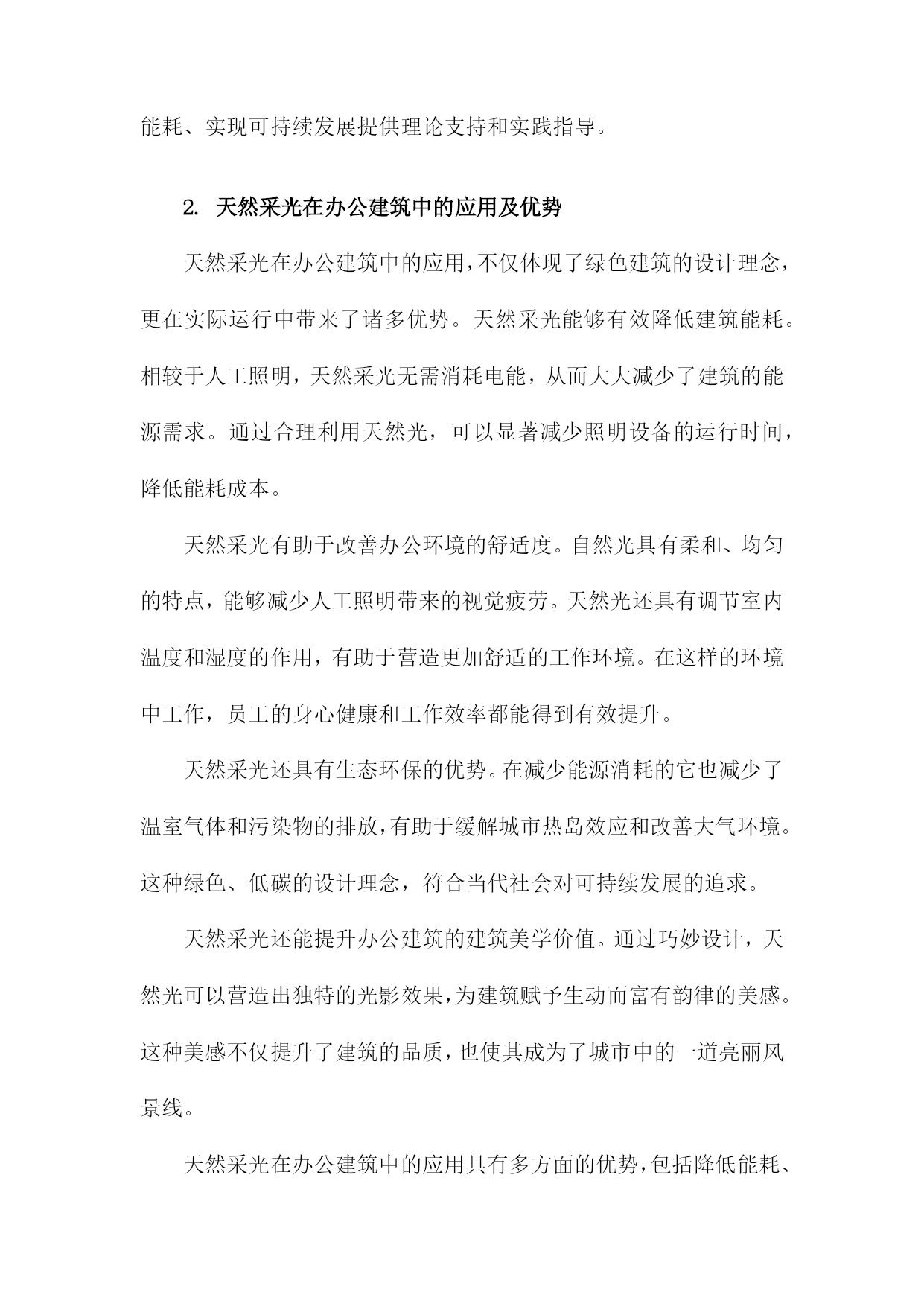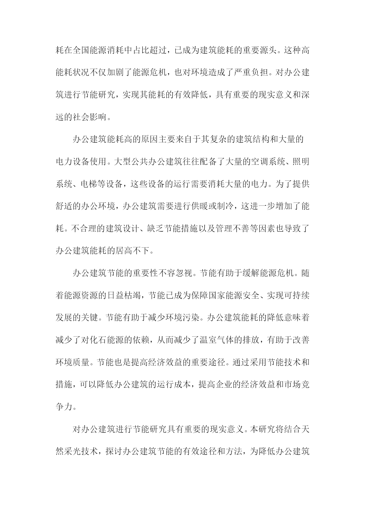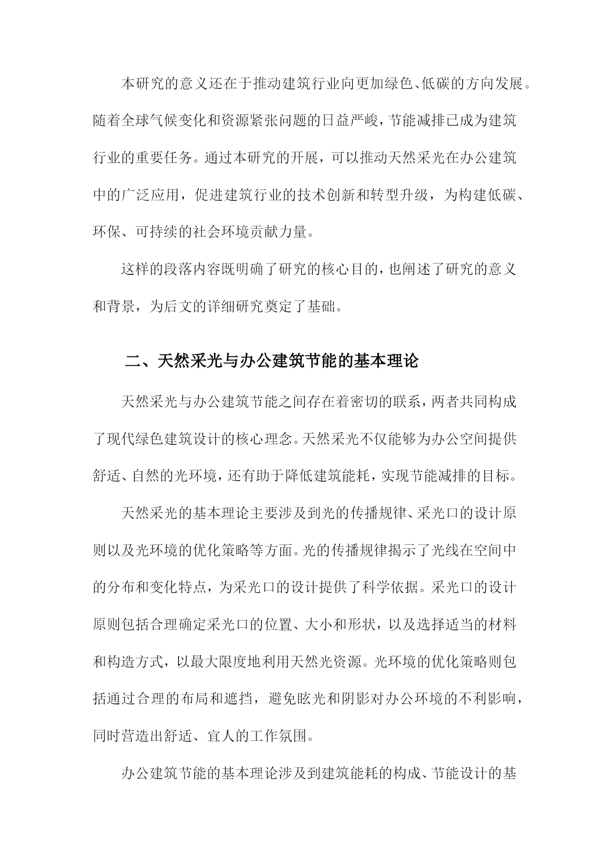 结合天然采光的办公建筑节能研究一、概述随着现代社会的快速发展,办公建筑作为城市的重要组成部分,其能源消耗问题日益凸显。在倡导绿色、低碳、可持续发展的背景下,如何有效降低办公建筑的能耗,提高能源利用效率,已成为建筑领域研究的热点之一。天然采光作为一种绿色、可再生的能源利用方式,其在办公建筑中的应用具有显著的节能潜力。天然采光不仅能够为室内提供充足的光照,减少人工照明需求,降低电能消耗,而且能够改善室内环境,提升员工的工作效率和舒适度。将天然采光与办公建筑节能设计相结合,对于实现办公建筑的绿色、低碳发展具有重要意义。要实现天然采光在办公建筑中的有效利用,需要综合考虑建筑朝向、窗体设计、遮阳措施、材料选择等多个因素。还需要深入研究天然采光的物理特性、分布规律以及其对室内环境的影响机制,以便更好地指导建筑设计实践。1.背景介绍:办公建筑能耗现状及节能重要性随着全球经济的快速发展和城市化进程的加速,办公建筑作为城市基础设施的重要组成部分,其能耗问题日益凸显。我国办公建筑能耗在全国能源消耗中占比超过,已成为建筑能耗的重要源头。这种高能耗状况不仅加剧了能源危机,也对环境造成了严重负担。对办公建筑进行节能研究,实现其能耗的有效降低,具有重要的现实意义和深远的社会影响。办公建筑能耗高的原因主要来自于其复杂的建筑结构和大量的电力设备使用。大型公共办公建筑往往配备了大量的空调系统、照明系统、电梯等设备,这些设备的运行需要消耗大量的电力。为了提供舒适的办公环境,办公建筑需要进行供暖或制冷,这进一步增加了能耗。不合理的建筑设计、缺乏节能措施以及管理不善等因素也导致了办公建筑能耗的居高不下。办公建筑节能的重要性不容忽视。节能有助于缓解能源危机。随着能源资源的日益枯竭,节能已成为保障国家能源安全、实现可持续发展的关键。节能有助于减少环境污染。办公建筑能耗的降低意味着减少了对化石能源的依赖,从而减少了温室气体的排放,有助于改善环境质量。节能也是提高经济效益的重要途径。通过采用节能技术和措施,可以降低办公建筑的运行成本,提高企业的经济效益和市场竞争力。对办公建筑进行节能研究具有重要的现实意义。本研究将结合天然采光技术,探讨办公建筑节能的有效途径和方法,为降低办公建筑能耗、实现可持续发展提供理论支持和实践指导。2.天然采光在办公建筑中的应用及优势天然采光在办公建筑中的应用,不仅体现了绿色建筑的设计理念,更在实际运行中带来了诸多优势。天然采光能够有效降低建筑能耗。相较于人工照明,天然采光无需消耗电能,从而大大减少了建筑的能源需求。通过合理利用天然光,可以显著减少照明设备的运行时间,降低能耗成本。天然采光有助于改善办公环境的舒适度。自然光具有柔和、均匀的特点,能够减少人工照明带来的视觉疲劳。天然光还具有调节室内温度和湿度的作用,有助于营造更加舒适的工作环境。在这样的环境中工作,员工的身心健康和工作效率都能得到有效提升。天然采光还具有生态环保的优势。在减少能源消耗的它也减少了温室气体和污染物的排放,有助于缓解城市热岛效应和改善大气环境。这种绿色、低碳的设计理念,符合当代社会对可持续发展的追求。天然采光还能提升办公建筑的建筑美学价值。通过巧妙设计,天然光可以营造出独特的光影效果,为建筑赋予生动而富有韵律的美感。这种美感不仅提升了建筑的品质,也使其成为了城市中的一道亮丽风景线。天然采光在办公建筑中的应用具有多方面的优势,包括降低能耗、改善环境舒适度、生态环保和提升建筑美学价值等。在未来的办公建筑设计中,应更加注重天然采光的利用,以实现节能、环保和美观的多重目标。3.研究目的与意义:探讨天然采光与办公建筑节能的结合途径在《结合天然采光的办公建筑节能研究》关于“研究目的与意义:探讨天然采光与办公建筑节能的结合途径”的段落内容,可以如此生成:本研究的核心目的在于深入探索天然采光与办公建筑节能之间的有效结合途径,以期在保障室内光环境舒适度的显著降低建筑能耗,实现可持续发展的目标。天然采光作为一种清洁、可再生的能源利用方式,在办公建筑中具有广阔的应用前景。通过合理设计建筑布局、窗体形式和采光策略,可以有效利用天然光,减少人工照明需求,从而降低能耗。天然光还具有提升室内环境质量、改善员工心理健康等积极作用,对于提升办公效率和工作满意度具有重要意义。目前关于天然采光与办公建筑节能结合的研究尚不充分,实践中的应用案例也相对较少。本研究旨在填补这一研究空白,通过深入分析天然采光的特点、影响因素以及优化策略,提出切实可行的结合途径,为办公建筑节能设计提供理论支持和实践指导。本研究的意义还在于推动建筑行业向更加绿色、低碳的方向发展。随着全球气候变化和资源紧张问题的日益严峻,节能减排已成为建筑行业的重要任务。通过本研究的开展,可以推动天然采光在办公建筑中的广泛应用,促进建筑行业的技术创新和转型升