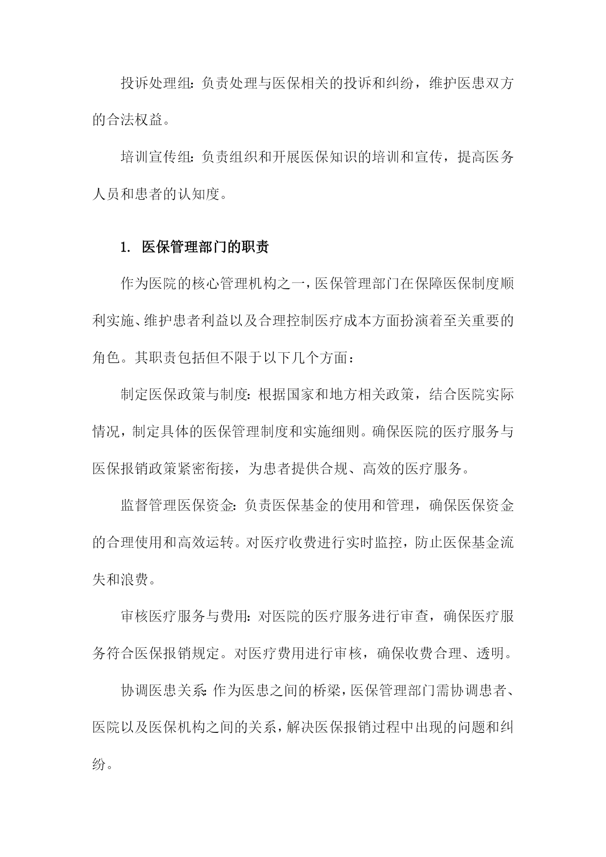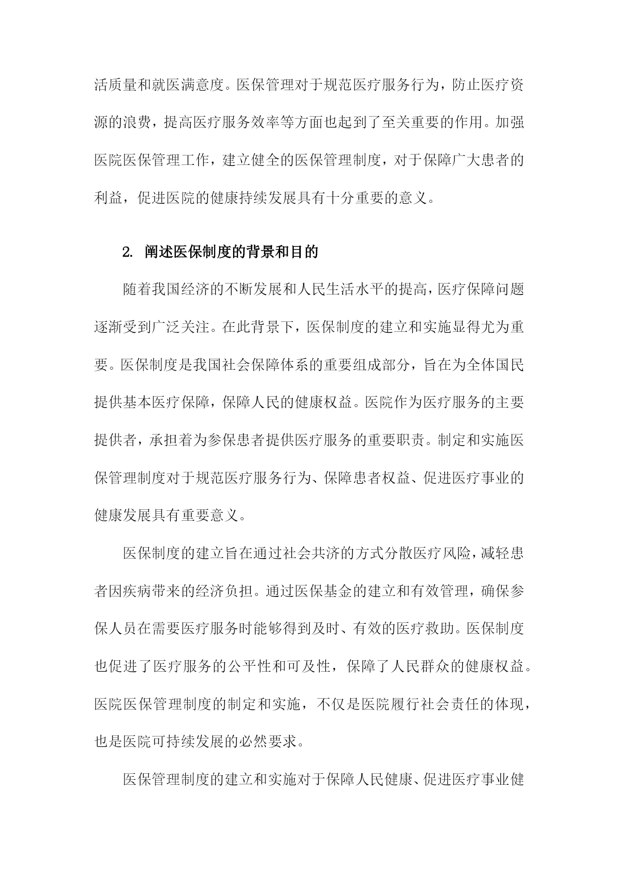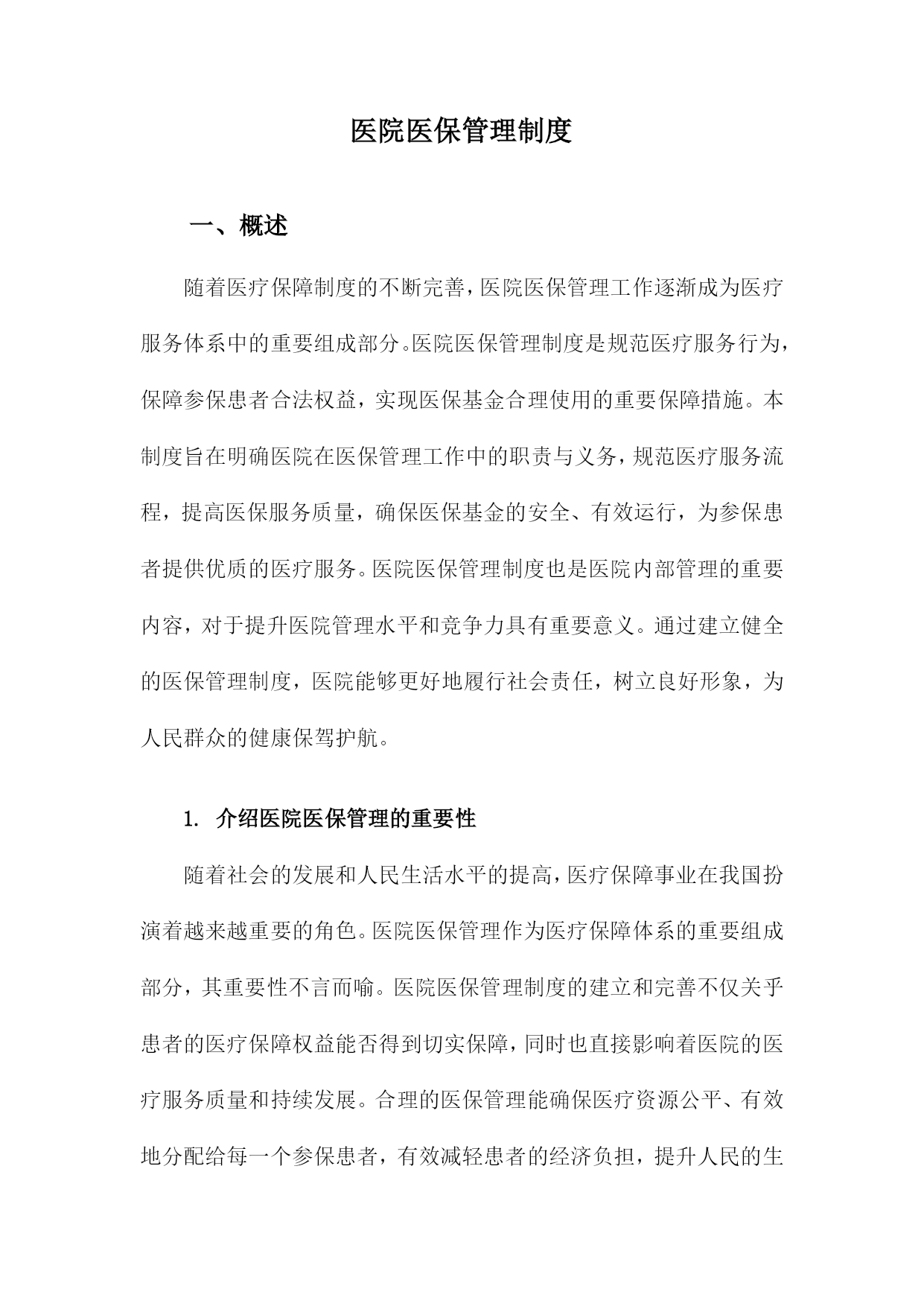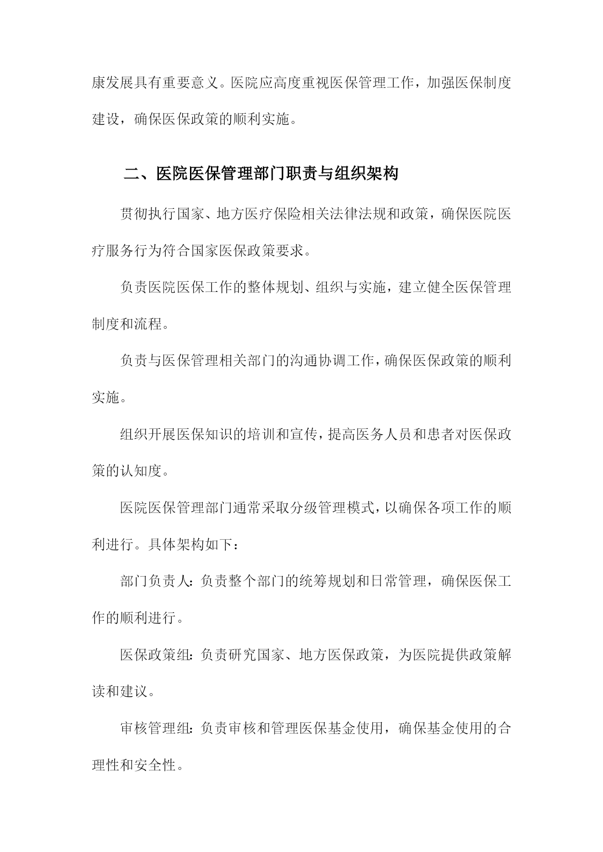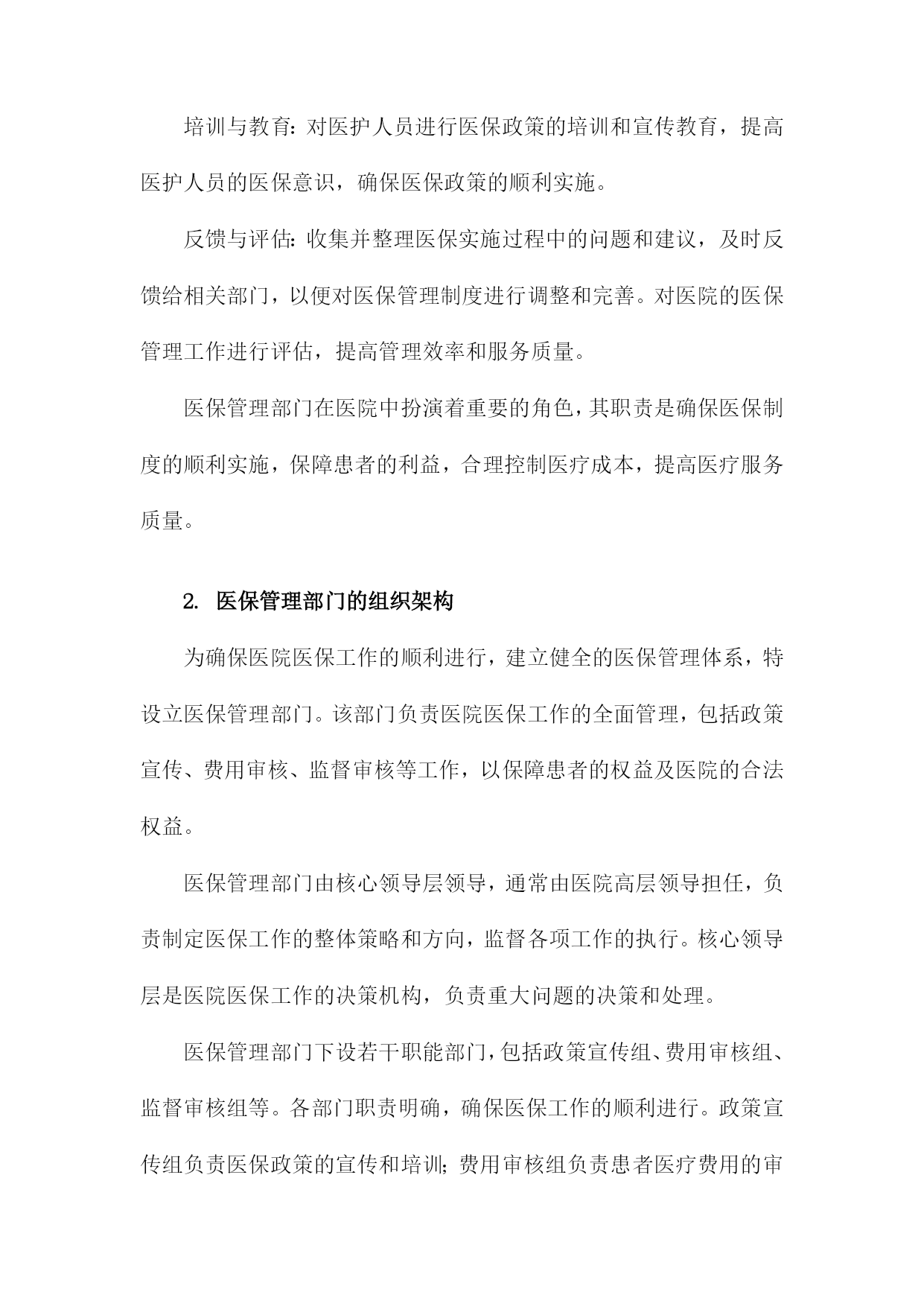 医院医保管理制度一、概述随着医疗保障制度的不断完善,医院医保管理工作逐渐成为医疗服务体系中的重要组成部分。医院医保管理制度是规范医疗服务行为,保障参保患者合法权益,实现医保基金合理使用的重要保障措施。本制度旨在明确医院在医保管理工作中的职责与义务,规范医疗服务流程,提高医保服务质量,确保医保基金的安全、有效运行,为参保患者提供优质的医疗服务。医院医保管理制度也是医院内部管理的重要内容,对于提升医院管理水平和竞争力具有重要意义。通过建立健全的医保管理制度,医院能够更好地履行社会责任,树立良好形象,为人民群众的健康保驾护航。1.介绍医院医保管理的重要性随着社会的发展和人民生活水平的提高,医疗保障事业在我国扮演着越来越重要的角色。医院医保管理作为医疗保障体系的重要组成部分,其重要性不言而喻。医院医保管理制度的建立和完善不仅关乎患者的医疗保障权益能否得到切实保障,同时也直接影响着医院的医疗服务质量和持续发展。合理的医保管理能确保医疗资源公平、有效地分配给每一个参保患者,有效减轻患者的经济负担,提升人民的生活质量和就医满意度。医保管理对于规范医疗服务行为,防止医疗资源的浪费,提高医疗服务效率等方面也起到了至关重要的作用。加强医院医保管理工作,建立健全的医保管理制度,对于保障广大患者的利益,促进医院的健康持续发展具有十分重要的意义。2.阐述医保制度的背景和目的随着我国经济的不断发展和人民生活水平的提高,医疗保障问题逐渐受到广泛关注。在此背景下,医保制度的建立和实施显得尤为重要。医保制度是我国社会保障体系的重要组成部分,旨在为全体国民提供基本医疗保障,保障人民的健康权益。医院作为医疗服务的主要提供者,承担着为参保患者提供医疗服务的重要职责。制定和实施医保管理制度对于规范医疗服务行为、保障患者权益、促进医疗事业的健康发展具有重要意义。医保制度的建立旨在通过社会共济的方式分散医疗风险,减轻患者因疾病带来的经济负担。通过医保基金的建立和有效管理,确保参保人员在需要医疗服务时能够得到及时、有效的医疗救助。医保制度也促进了医疗服务的公平性和可及性,保障了人民群众的健康权益。医院医保管理制度的制定和实施,不仅是医院履行社会责任的体现,也是医院可持续发展的必然要求。医保管理制度的建立和实施对于保障人民健康、促进医疗事业健康发展具有重要意义。医院应高度重视医保管理工作,加强医保制度建设,确保医保政策的顺利实施。二、医院医保管理部门职责与组织架构贯彻执行国家、地方医疗保险相关法律法规和政策,确保医院医疗服务行为符合国家医保政策要求。负责医院医保工作的整体规划、组织与实施,建立健全医保管理制度和流程。负责与医保管理相关部门的沟通协调工作,确保医保政策的顺利实施。组织开展医保知识的培训和宣传,提高医务人员和患者对医保政策的认知度。医院医保管理部门通常采取分级管理模式,以确保各项工作的顺利进行。具体架构如下:部门负责人:负责整个部门的统筹规划和日常管理,确保医保工作的顺利进行。医保政策组:负责研究国家、地方医保政策,为医院提供政策解读和建议。审核管理组:负责审核和管理医保基金使用,确保基金使用的合理性和安全性。投诉处理组:负责处理与医保相关的投诉和纠纷,维护医患双方的合法权益。培训宣传组:负责组织和开展医保知识的培训和宣传,提高医务人员和患者的认知度。1.医保管理部门的职责作为医院的核心管理机构之一,医保管理部门在保障医保制度顺利实施、维护患者利益以及合理控制医疗成本方面扮演着至关重要的角色。其职责包括但不限于以下几个方面:制定医保政策与制度:根据国家和地方相关政策,结合医院实际情况,制定具体的医保管理制度和实施细则。确保医院的医疗服务与医保报销政策紧密衔接,为患者提供合规、高效的医疗服务。监督管理医保资金:负责医保基金的使用和管理,确保医保资金的合理使用和高效运转。对医疗收费进行实时监控,防止医保基金流失和浪费。审核医疗服务与费用:对医院的医疗服务进行审查,确保医疗服务符合医保报销规定。对医疗费用进行审核,确保收费合理、透明。协调医患关系:作为医患之间的桥梁,医保管理部门需协调患者、医院以及医保机构之间的关系,解决医保报销过程中出现的问题和纠纷。培训与教育:对医护人员进行医保政策的培训和宣传教育,提高医护人员的医保意识,确保医保政策的顺利实施。反馈与评估:收集并整理医保实施过程中的问题和建议,及时反馈给相关部门,以便对医保管理制度进行调整和完善。对医院的医保管理工作进行评估,提高管理效率和服务质量。医保管理部门在医院中扮演着重要的角色,其职责是确保医保制度的顺利实施,保障患者的利益,合理控制医疗成本,提高医疗服务质量。2.医保管理部门的组织架构为确保医院医保工作的顺利进行,建立健全的医保管理体系,特设立医保管理部门。该部门负责医院医保工作的全面管理,包括政策宣传