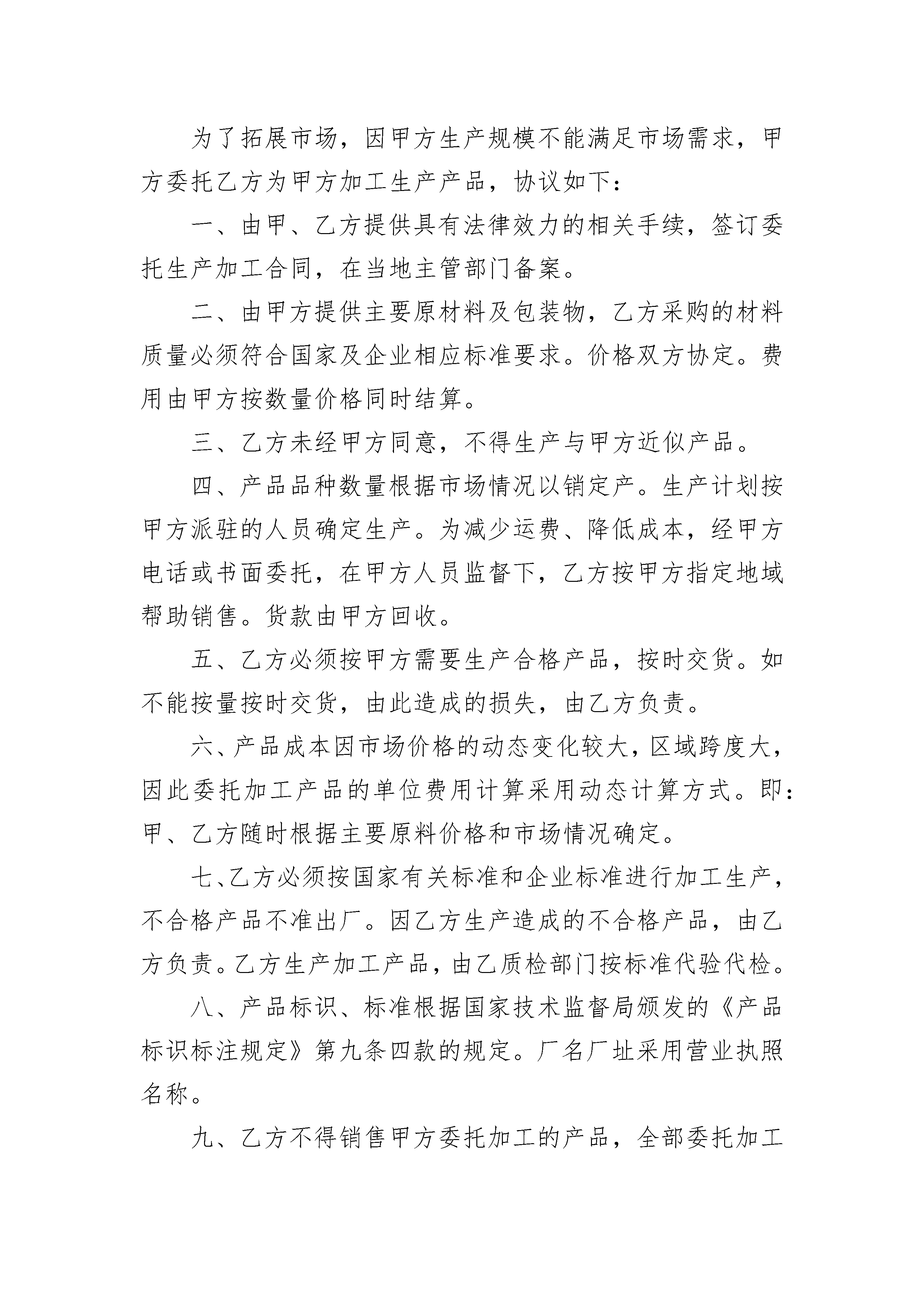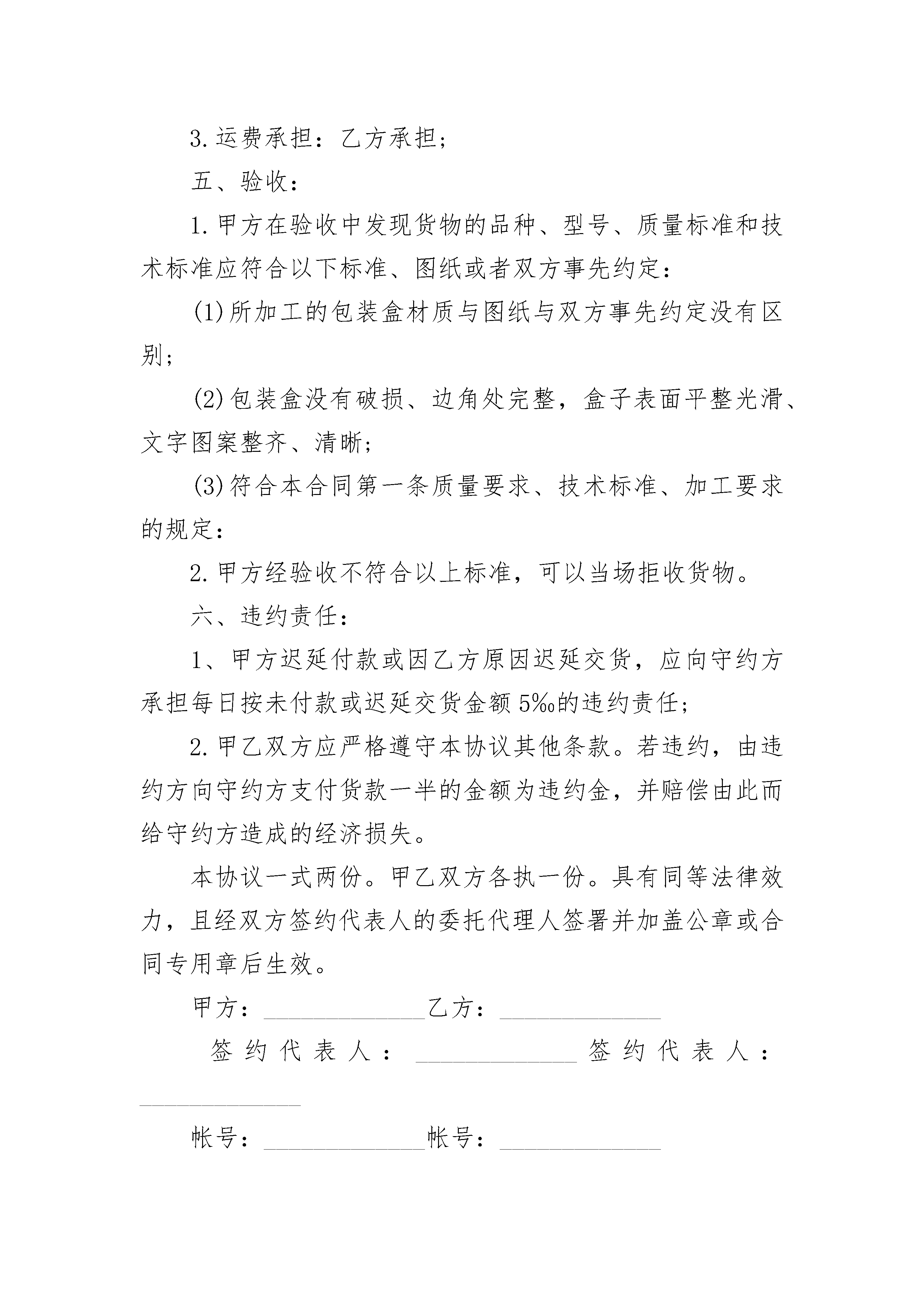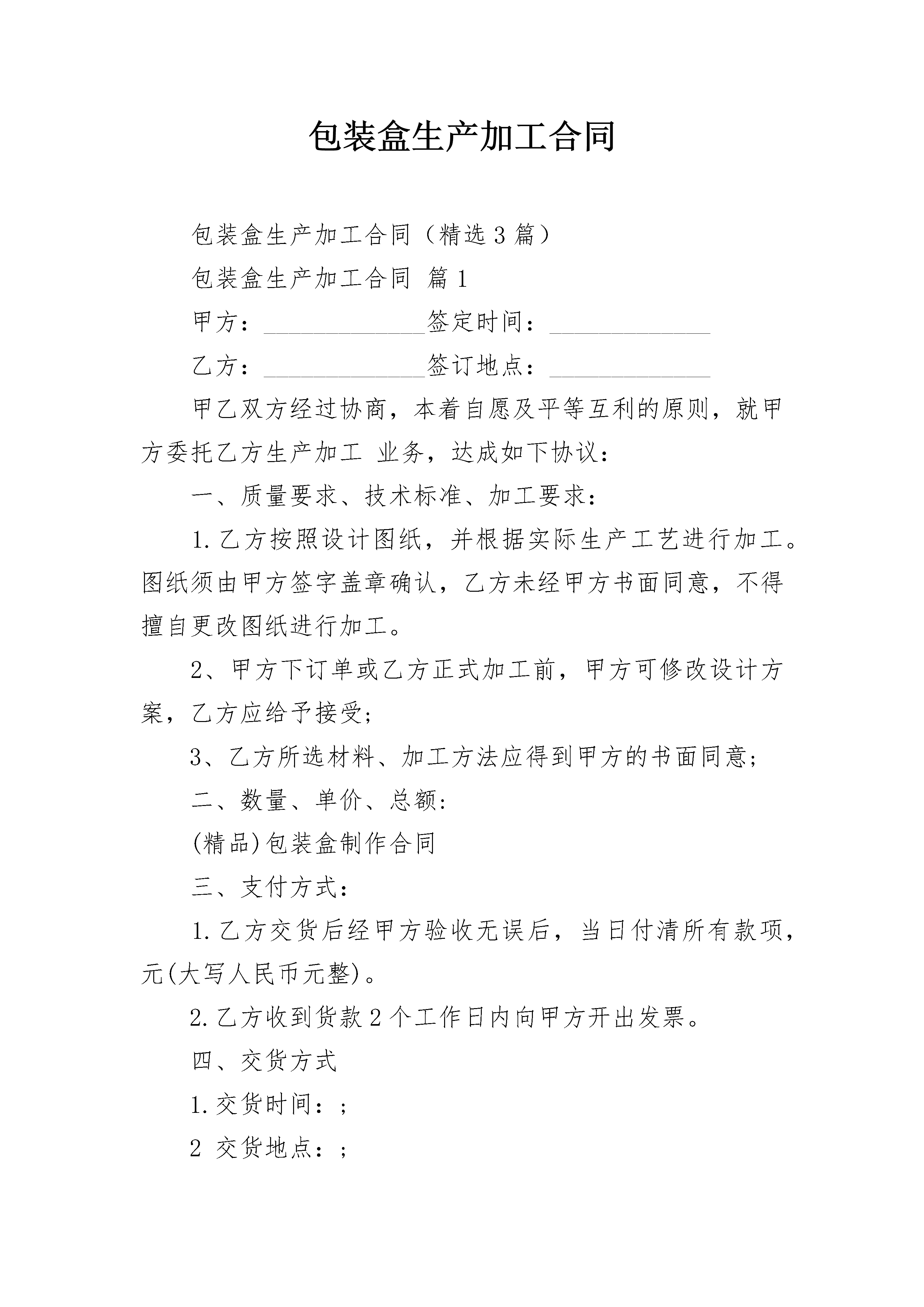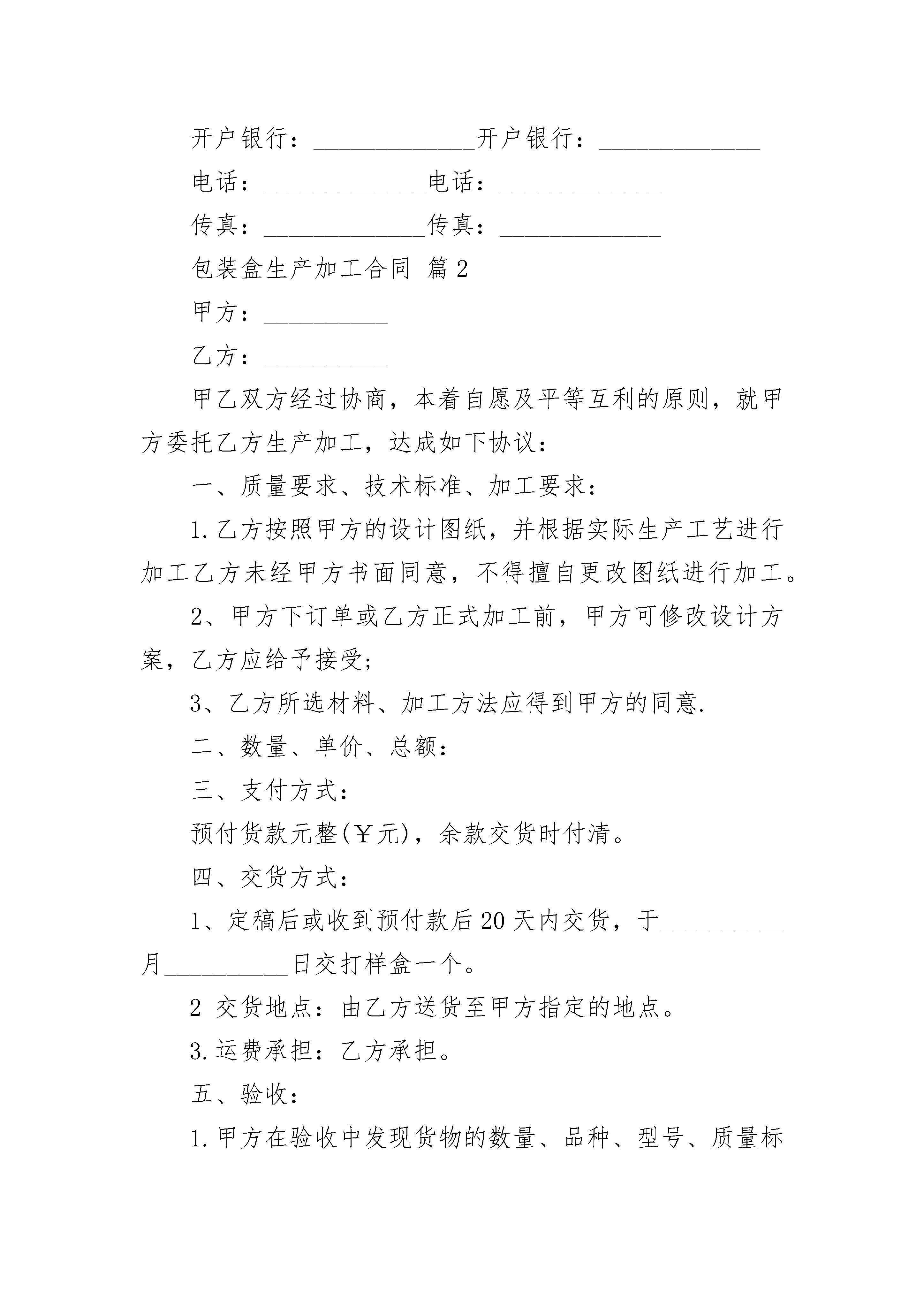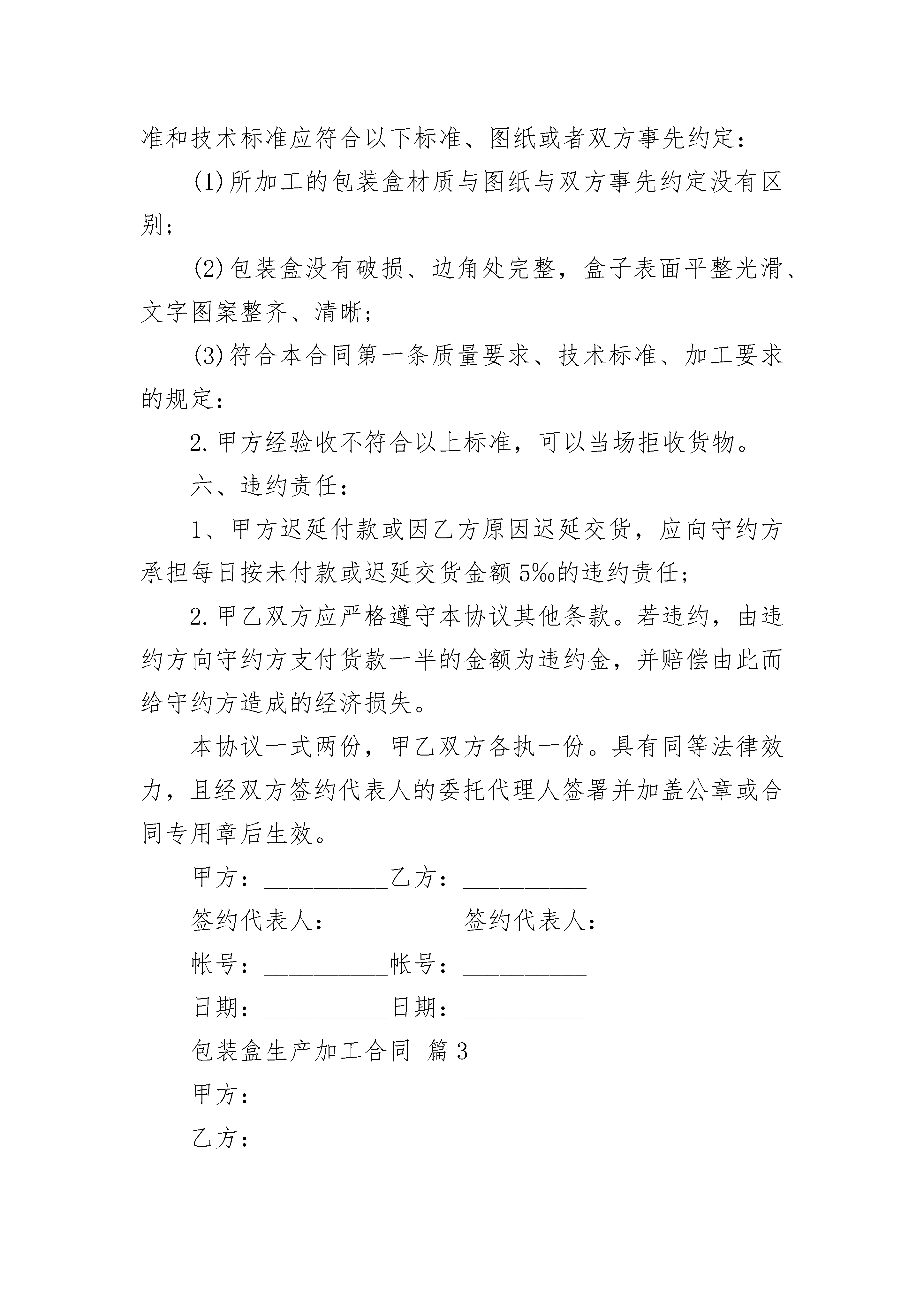 包装盒生产加工合同包装盒生产加工合同(精选3篇)包装盒生产加工合同篇1甲方:_____________签定时间:_____________乙方:_____________签订地点:_____________甲乙双方经过协商,本着自愿及平等互利的原则,就甲方委托乙方生产加工业务,达成如下协议:一、质量要求、技术标准、加工要求:1.乙方按照设计图纸,并根据实际生产工艺进行加工。图纸须由甲方签字盖章确认,乙方未经甲方书面同意,不得擅自更改图纸进行加工。2、甲方下订单或乙方正式加工前,甲方可修改设计方案,乙方应给予接受;3、乙方所选材料、加工方法应得到甲方的书面同意;二、数量、单价、总额:(精品)包装盒制作合同三、支付方式:1.乙方交货后经甲方验收无误后,当日付清所有款项,元(大写人民币元整)。2.乙方收到货款2个工作日内向甲方开出发票。四、交货方式1.交货时间:;2交货地点:;3.运费承担:乙方承担;五、验收:1.甲方在验收中发现货物的品种、型号、质量标准和技术标准应符合以下标准、图纸或者双方事先约定:(1)所加工的包装盒材质与图纸与双方事先约定没有区别;(2)包装盒没有破损、边角处完整,盒子表面平整光滑、文字图案整齐、清晰;(3)符合本合同第一条质量要求、技术标准、加工要求的规定:2.甲方经验收不符合以上标准,可以当场拒收货物。六、违约责任:1、甲方迟延付款或因乙方原因迟延交货,应向守约方承担每日按未付款或迟延交货金额5‰的违约责任;2.甲乙双方应严格遵守本协议其他条款。若违约,由违约方向守约方支付货款一半的金额为违约金,并赔偿由此而给守约方造成的经济损失。本协议一式两份。甲乙双方各执一份。具有同等法律效力,且经双方签约代表人的委托代理人签署并加盖公章或合同专用章后生效。甲方:_____________乙方:_____________签约代表人:_____________签约代表人:_____________帐号:_____________帐号:_____________开户银行:_____________开户银行:_____________电话:_____________电话:_____________传真:_____________传真:_____________包装盒生产加工合同篇2甲方:__________乙方:__________甲乙双方经过协商,本着自愿及平等互利的原则,就甲方委托乙方生产加工,达成如下协议:一、质量要求、技术标准、加工要求:1.乙方按照甲方的设计图纸,并根据实际生产工艺进行加工乙方未经甲方书面同意,不得擅自更改图纸进行加工。2、甲方下订单或乙方正式加工前,甲方可修改设计方案,乙方应给予接受;3、乙方所选材料、加工方法应得到甲方的同意.二、数量、单价、总额:三、支付方式:预付货款元整(¥元),余款交货时付清。四、交货方式:1、定稿后或收到预付款后20天内交货,于__________月__________日交打样盒一个。2交货地点:由乙方送货至甲方指定的地点。3.运费承担:乙方承担。五、验收:1.甲方在验收中发现货物的数量、品种、型号、质量标准和技术标准应符合以下标准、图纸或者双方事先约定:(1)所加工的包装盒材质与图纸与双方事先约定没有区别;(2)包装盒没有破损、边角处完整,盒子表面平整光滑、文字图案整齐、清晰;(3)符合本合同第一条质量要求、技术标准、加工要求的规定:2.甲方经验收不符合以上标准,可以当场拒收货物。六、违约责任:1、甲方迟延付款或因乙方原因迟延交货,应向守约方承担每日按未付款或迟延交货金额5‰的违约责任;2.甲乙双方应严格遵守本协议其他条款。若违约,由违约方向守约方支付货款一半的金额为违约金,并赔偿由此而给守约方造成的经济损失。本协议一式两份,甲乙双方各执一份。具有同等法律效力,且经双方签约代表人的委托代理人签署并加盖公章或合同专用章后生效。甲方:__________乙方:__________签约代表人:__________签约代表人:__________帐号:__________帐号:__________日期:__________日期:__________包装盒生产加工合同篇3甲方:乙方:为了拓展市场,因甲方生产规模不能满足市场需求,甲方委托乙方为甲方加工生产产品,协议如下:一、由甲、乙方提供具有法律效力的相关手续,签订委托生产加工合同,在当地主管部门备案。二、由甲方提供主要原材料及包装物,乙方采购的材料质量必须符合国家及企业相应标准要求。价格双方协定。费用由甲方按数量价格同时结算。三、乙方未经甲方同意,不得生产与甲方近似产品。四、产品品种数量根据市场情况以销定产。生产计划按甲方派驻的人员确定生产。为减少运费、降低成本,经甲方电话或书面委托,在甲方人员监督下,乙方按甲方指定地域帮