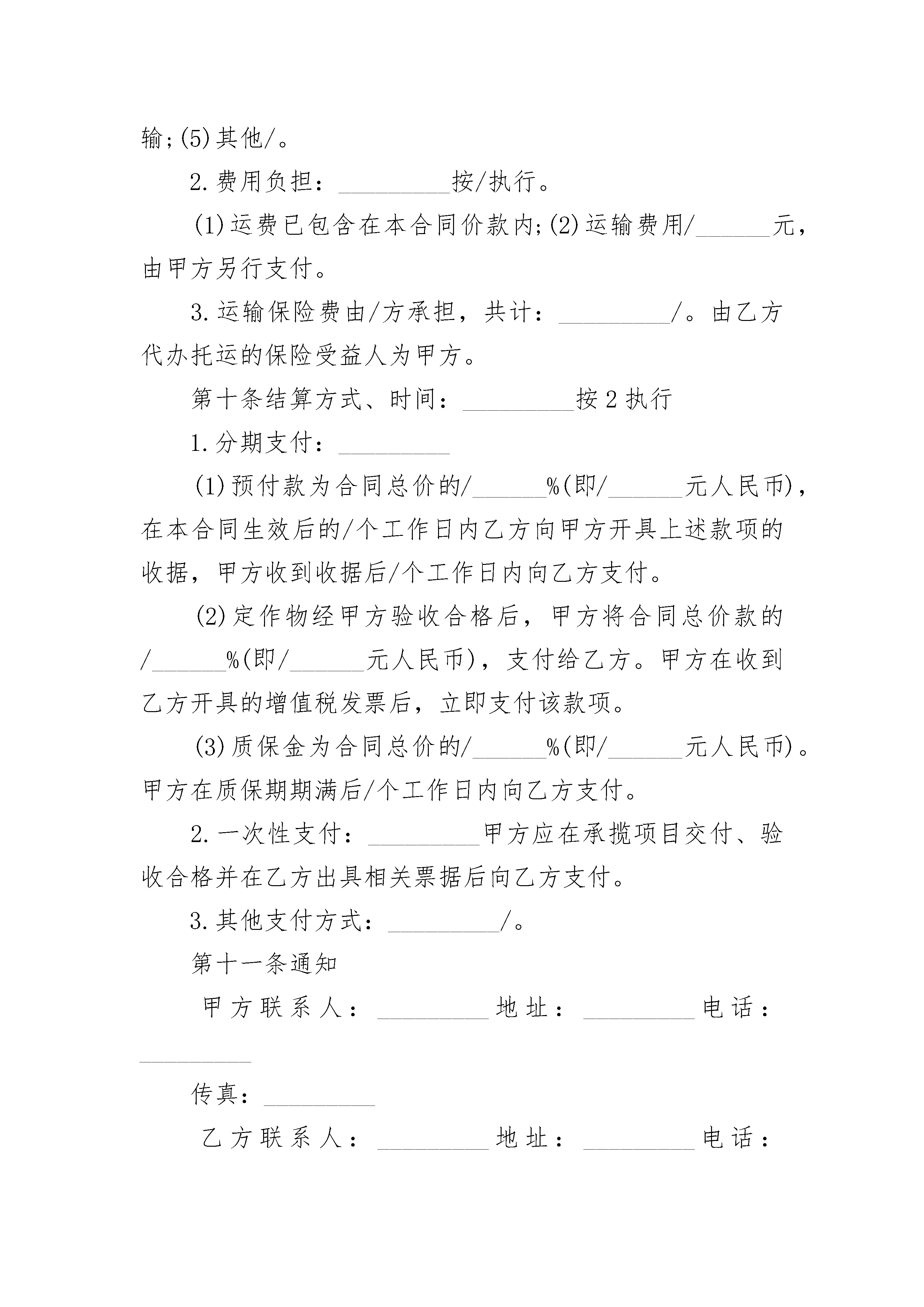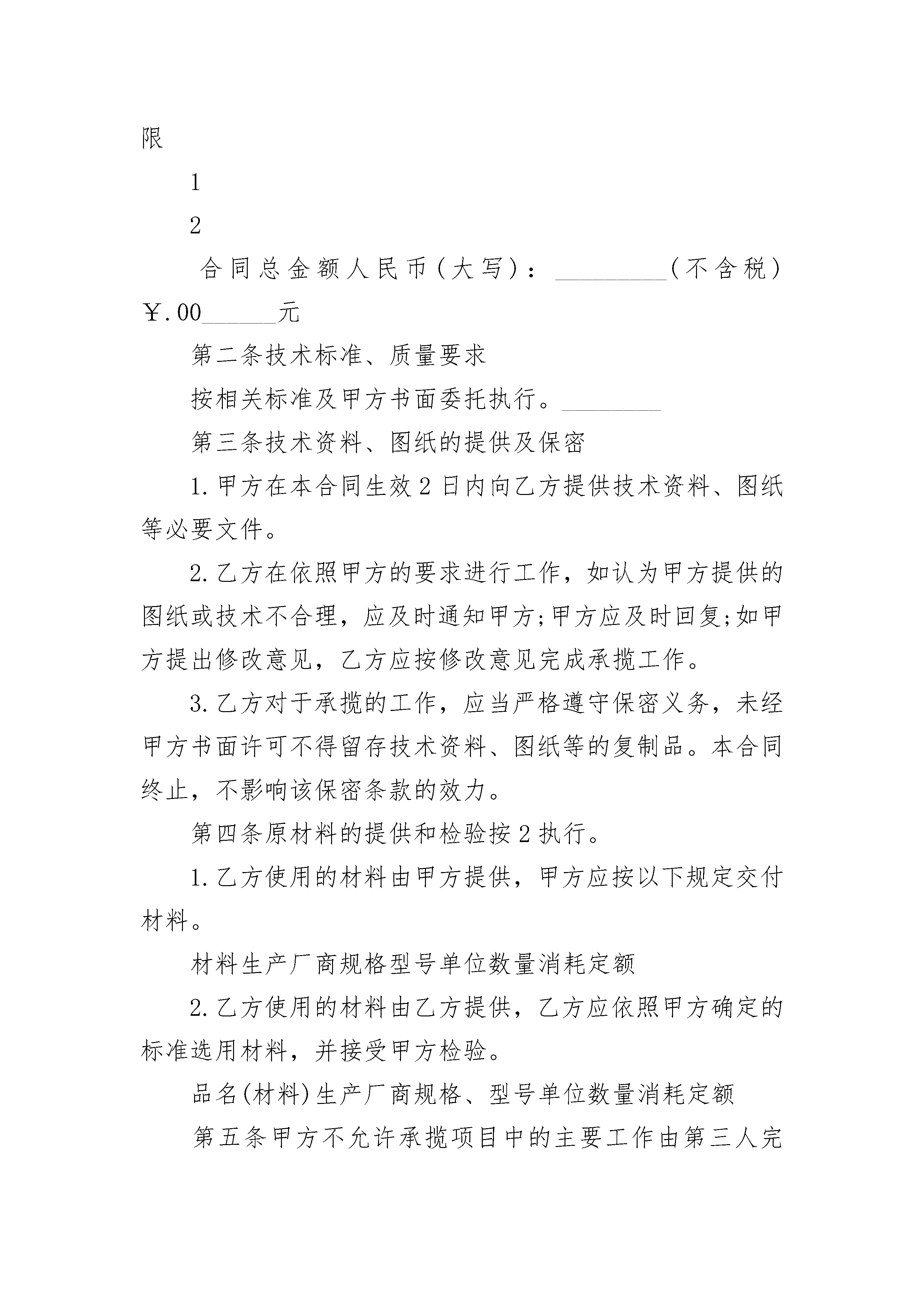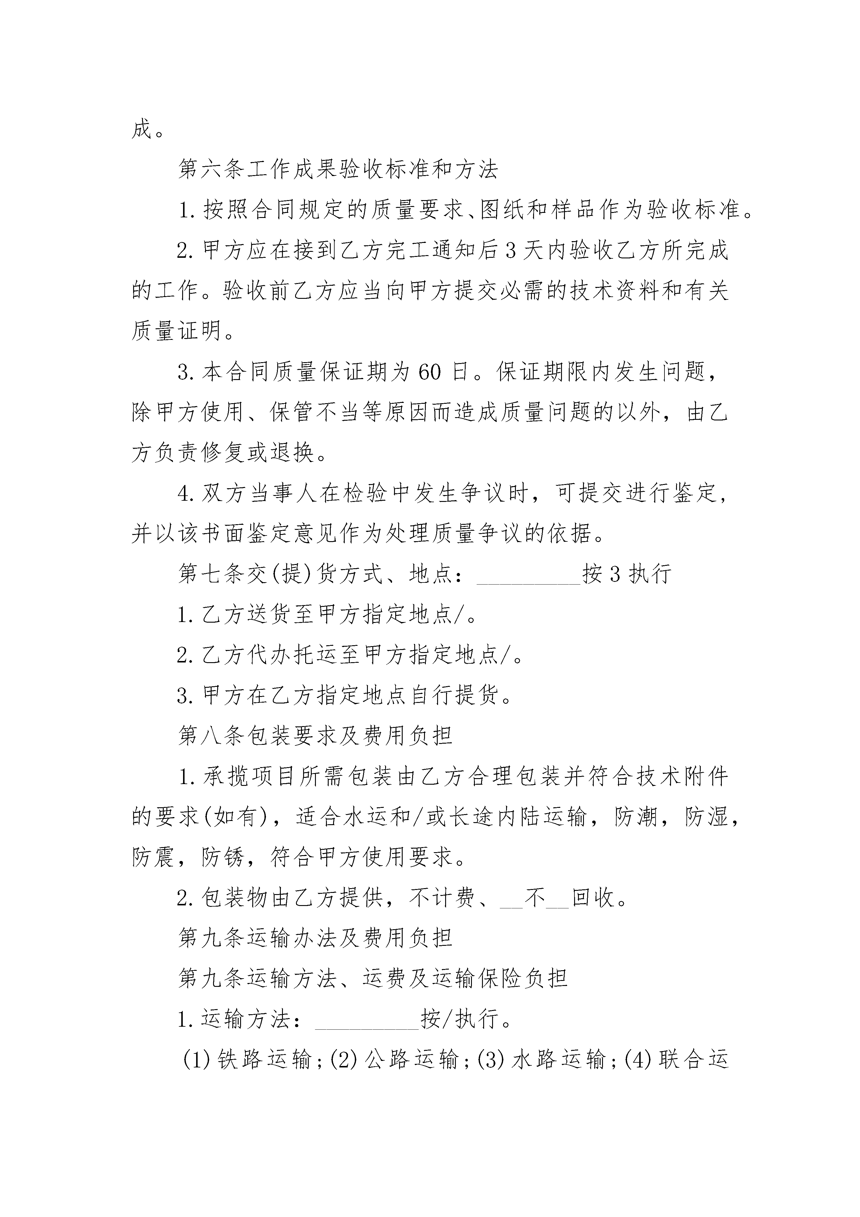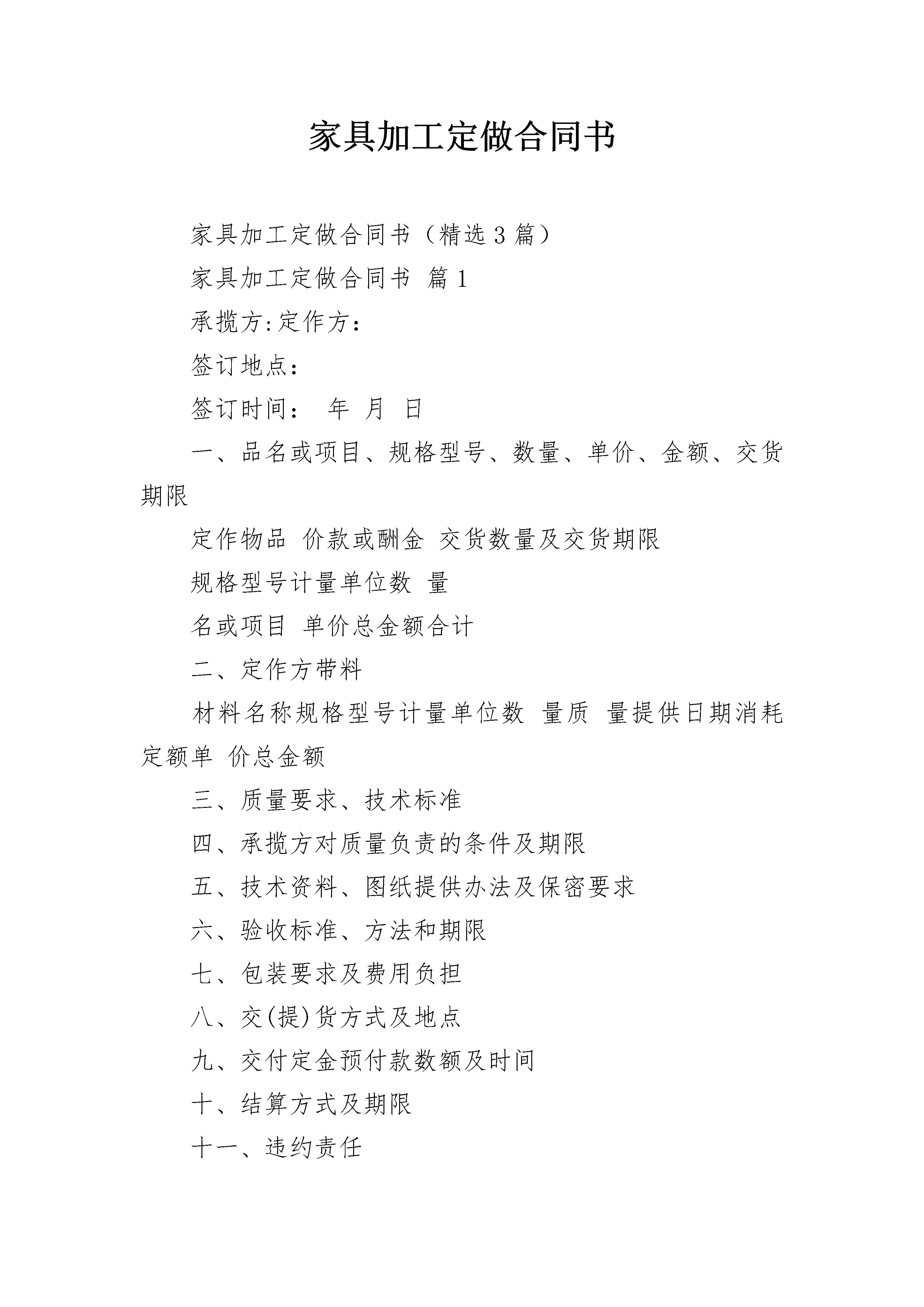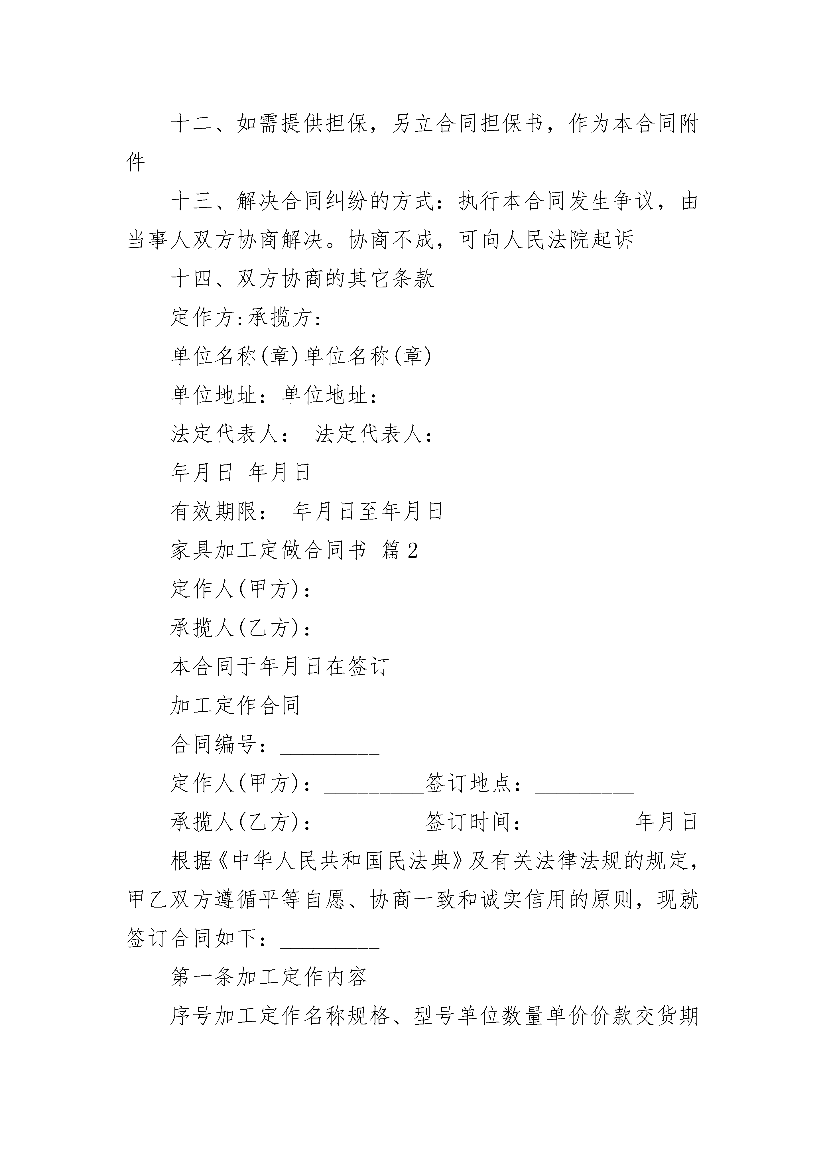 家具加工定做合同书家具加工定做合同书(精选3篇)家具加工定做合同书篇1承揽方:定作方:签订地点:签订时间:年月日一、品名或项目、规格型号、数量、单价、金额、交货期限定作物品价款或酬金交货数量及交货期限规格型号计量单位数量名或项目单价总金额合计二、定作方带料材料名称规格型号计量单位数量质量提供日期消耗定额单价总金额三、质量要求、技术标准四、承揽方对质量负责的条件及期限五、技术资料、图纸提供办法及保密要求六、验收标准、方法和期限七、包装要求及费用负担八、交(提)货方式及地点九、交付定金预付款数额及时间十、结算方式及期限十一、违约责任十二、如需提供担保,另立合同担保书,作为本合同附件十三、解决合同纠纷的方式:执行本合同发生争议,由当事人双方协商解决。协商不成,可向人民法院起诉十四、双方协商的其它条款定作方:承揽方:单位名称(章)单位名称(章)单位地址:单位地址:法定代表人:法定代表人:年月日年月日有效期限:年月日至年月日家具加工定做合同书篇2定作人(甲方):_________承揽人(乙方):_________本合同于年月日在签订加工定作合同合同编号:_________定作人(甲方):_________签订地点:_________承揽人(乙方):_________签订时间:_________年月日根据《中华人民共和国民法典》及有关法律法规的规定,甲乙双方遵循平等自愿、协商一致和诚实信用的原则,现就签订合同如下:_________第一条加工定作内容序号加工定作名称规格、型号单位数量单价价款交货期限12合同总金额人民币(大写):_________(不含税)¥.00______元第二条技术标准、质量要求按相关标准及甲方书面委托执行。________第三条技术资料、图纸的提供及保密1.甲方在本合同生效2日内向乙方提供技术资料、图纸等必要文件。2.乙方在依照甲方的要求进行工作,如认为甲方提供的图纸或技术不合理,应及时通知甲方;甲方应及时回复;如甲方提出修改意见,乙方应按修改意见完成承揽工作。3.乙方对于承揽的工作,应当严格遵守保密义务,未经甲方书面许可不得留存技术资料、图纸等的复制品。本合同终止,不影响该保密条款的效力。第四条原材料的提供和检验按2执行。1.乙方使用的材料由甲方提供,甲方应按以下规定交付材料。材料生产厂商规格型号单位数量消耗定额2.乙方使用的材料由乙方提供,乙方应依照甲方确定的标准选用材料,并接受甲方检验。品名(材料)生产厂商规格、型号单位数量消耗定额第五条甲方不允许承揽项目中的主要工作由第三人完成。第六条工作成果验收标准和方法1.按照合同规定的质量要求、图纸和样品作为验收标准。2.甲方应在接到乙方完工通知后3天内验收乙方所完成的工作。验收前乙方应当向甲方提交必需的技术资料和有关质量证明。3.本合同质量保证期为60日。保证期限内发生问题,除甲方使用、保管不当等原因而造成质量问题的以外,由乙方负责修复或退换。4.双方当事人在检验中发生争议时,可提交进行鉴定,并以该书面鉴定意见作为处理质量争议的依据。第七条交(提)货方式、地点:_________按3执行1.乙方送货至甲方指定地点/。2.乙方代办托运至甲方指定地点/。3.甲方在乙方指定地点自行提货。第八条包装要求及费用负担1.承揽项目所需包装由乙方合理包装并符合技术附件的要求(如有),适合水运和/或长途内陆运输,防潮,防湿,防震,防锈,符合甲方使用要求。2.包装物由乙方提供,不计费、__不__回收。第九条运输办法及费用负担第九条运输方法、运费及运输保险负担1.运输方法:_________按/执行。(1)铁路运输;(2)公路运输;(3)水路运输;(4)联合运输;(5)其他/。2.费用负担:_________按/执行。(1)运费已包含在本合同价款内;(2)运输费用/______元,由甲方另行支付。3.运输保险费由/方承担,共计:_________/。由乙方代办托运的保险受益人为甲方。第十条结算方式、时间:_________按2执行1.分期支付:_________(1)预付款为合同总价的/______%(即/______元人民币),在本合同生效后的/个工作日内乙方向甲方开具上述款项的收据,甲方收到收据后/个工作日内向乙方支付。(2)定作物经甲方验收合格后,甲方将合同总价款的/______%(即/______元人民币),支付给乙方。甲方在收到乙方开具的增值税发票后,立即支付该款项。(3)质保金为合同总价的/______%(即/______元人民币)。甲方在质保期期满后/个工作日内向乙方支付。2.一次性支付:_________甲方应在承揽项目交付、验收合格并在乙方出具相关票据后向乙方支付。3.其他支付方式:_________/。第十一条通知甲方联系人:_________地址:_______