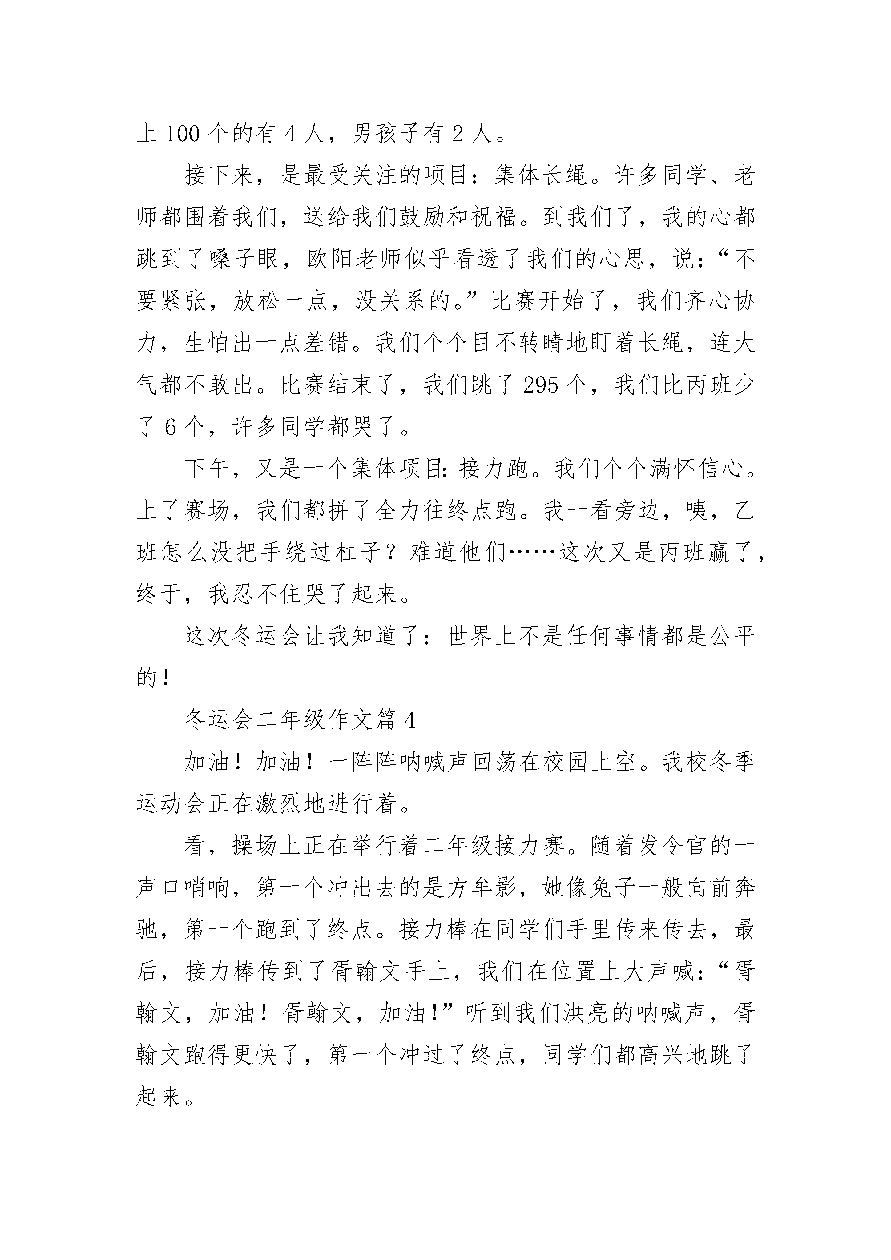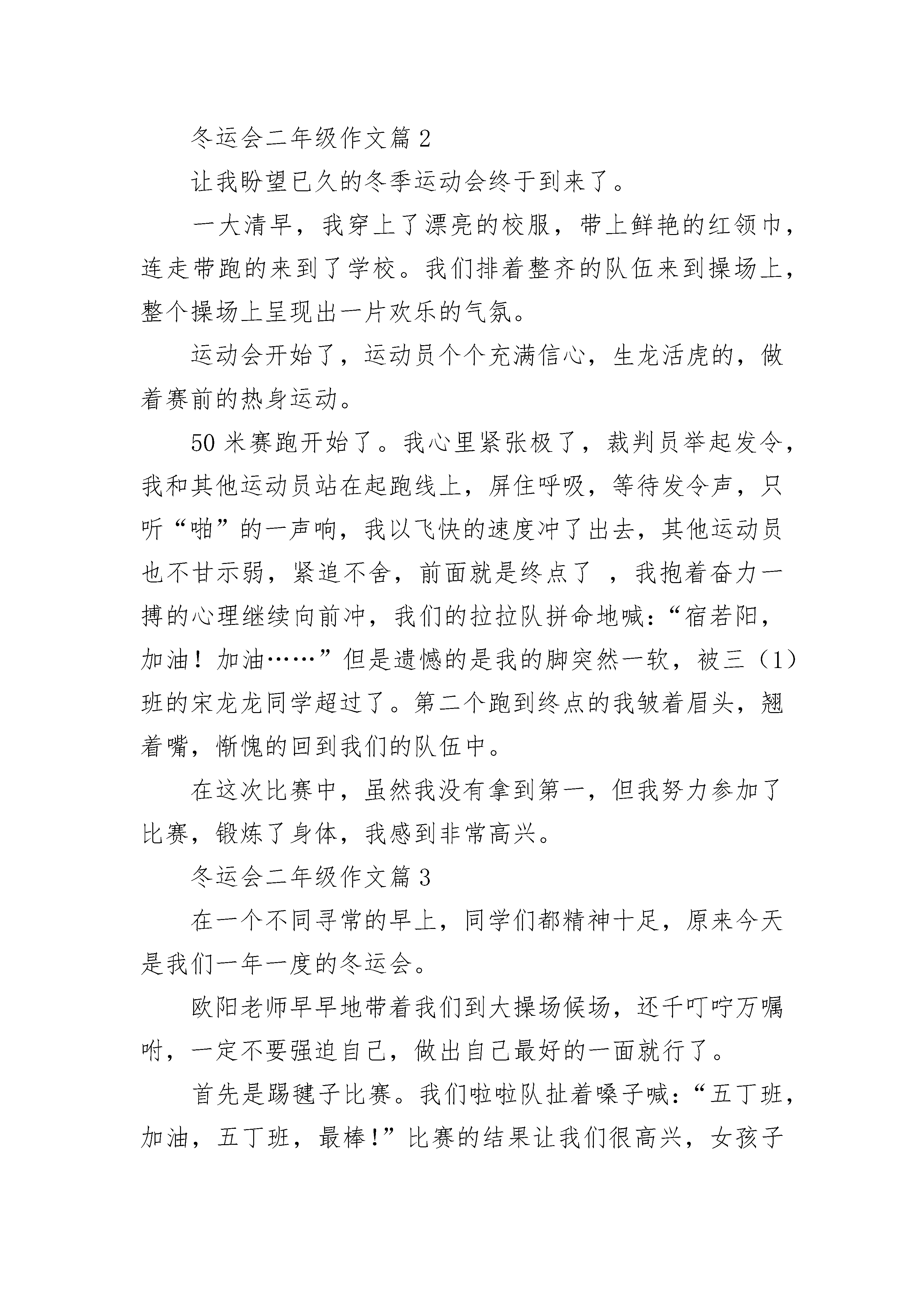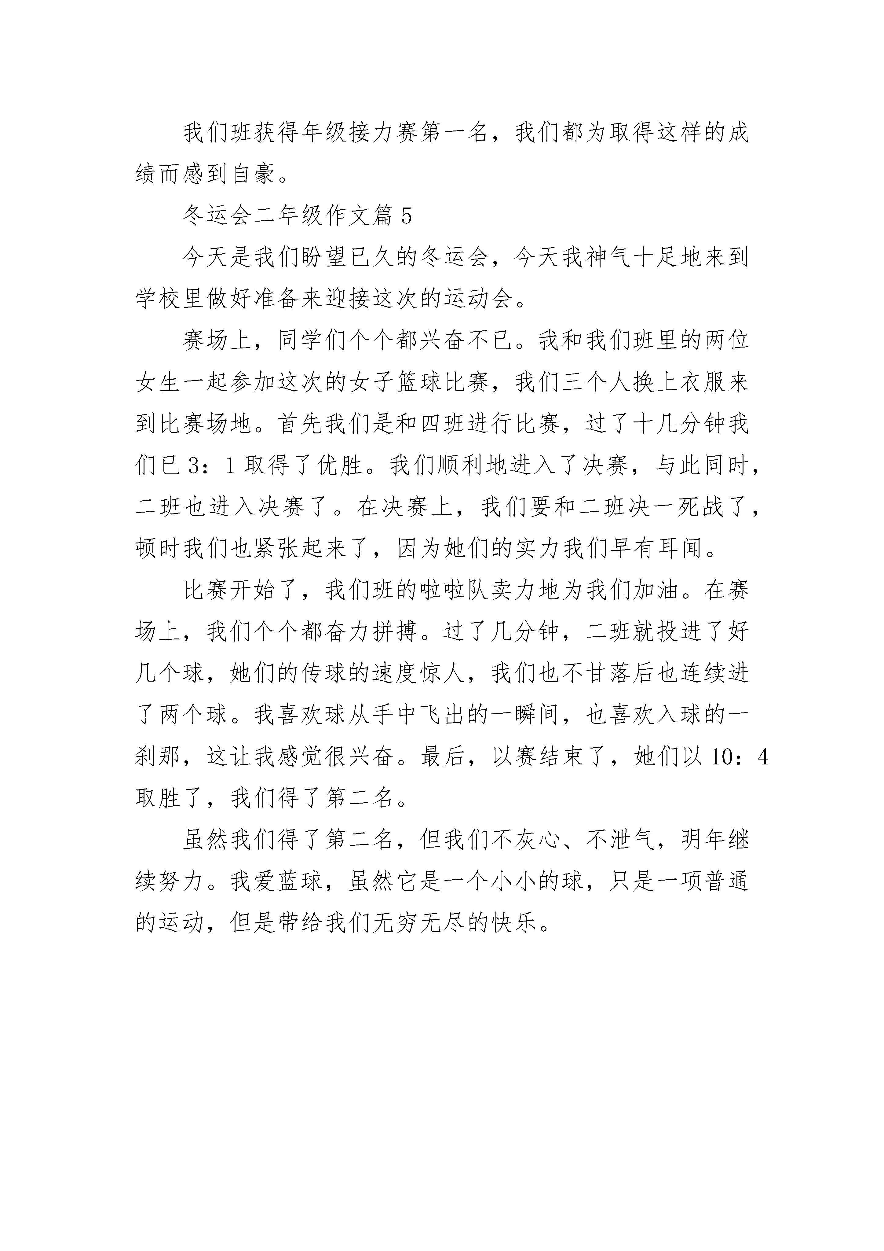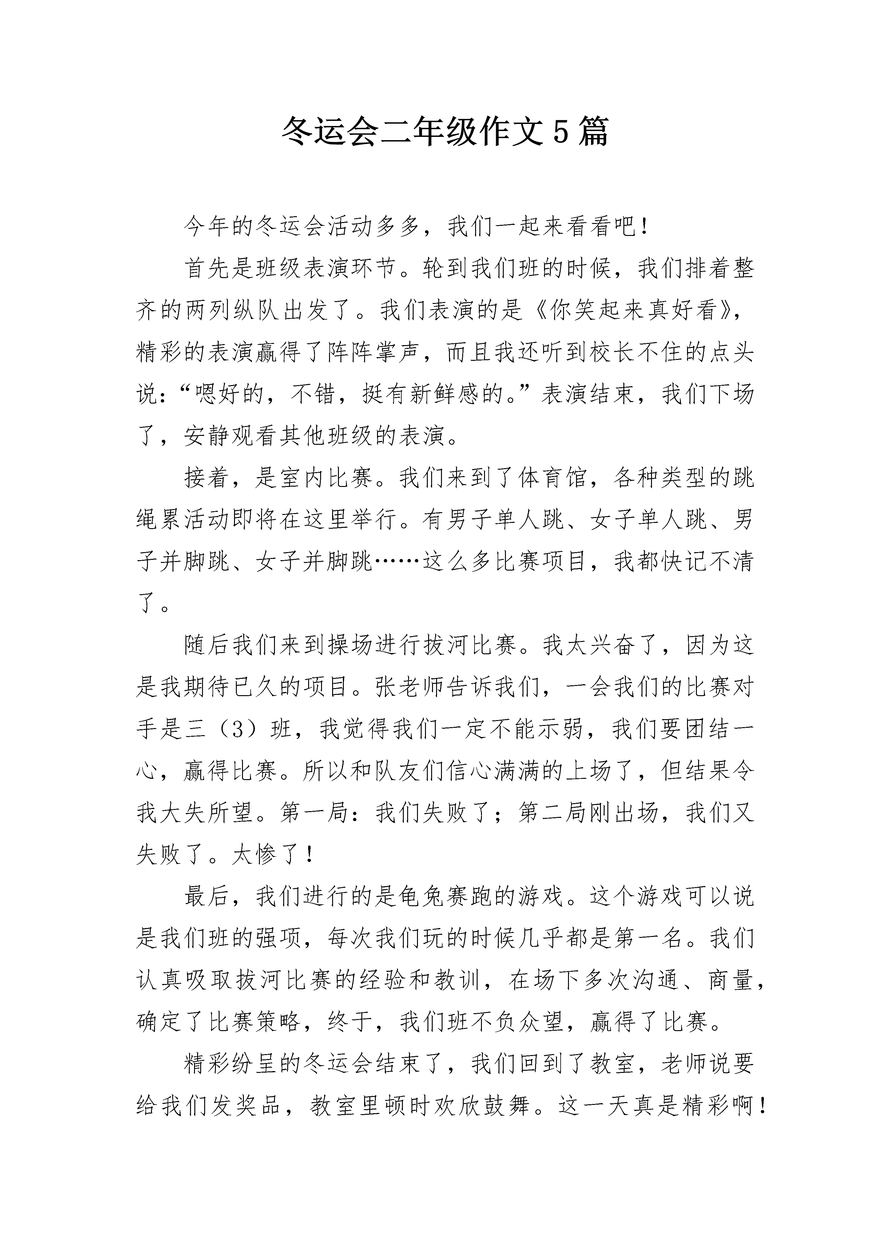 冬运会二年级作文5篇今年的冬运会活动多多,我们一起来看看吧!首先是班级表演环节。轮到我们班的时候,我们排着整齐的两列纵队出发了。我们表演的是《你笑起来真好看》,精彩的表演赢得了阵阵掌声,而且我还听到校长不住的点头说:“嗯好的,不错,挺有新鲜感的。”表演结束,我们下场了,安静观看其他班级的表演。接着,是室内比赛。我们来到了体育馆,各种类型的跳绳累活动即将在这里举行。有男子单人跳、女子单人跳、男子并脚跳、女子并脚跳……这么多比赛项目,我都快记不清了。随后我们来到操场进行拔河比赛。我太兴奋了,因为这是我期待已久的项目。张老师告诉我们,一会我们的比赛对手是三(3)班,我觉得我们一定不能示弱,我们要团结一心,赢得比赛。所以和队友们信心满满的上场了,但结果令我大失所望。第一局:我们失败了;第二局刚出场,我们又失败了。太惨了!最后,我们进行的是龟兔赛跑的游戏。这个游戏可以说是我们班的强项,每次我们玩的时候几乎都是第一名。我们认真吸取拔河比赛的经验和教训,在场下多次沟通、商量,确定了比赛策略,终于,我们班不负众望,赢得了比赛。精彩纷呈的冬运会结束了,我们回到了教室,老师说要给我们发奖品,教室里顿时欢欣鼓舞。这一天真是精彩啊!冬运会二年级作文篇2让我盼望已久的冬季运动会终于到来了。一大清早,我穿上了漂亮的校服,带上鲜艳的红领巾,连走带跑的来到了学校。我们排着整齐的队伍来到操场上,整个操场上呈现出一片欢乐的气氛。运动会开始了,运动员个个充满信心,生龙活虎的,做着赛前的热身运动。50米赛跑开始了。我心里紧张极了,裁判员举起发令,我和其他运动员站在起跑线上,屏住呼吸,等待发令声,只听“啪”的一声响,我以飞快的速度冲了出去,其他运动员也不甘示弱,紧追不舍,前面就是终点了,我抱着奋力一搏的心理继续向前冲,我们的拉拉队拼命地喊:“宿若阳,加油!加油……”但是遗憾的是我的脚突然一软,被三(1)班的宋龙龙同学超过了。第二个跑到终点的我皱着眉头,翘着嘴,惭愧的回到我们的队伍中。在这次比赛中,虽然我没有拿到第一,但我努力参加了比赛,锻炼了身体,我感到非常高兴。冬运会二年级作文篇3在一个不同寻常的早上,同学们都精神十足,原来今天是我们一年一度的冬运会。欧阳老师早早地带着我们到大操场候场,还千叮咛万嘱咐,一定不要强迫自己,做出自己最好的一面就行了。首先是踢毽子比赛。我们啦啦队扯着嗓子喊:“五丁班,加油,五丁班,最棒!”比赛的结果让我们很高兴,女孩子上100个的有4人,男孩子有2人。接下来,是最受关注的项目:集体长绳。许多同学、老师都围着我们,送给我们鼓励和祝福。到我们了,我的心都跳到了嗓子眼,欧阳老师似乎看透了我们的心思,说:“不要紧张,放松一点,没关系的。”比赛开始了,我们齐心协力,生怕出一点差错。我们个个目不转睛地盯着长绳,连大气都不敢出。比赛结束了,我们跳了295个,我们比丙班少了6个,许多同学都哭了。下午,又是一个集体项目:接力跑。我们个个满怀信心。上了赛场,我们都拼了全力往终点跑。我一看旁边,咦,乙班怎么没把手绕过杠子?难道他们……这次又是丙班赢了,终于,我忍不住哭了起来。这次冬运会让我知道了:世界上不是任何事情都是公平的!冬运会二年级作文篇4加油!加油!一阵阵呐喊声回荡在校园上空。我校冬季运动会正在激烈地进行着。看,操场上正在举行着二年级接力赛。随着发令官的一声口哨响,第一个冲出去的是方牟影,她像兔子一般向前奔驰,第一个跑到了终点。接力棒在同学们手里传来传去,最后,接力棒传到了胥翰文手上,我们在位置上大声喊:“胥翰文,加油!胥翰文,加油!”听到我们洪亮的呐喊声,胥翰文跑得更快了,第一个冲过了终点,同学们都高兴地跳了起来。我们班获得年级接力赛第一名,我们都为取得这样的成绩而感到自豪。冬运会二年级作文篇5今天是我们盼望已久的冬运会,今天我神气十足地来到学校里做好准备来迎接这次的运动会。赛场上,同学们个个都兴奋不已。我和我们班里的两位女生一起参加这次的女子篮球比赛,我们三个人换上衣服来到比赛场地。首先我们是和四班进行比赛,过了十几分钟我们已3:1取得了优胜。我们顺利地进入了决赛,与此同时,二班也进入决赛了。在决赛上,我们要和二班决一死战了,顿时我们也紧张起来了,因为她们的实力我们早有耳闻。比赛开始了,我们班的啦啦队卖力地为我们加油。在赛场上,我们个个都奋力拼搏。过了几分钟,二班就投进了好几个球,她们的传球的速度惊人,我们也不甘落后也连续进了两个球。我喜欢球从手中飞出的一瞬间,也喜欢入球的一刹那,这让我感觉很兴奋。最后,以赛结束了,她们以10:4取胜了,我们得了第二名。虽然我们得了第二名,但我们不灰心、不泄气,明年继续努力。我爱蓝球,虽然它是一个小小的球,只是一项普通的运动,但是带给我们无穷无尽的快乐。