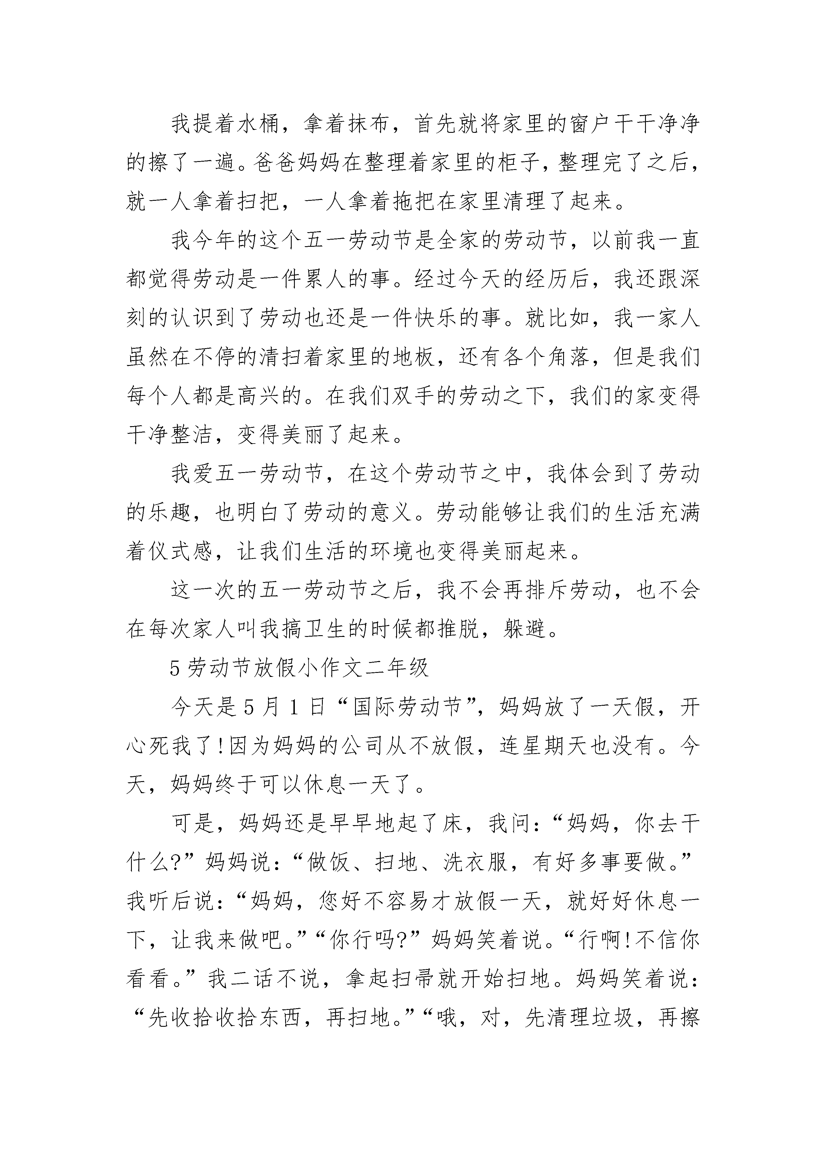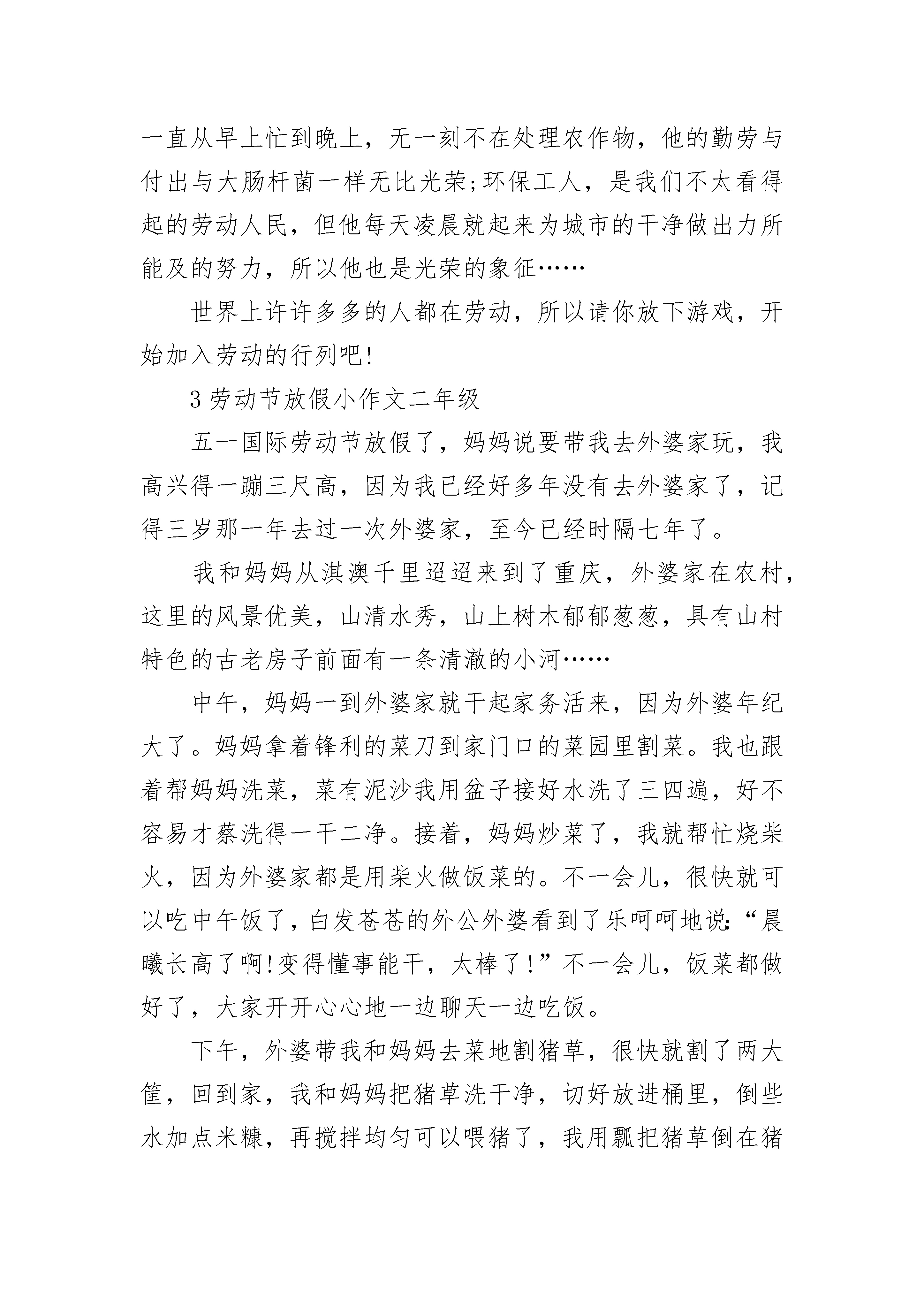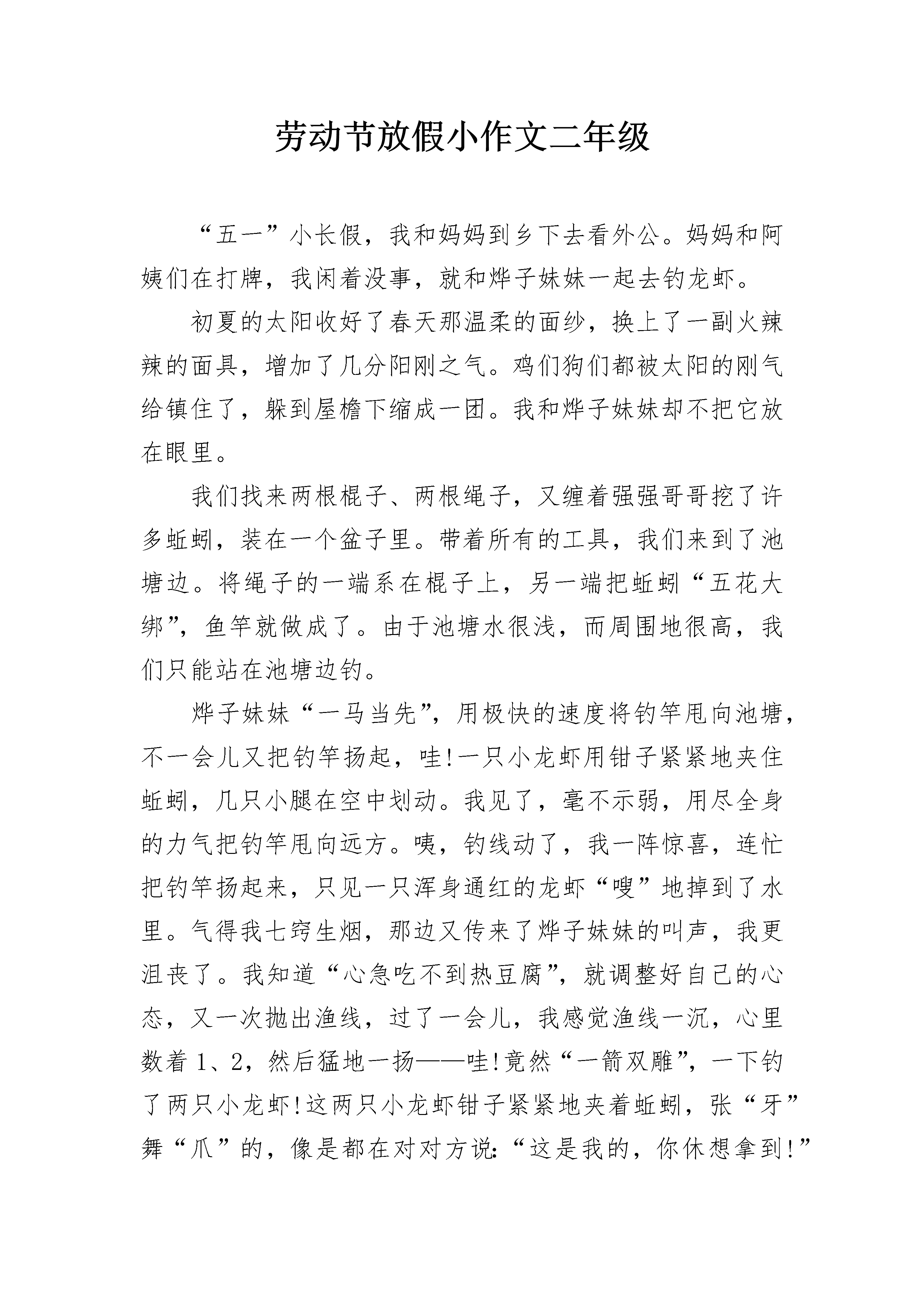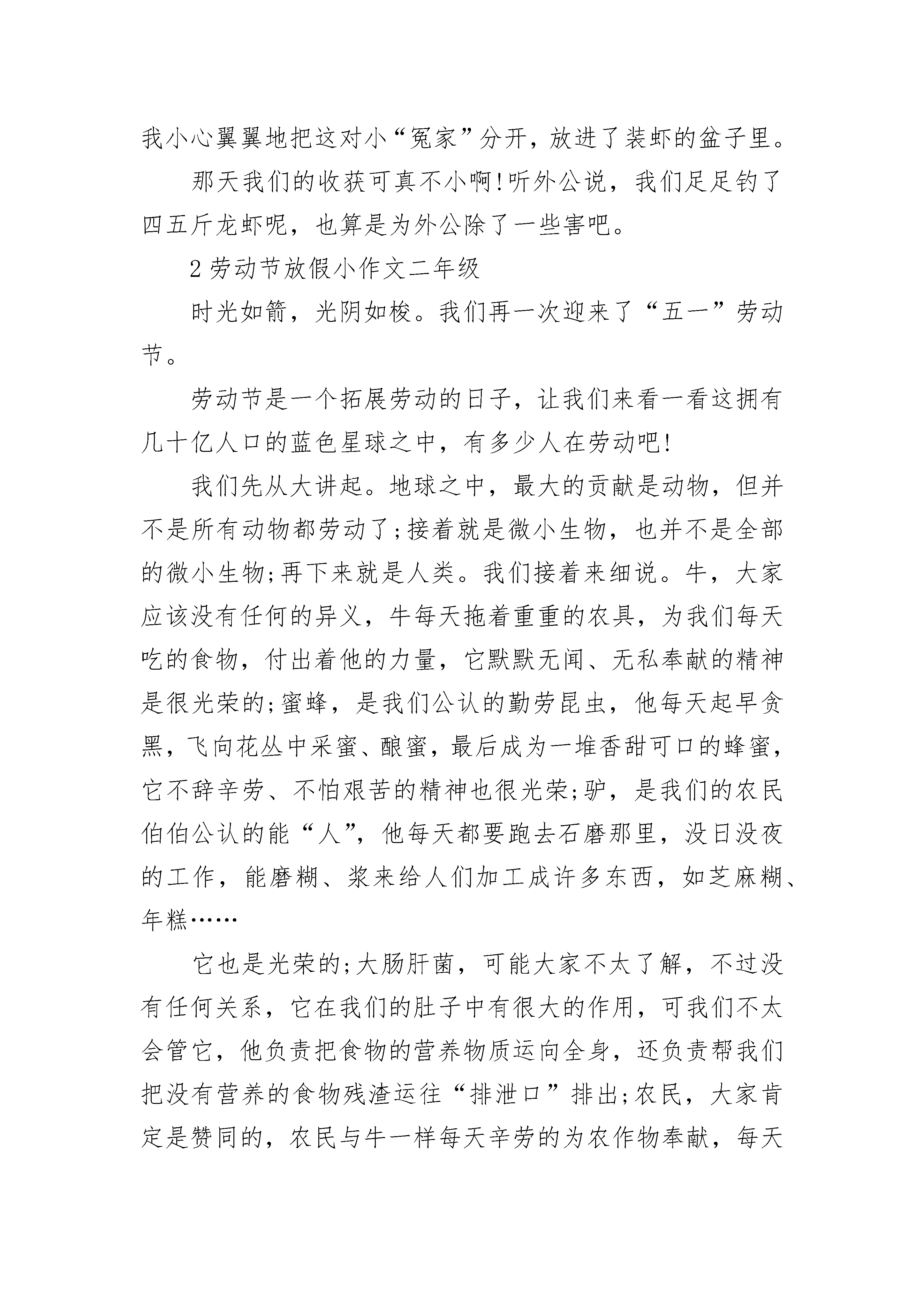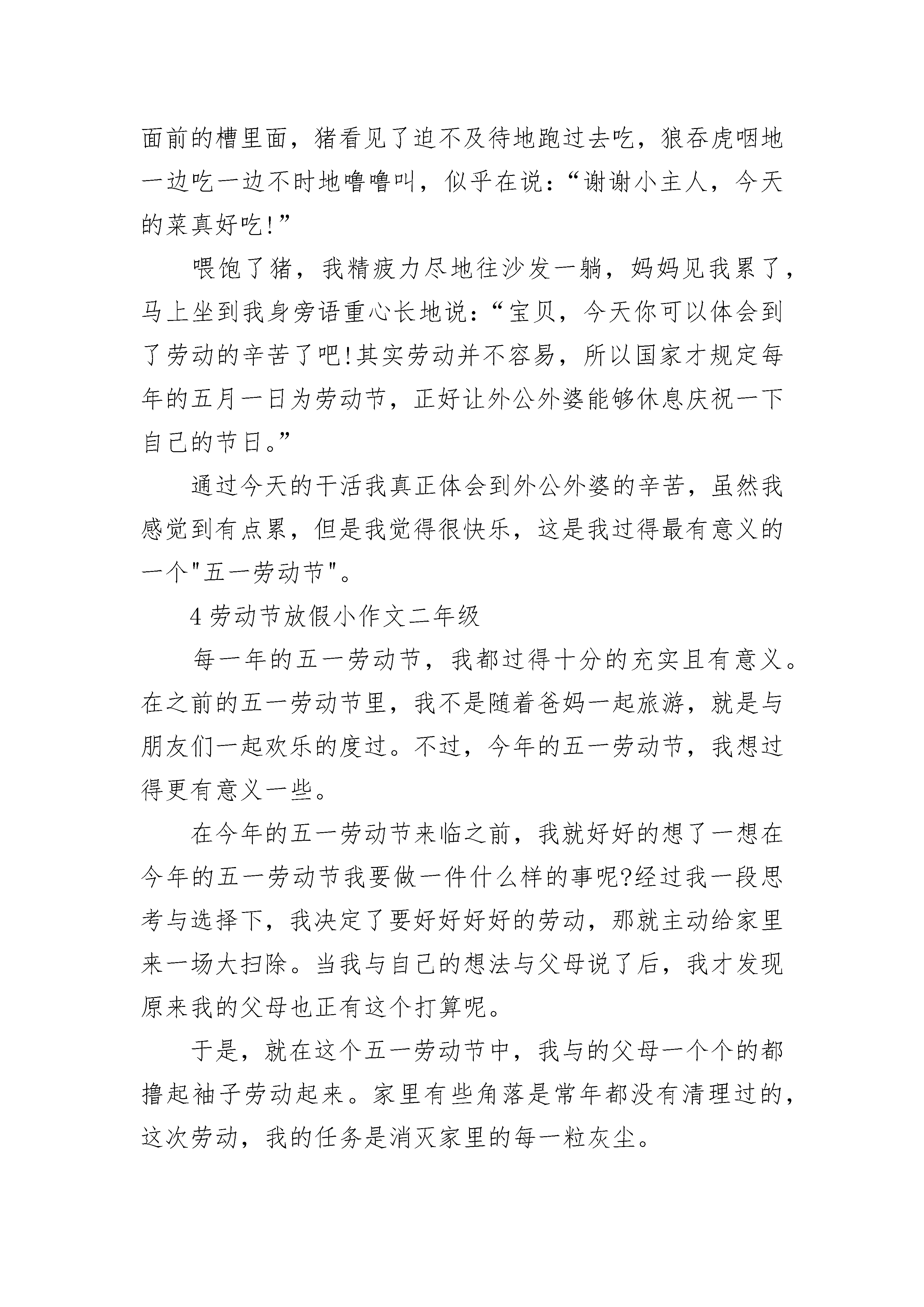 劳动节放假小作文二年级“五一”小长假,我和妈妈到乡下去看外公。妈妈和阿姨们在打牌,我闲着没事,就和烨子妹妹一起去钓龙虾。初夏的太阳收好了春天那温柔的面纱,换上了一副火辣辣的面具,增加了几分阳刚之气。鸡们狗们都被太阳的刚气给镇住了,躲到屋檐下缩成一团。我和烨子妹妹却不把它放在眼里。我们找来两根棍子、两根绳子,又缠着强强哥哥挖了许多蚯蚓,装在一个盆子里。带着所有的工具,我们来到了池塘边。将绳子的一端系在棍子上,另一端把蚯蚓“五花大绑”,鱼竿就做成了。由于池塘水很浅,而周围地很高,我们只能站在池塘边钓。烨子妹妹“一马当先”,用极快的速度将钓竿甩向池塘,不一会儿又把钓竿扬起,哇!一只小龙虾用钳子紧紧地夹住蚯蚓,几只小腿在空中划动。我见了,毫不示弱,用尽全身的力气把钓竿甩向远方。咦,钓线动了,我一阵惊喜,连忙把钓竿扬起来,只见一只浑身通红的龙虾“嗖”地掉到了水里。气得我七窍生烟,那边又传来了烨子妹妹的叫声,我更沮丧了。我知道“心急吃不到热豆腐”,就调整好自己的心态,又一次抛出渔线,过了一会儿,我感觉渔线一沉,心里数着1、2,然后猛地一扬——哇!竟然“一箭双雕”,一下钓了两只小龙虾!这两只小龙虾钳子紧紧地夹着蚯蚓,张“牙”舞“爪”的,像是都在对对方说:“这是我的,你休想拿到!”我小心翼翼地把这对小“冤家”分开,放进了装虾的盆子里。那天我们的收获可真不小啊!听外公说,我们足足钓了四五斤龙虾呢,也算是为外公除了一些害吧。2劳动节放假小作文二年级时光如箭,光阴如梭。我们再一次迎来了“五一”劳动节。劳动节是一个拓展劳动的日子,让我们来看一看这拥有几十亿人口的蓝色星球之中,有多少人在劳动吧!我们先从大讲起。地球之中,最大的贡献是动物,但并不是所有动物都劳动了;接着就是微小生物,也并不是全部的微小生物;再下来就是人类。我们接着来细说。牛,大家应该没有任何的异义,牛每天拖着重重的农具,为我们每天吃的食物,付出着他的力量,它默默无闻、无私奉献的精神是很光荣的;蜜蜂,是我们公认的勤劳昆虫,他每天起早贪黑,飞向花丛中采蜜、酿蜜,最后成为一堆香甜可口的蜂蜜,它不辞辛劳、不怕艰苦的精神也很光荣;驴,是我们的农民伯伯公认的能“人”,他每天都要跑去石磨那里,没日没夜的工作,能磨糊、浆来给人们加工成许多东西,如芝麻糊、年糕……它也是光荣的;大肠肝菌,可能大家不太了解,不过没有任何关系,它在我们的肚子中有很大的作用,可我们不太会管它,他负责把食物的营养物质运向全身,还负责帮我们把没有营养的食物残渣运往“排泄口”排出;农民,大家肯定是赞同的,农民与牛一样每天辛劳的为农作物奉献,每天一直从早上忙到晚上,无一刻不在处理农作物,他的勤劳与付出与大肠杆菌一样无比光荣;环保工人,是我们不太看得起的劳动人民,但他每天凌晨就起来为城市的干净做出力所能及的努力,所以他也是光荣的象征……世界上许许多多的人都在劳动,所以请你放下游戏,开始加入劳动的行列吧!3劳动节放假小作文二年级五一国际劳动节放假了,妈妈说要带我去外婆家玩,我高兴得一蹦三尺高,因为我已经好多年没有去外婆家了,记得三岁那一年去过一次外婆家,至今已经时隔七年了。我和妈妈从淇澳千里迢迢来到了重庆,外婆家在农村,这里的风景优美,山清水秀,山上树木郁郁葱葱,具有山村特色的古老房子前面有一条清澈的小河……中午,妈妈一到外婆家就干起家务活来,因为外婆年纪大了。妈妈拿着锋利的菜刀到家门口的菜园里割菜。我也跟着帮妈妈洗菜,菜有泥沙我用盆子接好水洗了三四遍,好不容易才蔡洗得一干二净。接着,妈妈炒菜了,我就帮忙烧柴火,因为外婆家都是用柴火做饭菜的。不一会儿,很快就可以吃中午饭了,白发苍苍的外公外婆看到了乐呵呵地说:“晨曦长高了啊!变得懂事能干,太棒了!”不一会儿,饭菜都做好了,大家开开心心地一边聊天一边吃饭。下午,外婆带我和妈妈去菜地割猪草,很快就割了两大筐,回到家,我和妈妈把猪草洗干净,切好放进桶里,倒些水加点米糠,再搅拌均匀可以喂猪了,我用瓢把猪草倒在猪面前的槽里面,猪看见了迫不及待地跑过去吃,狼吞虎咽地一边吃一边不时地噜噜叫,似乎在说:“谢谢小主人,今天的菜真好吃!”喂饱了猪,我精疲力尽地往沙发一躺,妈妈见我累了,马上坐到我身旁语重心长地说:“宝贝,今天你可以体会到了劳动的辛苦了吧!其实劳动并不容易,所以国家才规定每年的五月一日为劳动节,正好让外公外婆能够休息庆祝一下自己的节日。”通过今天的干活我真正体会到外公外婆的辛苦,虽然我感觉到有点累,但是我觉得很快乐,这是我过得最有意义的一个"五一劳动节"。4劳动节放假小作文二年级每一年的五一劳动节,我都过得十分的充实且有意义。在之前的五一劳动节里,我不是随着爸妈一起旅游,就是与朋友们一起欢乐的度过。不过,今年的五一劳动节,我想过得更有意义一些。在今年的五一劳动节来临之前,我就好好的想了一想在今