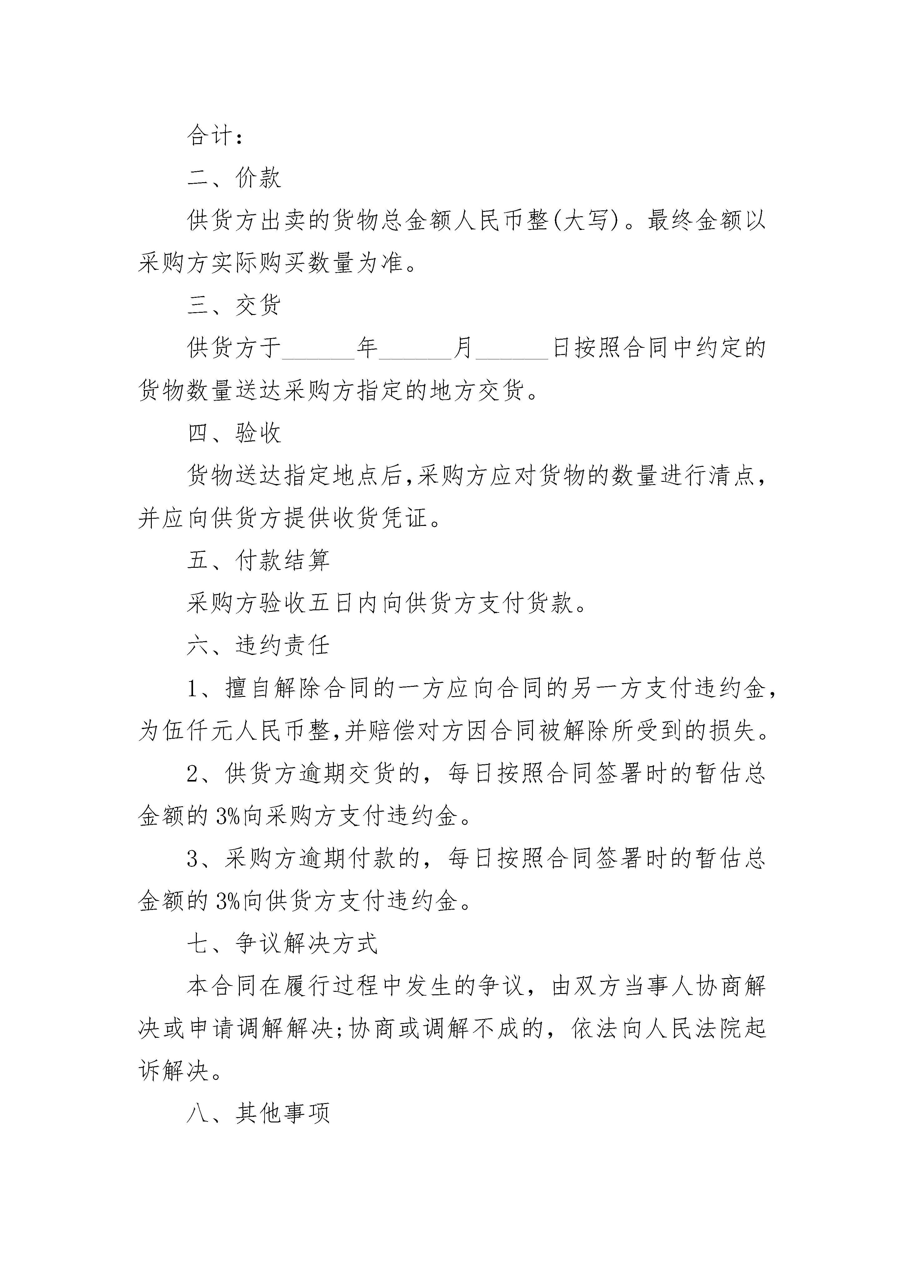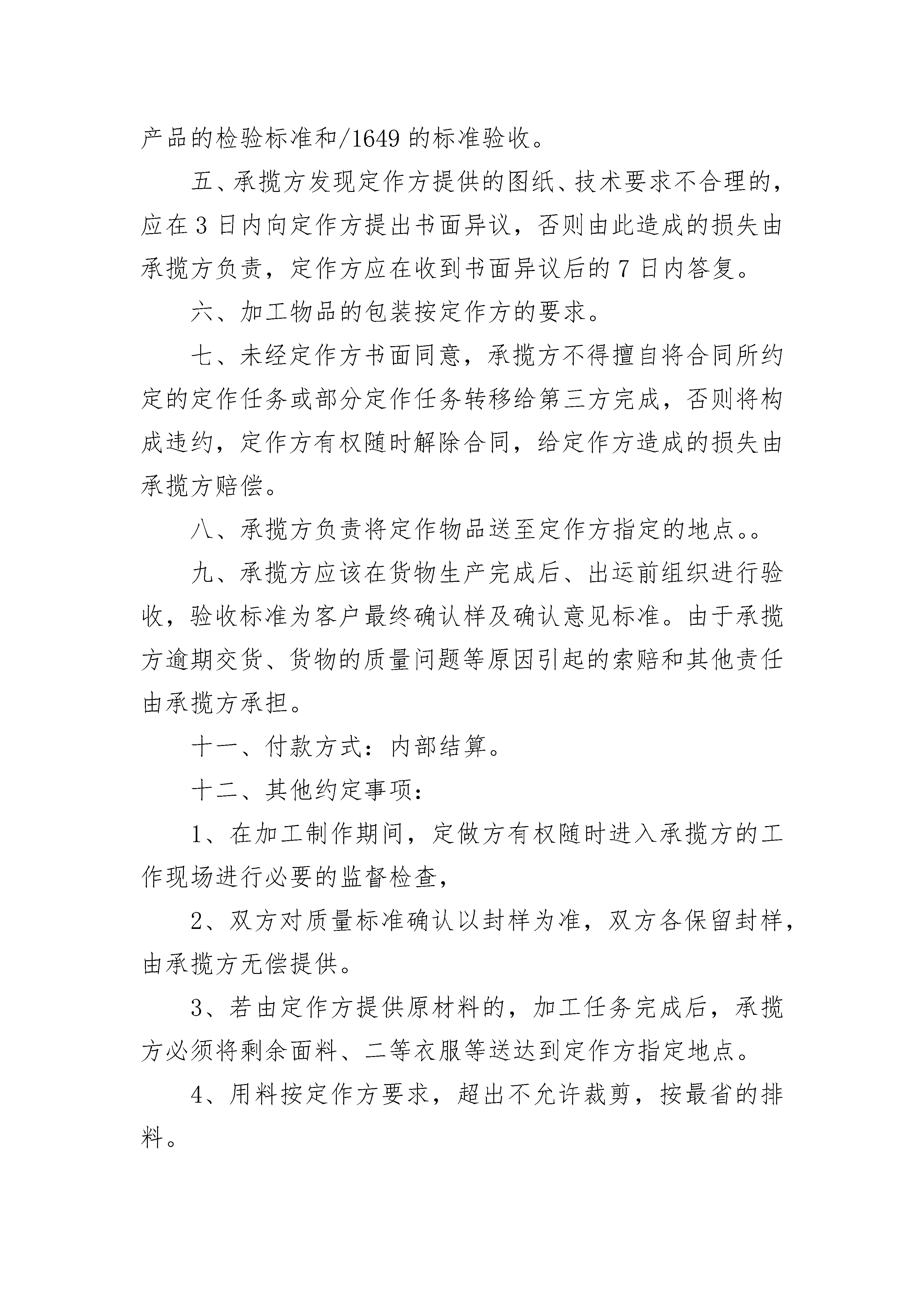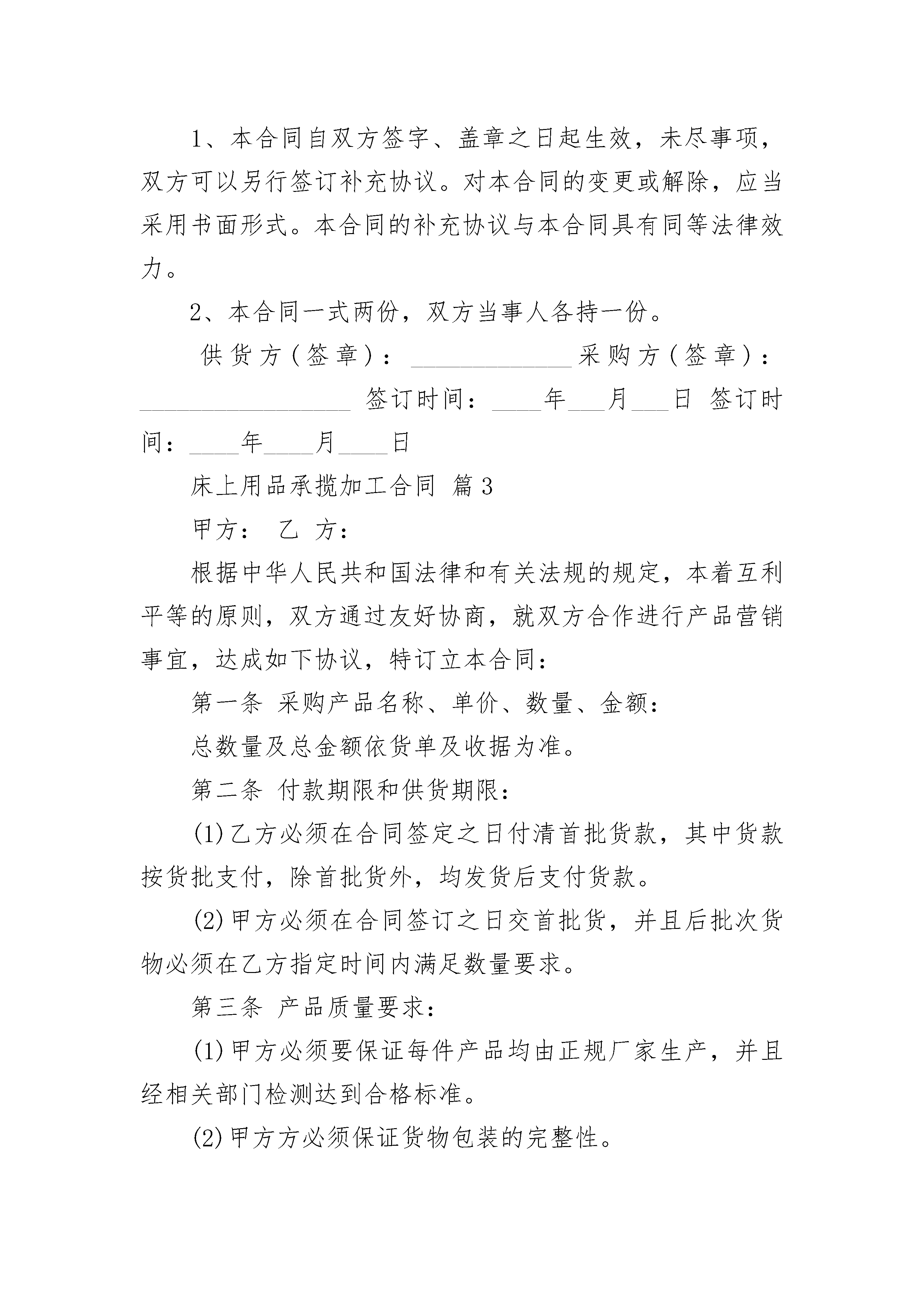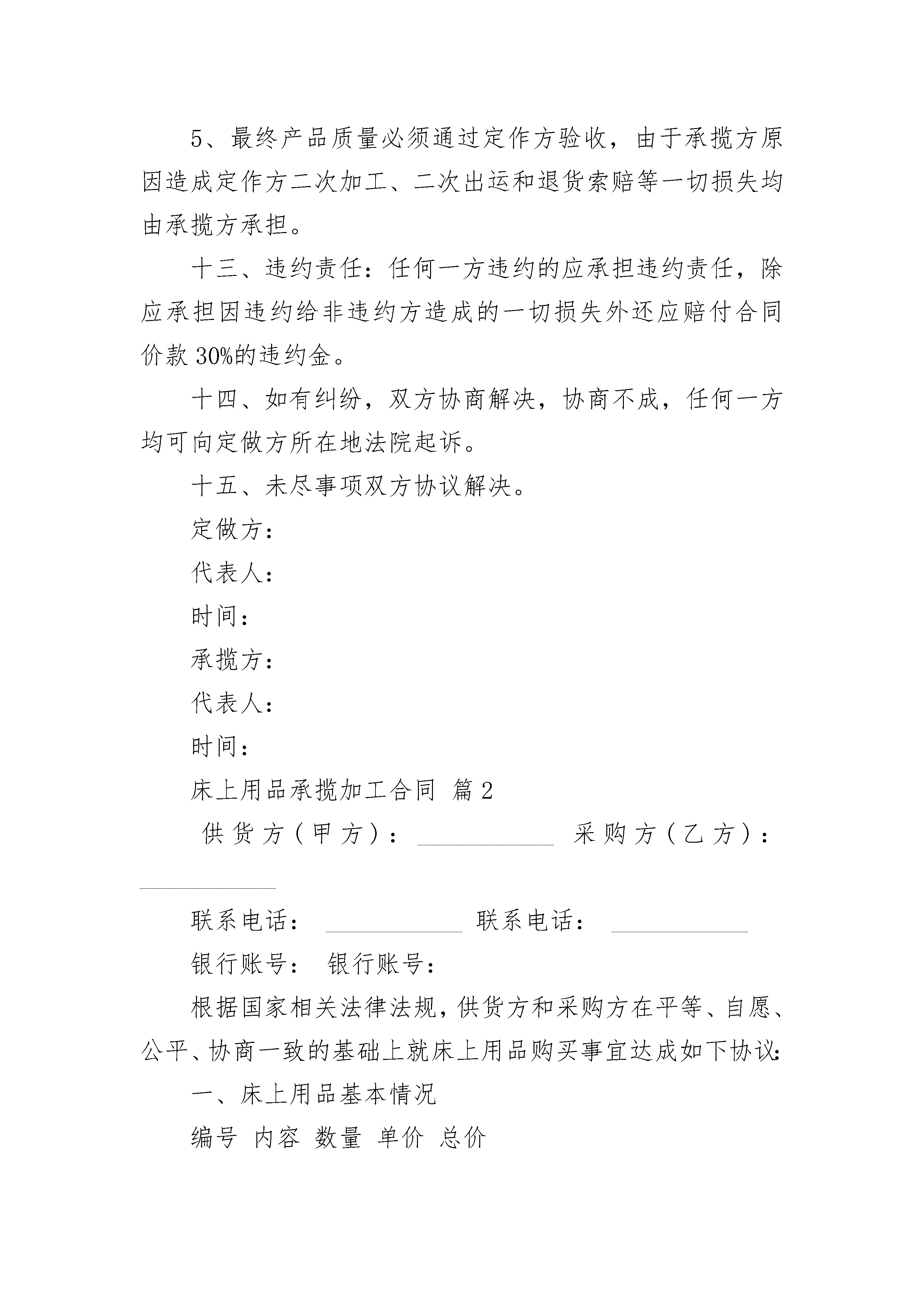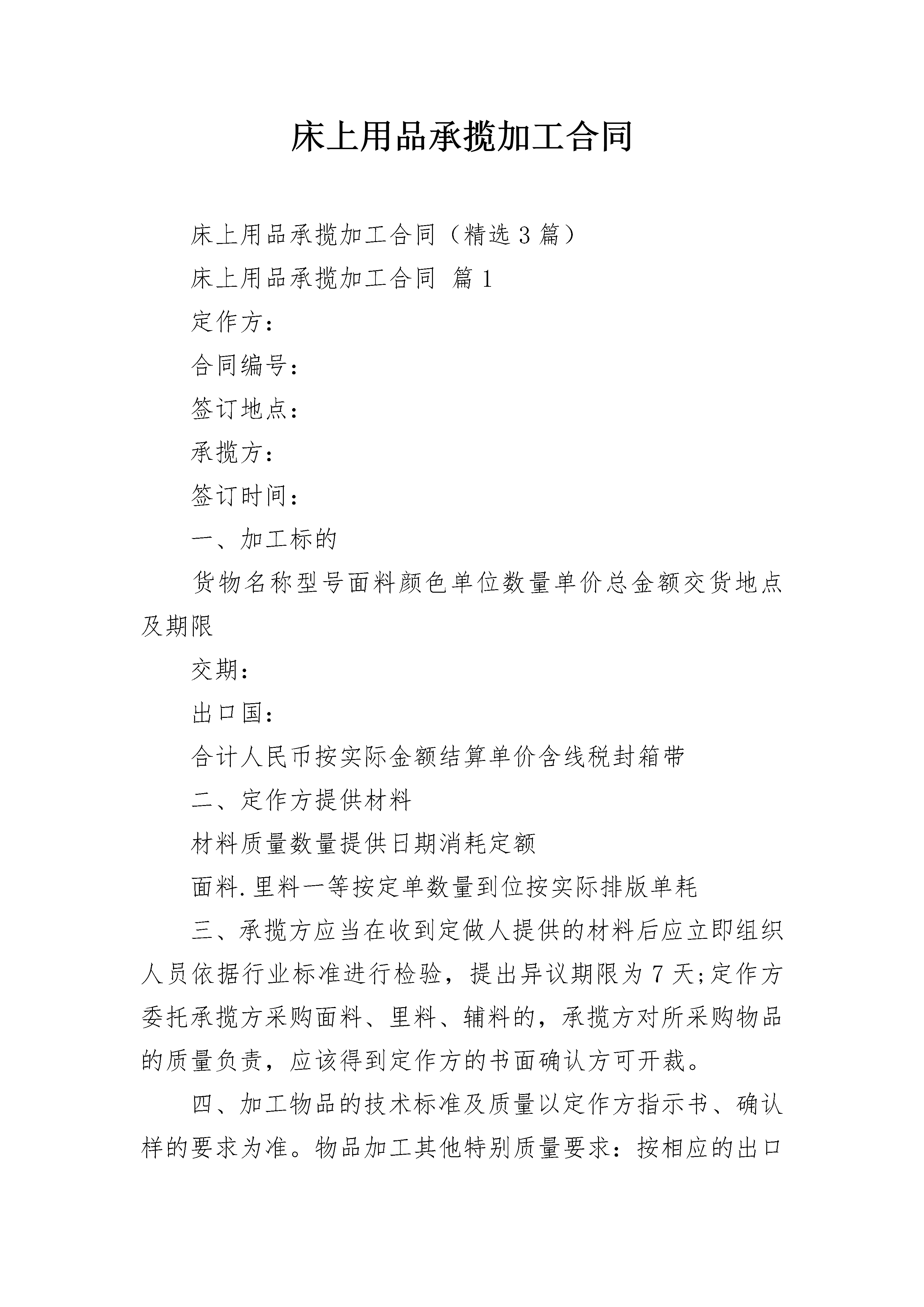床上用品承揽加工合同床上用品承揽加工合同(精选3篇)床上用品承揽加工合同篇1定作方:合同编号:签订地点:承揽方:签订时间:一、加工标的货物名称型号面料颜色单位数量单价总金额交货地点及期限交期:出口国:合计人民币按实际金额结算单价含线税封箱带二、定作方提供材料材料质量数量提供日期消耗定额面料.里料一等按定单数量到位按实际排版单耗三、承揽方应当在收到定做人提供的材料后应立即组织人员依据行业标准进行检验,提出异议期限为7天;定作方委托承揽方采购面料、里料、辅料的,承揽方对所采购物品的质量负责,应该得到定作方的书面确认方可开裁。四、加工物品的技术标准及质量以定作方指示书、确认样的要求为准。物品加工其他特别质量要求:按相应的出口产品的检验标准和/1649的标准验收。五、承揽方发现定作方提供的图纸、技术要求不合理的,应在3日内向定作方提出书面异议,否则由此造成的损失由承揽方负责,定作方应在收到书面异议后的7日内答复。六、加工物品的包装按定作方的要求。七、未经定作方书面同意,承揽方不得擅自将合同所约定的定作任务或部分定作任务转移给第三方完成,否则将构成违约,定作方有权随时解除合同,给定作方造成的损失由承揽方赔偿。八、承揽方负责将定作物品送至定作方指定的地点。。九、承揽方应该在货物生产完成后、出运前组织进行验收,验收标准为客户最终确认样及确认意见标准。由于承揽方逾期交货、货物的质量问题等原因引起的索赔和其他责任由承揽方承担。十一、付款方式:内部结算。十二、其他约定事项:1、在加工制作期间,定做方有权随时进入承揽方的工作现场进行必要的监督检查,2、双方对质量标准确认以封样为准,双方各保留封样,由承揽方无偿提供。3、若由定作方提供原材料的,加工任务完成后,承揽方必须将剩余面料、二等衣服等送达到定作方指定地点。4、用料按定作方要求,超出不允许裁剪,按最省的排料。5、最终产品质量必须通过定作方验收,由于承揽方原因造成定作方二次加工、二次出运和退货索赔等一切损失均由承揽方承担。十三、违约责任:任何一方违约的应承担违约责任,除应承担因违约给非违约方造成的一切损失外还应赔付合同价款30%的违约金。十四、如有纠纷,双方协商解决,协商不成,任何一方均可向定做方所在地法院起诉。十五、未尽事项双方协议解决。定做方:代表人:时间:承揽方:代表人:时间:床上用品承揽加工合同篇2供货方(甲方):___________采购方(乙方):___________联系电话:___________联系电话:___________银行账号:银行账号:根据国家相关法律法规,供货方和采购方在平等、自愿、公平、协商一致的基础上就床上用品购买事宜达成如下协议:一、床上用品基本情况编号内容数量单价总价合计:二、价款供货方出卖的货物总金额人民币整(大写)。最终金额以采购方实际购买数量为准。三、交货供货方于______年______月______日按照合同中约定的货物数量送达采购方指定的地方交货。四、验收货物送达指定地点后,采购方应对货物的数量进行清点,并应向供货方提供收货凭证。五、付款结算采购方验收五日内向供货方支付货款。六、违约责任1、擅自解除合同的一方应向合同的另一方支付违约金,为伍仟元人民币整,并赔偿对方因合同被解除所受到的损失。2、供货方逾期交货的,每日按照合同签署时的暂估总金额的3%向采购方支付违约金。3、采购方逾期付款的,每日按照合同签署时的暂估总金额的3%向供货方支付违约金。七、争议解决方式本合同在履行过程中发生的争议,由双方当事人协商解决或申请调解解决;协商或调解不成的,依法向人民法院起诉解决。八、其他事项1、本合同自双方签字、盖章之日起生效,未尽事项,双方可以另行签订补充协议。对本合同的变更或解除,应当采用书面形式。本合同的补充协议与本合同具有同等法律效力。2、本合同一式两份,双方当事人各持一份。供货方(签章):_____________采购方(签章):_________________签订时间:____年___月___日签订时间:____年____月____日床上用品承揽加工合同篇3甲方:乙方:根据中华人民共和国法律和有关法规的规定,本着互利平等的原则,双方通过友好协商,就双方合作进行产品营销事宜,达成如下协议,特订立本合同:第一条采购产品名称、单价、数量、金额:总数量及总金额依货单及收据为准。第二条付款期限和供货期限:(1)乙方必须在合同签定之日付清首批货款,其中货款按货批支付,除首批货外,均发货后支付货款。(2)甲方必须在合同签订之日交首批货,并且后批次货物必须在乙方指定时间内满足数量要求。第三条产品质量要求:(1)甲方必须要保证每件产品均由正规厂家生产,并且经相关部门检测达到合格标准。(2)甲方方必须保证货物包装的完整性。第四条送货方式:由乙方到甲方处接货,装货由甲