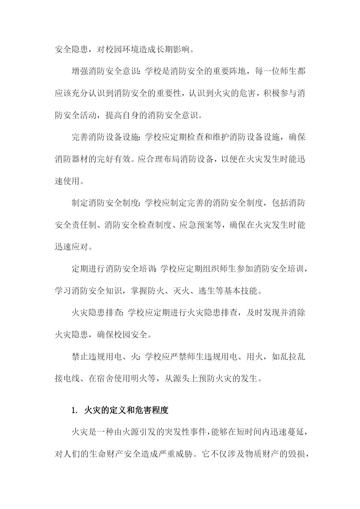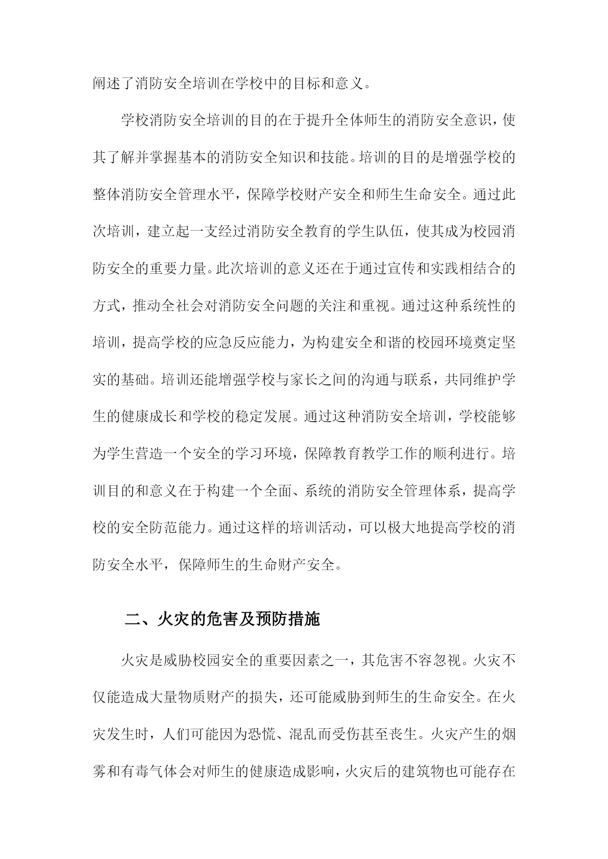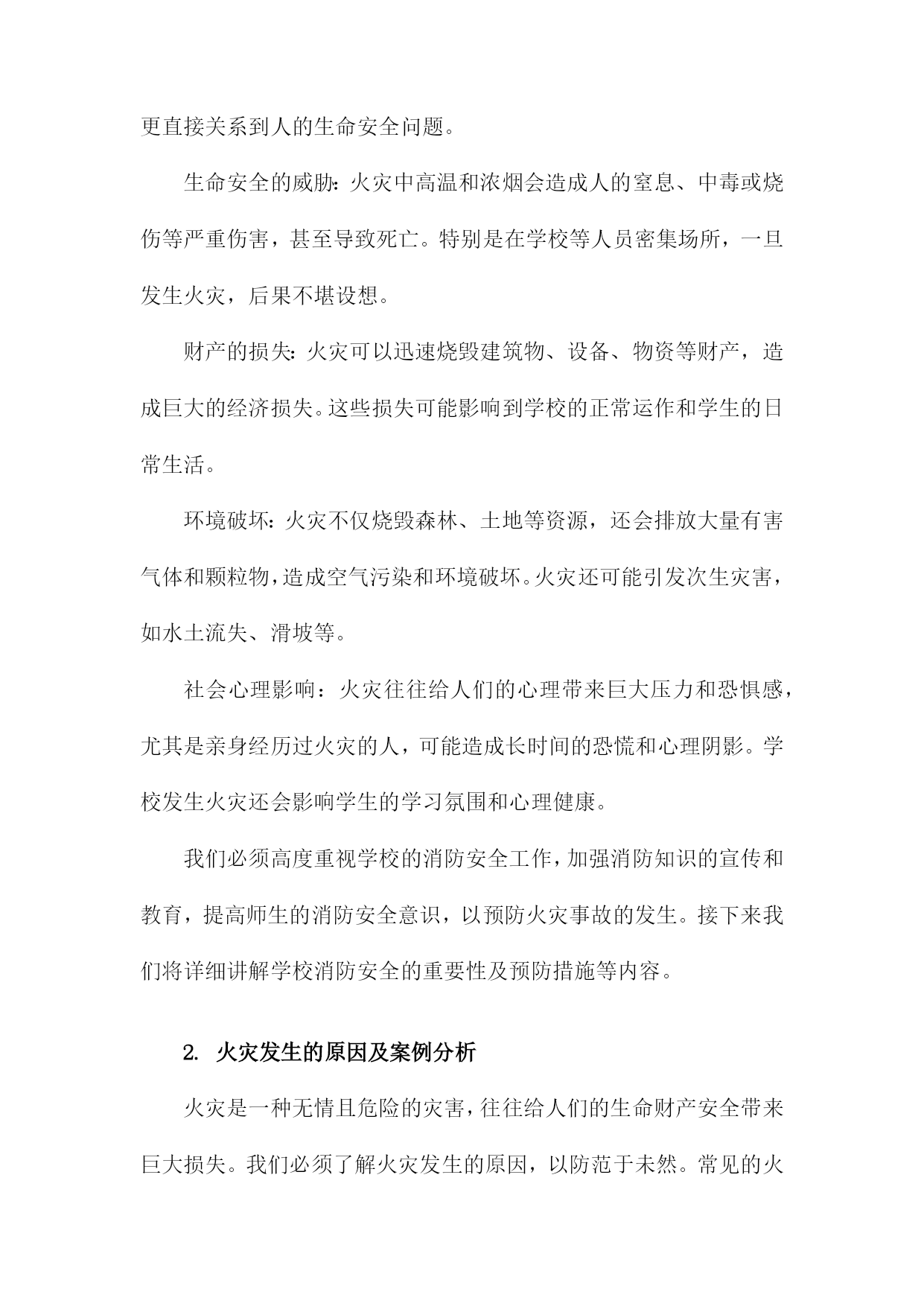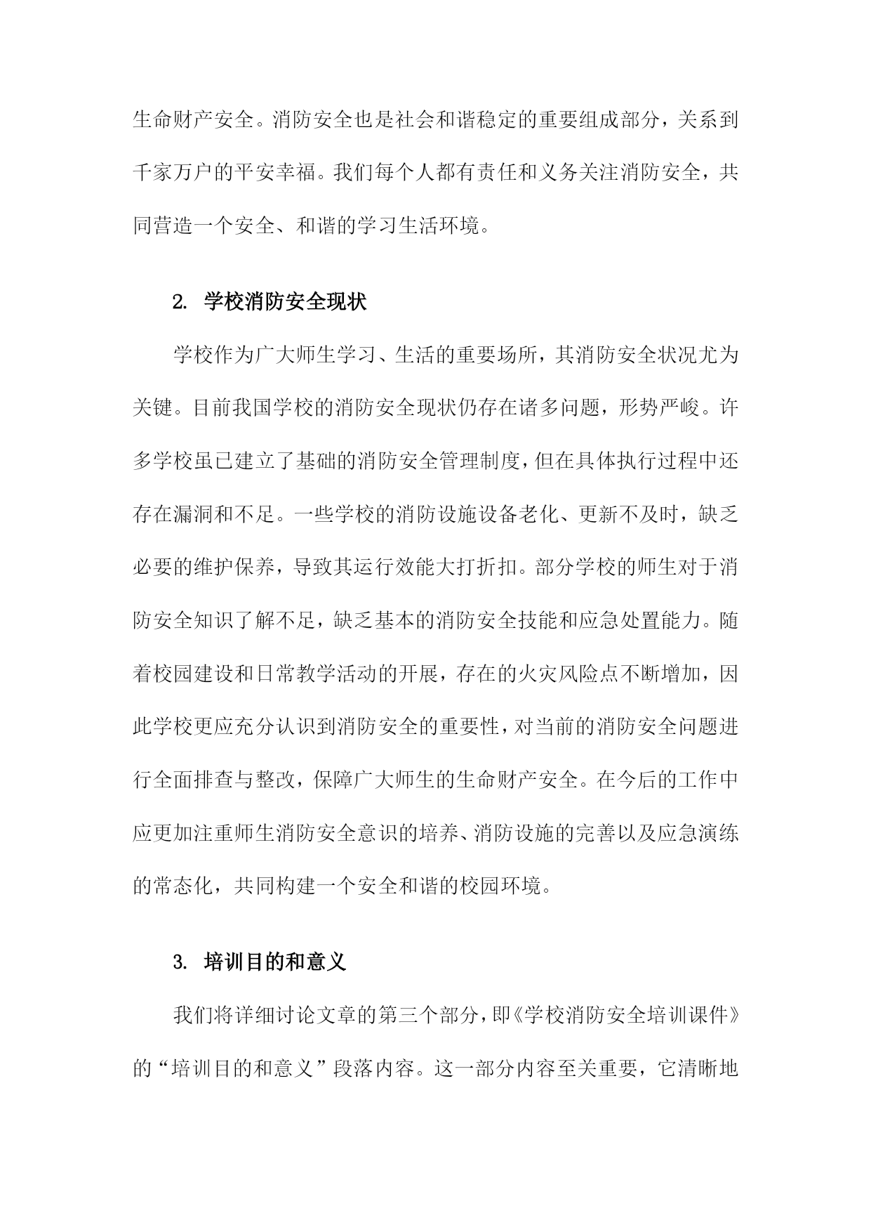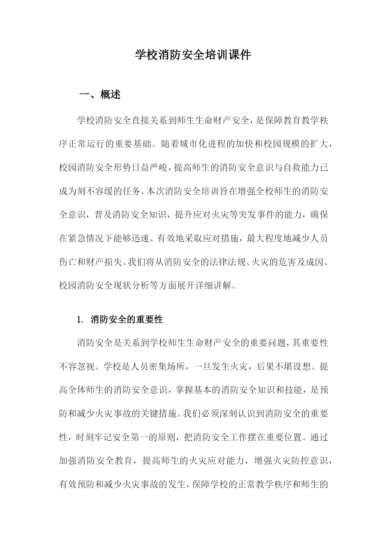 学校消防安全培训课件一、概述学校消防安全直接关系到师生生命财产安全,是保障教育教学秩序正常运行的重要基础。随着城市化进程的加快和校园规模的扩大,校园消防安全形势日益严峻,提高师生的消防安全意识与自救能力已成为刻不容缓的任务。本次消防安全培训旨在增强全校师生的消防安全意识,普及消防安全知识,提升应对火灾等突发事件的能力,确保在紧急情况下能够迅速、有效地采取应对措施,最大程度地减少人员伤亡和财产损失。我们将从消防安全的法律法规、火灾的危害及成因、校园消防安全现状分析等方面展开详细讲解。1.消防安全的重要性消防安全是关系到学校师生生命财产安全的重要问题,其重要性不容忽视。学校是人员密集场所,一旦发生火灾,后果不堪设想。提高全体师生的消防安全意识,掌握基本的消防安全知识和技能,是预防和减少火灾事故的关键措施。我们必须深刻认识到消防安全的重要性,时刻牢记安全第一的原则,把消防安全工作摆在重要位置。通过加强消防安全教育,提高师生的火灾应对能力,增强火灾防控意识,有效预防和减少火灾事故的发生,保障学校的正常教学秩序和师生的生命财产安全。消防安全也是社会和谐稳定的重要组成部分,关系到千家万户的平安幸福。我们每个人都有责任和义务关注消防安全,共同营造一个安全、和谐的学习生活环境。2.学校消防安全现状学校作为广大师生学习、生活的重要场所,其消防安全状况尤为关键。目前我国学校的消防安全现状仍存在诸多问题,形势严峻。许多学校虽已建立了基础的消防安全管理制度,但在具体执行过程中还存在漏洞和不足。一些学校的消防设施设备老化、更新不及时,缺乏必要的维护保养,导致其运行效能大打折扣。部分学校的师生对于消防安全知识了解不足,缺乏基本的消防安全技能和应急处置能力。随着校园建设和日常教学活动的开展,存在的火灾风险点不断增加,因此学校更应充分认识到消防安全的重要性,对当前的消防安全问题进行全面排查与整改,保障广大师生的生命财产安全。在今后的工作中应更加注重师生消防安全意识的培养、消防设施的完善以及应急演练的常态化,共同构建一个安全和谐的校园环境。3.培训目的和意义我们将详细讨论文章的第三个部分,即《学校消防安全培训课件》的“培训目的和意义”段落内容。这一部分内容至关重要,它清晰地阐述了消防安全培训在学校中的目标和意义。学校消防安全培训的目的在于提升全体师生的消防安全意识,使其了解并掌握基本的消防安全知识和技能。培训的目的是增强学校的整体消防安全管理水平,保障学校财产安全和师生生命安全。通过此次培训,建立起一支经过消防安全教育的学生队伍,使其成为校园消防安全的重要力量。此次培训的意义还在于通过宣传和实践相结合的方式,推动全社会对消防安全问题的关注和重视。通过这种系统性的培训,提高学校的应急反应能力,为构建安全和谐的校园环境奠定坚实的基础。培训还能增强学校与家长之间的沟通与联系,共同维护学生的健康成长和学校的稳定发展。通过这种消防安全培训,学校能够为学生营造一个安全的学习环境,保障教育教学工作的顺利进行。培训目的和意义在于构建一个全面、系统的消防安全管理体系,提高学校的安全防范能力。通过这样的培训活动,可以极大地提高学校的消防安全水平,保障师生的生命财产安全。二、火灾的危害及预防措施火灾是威胁校园安全的重要因素之一,其危害不容忽视。火灾不仅能造成大量物质财产的损失,还可能威胁到师生的生命安全。在火灾发生时,人们可能因为恐慌、混乱而受伤甚至丧生。火灾产生的烟雾和有毒气体会对师生的健康造成影响,火灾后的建筑物也可能存在安全隐患,对校园环境造成长期影响。增强消防安全意识:学校是消防安全的重要阵地,每一位师生都应该充分认识到消防安全的重要性,认识到火灾的危害,积极参与消防安全活动,提高自身的消防安全意识。完善消防设备设施:学校应定期检查和维护消防设备设施,确保消防器材的完好有效。应合理布局消防设备,以便在火灾发生时能迅速使用。制定消防安全制度:学校应制定完善的消防安全制度,包括消防安全责任制、消防安全检查制度、应急预案等,确保在火灾发生时能迅速应对。定期进行消防安全培训:学校应定期组织师生参加消防安全培训,学习消防安全知识,掌握防火、灭火、逃生等基本技能。火灾隐患排查:学校应定期进行火灾隐患排查,及时发现并消除火灾隐患,确保校园安全。禁止违规用电、火:学校应严禁师生违规用电、用火,如乱拉乱接电线、在宿舍使用明火等,从源头上预防火灾的发生。1.火灾的定义和危害程度火灾是一种由火源引发的突发性事件,能够在短时间内迅速蔓延,对人们的生命财产安全造成严重威胁。它不仅涉及物质财产的毁损,更直接关系到人的生命安全问题。生命安全的威胁:火灾中高温和浓烟会造成人的窒息、中毒或烧伤等严重伤害,甚至导致死亡。特别是在学校等人员密集场所,一旦发生火灾,后果不堪设想。财产的损失:火灾可以迅速烧毁建筑物