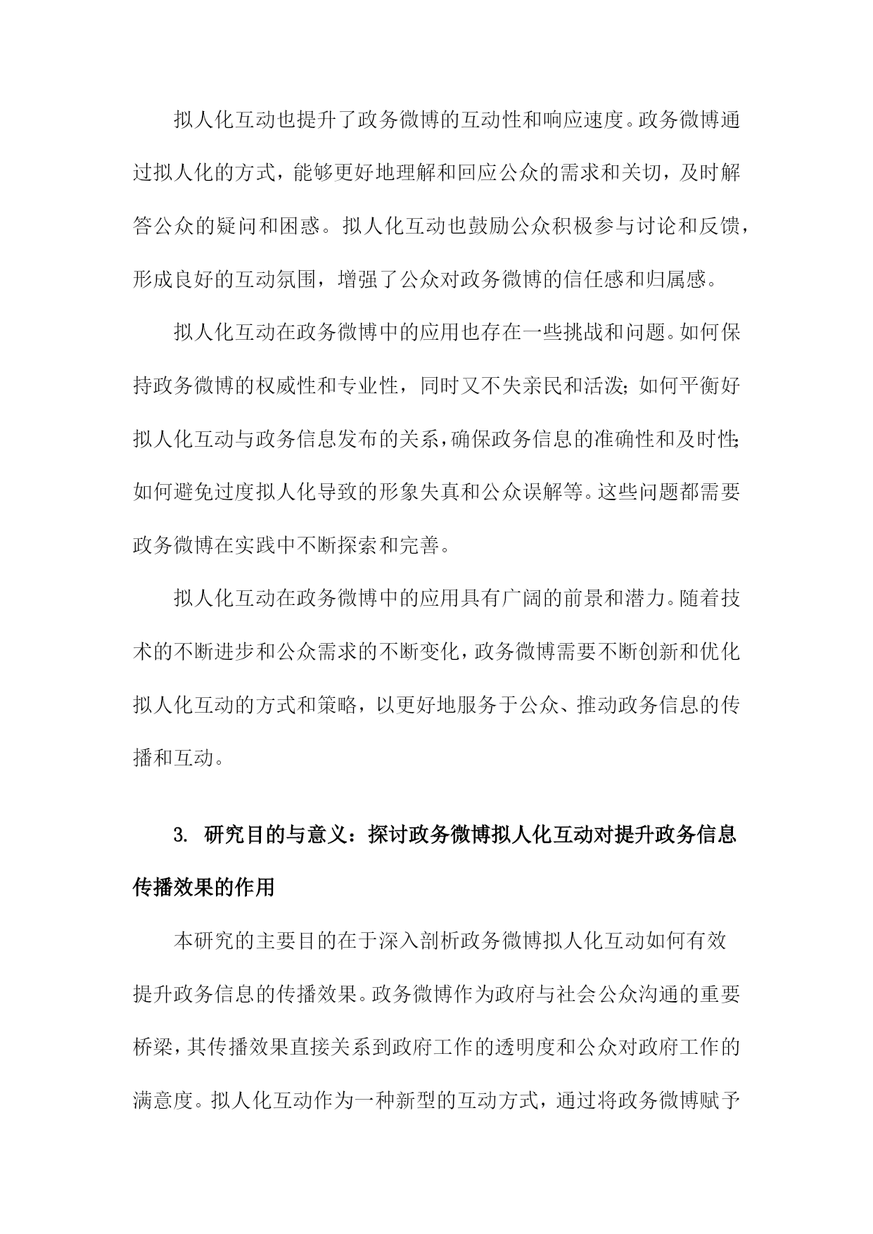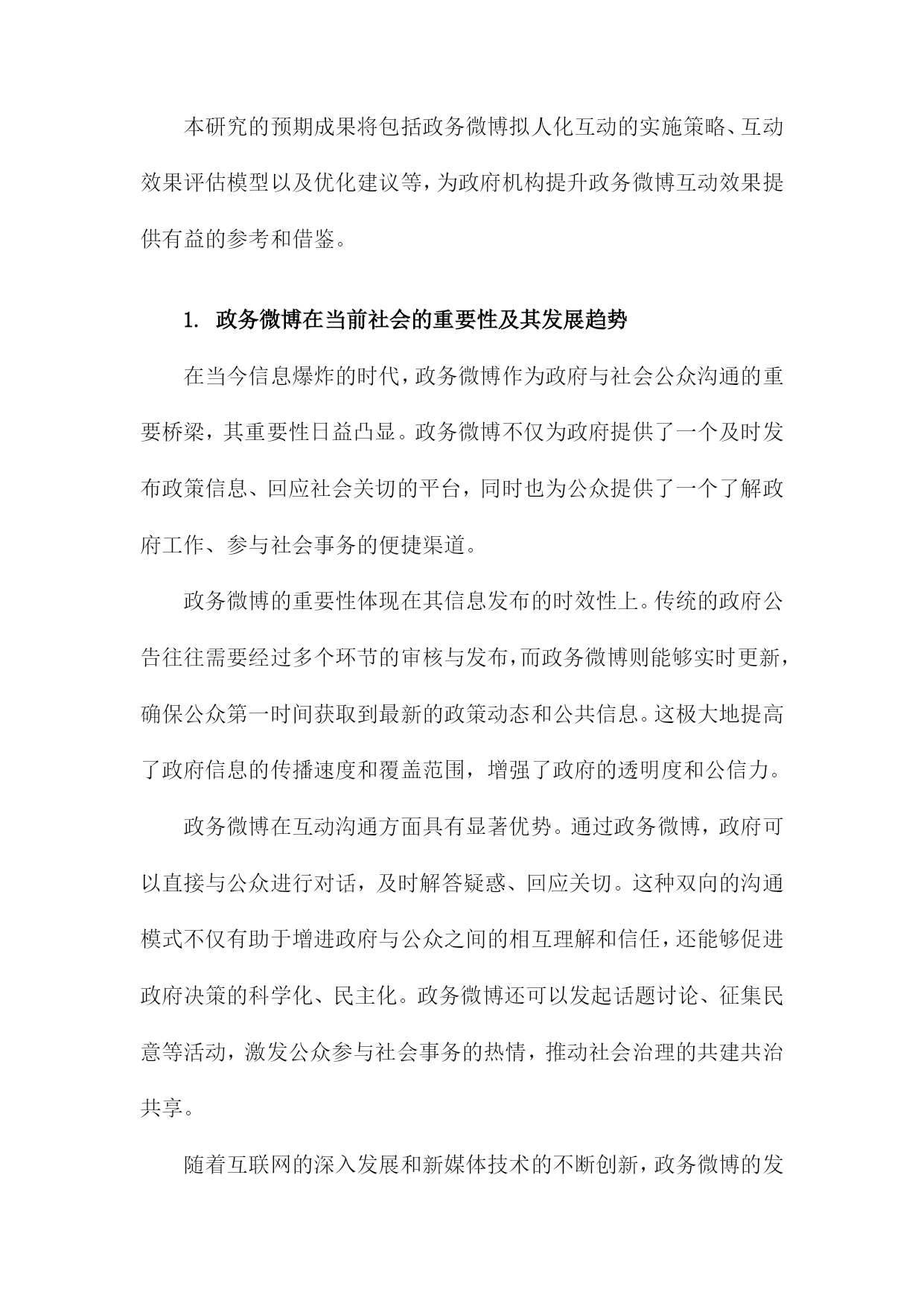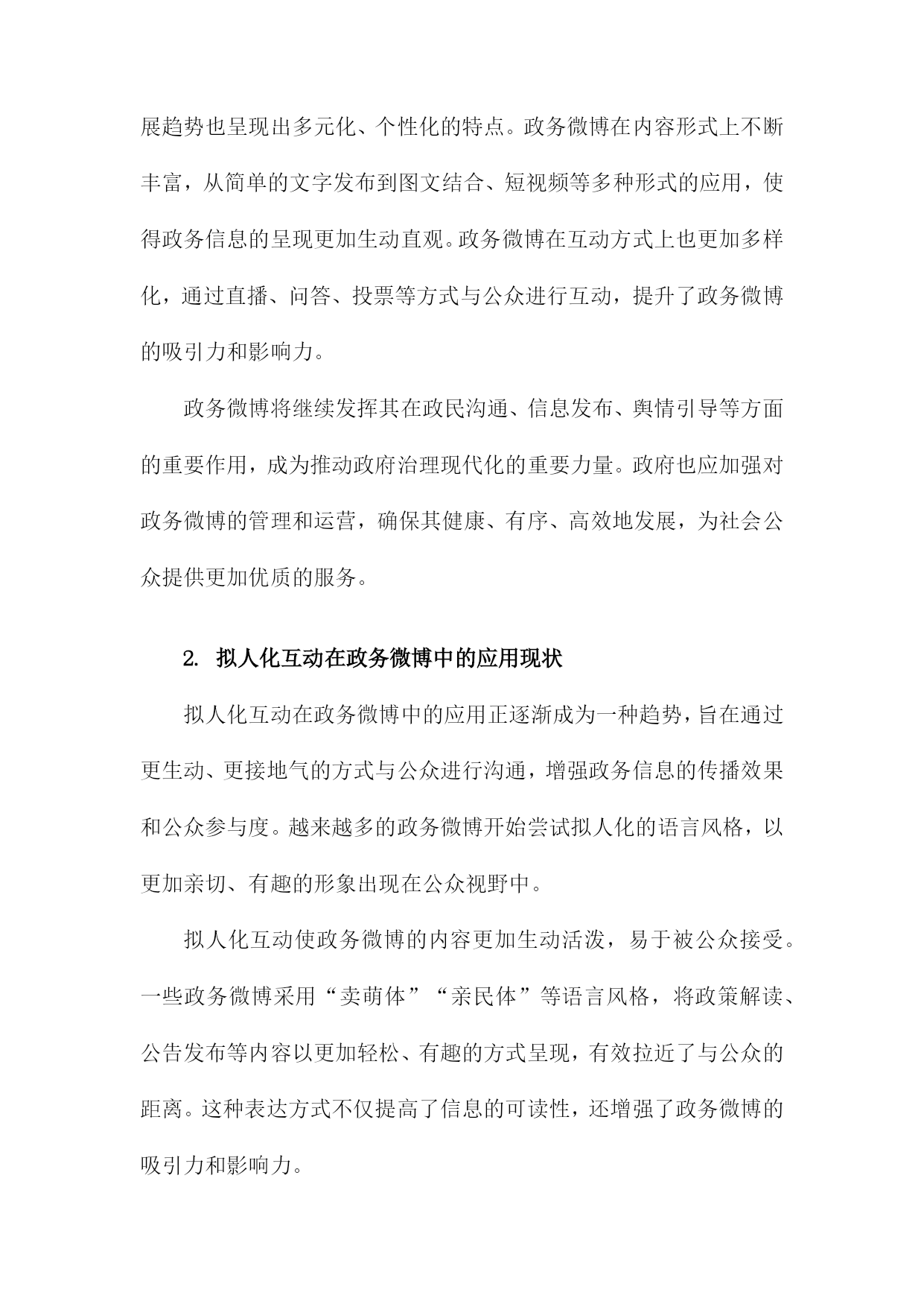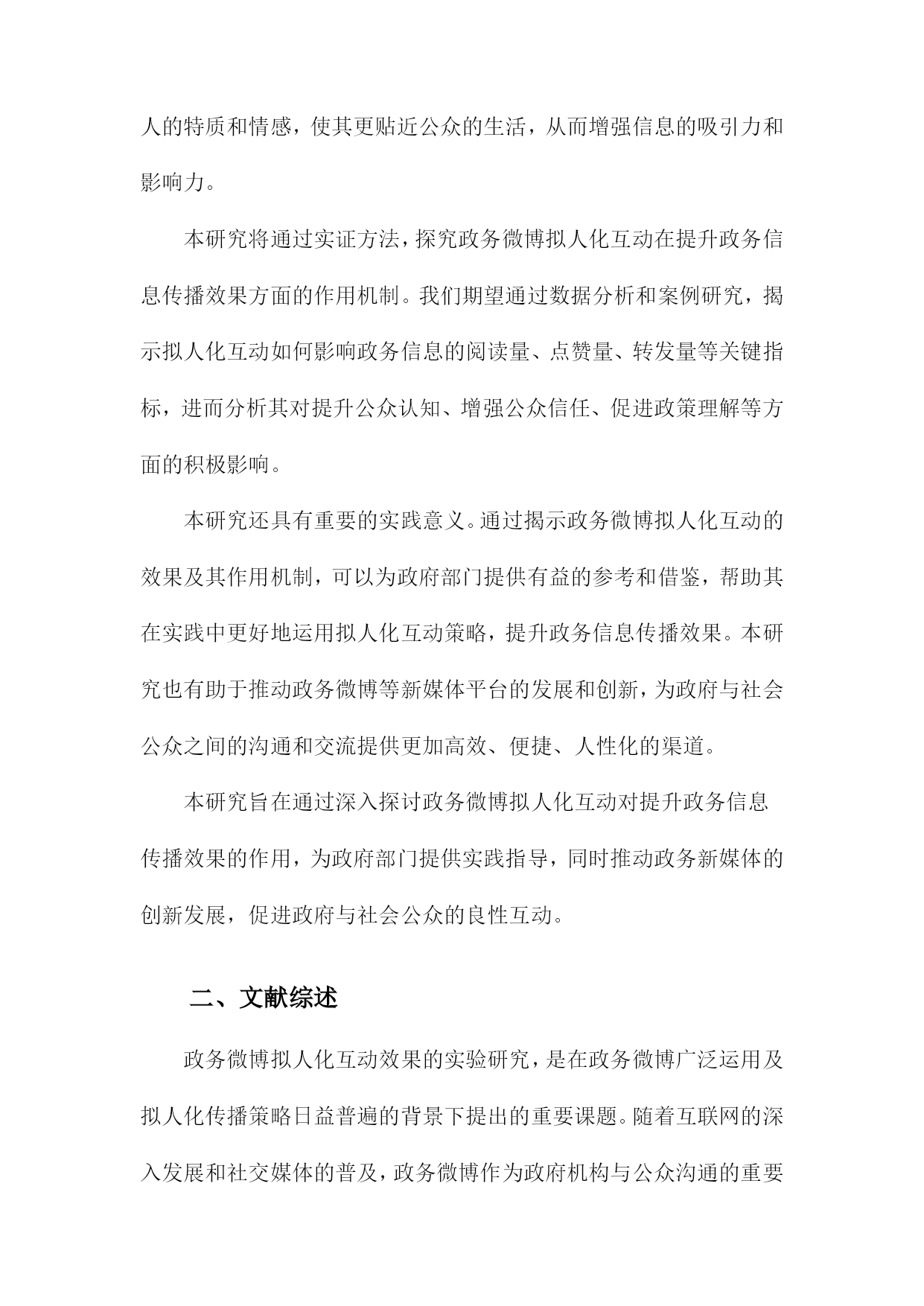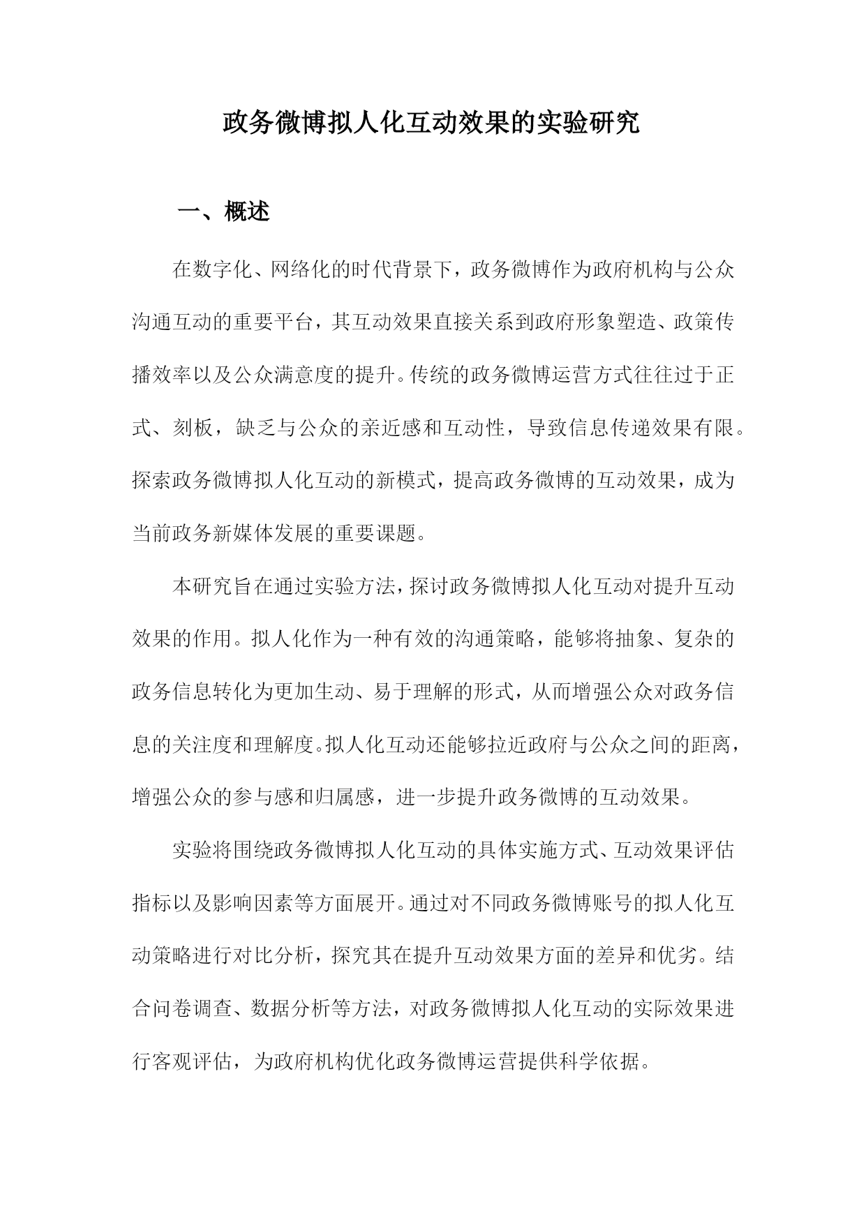 政务微博拟人化互动效果的实验研究一、概述在数字化、网络化的时代背景下,政务微博作为政府机构与公众沟通互动的重要平台,其互动效果直接关系到政府形象塑造、政策传播效率以及公众满意度的提升。传统的政务微博运营方式往往过于正式、刻板,缺乏与公众的亲近感和互动性,导致信息传递效果有限。探索政务微博拟人化互动的新模式,提高政务微博的互动效果,成为当前政务新媒体发展的重要课题。本研究旨在通过实验方法,探讨政务微博拟人化互动对提升互动效果的作用。拟人化作为一种有效的沟通策略,能够将抽象、复杂的政务信息转化为更加生动、易于理解的形式,从而增强公众对政务信息的关注度和理解度。拟人化互动还能够拉近政府与公众之间的距离,增强公众的参与感和归属感,进一步提升政务微博的互动效果。实验将围绕政务微博拟人化互动的具体实施方式、互动效果评估指标以及影响因素等方面展开。通过对不同政务微博账号的拟人化互动策略进行对比分析,探究其在提升互动效果方面的差异和优劣。结合问卷调查、数据分析等方法,对政务微博拟人化互动的实际效果进行客观评估,为政府机构优化政务微博运营提供科学依据。本研究的预期成果将包括政务微博拟人化互动的实施策略、互动效果评估模型以及优化建议等,为政府机构提升政务微博互动效果提供有益的参考和借鉴。1.政务微博在当前社会的重要性及其发展趋势在当今信息爆炸的时代,政务微博作为政府与社会公众沟通的重要桥梁,其重要性日益凸显。政务微博不仅为政府提供了一个及时发布政策信息、回应社会关切的平台,同时也为公众提供了一个了解政府工作、参与社会事务的便捷渠道。政务微博的重要性体现在其信息发布的时效性上。传统的政府公告往往需要经过多个环节的审核与发布,而政务微博则能够实时更新,确保公众第一时间获取到最新的政策动态和公共信息。这极大地提高了政府信息的传播速度和覆盖范围,增强了政府的透明度和公信力。政务微博在互动沟通方面具有显著优势。通过政务微博,政府可以直接与公众进行对话,及时解答疑惑、回应关切。这种双向的沟通模式不仅有助于增进政府与公众之间的相互理解和信任,还能够促进政府决策的科学化、民主化。政务微博还可以发起话题讨论、征集民意等活动,激发公众参与社会事务的热情,推动社会治理的共建共治共享。随着互联网的深入发展和新媒体技术的不断创新,政务微博的发展趋势也呈现出多元化、个性化的特点。政务微博在内容形式上不断丰富,从简单的文字发布到图文结合、短视频等多种形式的应用,使得政务信息的呈现更加生动直观。政务微博在互动方式上也更加多样化,通过直播、问答、投票等方式与公众进行互动,提升了政务微博的吸引力和影响力。政务微博将继续发挥其在政民沟通、信息发布、舆情引导等方面的重要作用,成为推动政府治理现代化的重要力量。政府也应加强对政务微博的管理和运营,确保其健康、有序、高效地发展,为社会公众提供更加优质的服务。2.拟人化互动在政务微博中的应用现状拟人化互动在政务微博中的应用正逐渐成为一种趋势,旨在通过更生动、更接地气的方式与公众进行沟通,增强政务信息的传播效果和公众参与度。越来越多的政务微博开始尝试拟人化的语言风格,以更加亲切、有趣的形象出现在公众视野中。拟人化互动使政务微博的内容更加生动活泼,易于被公众接受。一些政务微博采用“卖萌体”“亲民体”等语言风格,将政策解读、公告发布等内容以更加轻松、有趣的方式呈现,有效拉近了与公众的距离。这种表达方式不仅提高了信息的可读性,还增强了政务微博的吸引力和影响力。拟人化互动也提升了政务微博的互动性和响应速度。政务微博通过拟人化的方式,能够更好地理解和回应公众的需求和关切,及时解答公众的疑问和困惑。拟人化互动也鼓励公众积极参与讨论和反馈,形成良好的互动氛围,增强了公众对政务微博的信任感和归属感。拟人化互动在政务微博中的应用也存在一些挑战和问题。如何保持政务微博的权威性和专业性,同时又不失亲民和活泼;如何平衡好拟人化互动与政务信息发布的关系,确保政务信息的准确性和及时性;如何避免过度拟人化导致的形象失真和公众误解等。这些问题都需要政务微博在实践中不断探索和完善。拟人化互动在政务微博中的应用具有广阔的前景和潜力。随着技术的不断进步和公众需求的不断变化,政务微博需要不断创新和优化拟人化互动的方式和策略,以更好地服务于公众、推动政务信息的传播和互动。3.研究目的与意义:探讨政务微博拟人化互动对提升政务信息传播效果的作用本研究的主要目的在于深入剖析政务微博拟人化互动如何有效提升政务信息的传播效果。政务微博作为政府与社会公众沟通的重要桥梁,其传播效果直接关系到政府工作的透明度和公众对政府工作的满意度。拟人化互动作为一种新型的互动方式,通过将政务微博赋予人的特质和情感,使其更贴近公众的生活,从而增强信息的吸引力和影响力。本研究将通过实证方法,探究政务微博拟人化互动在提升