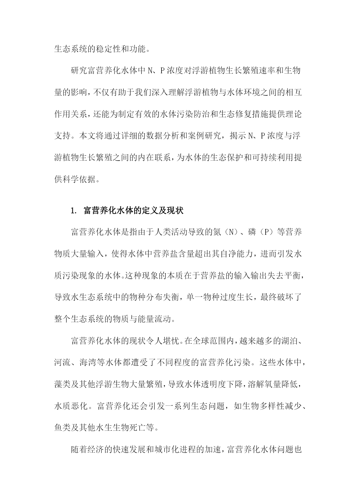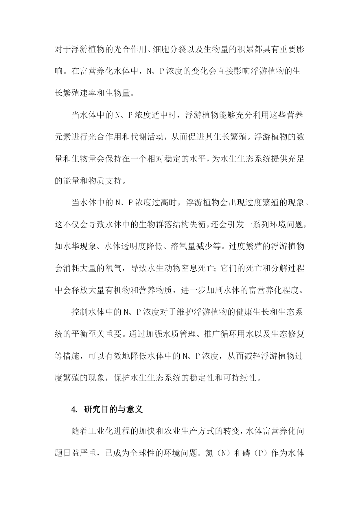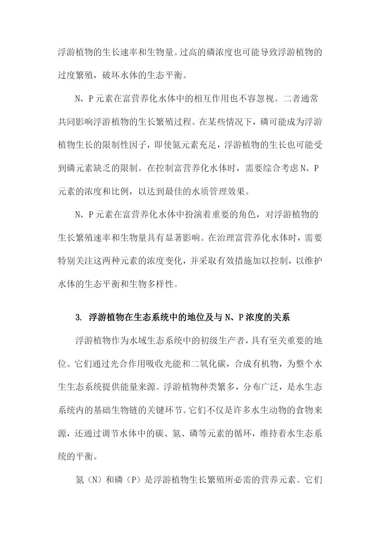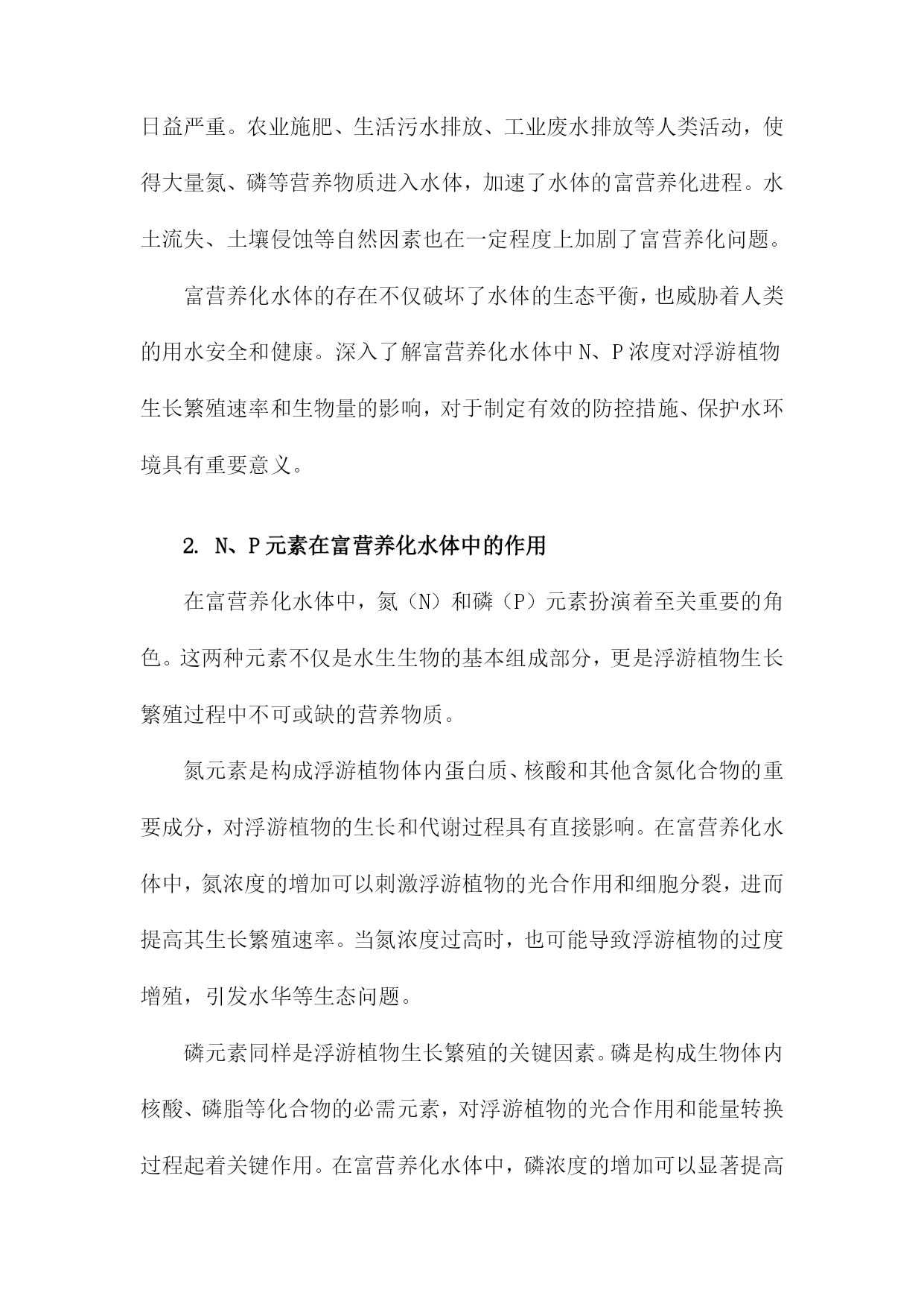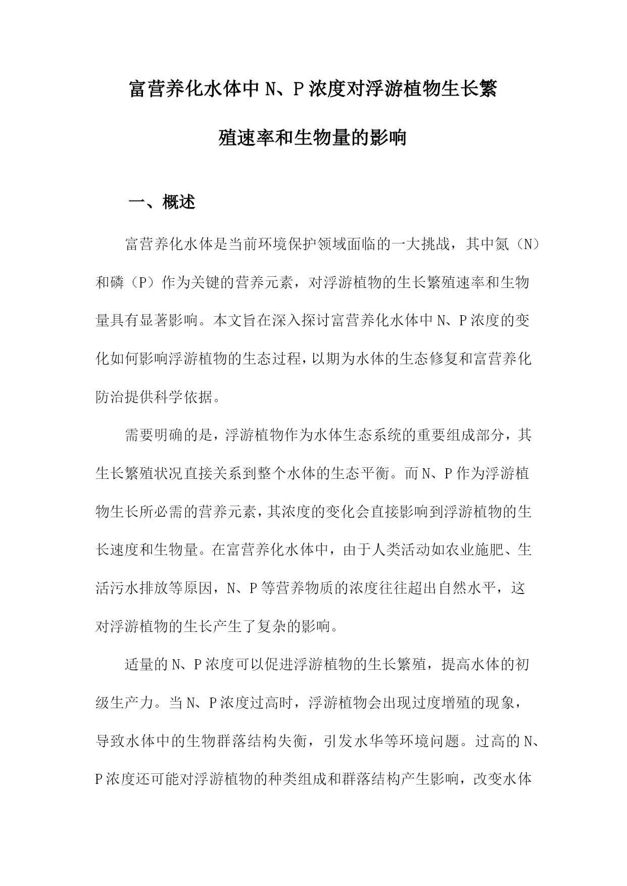 富营养化水体中N、P浓度对浮游植物生长繁殖速率和生物量的影响一、概述富营养化水体是当前环境保护领域面临的一大挑战,其中氮(N)和磷(P)作为关键的营养元素,对浮游植物的生长繁殖速率和生物量具有显著影响。本文旨在深入探讨富营养化水体中N、P浓度的变化如何影响浮游植物的生态过程,以期为水体的生态修复和富营养化防治提供科学依据。需要明确的是,浮游植物作为水体生态系统的重要组成部分,其生长繁殖状况直接关系到整个水体的生态平衡。而N、P作为浮游植物生长所必需的营养元素,其浓度的变化会直接影响到浮游植物的生长速度和生物量。在富营养化水体中,由于人类活动如农业施肥、生活污水排放等原因,N、P等营养物质的浓度往往超出自然水平,这对浮游植物的生长产生了复杂的影响。适量的N、P浓度可以促进浮游植物的生长繁殖,提高水体的初级生产力。当N、P浓度过高时,浮游植物会出现过度增殖的现象,导致水体中的生物群落结构失衡,引发水华等环境问题。过高的N、P浓度还可能对浮游植物的种类组成和群落结构产生影响,改变水体生态系统的稳定性和功能。研究富营养化水体中N、P浓度对浮游植物生长繁殖速率和生物量的影响,不仅有助于我们深入理解浮游植物与水体环境之间的相互作用关系,还能为制定有效的水体污染防治和生态修复措施提供理论支持。本文将通过详细的数据分析和案例研究,揭示N、P浓度与浮游植物生长繁殖之间的内在联系,为水体的生态保护和可持续利用提供科学依据。1.富营养化水体的定义及现状富营养化水体是指由于人类活动导致的氮(N)、磷(P)等营养物质大量输入,使得水体中营养盐含量超出其自净能力,进而引发水质污染现象的水体。这种现象的本质在于营养盐的输入输出失去平衡,导致水生态系统中的物种分布失衡,单一物种过度生长,最终破坏了整个生态系统的物质与能量流动。富营养化水体的现状令人堪忧。在全球范围内,越来越多的湖泊、河流、海湾等水体都遭受了不同程度的富营养化污染。这些水体中,藻类及其他浮游生物大量繁殖,导致水体透明度下降,溶解氧量降低,水质恶化。富营养化还会引发一系列生态问题,如生物多样性减少、鱼类及其他水生生物死亡等。随着经济的快速发展和城市化进程的加速,富营养化水体问题也日益严重。农业施肥、生活污水排放、工业废水排放等人类活动,使得大量氮、磷等营养物质进入水体,加速了水体的富营养化进程。水土流失、土壤侵蚀等自然因素也在一定程度上加剧了富营养化问题。富营养化水体的存在不仅破坏了水体的生态平衡,也威胁着人类的用水安全和健康。深入了解富营养化水体中N、P浓度对浮游植物生长繁殖速率和生物量的影响,对于制定有效的防控措施、保护水环境具有重要意义。2.N、P元素在富营养化水体中的作用在富营养化水体中,氮(N)和磷(P)元素扮演着至关重要的角色。这两种元素不仅是水生生物的基本组成部分,更是浮游植物生长繁殖过程中不可或缺的营养物质。氮元素是构成浮游植物体内蛋白质、核酸和其他含氮化合物的重要成分,对浮游植物的生长和代谢过程具有直接影响。在富营养化水体中,氮浓度的增加可以刺激浮游植物的光合作用和细胞分裂,进而提高其生长繁殖速率。当氮浓度过高时,也可能导致浮游植物的过度增殖,引发水华等生态问题。磷元素同样是浮游植物生长繁殖的关键因素。磷是构成生物体内核酸、磷脂等化合物的必需元素,对浮游植物的光合作用和能量转换过程起着关键作用。在富营养化水体中,磷浓度的增加可以显著提高浮游植物的生长速率和生物量。过高的磷浓度也可能导致浮游植物的过度繁殖,破坏水体的生态平衡。N、P元素在富营养化水体中的相互作用也不容忽视。二者通常共同影响浮游植物的生长繁殖过程。在某些情况下,磷可能成为浮游植物生长的限制性因子,即使氮元素充足,浮游植物的生长也可能受到磷元素缺乏的限制。在控制富营养化水体时,需要综合考虑N、P元素的浓度和比例,以达到最佳的水质管理效果。N、P元素在富营养化水体中扮演着重要的角色,对浮游植物的生长繁殖速率和生物量具有显著影响。在治理富营养化水体时,需要特别关注这两种元素的浓度变化,并采取有效措施加以控制,以维护水体的生态平衡和生物多样性。3.浮游植物在生态系统中的地位及与N、P浓度的关系浮游植物作为水域生态系统中的初级生产者,具有至关重要的地位。它们通过光合作用吸收光能和二氧化碳,合成有机物,为整个水生生态系统提供能量来源。浮游植物种类繁多,分布广泛,是水生态系统内的基础生物链的关键环节。它们不仅是许多水生动物的食物来源,还通过调节水体中的碳、氮、磷等元素的循环,维持着水生态系统的平衡。氮(N)和磷(P)是浮游植物生长繁殖所必需的营养元素。它们对于浮游植物的光合作用、细胞分裂以及生物量的积累都具有重要影响。在富营养化水体中,N、P浓度的变化会直接影响浮游植物的生长繁殖速率和生物量。当水体中的N、P浓度适中时,浮游植物