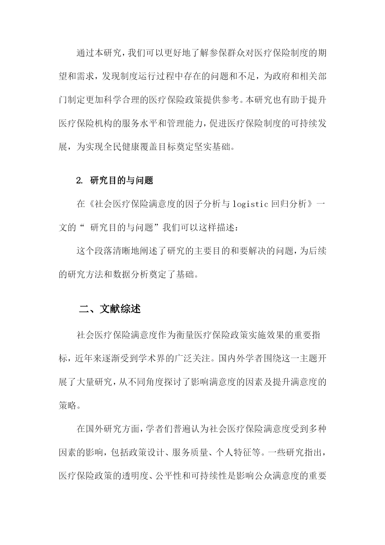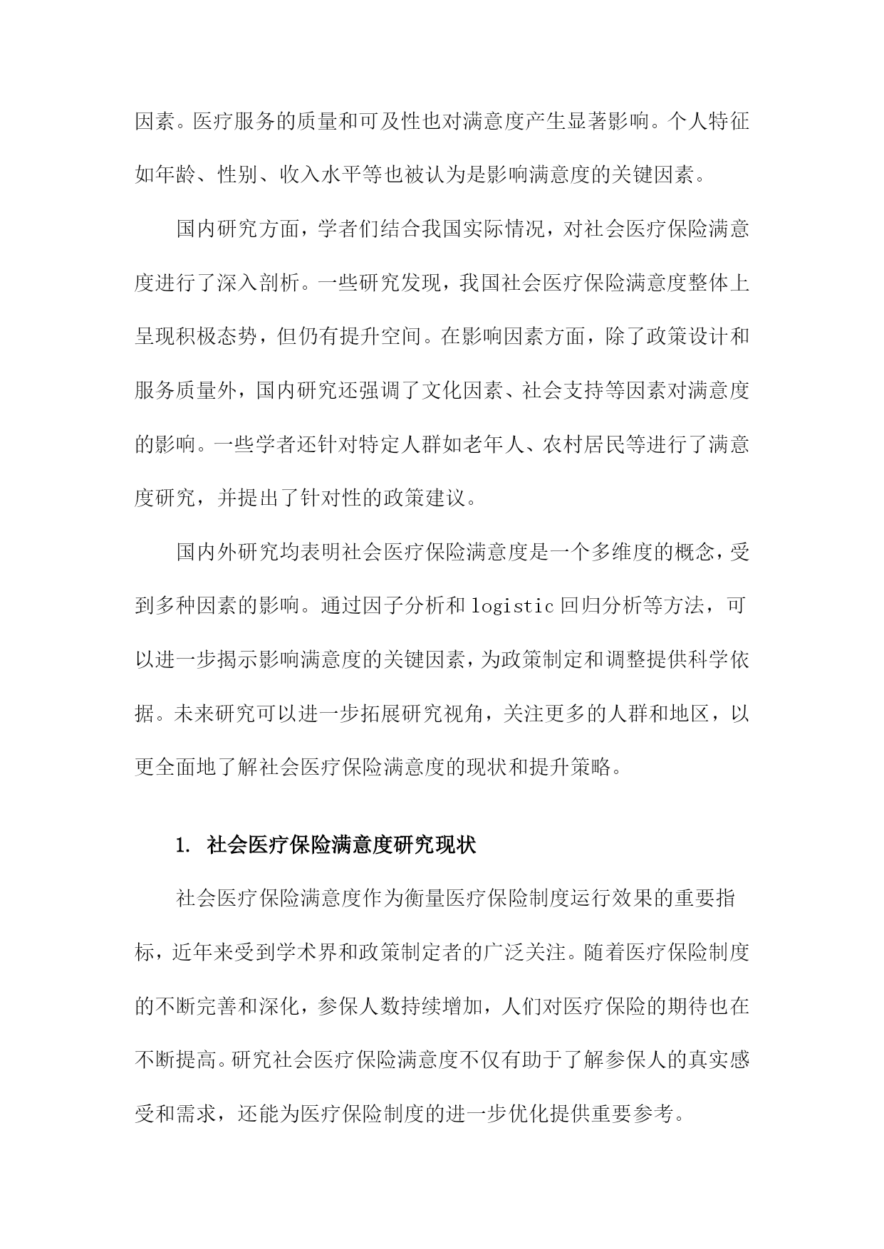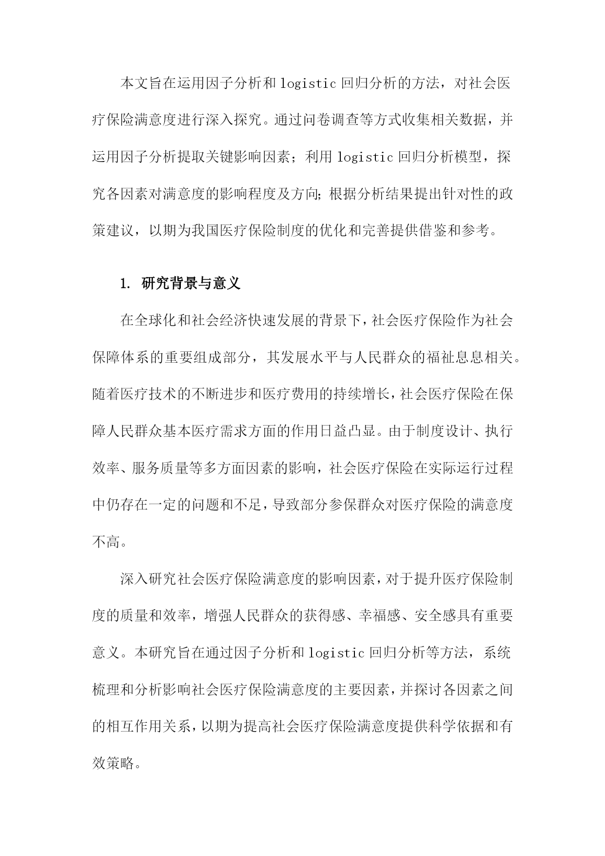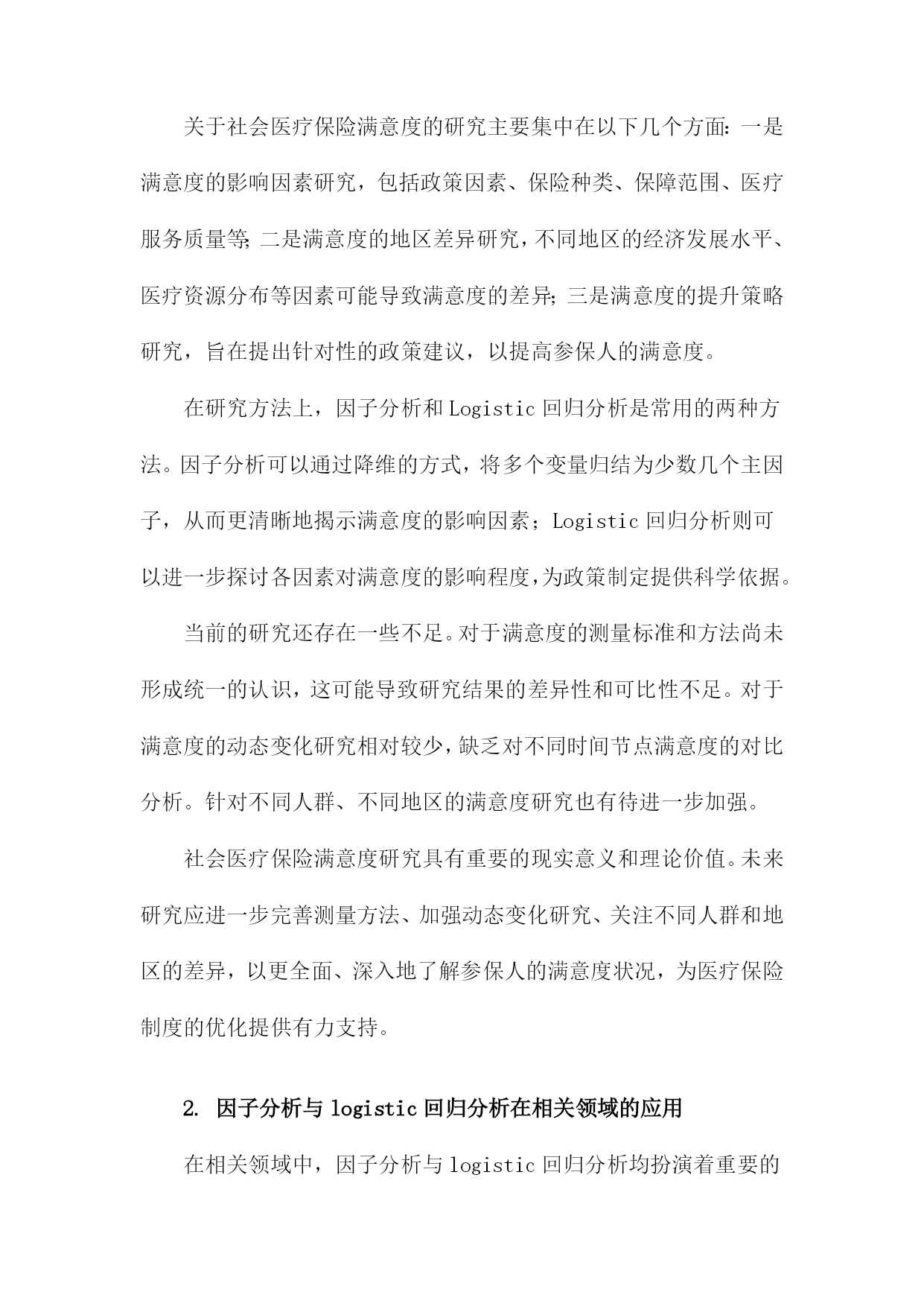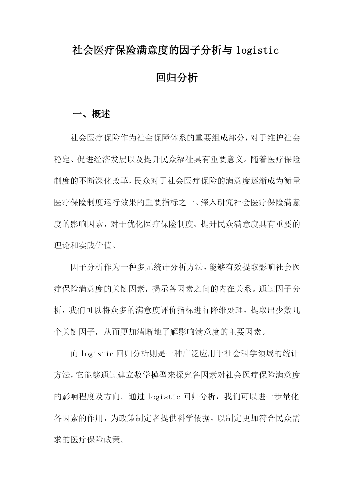 社会医疗保险满意度的因子分析与logistic回归分析一、概述社会医疗保险作为社会保障体系的重要组成部分,对于维护社会稳定、促进经济发展以及提升民众福祉具有重要意义。随着医疗保险制度的不断深化改革,民众对于社会医疗保险的满意度逐渐成为衡量医疗保险制度运行效果的重要指标之一。深入研究社会医疗保险满意度的影响因素,对于优化医疗保险制度、提升民众满意度具有重要的理论和实践价值。因子分析作为一种多元统计分析方法,能够有效提取影响社会医疗保险满意度的关键因素,揭示各因素之间的内在关系。通过因子分析,我们可以将众多的满意度评价指标进行降维处理,提取出少数几个关键因子,从而更加清晰地了解影响满意度的主要因素。而logistic回归分析则是一种广泛应用于社会科学领域的统计方法,它能够通过建立数学模型来探究各因素对社会医疗保险满意度的影响程度及方向。通过logistic回归分析,我们可以进一步量化各因素的作用,为政策制定者提供科学依据,以制定更加符合民众需求的医疗保险政策。本文旨在运用因子分析和logistic回归分析的方法,对社会医疗保险满意度进行深入探究。通过问卷调查等方式收集相关数据,并运用因子分析提取关键影响因素;利用logistic回归分析模型,探究各因素对满意度的影响程度及方向;根据分析结果提出针对性的政策建议,以期为我国医疗保险制度的优化和完善提供借鉴和参考。1.研究背景与意义在全球化和社会经济快速发展的背景下,社会医疗保险作为社会保障体系的重要组成部分,其发展水平与人民群众的福祉息息相关。随着医疗技术的不断进步和医疗费用的持续增长,社会医疗保险在保障人民群众基本医疗需求方面的作用日益凸显。由于制度设计、执行效率、服务质量等多方面因素的影响,社会医疗保险在实际运行过程中仍存在一定的问题和不足,导致部分参保群众对医疗保险的满意度不高。深入研究社会医疗保险满意度的影响因素,对于提升医疗保险制度的质量和效率,增强人民群众的获得感、幸福感、安全感具有重要意义。本研究旨在通过因子分析和logistic回归分析等方法,系统梳理和分析影响社会医疗保险满意度的主要因素,并探讨各因素之间的相互作用关系,以期为提高社会医疗保险满意度提供科学依据和有效策略。通过本研究,我们可以更好地了解参保群众对医疗保险制度的期望和需求,发现制度运行过程中存在的问题和不足,为政府和相关部门制定更加科学合理的医疗保险政策提供参考。本研究也有助于提升医疗保险机构的服务水平和管理能力,促进医疗保险制度的可持续发展,为实现全民健康覆盖目标奠定坚实基础。2.研究目的与问题在《社会医疗保险满意度的因子分析与logistic回归分析》一文的“研究目的与问题”我们可以这样描述:这个段落清晰地阐述了研究的主要目的和要解决的问题,为后续的研究方法和数据分析奠定了基础。二、文献综述社会医疗保险满意度作为衡量医疗保险政策实施效果的重要指标,近年来逐渐受到学术界的广泛关注。国内外学者围绕这一主题开展了大量研究,从不同角度探讨了影响满意度的因素及提升满意度的策略。在国外研究方面,学者们普遍认为社会医疗保险满意度受到多种因素的影响,包括政策设计、服务质量、个人特征等。一些研究指出,医疗保险政策的透明度、公平性和可持续性是影响公众满意度的重要因素。医疗服务的质量和可及性也对满意度产生显著影响。个人特征如年龄、性别、收入水平等也被认为是影响满意度的关键因素。国内研究方面,学者们结合我国实际情况,对社会医疗保险满意度进行了深入剖析。一些研究发现,我国社会医疗保险满意度整体上呈现积极态势,但仍有提升空间。在影响因素方面,除了政策设计和服务质量外,国内研究还强调了文化因素、社会支持等因素对满意度的影响。一些学者还针对特定人群如老年人、农村居民等进行了满意度研究,并提出了针对性的政策建议。国内外研究均表明社会医疗保险满意度是一个多维度的概念,受到多种因素的影响。通过因子分析和logistic回归分析等方法,可以进一步揭示影响满意度的关键因素,为政策制定和调整提供科学依据。未来研究可以进一步拓展研究视角,关注更多的人群和地区,以更全面地了解社会医疗保险满意度的现状和提升策略。1.社会医疗保险满意度研究现状社会医疗保险满意度作为衡量医疗保险制度运行效果的重要指标,近年来受到学术界和政策制定者的广泛关注。随着医疗保险制度的不断完善和深化,参保人数持续增加,人们对医疗保险的期待也在不断提高。研究社会医疗保险满意度不仅有助于了解参保人的真实感受和需求,还能为医疗保险制度的进一步优化提供重要参考。关于社会医疗保险满意度的研究主要集中在以下几个方面:一是满意度的影响因素研究,包括政策因素、保险种类、保障范围、医疗服务质量等;二是满意度的地区差异研究,不同地区的经济发展水平、医疗资源分布等因素可能导致满意度的差异;三是满意度