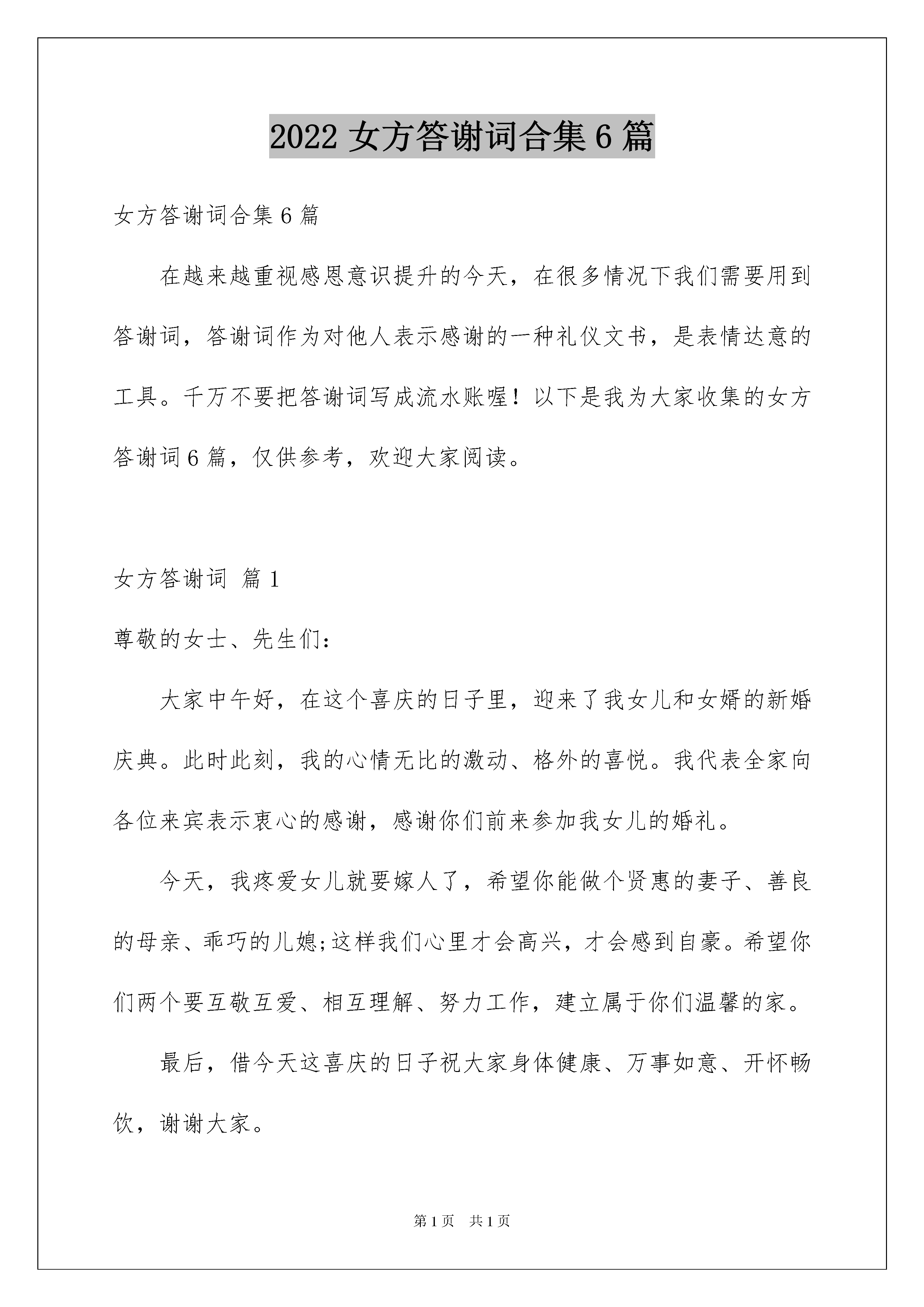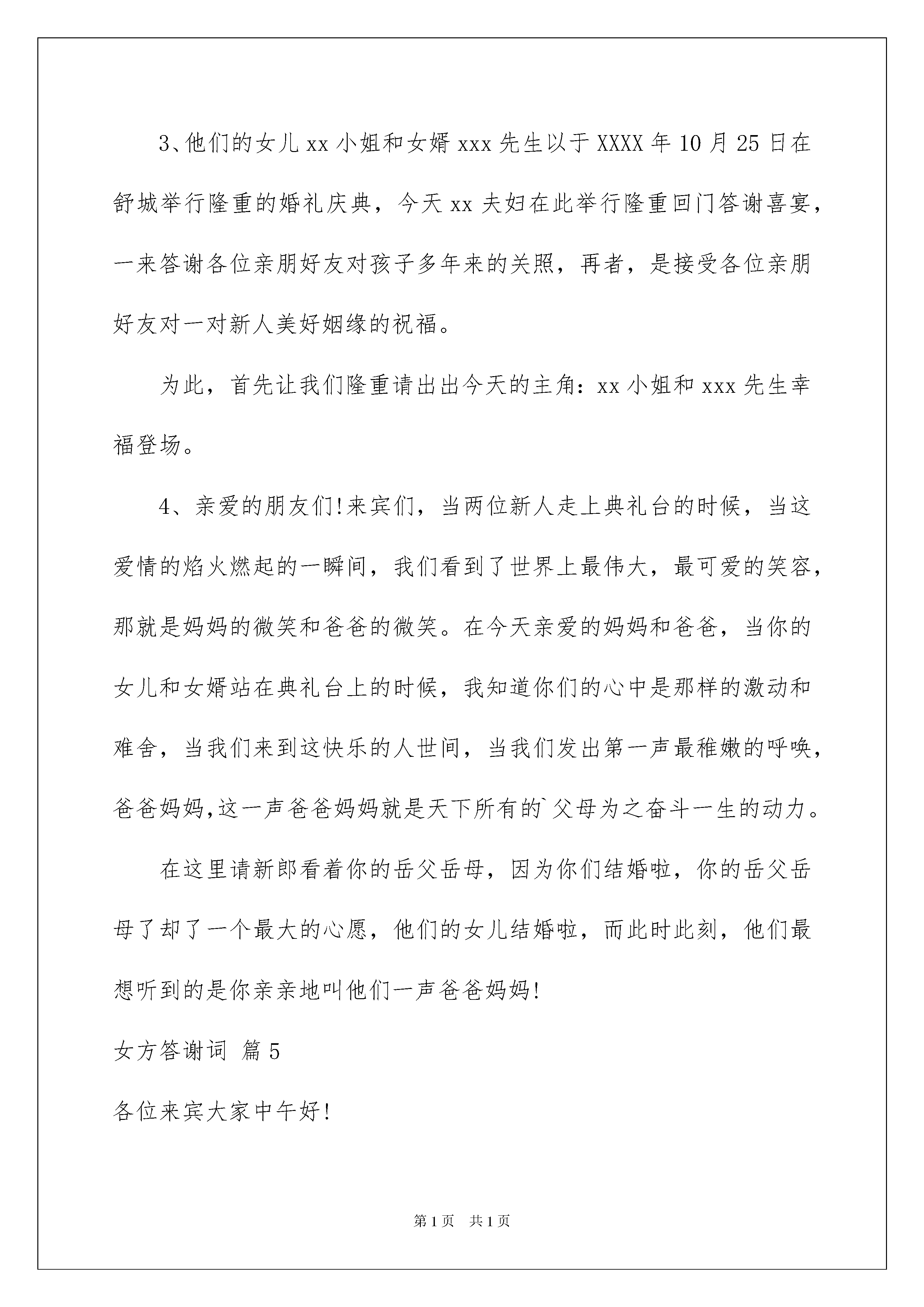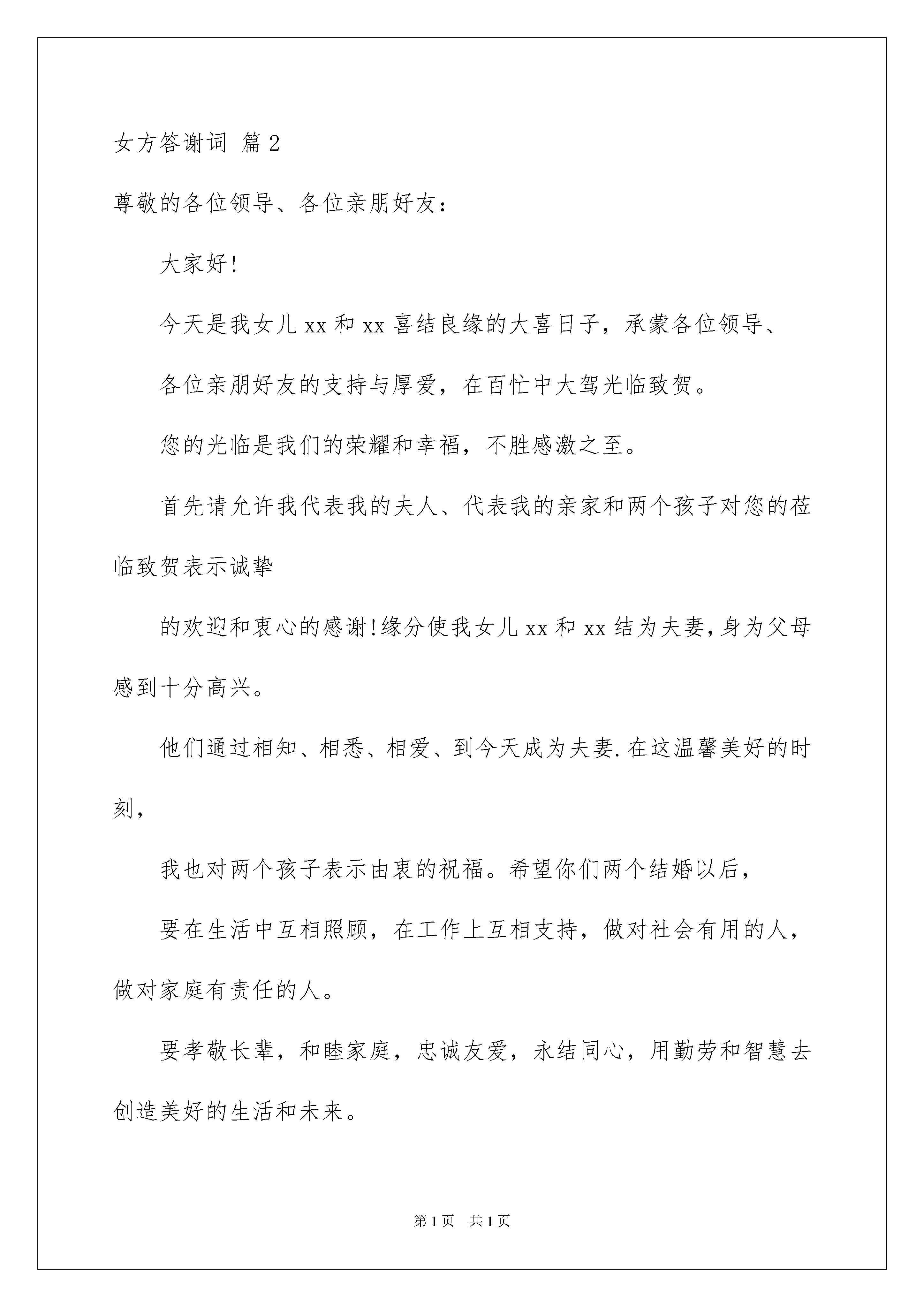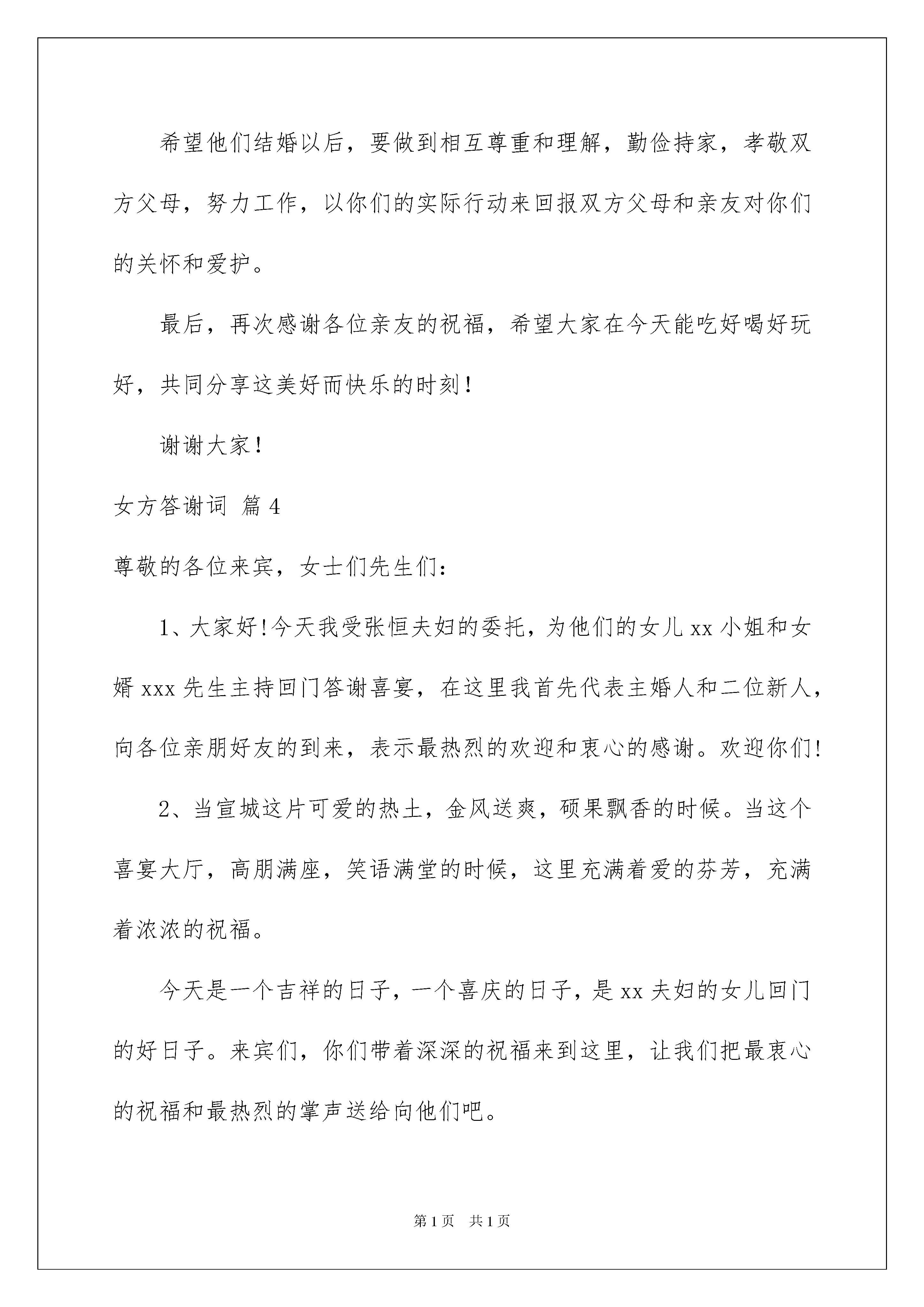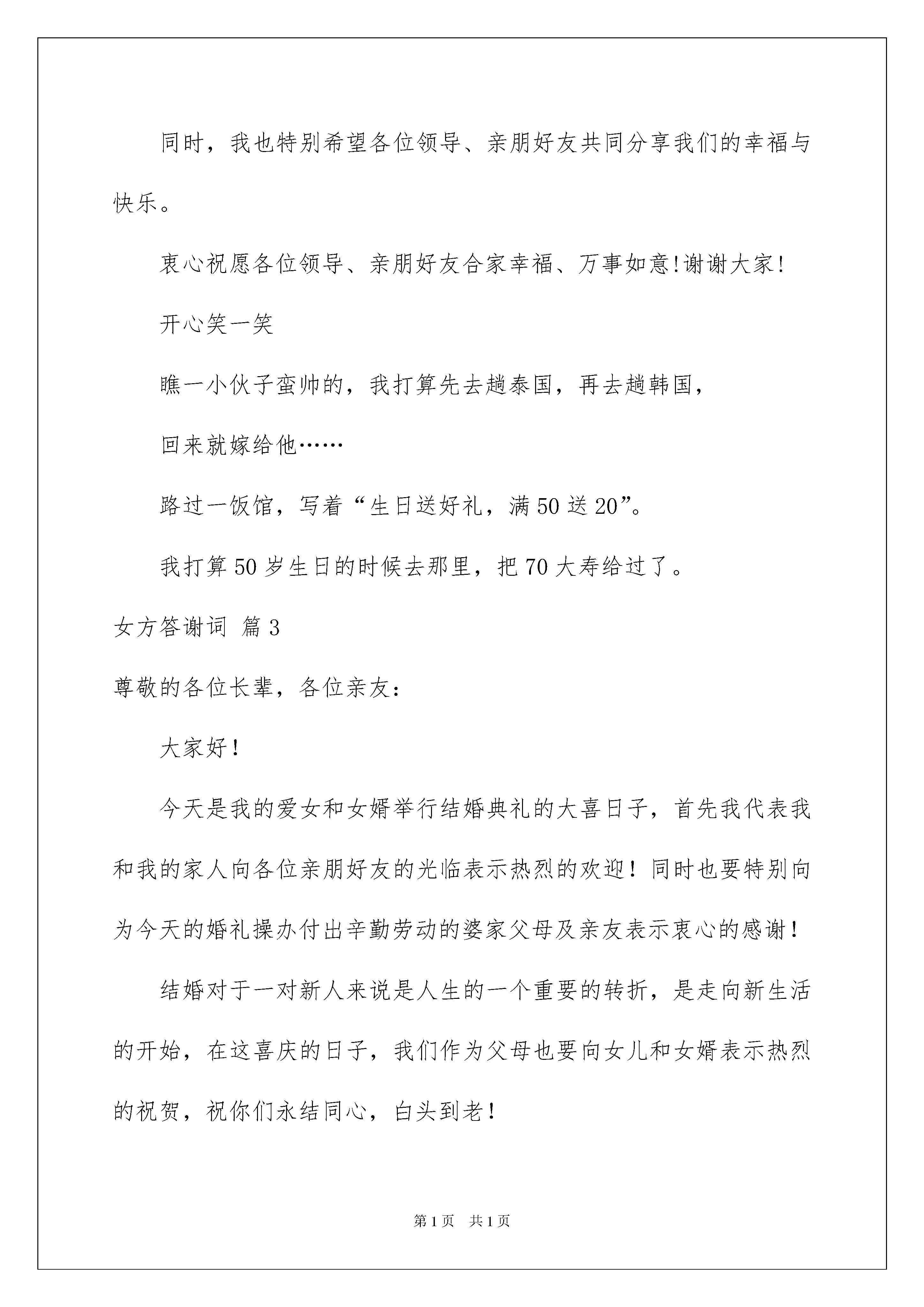 2022女方答谢词合集6篇女方答谢词合集6篇在越来越重视感恩意识提升的今天,在很多情况下我们需要用到答谢词,答谢词作为对他人表示感谢的一种礼仪文书,是表情达意的工具。千万不要把答谢词写成流水账喔!以下是我为大家收集的女方答谢词6篇,仅供参考,欢迎大家阅读。女方答谢词篇1尊敬的女士、先生们:大家中午好,在这个喜庆的日子里,迎来了我女儿和女婿的新婚庆典。此时此刻,我的心情无比的激动、格外的喜悦。我代表全家向各位来宾表示衷心的感谢,感谢你们前来参加我女儿的婚礼。今天,我疼爱女儿就要嫁人了,希望你能做个贤惠的妻子、善良的母亲、乖巧的儿媳;这样我们心里才会高兴,才会感到自豪。希望你们两个要互敬互爱、相互理解、努力工作,建立属于你们温馨的家。最后,借今天这喜庆的日子祝大家身体健康、万事如意、开怀畅饮,谢谢大家。女方答谢词篇2尊敬的各位领导、各位亲朋好友:大家好!今天是我女儿xx和xx喜结良缘的大喜日子,承蒙各位领导、各位亲朋好友的支持与厚爱,在百忙中大驾光临致贺。您的光临是我们的荣耀和幸福,不胜感激之至。首先请允许我代表我的夫人、代表我的亲家和两个孩子对您的莅临致贺表示诚挚的欢迎和衷心的感谢!缘分使我女儿xx和xx结为夫妻,身为父母感到十分高兴。他们通过相知、相悉、相爱、到今天成为夫妻.在这温馨美好的时刻,我也对两个孩子表示由衷的祝福。希望你们两个结婚以后,要在生活中互相照顾,在工作上互相支持,做对社会有用的人,做对家庭有责任的人。要孝敬长辈,和睦家庭,忠诚友爱,永结同心,用勤劳和智慧去创造美好的生活和未来。同时,我也特别希望各位领导、亲朋好友共同分享我们的幸福与快乐。衷心祝愿各位领导、亲朋好友合家幸福、万事如意!谢谢大家!开心笑一笑瞧一小伙子蛮帅的,我打算先去趟泰国,再去趟韩国,回来就嫁给他……路过一饭馆,写着“生日送好礼,满50送20”。我打算50岁生日的时候去那里,把70大寿给过了。女方答谢词篇3尊敬的各位长辈,各位亲友:大家好!今天是我的爱女和女婿举行结婚典礼的大喜日子,首先我代表我和我的家人向各位亲朋好友的光临表示热烈的欢迎!同时也要特别向为今天的婚礼操办付出辛勤劳动的婆家父母及亲友表示衷心的感谢!结婚对于一对新人来说是人生的一个重要的转折,是走向新生活的开始,在这喜庆的日子,我们作为父母也要向女儿和女婿表示热烈的祝贺,祝你们永结同心,白头到老!希望他们结婚以后,要做到相互尊重和理解,勤俭持家,孝敬双方父母,努力工作,以你们的实际行动来回报双方父母和亲友对你们的关怀和爱护。最后,再次感谢各位亲友的祝福,希望大家在今天能吃好喝好玩好,共同分享这美好而快乐的时刻!谢谢大家!女方答谢词篇4尊敬的各位来宾,女士们先生们:1、大家好!今天我受张恒夫妇的委托,为他们的女儿xx小姐和女婿xxx先生主持回门答谢喜宴,在这里我首先代表主婚人和二位新人,向各位亲朋好友的到来,表示最热烈的欢迎和衷心的感谢。欢迎你们!2、当宣城这片可爱的热土,金风送爽,硕果飘香的时候。当这个喜宴大厅,高朋满座,笑语满堂的时候,这里充满着爱的芬芳,充满着浓浓的祝福。今天是一个吉祥的日子,一个喜庆的日子,是xx夫妇的女儿回门的好日子。来宾们,你们带着深深的祝福来到这里,让我们把最衷心的祝福和最热烈的掌声送给向他们吧。3、他们的女儿xx小姐和女婿xxx先生以于XXXX年10月25日在舒城举行隆重的婚礼庆典,今天xx夫妇在此举行隆重回门答谢喜宴,一来答谢各位亲朋好友对孩子多年来的关照,再者,是接受各位亲朋好友对一对新人美好姻缘的祝福。为此,首先让我们隆重请出出今天的主角:xx小姐和xxx先生幸福登场。4、亲爱的朋友们!来宾们,当两位新人走上典礼台的时候,当这爱情的焰火燃起的一瞬间,我们看到了世界上最伟大,最可爱的笑容,那就是妈妈的微笑和爸爸的微笑。在今天亲爱的妈妈和爸爸,当你的女儿和女婿站在典礼台上的时候,我知道你们的心中是那样的激动和难舍,当我们来到这快乐的人世间,当我们发出第一声最稚嫩的呼唤,爸爸妈妈,这一声爸爸妈妈就是天下所有的`父母为之奋斗一生的动力。在这里请新郎看着你的岳父岳母,因为你们结婚啦,你的岳父岳母了却了一个最大的心愿,他们的女儿结婚啦,而此时此刻,他们最想听到的是你亲亲地叫他们一声爸爸妈妈!女方答谢词篇5各位来宾大家中午好!在这个祥和、喜庆的日子里,迎来了我爱女和我爱婿的新婚庆典。此时此刻,我的心情是无比的激动、心情是格外的喜悦。我代表我们全家向各位亲朋好友表示衷心的感谢!感谢你们从百忙之中来参加我爱女的新婚庆典,再一次的感谢你们,谢谢!“责任”这个名词是神圣的,是伟大的;我和你母亲在今天已完成了我们