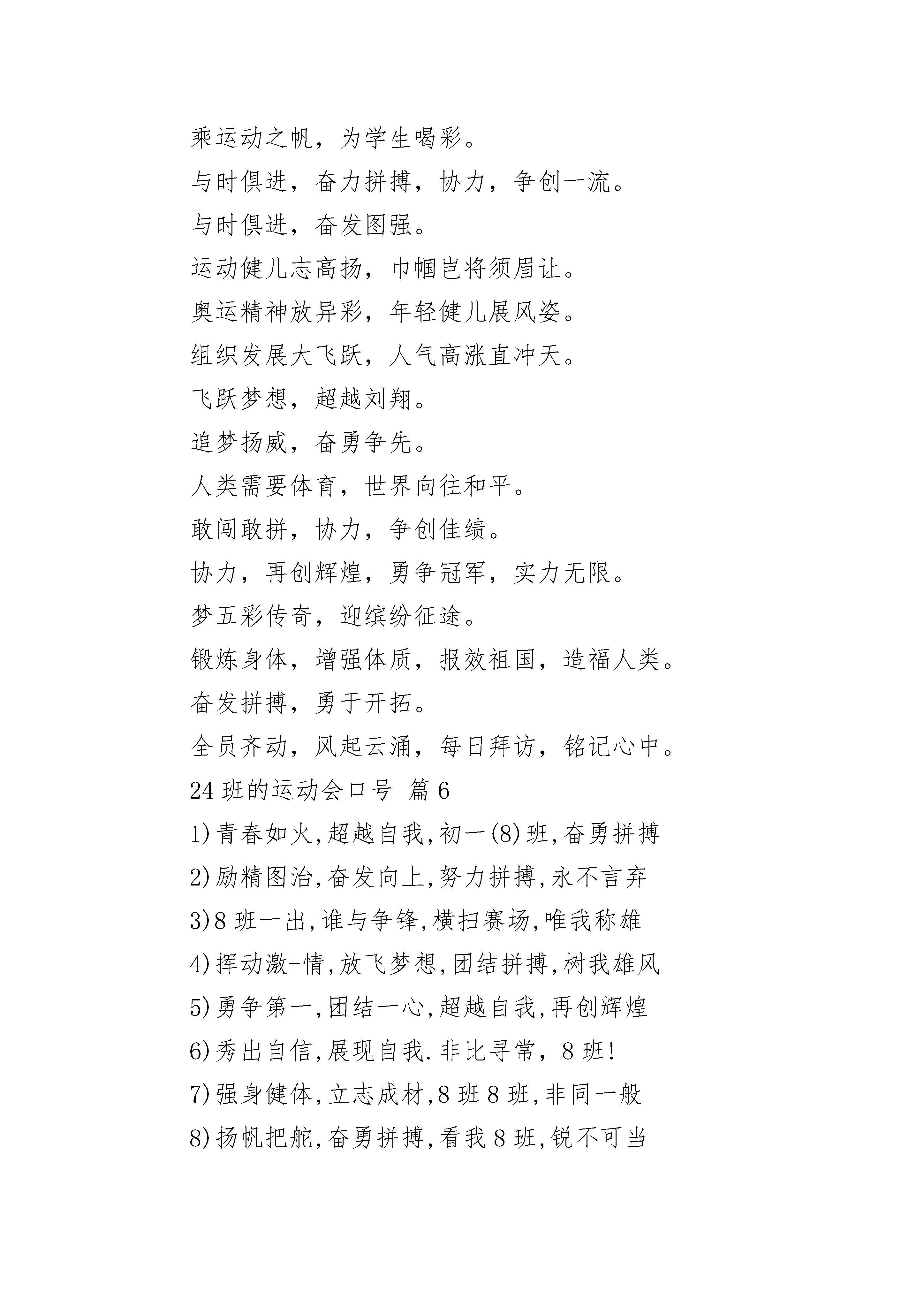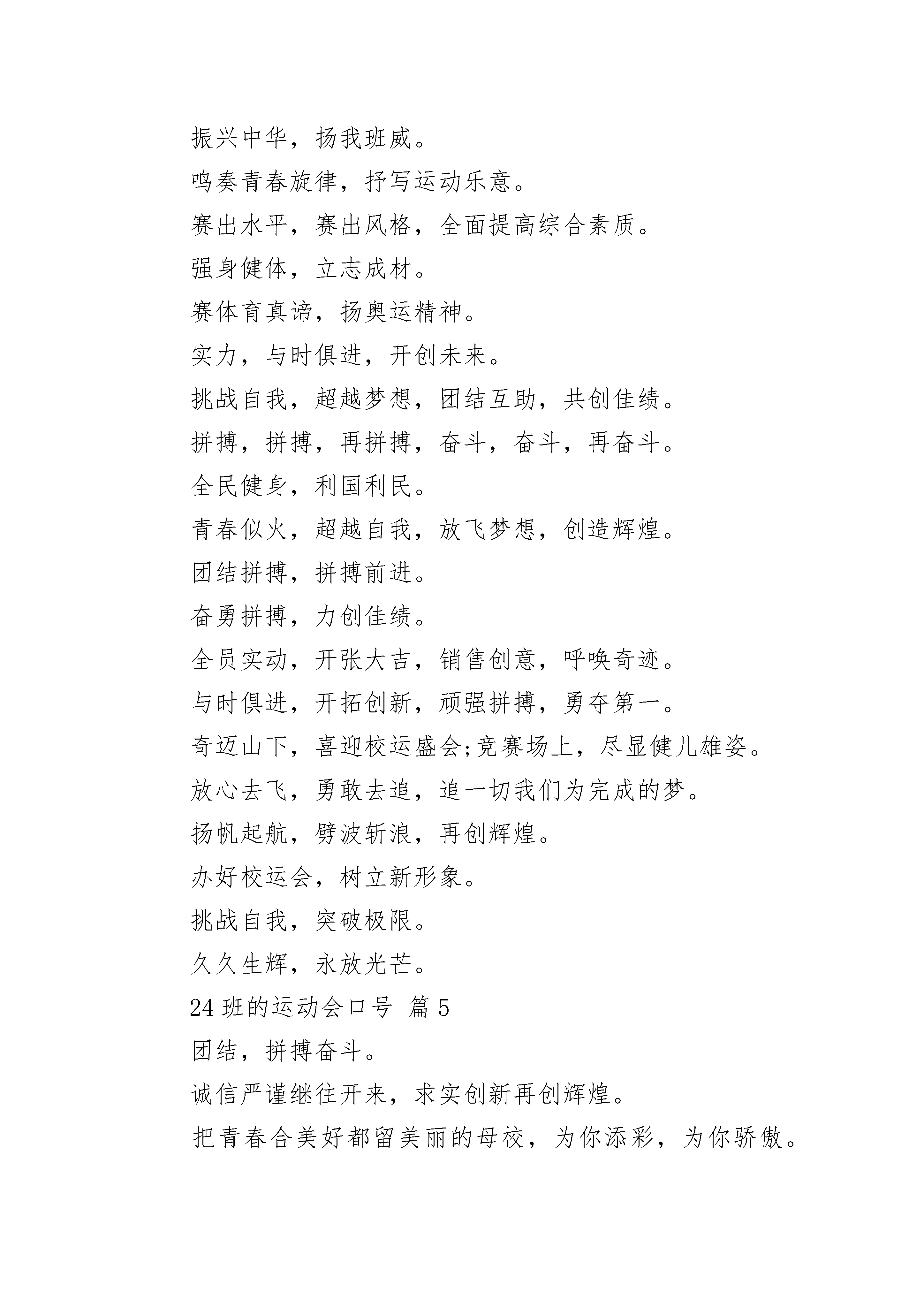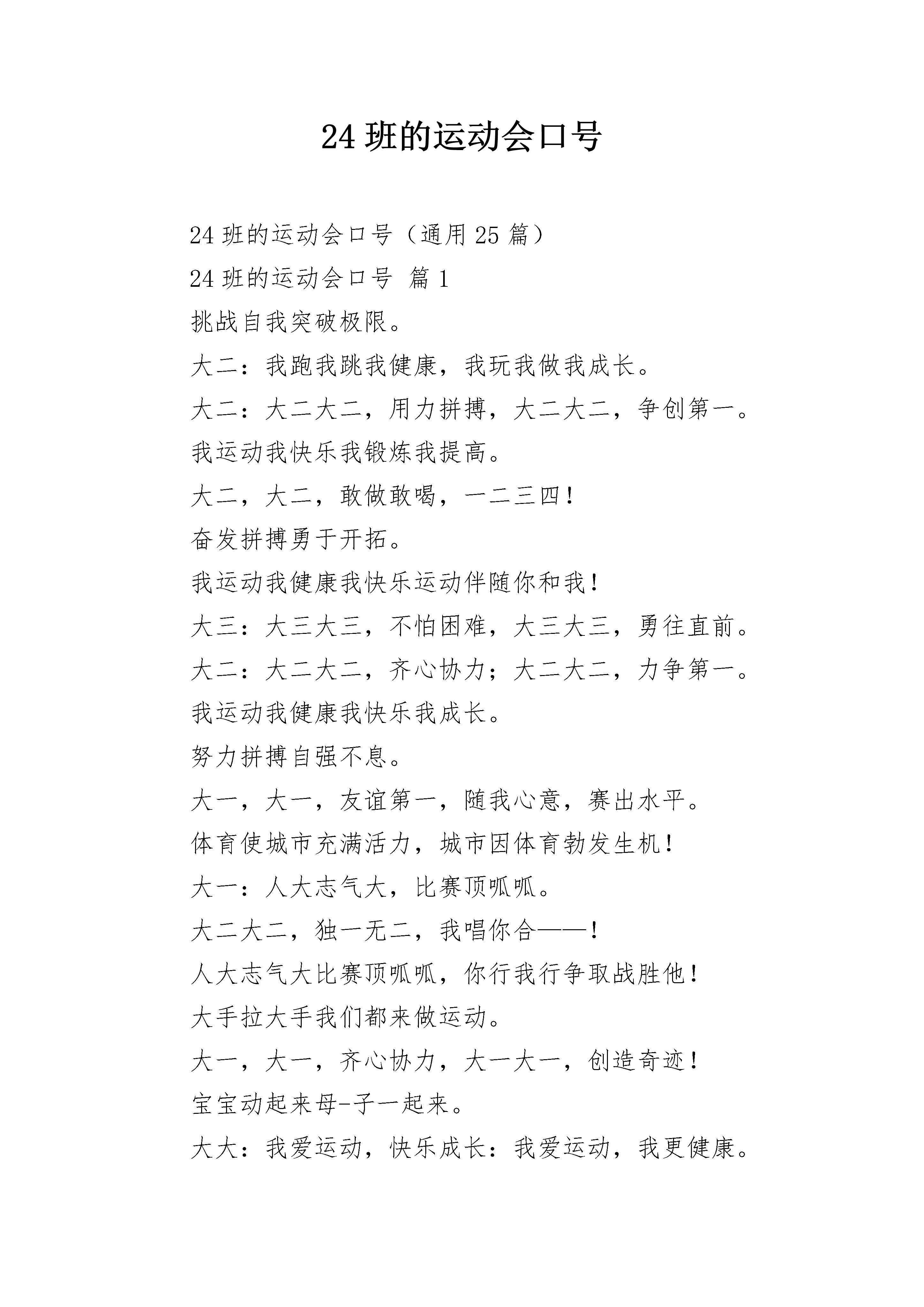24班的运动会口号24班的运动会口号(通用25篇)24班的运动会口号篇1挑战自我突破极限。大二:我跑我跳我健康,我玩我做我成长。大二:大二大二,用力拼搏,大二大二,争创第一。我运动我快乐我锻炼我提高。大二,大二,敢做敢喝,一二三四!奋发拼搏勇于开拓。我运动我健康我快乐运动伴随你和我!大三:大三大三,不怕困难,大三大三,勇往直前。大二:大二大二,齐心协力;大二大二,力争第一。我运动我健康我快乐我成长。努力拼搏自强不息。大一,大一,友谊第一,随我心意,赛出水平。体育使城市充满活力,城市因体育勃发生机!大一:人大志气大,比赛顶呱呱。大二大二,独一无二,我唱你合——!人大志气大比赛顶呱呱,你行我行争取战胜他!大手拉大手我们都来做运动。大一,大一,齐心协力,大一大一,创造奇迹!宝宝动起来母-子一起来。大大:我爱运动,快乐成长:我爱运动,我更健康。大一大一,顽强拼搏;大一大一,非比寻常。亲子有方运动有益。24班的运动会口号篇2飞跃梦想超越刘翔。青春无畏,逐梦扬威。努力拼搏,永夺第一。赛出风格赛出水平。更强我能更快更高。团结文明展现风采。强强强强,我是,超越刘翔,不准投降。我运动我健康我快乐,健康宝贝就是我!比出风采超越自我。大一大一,放飞梦想;团结拼搏,树我雄风!努力奋斗勇敢争先。大三:一二三四五六七,大三永远争第一。顽强拼搏,拥抱胜利;大一大一,非同一般!大一:大一大一,勇者无敌:胜利胜利,始终如一。大三:看我大三班,实力不一般。亲子爱子教子家和家兴家美。团结拼搏拼搏进。赛出成绩安全第一。大三大三,永摘桂冠!大三大三,雄霸一方,威震四方——!宝宝动起来母子一起来。我运动我健康我快乐我是最棒的。奋勇拼搏,展现自我;大一大一,绝不简单!24班的运动会口号篇3全民健身,利国利民,功在当代,利在千秋!拼搏追取善学勤。人类需要体育,世界向往和和平!大手拉大手,健康好未来。大一:运动向前冲,一班我最牛。文明守纪拥抱胜利。扭扭屁股扭扭腰,马上就会长高高。动动手呀动动脚,身体就像棒棒糖。运动起来勇敢第一。人人关心体育,体育造福人人!大四:我爱运动,快乐成长;我爱运动,我更健康。团结拼搏争创佳绩。我运动我健康我快乐我阳光。追梦扬威奋勇争先。团结第一,比赛第二。友谊第一比赛第二。天道酬勤健康起来。开展全民健身运动,全面建设大康社会!大一大一,勇夺桂冠;齐心协力,共创辉煌!大一,大一,勇者无敌,胜利胜利,始终如一!24班的运动会口号篇4振兴中华,扬我班威。鸣奏青春旋律,抒写运动乐意。赛出水平,赛出风格,全面提高综合素质。强身健体,立志成材。赛体育真谛,扬奥运精神。实力,与时俱进,开创未来。挑战自我,超越梦想,团结互助,共创佳绩。拼搏,拼搏,再拼搏,奋斗,奋斗,再奋斗。全民健身,利国利民。青春似火,超越自我,放飞梦想,创造辉煌。团结拼搏,拼搏前进。奋勇拼搏,力创佳绩。全员实动,开张大吉,销售创意,呼唤奇迹。与时俱进,开拓创新,顽强拼搏,勇夺第一。奇迈山下,喜迎校运盛会;竞赛场上,尽显健儿雄姿。放心去飞,勇敢去追,追一切我们为完成的梦。扬帆起航,劈波斩浪,再创辉煌。办好校运会,树立新形象。挑战自我,突破极限。久久生辉,永放光芒。24班的运动会口号篇5团结,拼搏奋斗。诚信严谨继往开来,求实创新再创辉煌。把青春合美好都留美丽的母校,为你添彩,为你骄傲。乘运动之帆,为学生喝彩。与时俱进,奋力拼搏,协力,争创一流。与时俱进,奋发图强。运动健儿志高扬,巾帼岂将须眉让。奥运精神放异彩,年轻健儿展风姿。组织发展大飞跃,人气高涨直冲天。飞跃梦想,超越刘翔。追梦扬威,奋勇争先。人类需要体育,世界向往和平。敢闯敢拼,协力,争创佳绩。协力,再创辉煌,勇争冠军,实力无限。梦五彩传奇,迎缤纷征途。锻炼身体,增强体质,报效祖国,造福人类。奋发拼搏,勇于开拓。全员齐动,风起云涌,每日拜访,铭记心中。24班的运动会口号篇61)青春如火,超越自我,初一(8)班,奋勇拼搏2)励精图治,奋发向上,努力拼搏,永不言弃3)8班一出,谁与争锋,横扫赛场,唯我称雄4)挥动激-情,放飞梦想,团结拼搏,树我雄风5)勇争第一,团结一心,超越自我,再创辉煌6)秀出自信,展现自我.非比寻常,8班!7)强身健体,立志成材,8班8班,非同一般8)扬帆把舵,奋勇拼搏,看我8班,锐不可当9)加油必胜我们是的.预祝大会圆满成功10)兔子并不可怕怕的是没有战胜兔子的勇气我们能赢.让我们去努力.11)拼搏进取自强不息12)谁敢横刀立马唯我二班健儿一万年太久只争分秒13)谁更快,拼了才知道14)鱼跃龙门奋力一搏15)乘运动之风为生命喝彩16)扬帆把舵,奋勇拼搏17)看我×班,锐不可当18)与时俱进,奋力拼搏19)齐心协力,争创一流20)团结拼搏,争创伟绩24班的运动会口号篇7努力拼搏,永夺第一。全民健身,利国利民,功在当代,利在