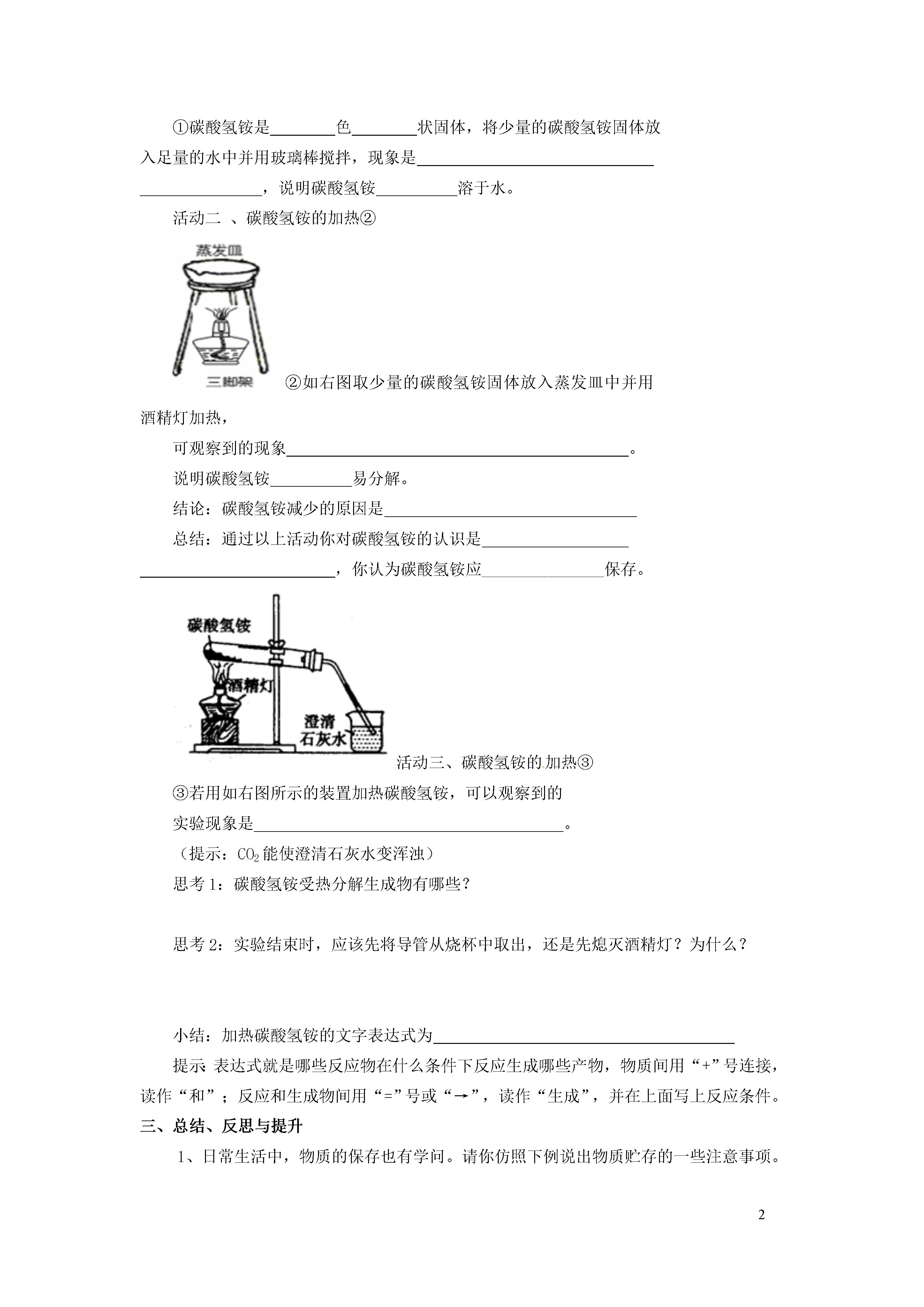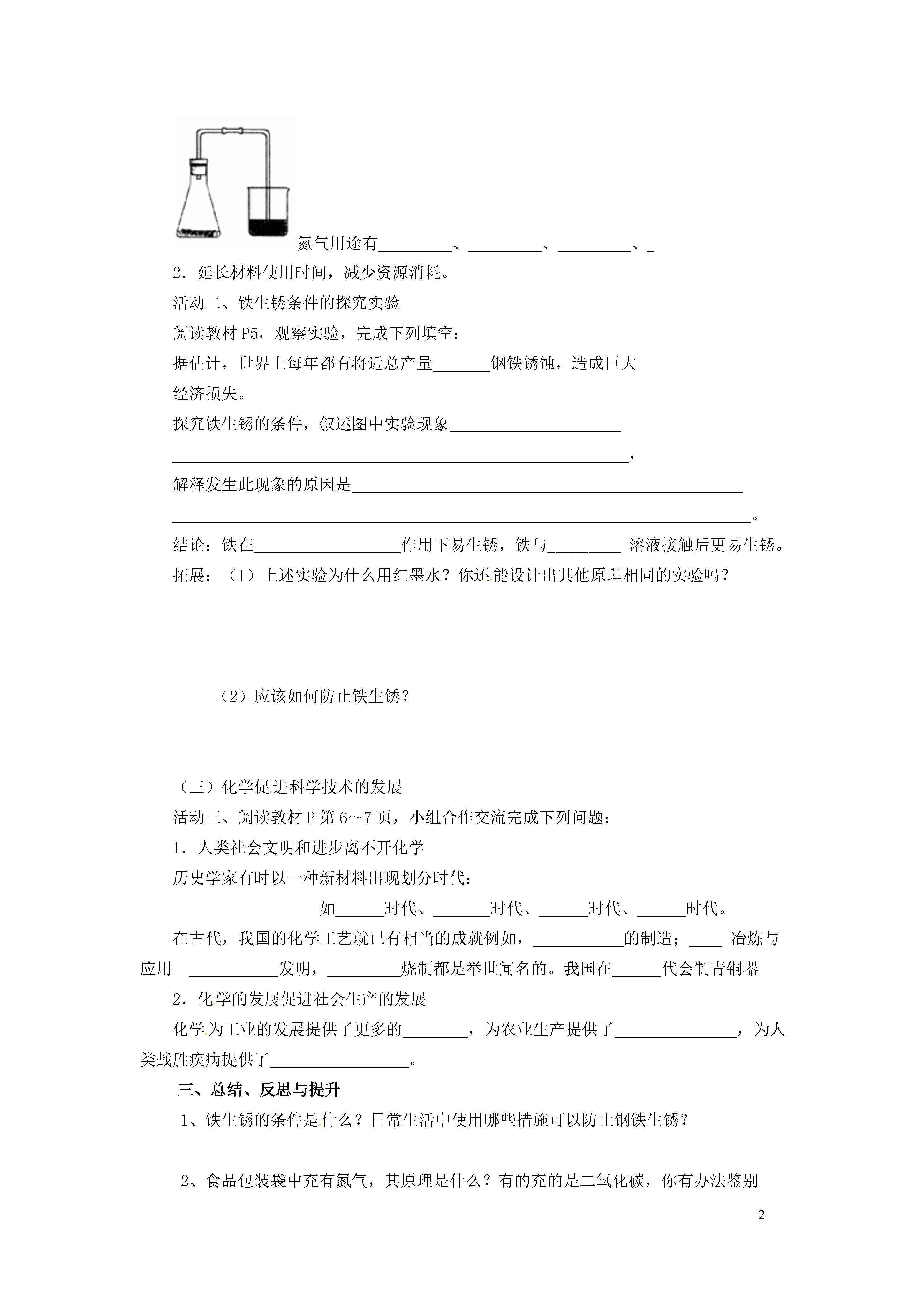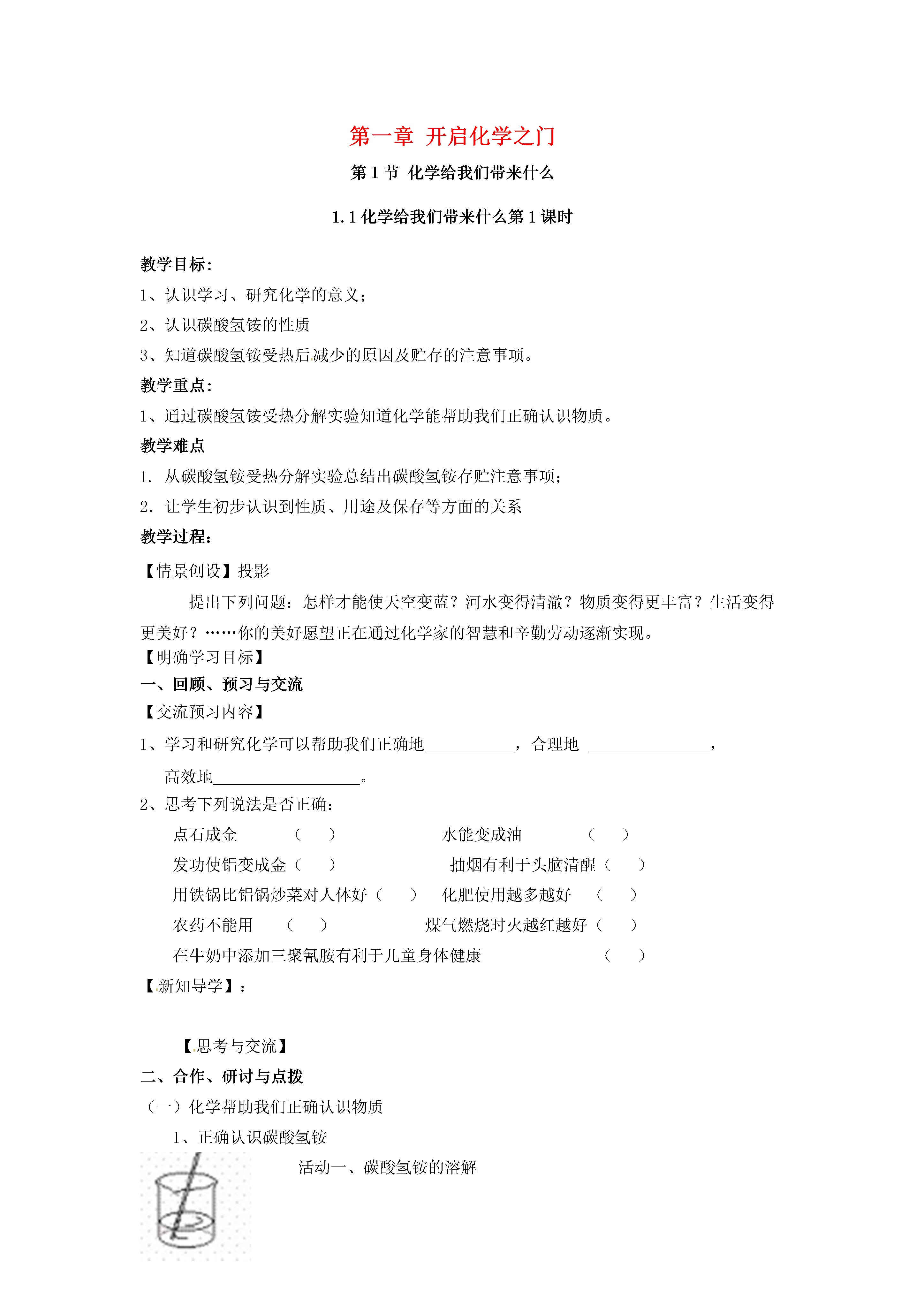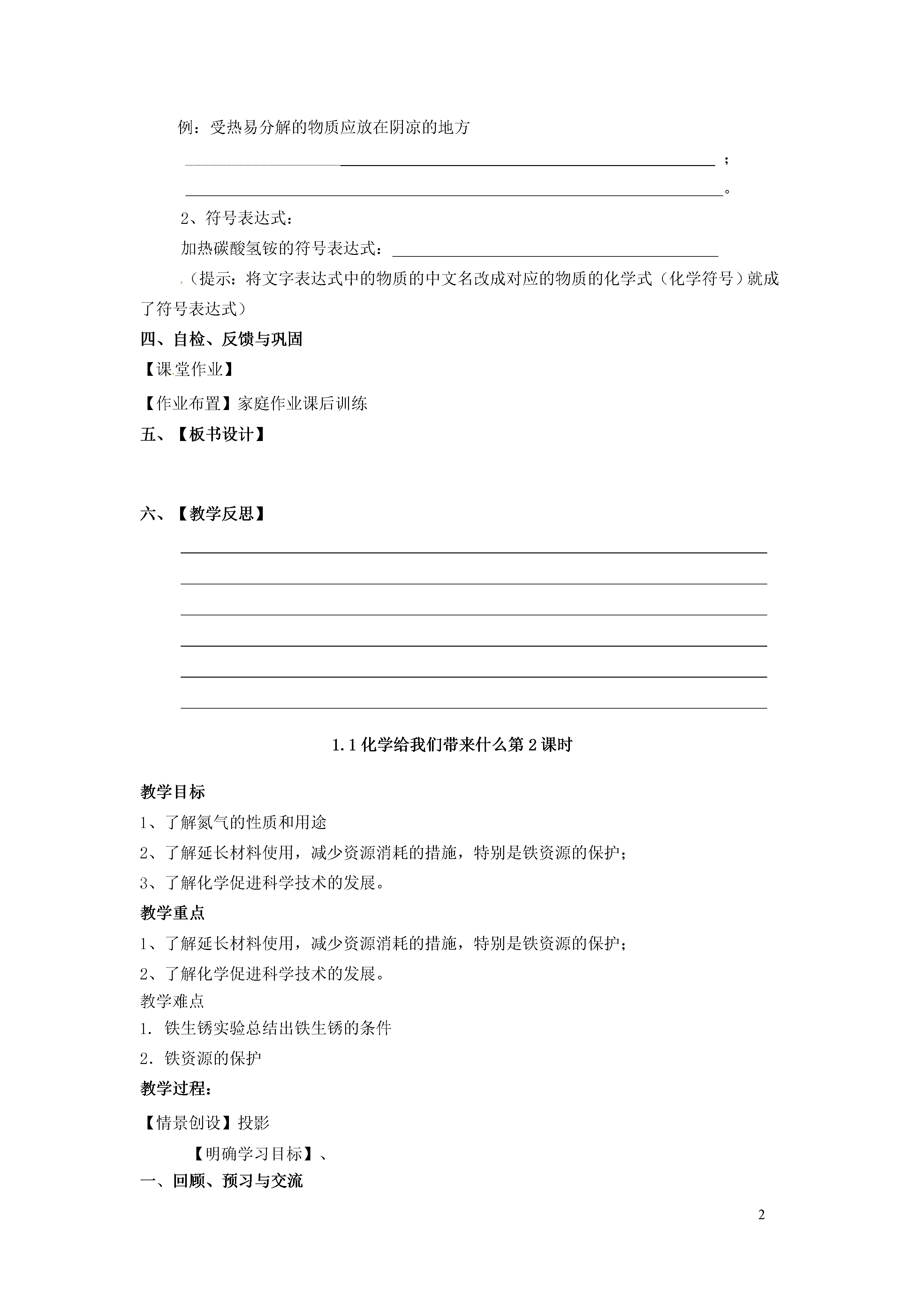 2第一章开启化学之门第1节化学给我们带来什么1.1化学给我们带来什么第1课时教学目标:1、认识学习、研究化学的意义;2、认识碳酸氢铵的性质3、知道碳酸氢铵受热后减少的原因及贮存的注意事项。教学重点:1、通过碳酸氢铵受热分解实验知道化学能帮助我们正确认识物质。教学难点1.从碳酸氢铵受热分解实验总结出碳酸氢铵存贮注意事项;2.让学生初步认识到性质、用途及保存等方面的关系教学过程:【情景创设】投影提出下列问题:怎样才能使天空变蓝?河水变得清澈?物质变得更丰富?生活变得更美好?……你的美好愿望正在通过化学家的智慧和辛勤劳动逐渐实现。【明确学习目标】一、回顾、预习与交流【交流预习内容】1、学习和研究化学可以帮助我们正确地,合理地,高效地。2、思考下列说法是否正确:点石成金()水能变成油()发功使铝变成金()抽烟有利于头脑清醒()用铁锅比铝锅炒菜对人体好()化肥使用越多越好()农药不能用()煤气燃烧时火越红越好()在牛奶中添加三聚氰胺有利于儿童身体健康()【新知导学】:【思考与交流】二、合作、研讨与点拨(一)化学帮助我们正确认识物质1、正确认识碳酸氢铵活动一、碳酸氢铵的溶解①碳酸氢铵是色状固体,将少量的碳酸氢铵固体放入足量的水中并用玻璃棒搅拌,现象是,说明碳酸氢铵溶于水。活动二、碳酸氢铵的加热②②如右图取少量的碳酸氢铵固体放入蒸发皿中并用酒精灯加热,可观察到的现象。说明碳酸氢铵易分解。结论:碳酸氢铵减少的原因是总结:通过以上活动你对碳酸氢铵的认识是,你认为碳酸氢铵应_______________保存。活动三、碳酸氢铵的加热③③若用如右图所示的装置加热碳酸氢铵,可以观察到的实验现象是。(提示:CO2能使澄清石灰水变浑浊)思考1:碳酸氢铵受热分解生成物有哪些?思考2:实验结束时,应该先将导管从烧杯中取出,还是先熄灭酒精灯?为什么?小结:加热碳酸氢铵的文字表达式为提示:表达式就是哪些反应物在什么条件下反应生成哪些产物,物质间用“+”号连接,读作“和”;反应和生成物间用“=”号或“→”,读作“生成”,并在上面写上反应条件。三、总结、反思与提升1、日常生活中,物质的保存也有学问。请你仿照下例说出物质贮存的一些注意事项。例:受热易分解的物质应放在阴凉的地方___________________;。2、符号表达式:加热碳酸氢铵的符号表达式:(提示:将文字表达式中的物质的中文名改成对应的物质的化学式(化学符号)就成了符号表达式)四、自检、反馈与巩固【课堂作业】【作业布置】家庭作业课后训练五、【板书设计】六、【教学反思】1.1化学给我们带来什么第2课时教学目标1、了解氮气的性质和用途2、了解延长材料使用,减少资源消耗的措施,特别是铁资源的保护;3、了解化学促进科学技术的发展。教学重点1、了解延长材料使用,减少资源消耗的措施,特别是铁资源的保护;2、了解化学促进科学技术的发展。教学难点1.铁生锈实验总结出铁生锈的条件2.铁资源的保护教学过程:【情景创设】投影【明确学习目标】、一、回顾、预习与交流【旧知回顾】:①碳酸氢铵是色固体,将少量的碳酸氢铵固体放入足量的水中并用玻璃棒搅拌,现象是,说明碳酸氢铵溶于水。②取少量的碳酸氢铵固体放入蒸发皿中并放在酒精灯上加热,可观察到的现象。说明碳酸氢铵易分解。③若用如右图所示的装置加热碳酸氢铵,可以观察到的实验现象是。(提示:CO2能使澄清石灰水变浑浊)思考1:碳酸氢铵受热分解生成物有哪些?思考2:实验结束时,应该先将导管从烧杯中取出,还是先熄灭酒精灯?为什么?小结:加热碳酸氢铵的文字表达式为【新知导学】:化学帮助我们物质;化学指导人类资源;化学促进科学技术的。二、合作、研讨与点拨(二)化学指导人类合理利用资源1.空气中的氮气资源活动一、阅读教材理解氮气的性质与用途空气中的氮气很,在常温下很(难或易)与其他物质发生反应氮气用途有、、、2.延长材料使用时间,减少资源消耗。活动二、铁生锈条件的探究实验阅读教材P5,观察实验,完成下列填空:据估计,世界上每年都有将近总产量钢铁锈蚀,造成巨大经济损失。探究铁生锈的条件,叙述图中实验现象,解释发生此现象的原因是。结论:铁在作用下易生锈,铁与_________溶液接触后更易生锈。拓展:(1)上述实验为什么用红墨水?你还能设计出其他原理相同的实验吗?(2)应该如何防止铁生锈?(三)化学促进科学技术的发展活动三、阅读教材P第6~7页,小组合作交流完成下列问题:1.人类社会文明和进步离不开化学历史学家有时以一种