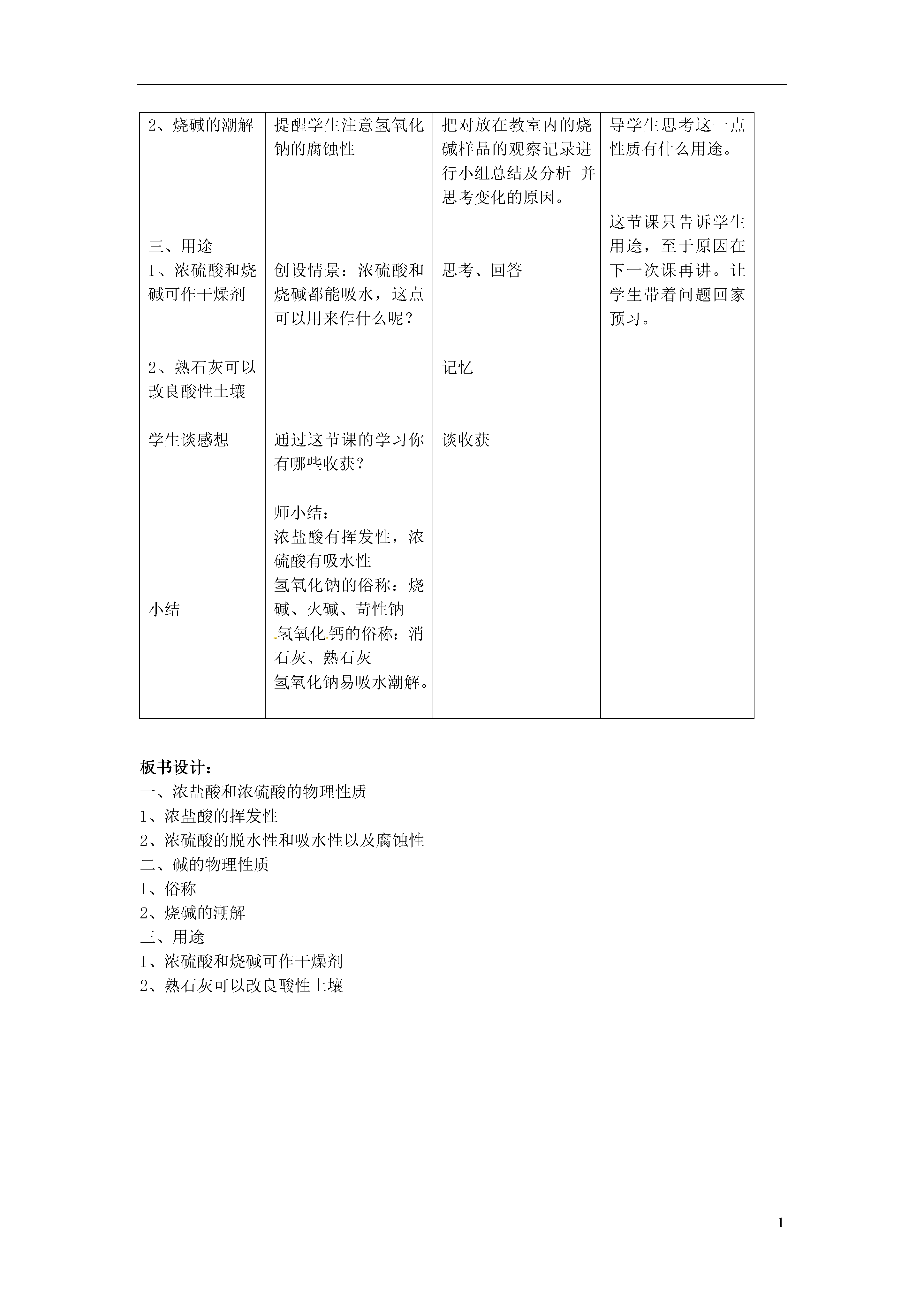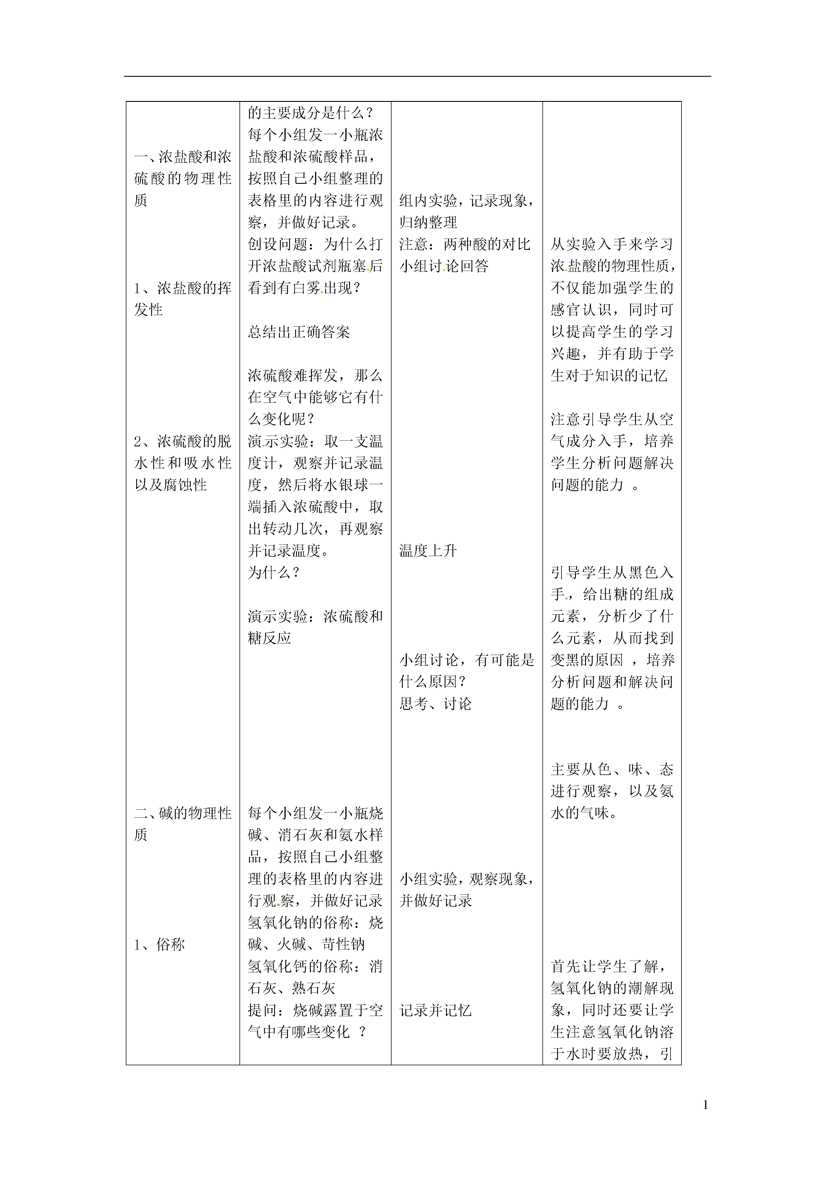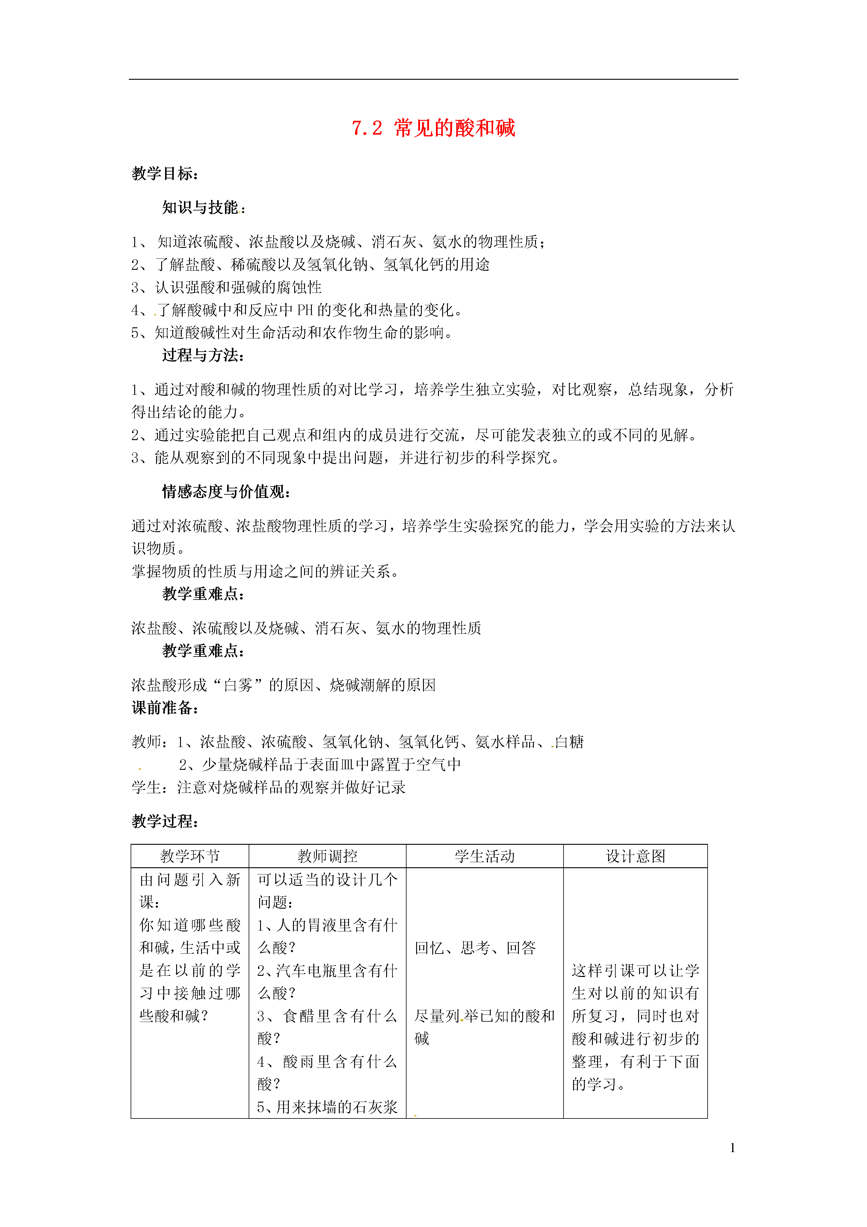 17.2常见的酸和碱教学目标:知识与技能:知道浓硫酸、浓盐酸以及烧碱、消石灰、氨水的物理性质;2、了解盐酸、稀硫酸以及氢氧化钠、氢氧化钙的用途3、认识强酸和强碱的腐蚀性4、了解酸碱中和反应中PH的变化和热量的变化。5、知道酸碱性对生命活动和农作物生命的影响。过程与方法:1、通过对酸和碱的物理性质的对比学习,培养学生独立实验,对比观察,总结现象,分析得出结论的能力。2、通过实验能把自己观点和组内的成员进行交流,尽可能发表独立的或不同的见解。3、能从观察到的不同现象中提出问题,并进行初步的科学探究。情感态度与价值观:通过对浓硫酸、浓盐酸物理性质的学习,培养学生实验探究的能力,学会用实验的方法来认识物质。掌握物质的性质与用途之间的辨证关系。教学重难点:浓盐酸、浓硫酸以及烧碱、消石灰、氨水的物理性质教学重难点:浓盐酸形成“白雾”的原因、烧碱潮解的原因课前准备:教师:1、浓盐酸、浓硫酸、氢氧化钠、氢氧化钙、氨水样品、白糖2、少量烧碱样品于表面皿中露置于空气中学生:注意对烧碱样品的观察并做好记录教学过程:教学环节教师调控学生活动设计意图由问题引入新课:你知道哪些酸和碱,生活中或是在以前的学习中接触过哪些酸和碱?一、浓盐酸和浓硫酸的物理性质1、浓盐酸的挥发性2、浓硫酸的脱水性和吸水性以及腐蚀性二、碱的物理性质1、俗称2、烧碱的潮解三、用途1、浓硫酸和烧碱可作干燥剂2、熟石灰可以改良酸性土壤学生谈感想小结可以适当的设计几个问题:1、人的胃液里含有什么酸?2、汽车电瓶里含有什么酸?3、食醋里含有什么酸?4、酸雨里含有什么酸?5、用来抹墙的石灰浆的主要成分是什么?每个小组发一小瓶浓盐酸和浓硫酸样品,按照自己小组整理的表格里的内容进行观察,并做好记录。创设问题:为什么打开浓盐酸试剂瓶塞后看到有白雾出现?总结出正确答案浓硫酸难挥发,那么在空气中能够它有什么变化呢?演示实验:取一支温度计,观察并记录温度,然后将水银球一端插入浓硫酸中,取出转动几次,再观察并记录温度。为什么?演示实验:浓硫酸和糖反应每个小组发一小瓶烧碱、消石灰和氨水样品,按照自己小组整理的表格里的内容进行观察,并做好记录氢氧化钠的俗称:烧碱、火碱、苛性钠氢氧化钙的俗称:消石灰、熟石灰提问:烧碱露置于空气中有哪些变化?提醒学生注意氢氧化钠的腐蚀性创设情景:浓硫酸和烧碱都能吸水,这点可以用来作什么呢?通过这节课的学习你有哪些收获?师小结:浓盐酸有挥发性,浓硫酸有吸水性氢氧化钠的俗称:烧碱、火碱、苛性钠氢氧化钙的俗称:消石灰、熟石灰氢氧化钠易吸水潮解。回忆、思考、回答尽量列举已知的酸和碱组内实验,记录现象,归纳整理注意:两种酸的对比小组讨论回答温度上升小组讨论,有可能是什么原因?思考、讨论小组实验,观察现象,并做好记录记录并记忆把对放在教室内的烧碱样品的观察记录进行小组总结及分析并思考变化的原因。思考、回答记忆谈收获这样引课可以让学生对以前的知识有所复习,同时也对酸和碱进行初步的整理,有利于下面的学习。从实验入手来学习浓盐酸的物理性质,不仅能加强学生的感官认识,同时可以提高学生的学习兴趣,并有助于学生对于知识的记忆注意引导学生从空气成分入手,培养学生分析问题解决问题的能力。引导学生从黑色入手,给出糖的组成元素,分析少了什么元素,从而找到变黑的原因,培养分析问题和解决问题的能力。主要从色、味、态进行观察,以及氨水的气味。首先让学生了解,氢氧化钠的潮解现象,同时还要让学生注意氢氧化钠溶于水时要放热,引导学生思考这一点性质有什么用途。这节课只告诉学生用途,至于原因在下一次课再讲。让学生带着问题回家预习。板书设计:一、浓盐酸和浓硫酸的物理性质1、浓盐酸的挥发性2、浓硫酸的脱水性和吸水性以及腐蚀性二、碱的物理性质1、俗称2、烧碱的潮解三、用途1、浓硫酸和烧碱可作干燥剂2、熟石灰可以改良酸性土壤