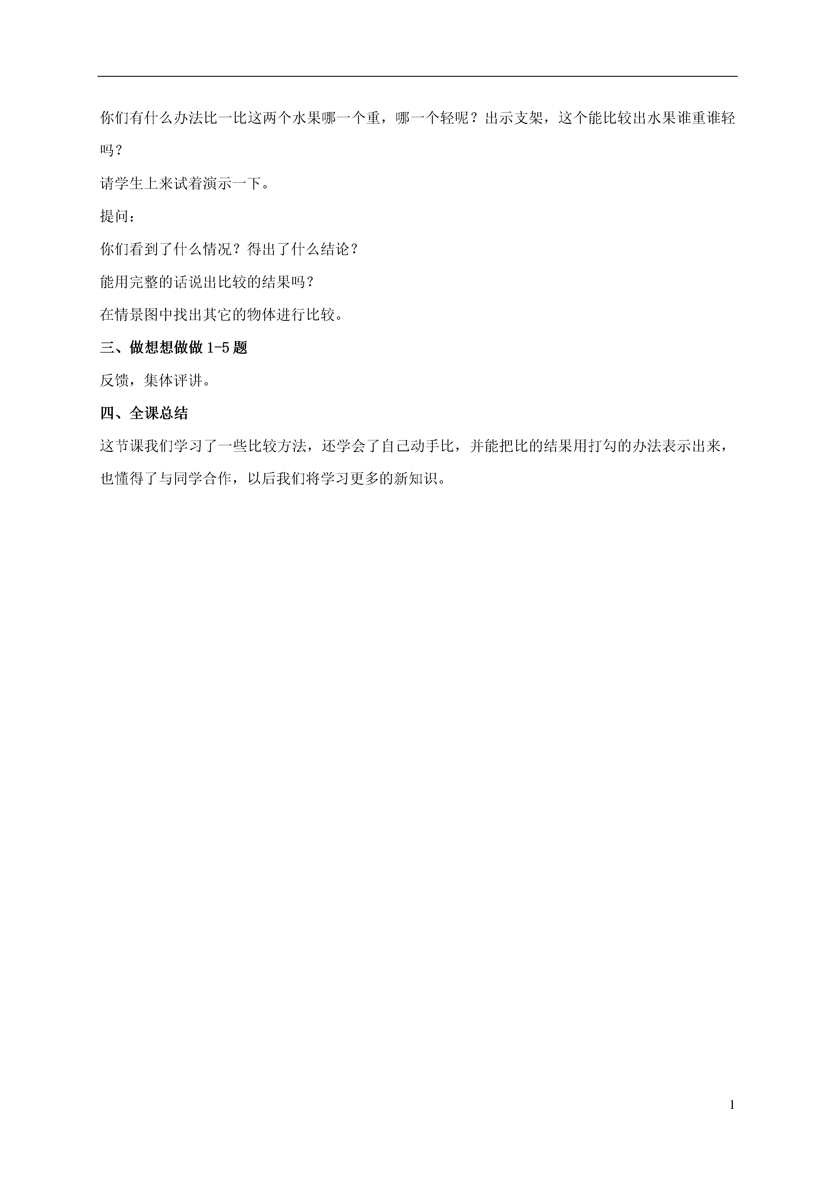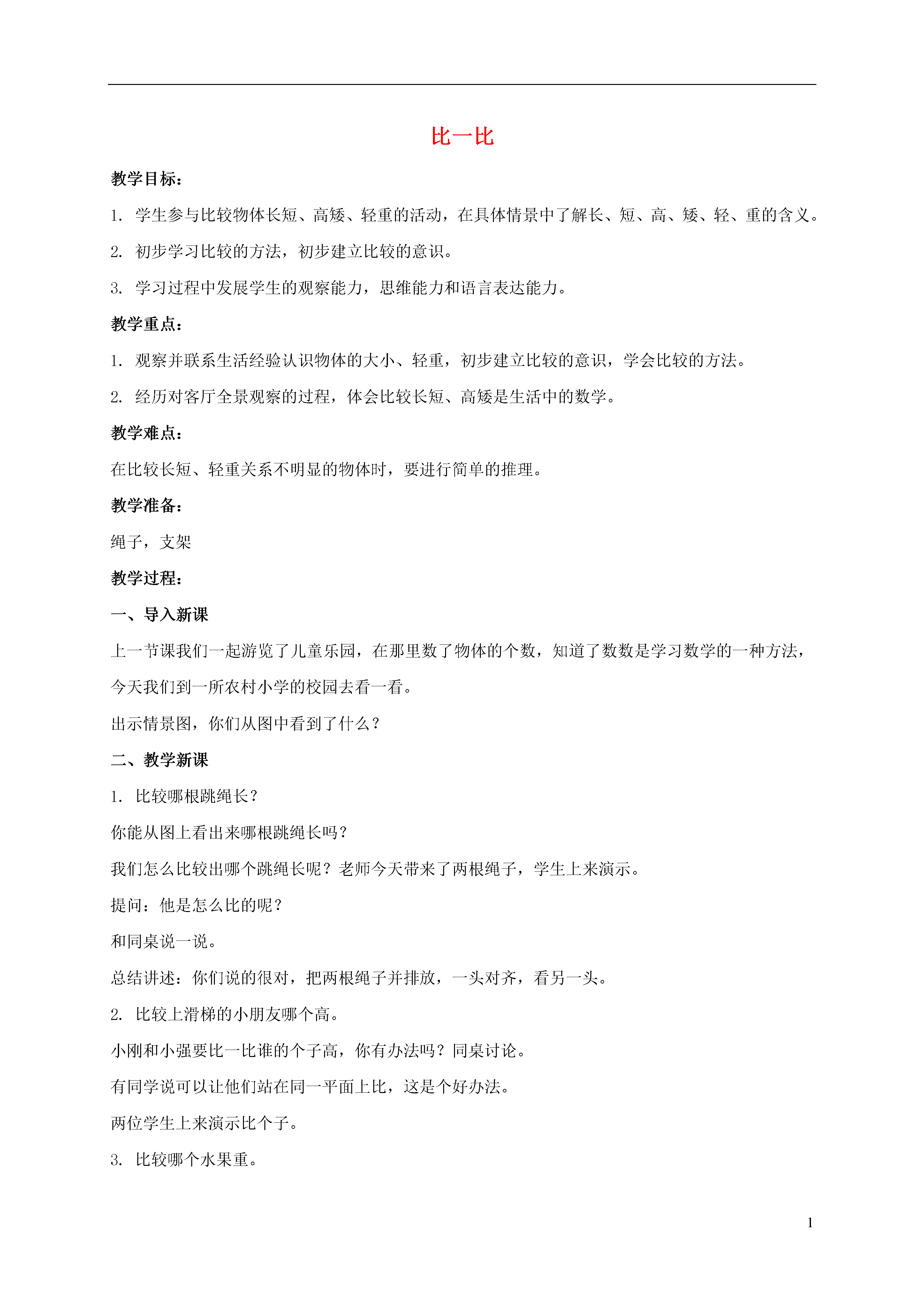 1比一比教学目标:1.学生参与比较物体长短、高矮、轻重的活动,在具体情景中了解长、短、高、矮、轻、重的含义。2.初步学习比较的方法,初步建立比较的意识。3.学习过程中发展学生的观察能力,思维能力和语言表达能力。教学重点:1.观察并联系生活经验认识物体的大小、轻重,初步建立比较的意识,学会比较的方法。2.经历对客厅全景观察的过程,体会比较长短、高矮是生活中的数学。教学难点:在比较长短、轻重关系不明显的物体时,要进行简单的推理。教学准备:绳子,支架教学过程:一、导入新课上一节课我们一起游览了儿童乐园,在那里数了物体的个数,知道了数数是学习数学的一种方法,今天我们到一所农村小学的校园去看一看。出示情景图,你们从图中看到了什么?二、教学新课1.比较哪根跳绳长?你能从图上看出来哪根跳绳长吗?我们怎么比较出哪个跳绳长呢?老师今天带来了两根绳子,学生上来演示。提问:他是怎么比的呢?和同桌说一说。总结讲述:你们说的很对,把两根绳子并排放,一头对齐,看另一头。2.比较上滑梯的小朋友哪个高。小刚和小强要比一比谁的个子高,你有办法吗?同桌讨论。有同学说可以让他们站在同一平面上比,这是个好办法。两位学生上来演示比个子。3.比较哪个水果重。你们有什么办法比一比这两个水果哪一个重,哪一个轻呢?出示支架,这个能比较出水果谁重谁轻吗?请学生上来试着演示一下。提问:你们看到了什么情况?得出了什么结论?能用完整的话说出比较的结果吗?在情景图中找出其它的物体进行比较。三、做想想做做1-5题反馈,集体评讲。四、全课总结这节课我们学习了一些比较方法,还学会了自己动手比,并能把比的结果用打勾的办法表示出来,也懂得了与同学合作,以后我们将学习更多的新知识。
