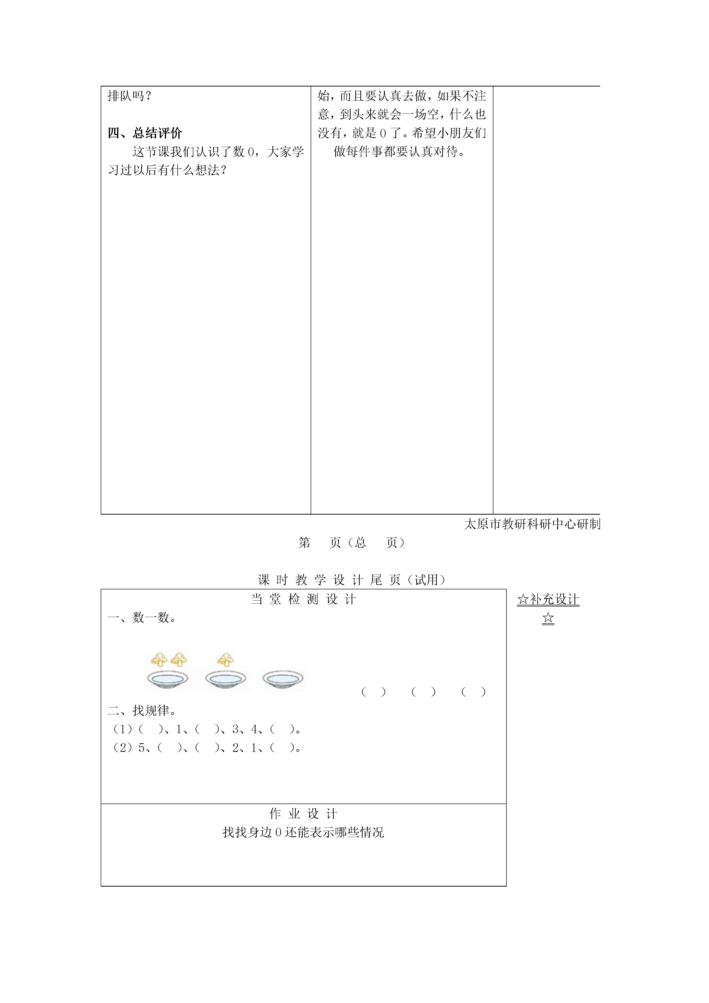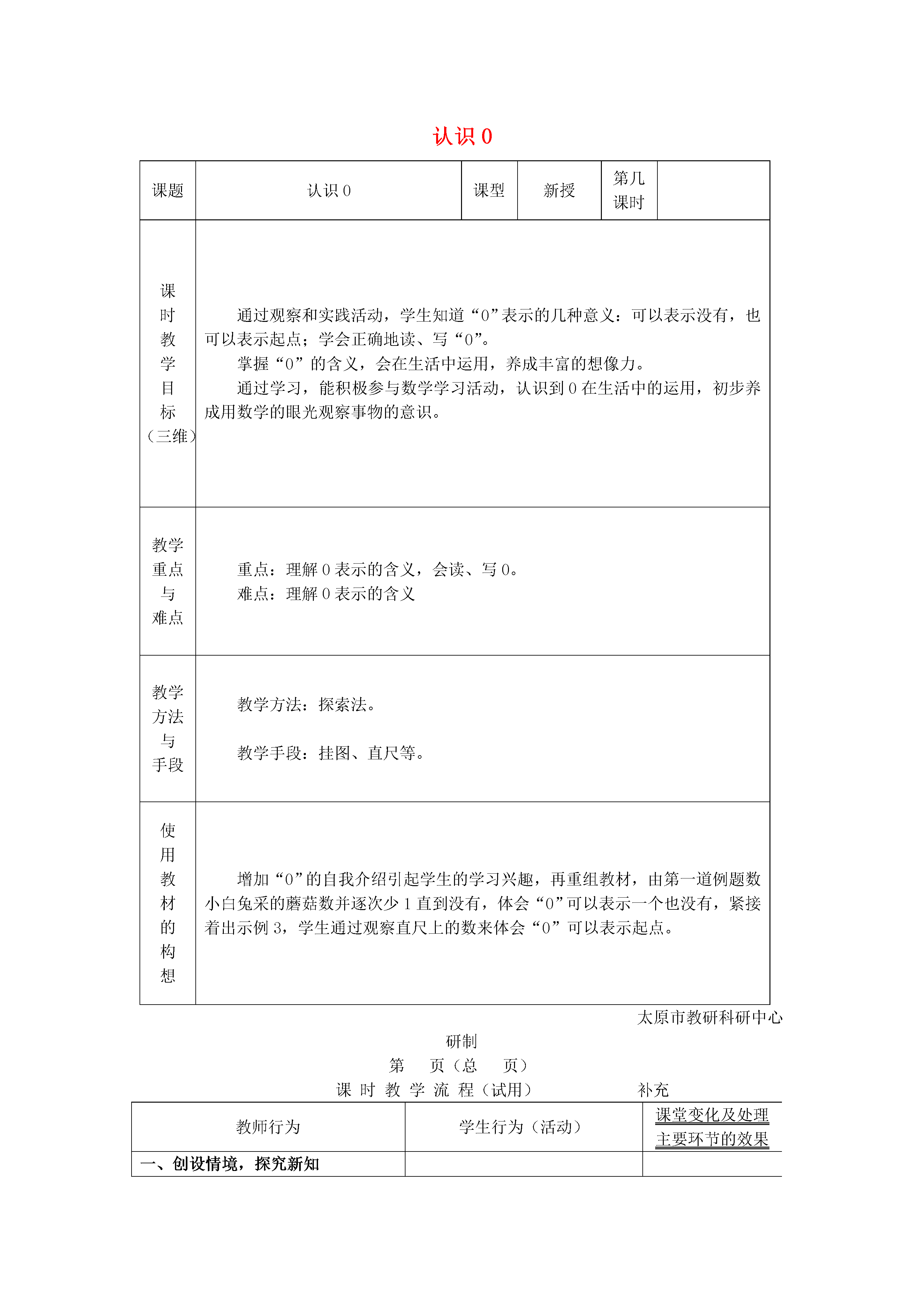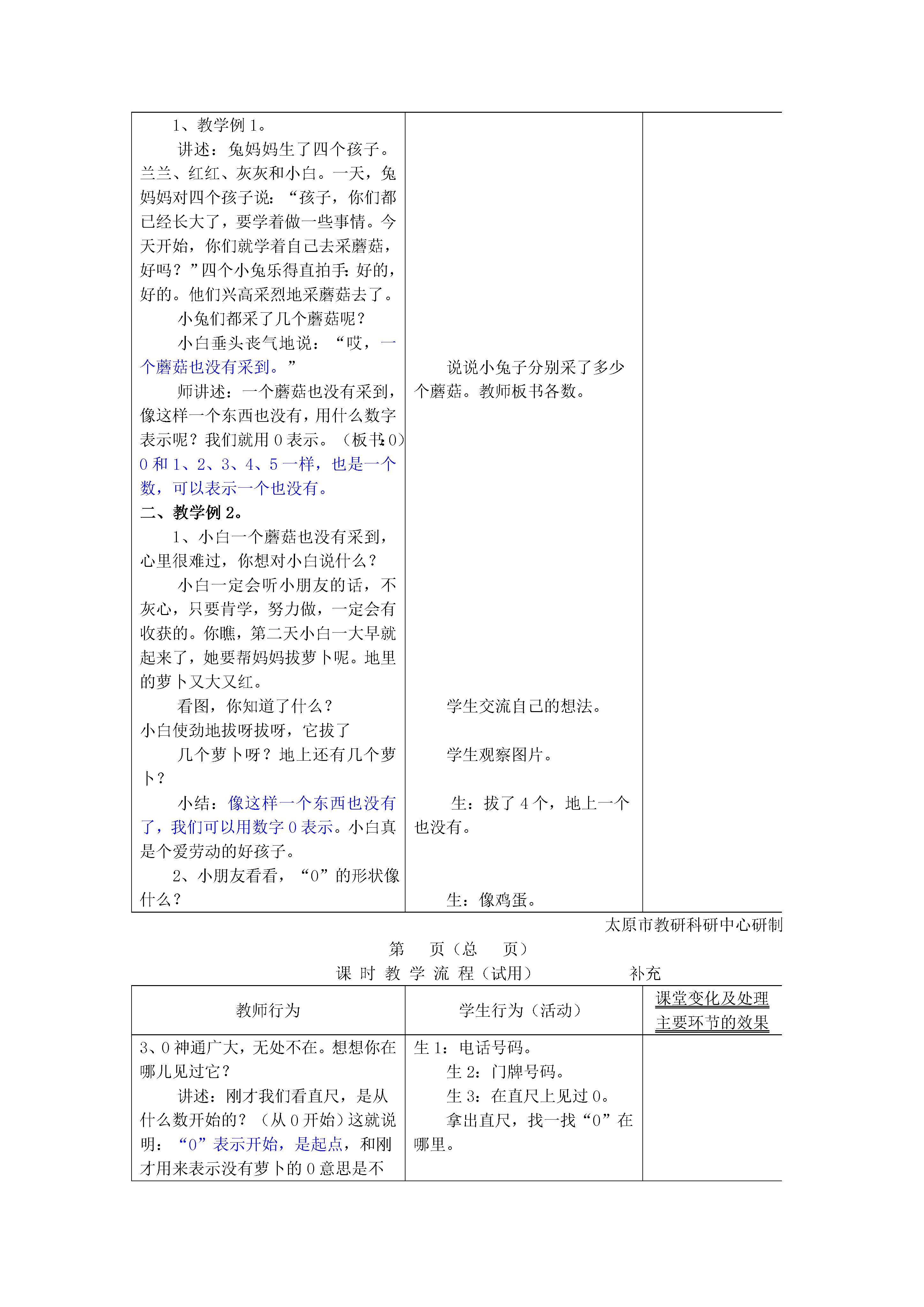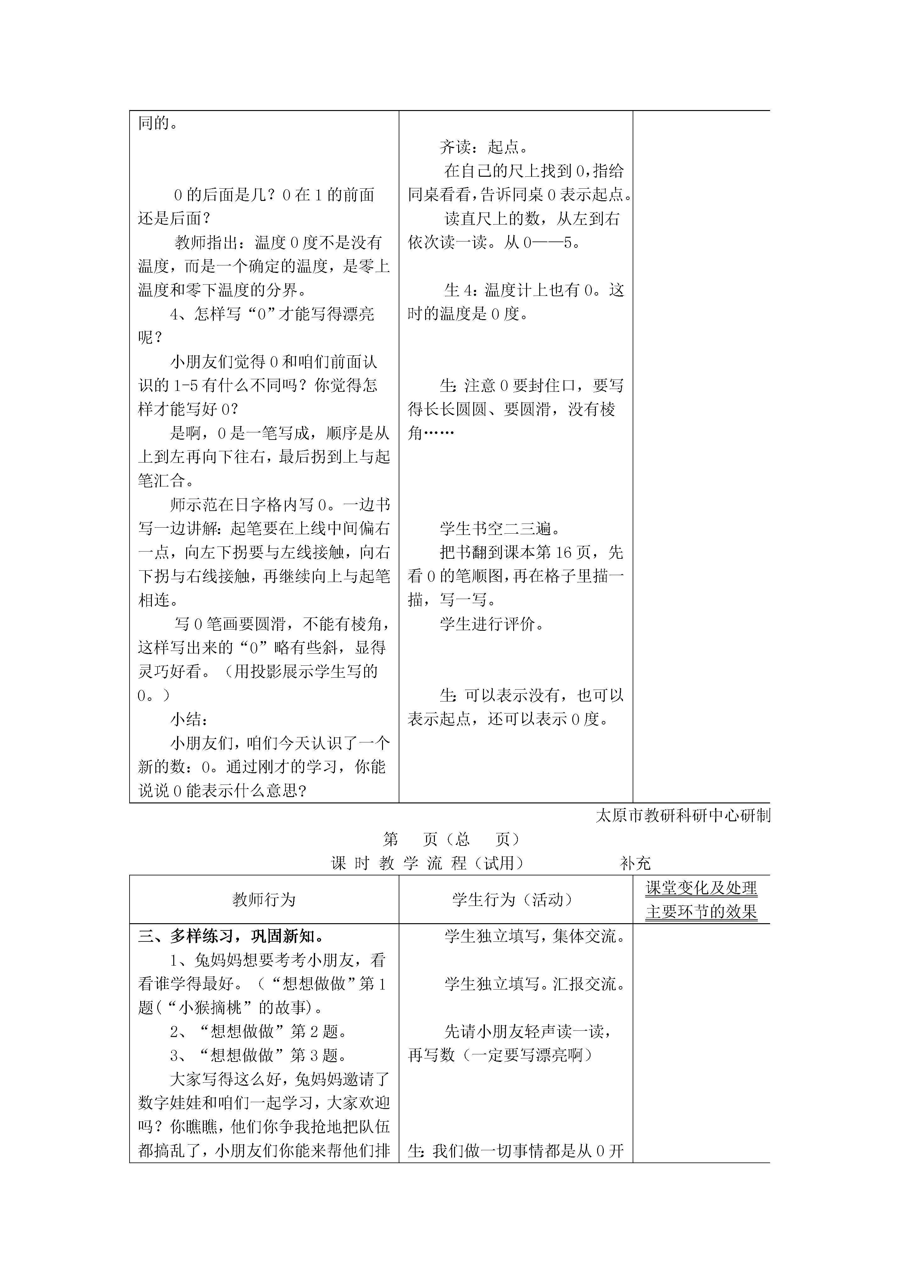 认识0课题认识0课型新授第几课时课时教学目标(三维)通过观察和实践活动,学生知道“0”表示的几种意义:可以表示没有,也可以表示起点;学会正确地读、写“0”。掌握“0”的含义,会在生活中运用,养成丰富的想像力。通过学习,能积极参与数学学习活动,认识到0在生活中的运用,初步养成用数学的眼光观察事物的意识。教学重点与难点重点:理解0表示的含义,会读、写0。难点:理解0表示的含义教学方法与手段教学方法:探索法。教学手段:挂图、直尺等。使用教材的构想增加“0”的自我介绍引起学生的学习兴趣,再重组教材,由第一道例题数小白兔采的蘑菇数并逐次少1直到没有,体会“0”可以表示一个也没有,紧接着出示例3,学生通过观察直尺上的数来体会“0”可以表示起点。太原市教研科研中心研制第页(总页)课时教学流程(试用)补充教师行为学生行为(活动)课堂变化及处理主要环节的效果一、创设情境,探究新知1、教学例1。讲述:兔妈妈生了四个孩子。兰兰、红红、灰灰和小白。一天,兔妈妈对四个孩子说:“孩子,你们都已经长大了,要学着做一些事情。今天开始,你们就学着自己去采蘑菇,好吗?”四个小兔乐得直拍手:好的,好的。他们兴高采烈地采蘑菇去了。小兔们都采了几个蘑菇呢?小白垂头丧气地说:“哎,一个蘑菇也没有采到。”师讲述:一个蘑菇也没有采到,像这样一个东西也没有,用什么数字表示呢?我们就用0表示。(板书:0)0和1、2、3、4、5一样,也是一个数,可以表示一个也没有。二、教学例2。1、小白一个蘑菇也没有采到,心里很难过,你想对小白说什么?小白一定会听小朋友的话,不灰心,只要肯学,努力做,一定会有收获的。你瞧,第二天小白一大早就起来了,她要帮妈妈拔萝卜呢。地里的萝卜又大又红。看图,你知道了什么?小白使劲地拔呀拔呀,它拔了几个萝卜呀?地上还有几个萝卜?小结:像这样一个东西也没有了,我们可以用数字0表示。小白真是个爱劳动的好孩子。2、小朋友看看,“0”的形状像什么?说说小兔子分别采了多少个蘑菇。教师板书各数。学生交流自己的想法。学生观察图片。生:拔了4个,地上一个也没有。生:像鸡蛋。太原市教研科研中心研制第页(总页)课时教学流程(试用)补充教师行为学生行为(活动)课堂变化及处理主要环节的效果3、0神通广大,无处不在。想想你在哪儿见过它?讲述:刚才我们看直尺,是从什么数开始的?(从0开始)这就说明:“0”表示开始,是起点,和刚才用来表示没有萝卜的0意思是不同的。0的后面是几?0在1的前面还是后面?教师指出:温度0度不是没有温度,而是一个确定的温度,是零上温度和零下温度的分界。4、怎样写“0”才能写得漂亮呢?小朋友们觉得0和咱们前面认识的1-5有什么不同吗?你觉得怎样才能写好0?是啊,0是一笔写成,顺序是从上到左再向下往右,最后拐到上与起笔汇合。师示范在日字格内写0。一边书写一边讲解:起笔要在上线中间偏右一点,向左下拐要与左线接触,向右下拐与右线接触,再继续向上与起笔相连。写0笔画要圆滑,不能有棱角,这样写出来的“0”略有些斜,显得灵巧好看。(用投影展示学生写的0。)小结:小朋友们,咱们今天认识了一个新的数:0。通过刚才的学习,你能说说0能表示什么意思?生1:电话号码。生2:门牌号码。生3:在直尺上见过0。拿出直尺,找一找“0”在哪里。齐读:起点。在自己的尺上找到0,指给同桌看看,告诉同桌0表示起点。读直尺上的数,从左到右依次读一读。从0——5。生4:温度计上也有0。这时的温度是0度。生:注意0要封住口,要写得长长圆圆、要圆滑,没有棱角……学生书空二三遍。把书翻到课本,先看0的笔顺图,再在格子里描一描,写一写。学生进行评价。生:可以表示没有,也可以表示起点,还可以表示0度。太原市教研科研中心研制第页(总页)课时教学流程(试用)补充教师行为学生行为(活动)课堂变化及处理主要环节的效果三、多样练习,巩固新知。1、兔妈妈想要考考小朋友,看看谁学得最好。(“想想做做”第1题(“小猴摘桃”的故事)。2、“想想做做”第2题。3、“想想做做”第3题。大家写得这么好,兔妈妈邀请了数字娃娃和咱们一起学习,大家欢迎吗?你瞧瞧,他们你争我抢地把队伍都搞乱了,小朋友们你能来帮他们排排队吗?四、总结评价这节课我们认识了数0,大家学习过以后有什么想法?学生独立填写,集体交流。学生独立填写。汇报交流。先请小朋友轻声读一读,再写数(一定要写漂亮啊)生:我们做一切事情都是从0开始,而且要认真去做,如果不