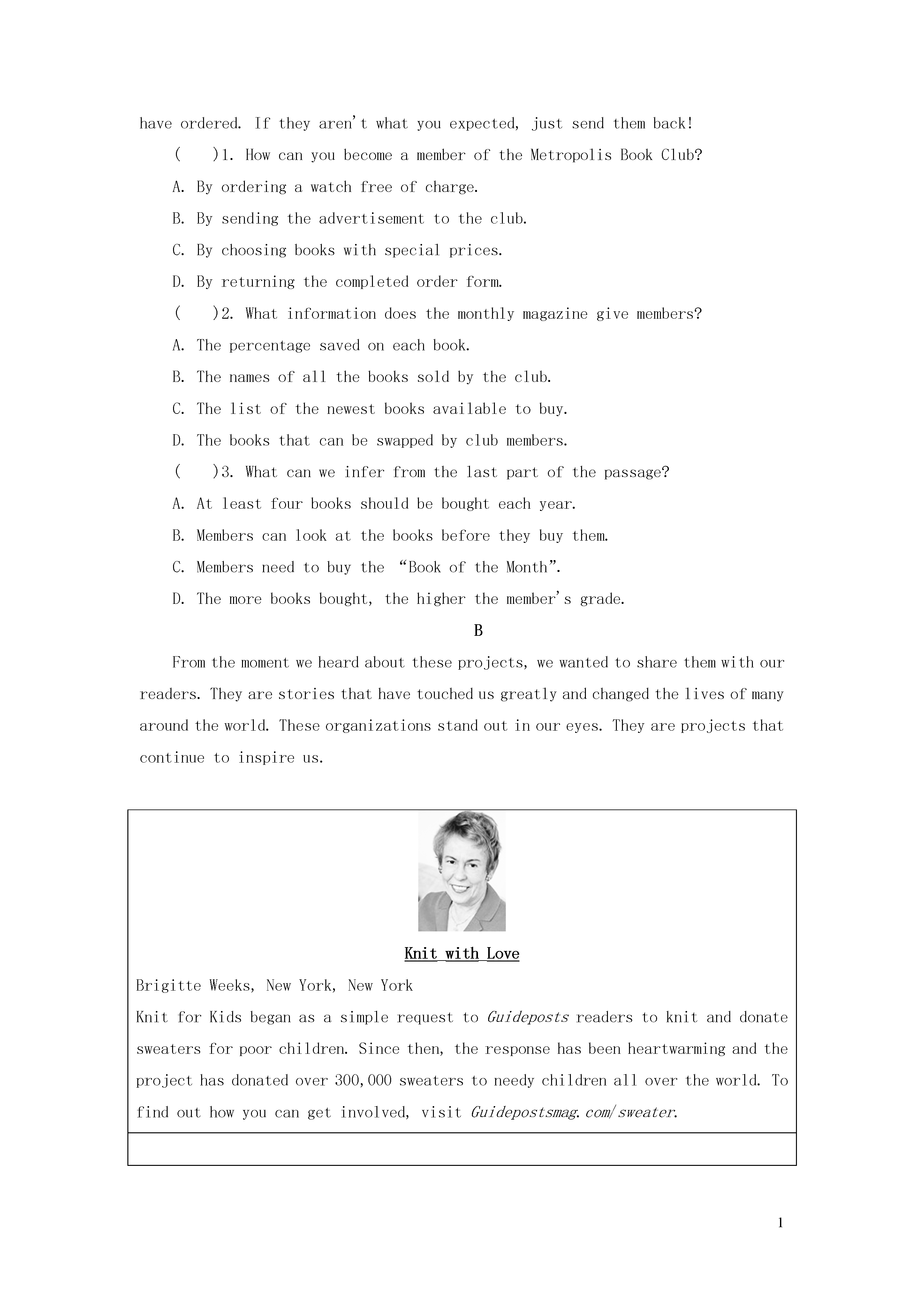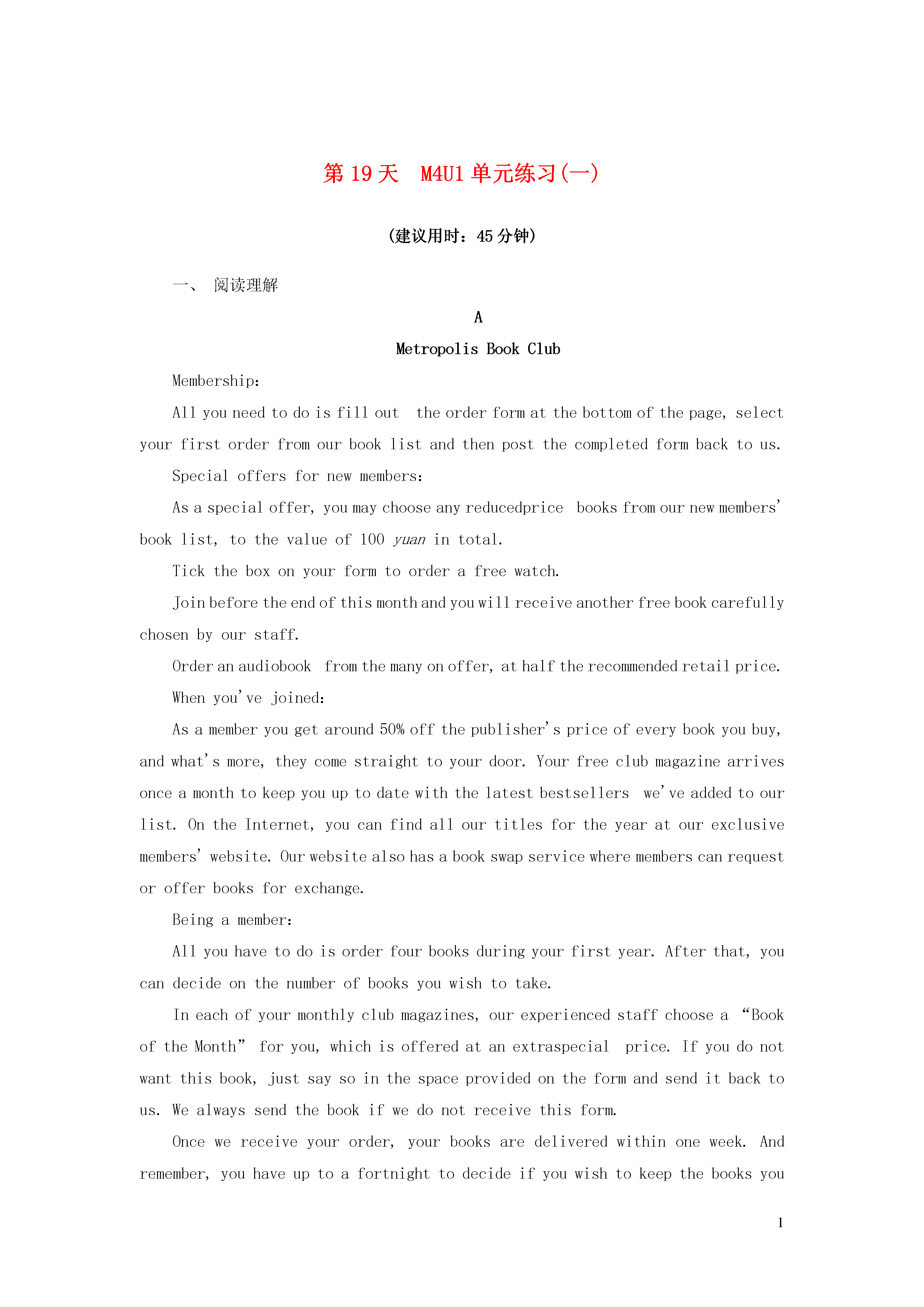 1第19天M4U1单元练习(一)(建议用时:45分钟)一、阅读理解AMetropolisBookClubMembership:Allyouneedtodoisfillouttheorderformatthebottomofthepage,selectyourfirstorderfromourbooklistandthenpostthecompletedformbacktous.Specialoffersfornewmembers:Asaspecialoffer,youmaychooseanyreducedpricebooksfromournewmembers'booklist,tothevalueof100yuanintotal.Ticktheboxonyourformtoorderafreewatch.Joinbeforetheendofthismonthandyouwillreceiveanotherfreebookcarefullychosenbyourstaff.Orderanaudiobookfromthemanyonoffer,athalftherecommendedretailprice.Whenyou'vejoined:Asamemberyougetaround50%offthepublisher'spriceofeverybookyoubuy,andwhat'smore,theycomestraighttoyourdoor.Yourfreeclubmagazinearrivesonceamonthtokeepyouuptodatewiththelatestbestsellerswe'veaddedtoourlist.OntheInternet,youcanfindallourtitlesfortheyearatourexclusivemembers'website.Ourwebsitealsohasabookswapservicewherememberscanrequestorofferbooksforexchange.Beingamember:Allyouhavetodoisorderfourbooksduringyourfirstyear.Afterthat,youcandecideonthenumberofbooksyouwishtotake.Ineachofyourmonthlyclubmagazines,ourexperiencedstaffchoosea“BookoftheMonth”foryou,whichisofferedatanextraspecialprice.Ifyoudonotwantthisbook,justsaysointhespaceprovidedontheformandsenditbacktous.Wealwayssendthebookifwedonotreceivethisform.Oncewereceiveyourorder,yourbooksaredeliveredwithinoneweek.Andremember,youhaveuptoafortnighttodecideifyouwishtokeepthebooksyouhaveordered.Iftheyaren'twhatyouexpected,justsendthemback!()1.HowcanyoubecomeamemberoftheMetropolisBookClub?A.Byorderingawatchfreeofcharge.B.Bysendingtheadvertisementtotheclub.C.Bychoosingbookswithspecialprices.D.Byreturningthecompletedorderform.()2.Whatinformationdoesthemonthlymagazinegivemembers?A.Thepercentagesavedoneachbook.B.Thenamesofallthebookssoldbytheclub.C.Thelistofthenewestbooksavailabletobuy.D.Thebooksthatcanbeswappedbyclubmembers.()3.Whatcanweinferfromthelastpartofthepassage?A.Atleastfourbooksshouldbeboughteachyear.B.Memberscanlookatthebooksbeforetheybuythem.C.Membersneedtobu