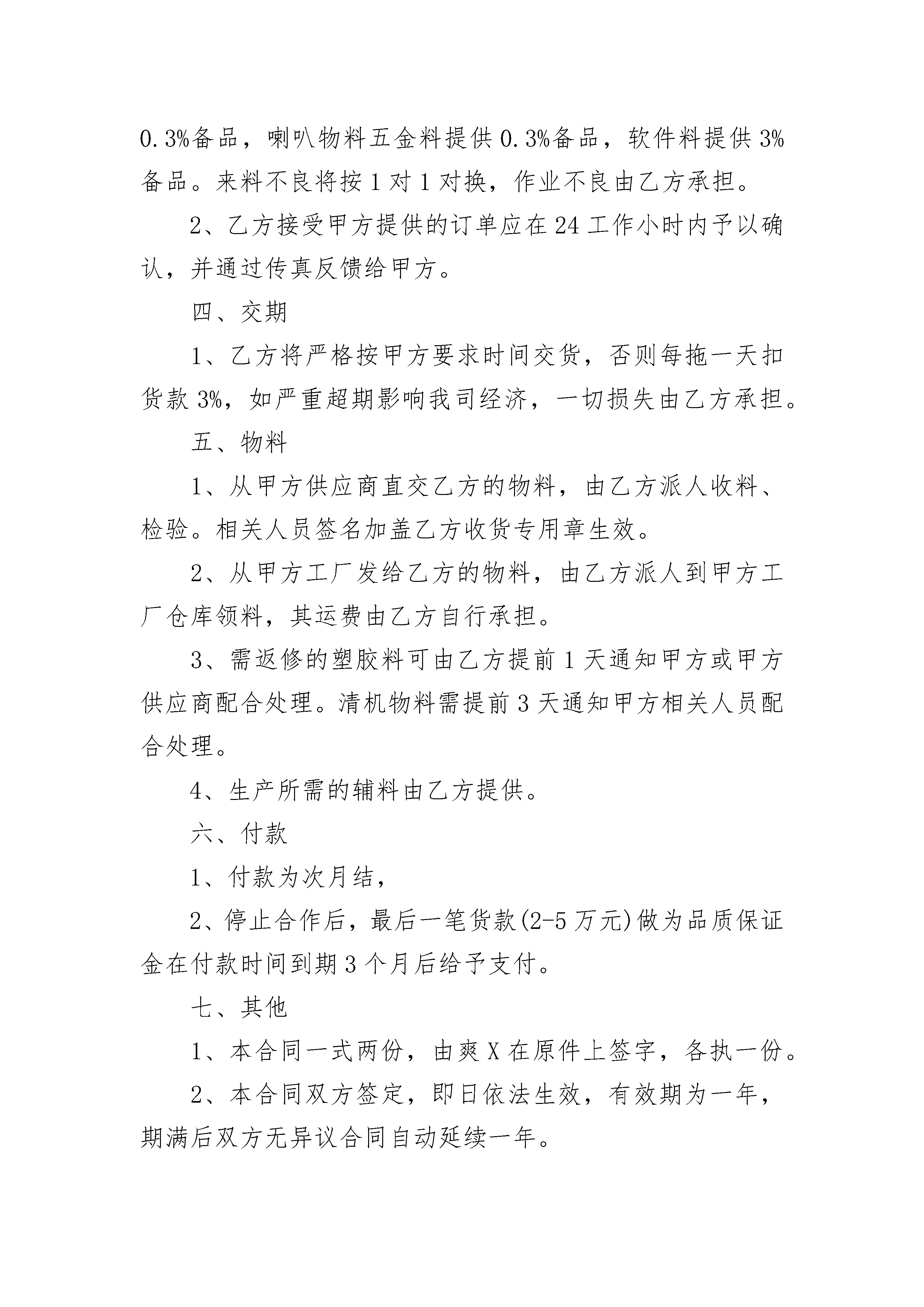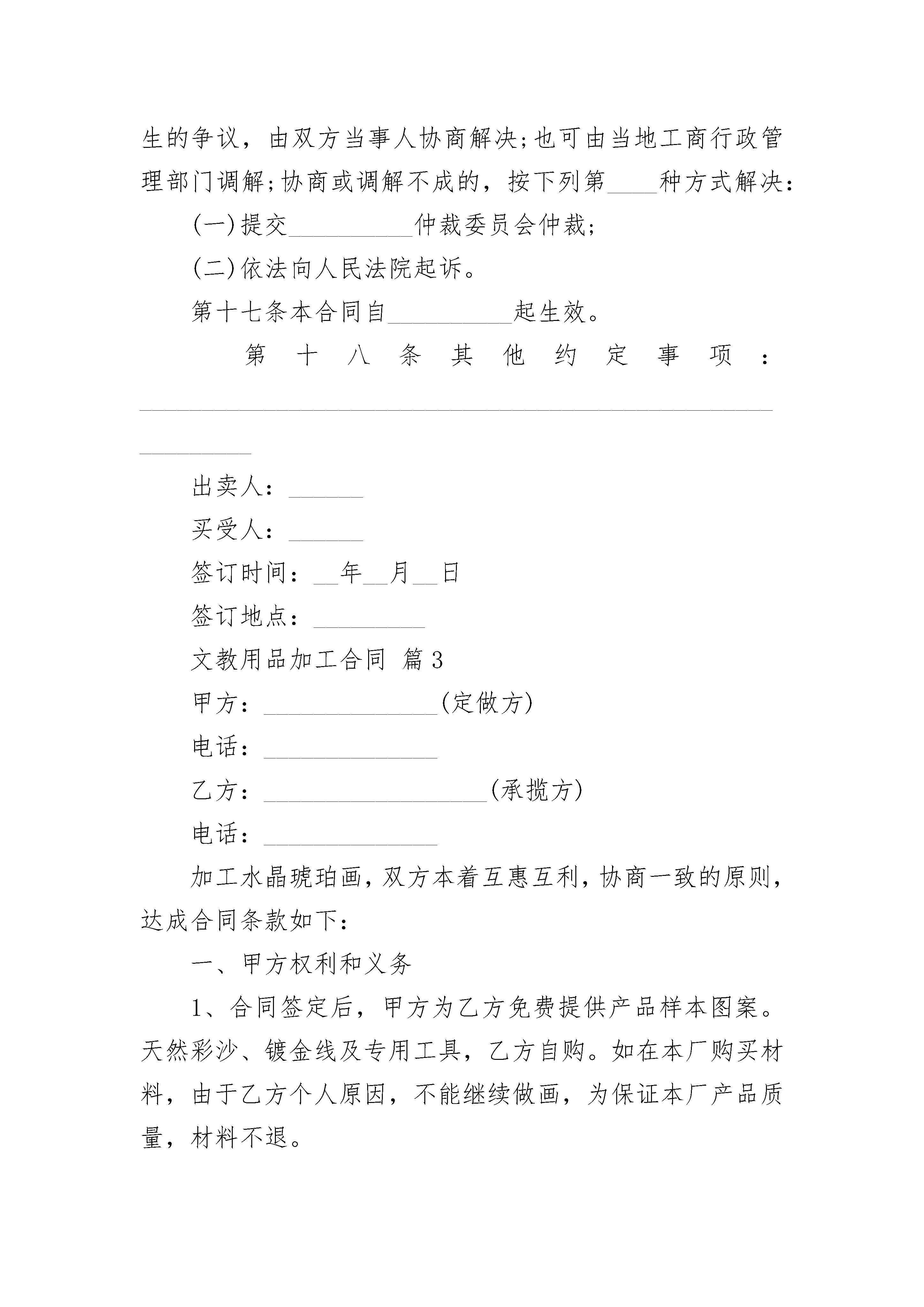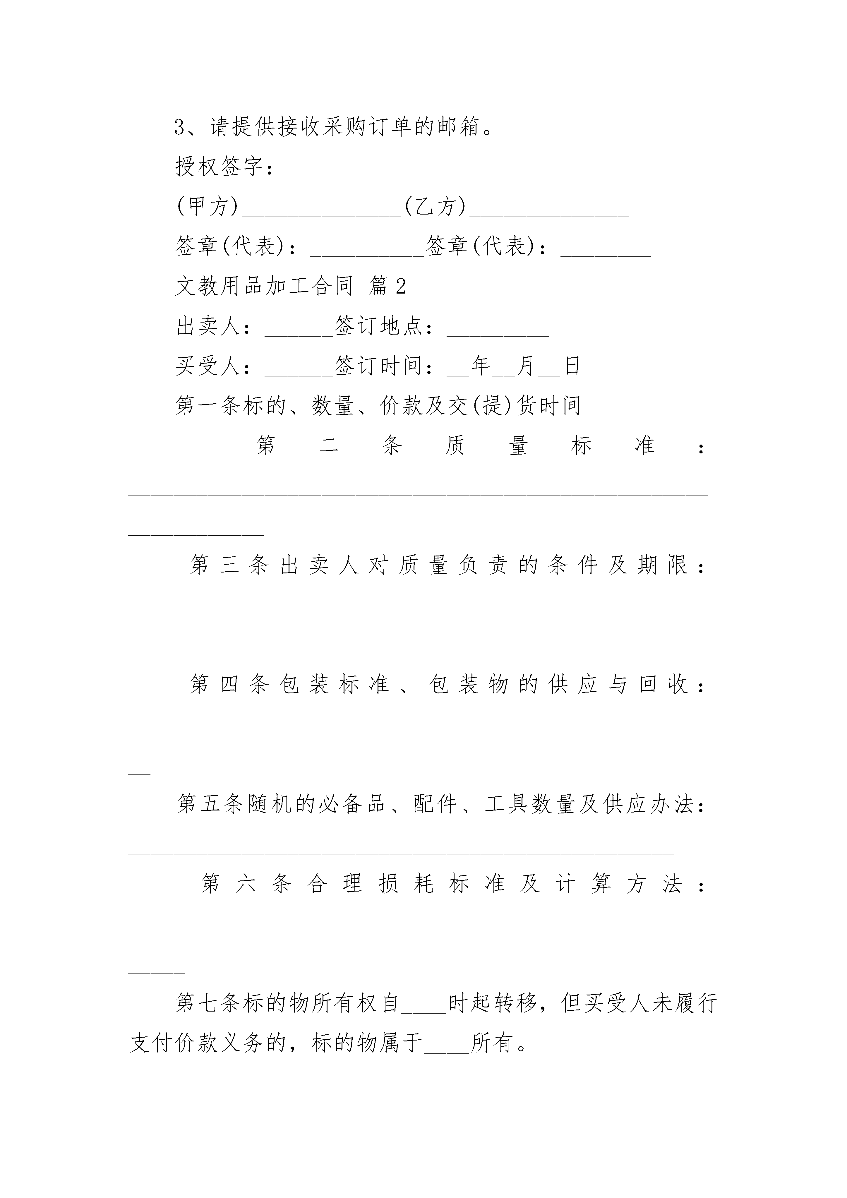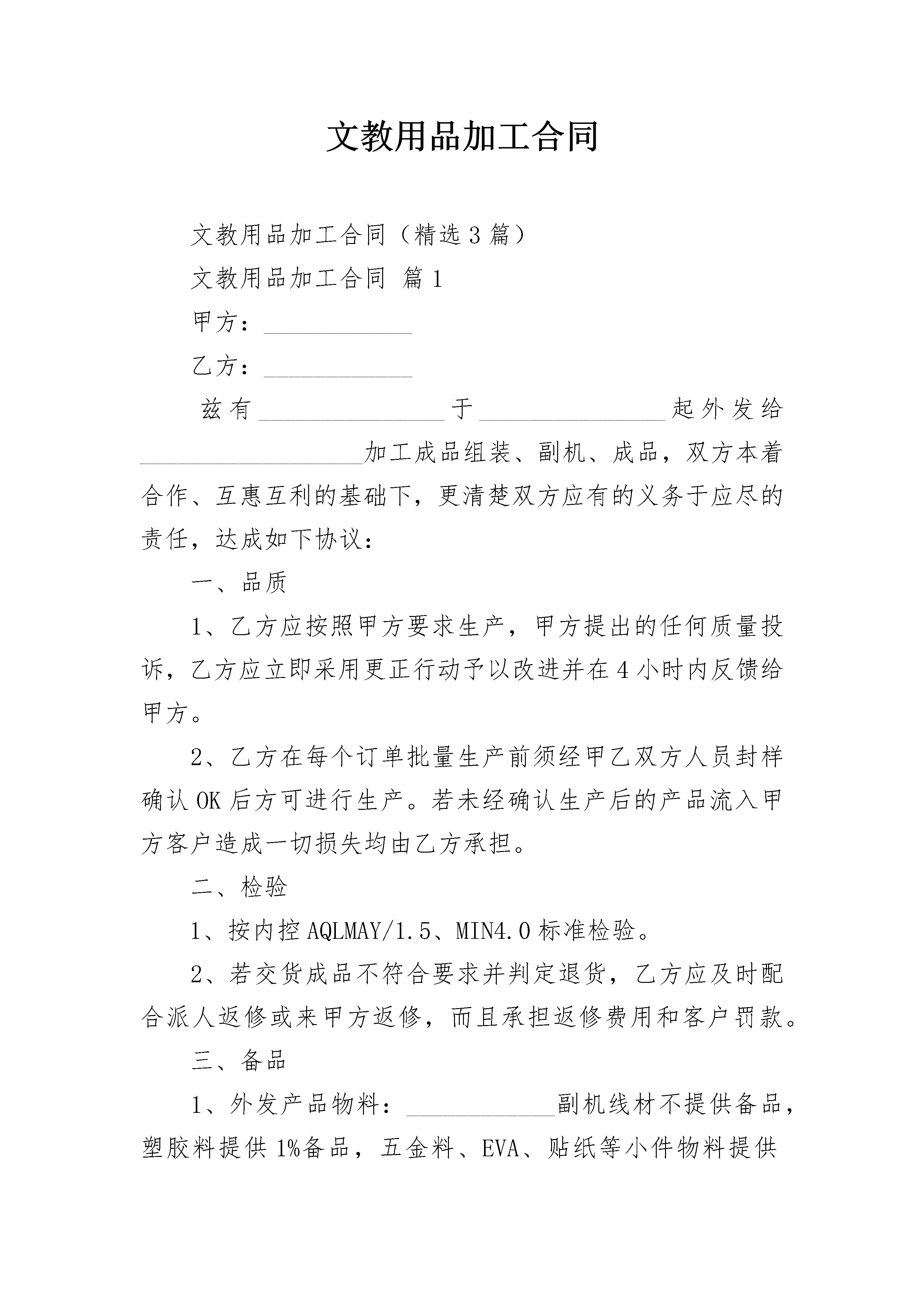 文教用品加工合同文教用品加工合同(精选3篇)文教用品加工合同篇1甲方:____________乙方:____________兹有_______________于_______________起外发给__________________加工成品组装、副机、成品,双方本着合作、互惠互利的基础下,更清楚双方应有的义务于应尽的责任,达成如下协议:一、品质1、乙方应按照甲方要求生产,甲方提出的任何质量投诉,乙方应立即采用更正行动予以改进并在4小时内反馈给甲方。2、乙方在每个订单批量生产前须经甲乙双方人员封样确认OK后方可进行生产。若未经确认生产后的产品流入甲方客户造成一切损失均由乙方承担。二、检验1、按内控AQLMAY/1.5、MIN4.0标准检验。2、若交货成品不符合要求并判定退货,乙方应及时配合派人返修或来甲方返修,而且承担返修费用和客户罚款。三、备品1、外发产品物料:____________副机线材不提供备品,塑胶料提供1%备品,五金料、EVA、贴纸等小件物料提供0.3%备品,喇叭物料五金料提供0.3%备品,软件料提供3%备品。来料不良将按1对1对换,作业不良由乙方承担。2、乙方接受甲方提供的订单应在24工作小时内予以确认,并通过传真反馈给甲方。四、交期1、乙方将严格按甲方要求时间交货,否则每拖一天扣货款3%,如严重超期影响我司经济,一切损失由乙方承担。五、物料1、从甲方供应商直交乙方的物料,由乙方派人收料、检验。相关人员签名加盖乙方收货专用章生效。2、从甲方工厂发给乙方的物料,由乙方派人到甲方工厂仓库领料,其运费由乙方自行承担。3、需返修的塑胶料可由乙方提前1天通知甲方或甲方供应商配合处理。清机物料需提前3天通知甲方相关人员配合处理。4、生产所需的辅料由乙方提供。六、付款1、付款为次月结,2、停止合作后,最后一笔货款(2-5万元)做为品质保证金在付款时间到期3个月后给予支付。七、其他1、本合同一式两份,由爽X在原件上签字,各执一份。2、本合同双方签定,即日依法生效,有效期为一年,期满后双方无异议合同自动延续一年。3、请提供接收采购订单的邮箱。授权签字:____________(甲方)______________(乙方)______________签章(代表):__________签章(代表):________文教用品加工合同篇2出卖人:______签订地点:_________买受人:______签订时间:__年__月__日第一条标的、数量、价款及交(提)货时间第二条质量标准:_______________________________________________________________第三条出卖人对质量负责的条件及期限:_____________________________________________________第四条包装标准、包装物的供应与回收:_____________________________________________________第五条随机的必备品、配件、工具数量及供应办法:________________________________________________第六条合理损耗标准及计算方法:________________________________________________________第七条标的物所有权自____时起转移,但买受人未履行支付价款义务的,标的物属于____所有。第八条交(提)货方式、地点:_________________________________________________________第九条运输方式及到达站(港)和费用负担:___________________________________________________第十条检验标准、方法、地点及期限:______________________________________________________第十一条成套设备的安装与调试:________________________________________________________第十二条结算方式、时间及地点:________________________________________________________第十三条担保方式(也可另立担保合同):____________________________________________________第十四条本合同解除的条件:__________________________________________________________第十五条违约责任:____________________________________________