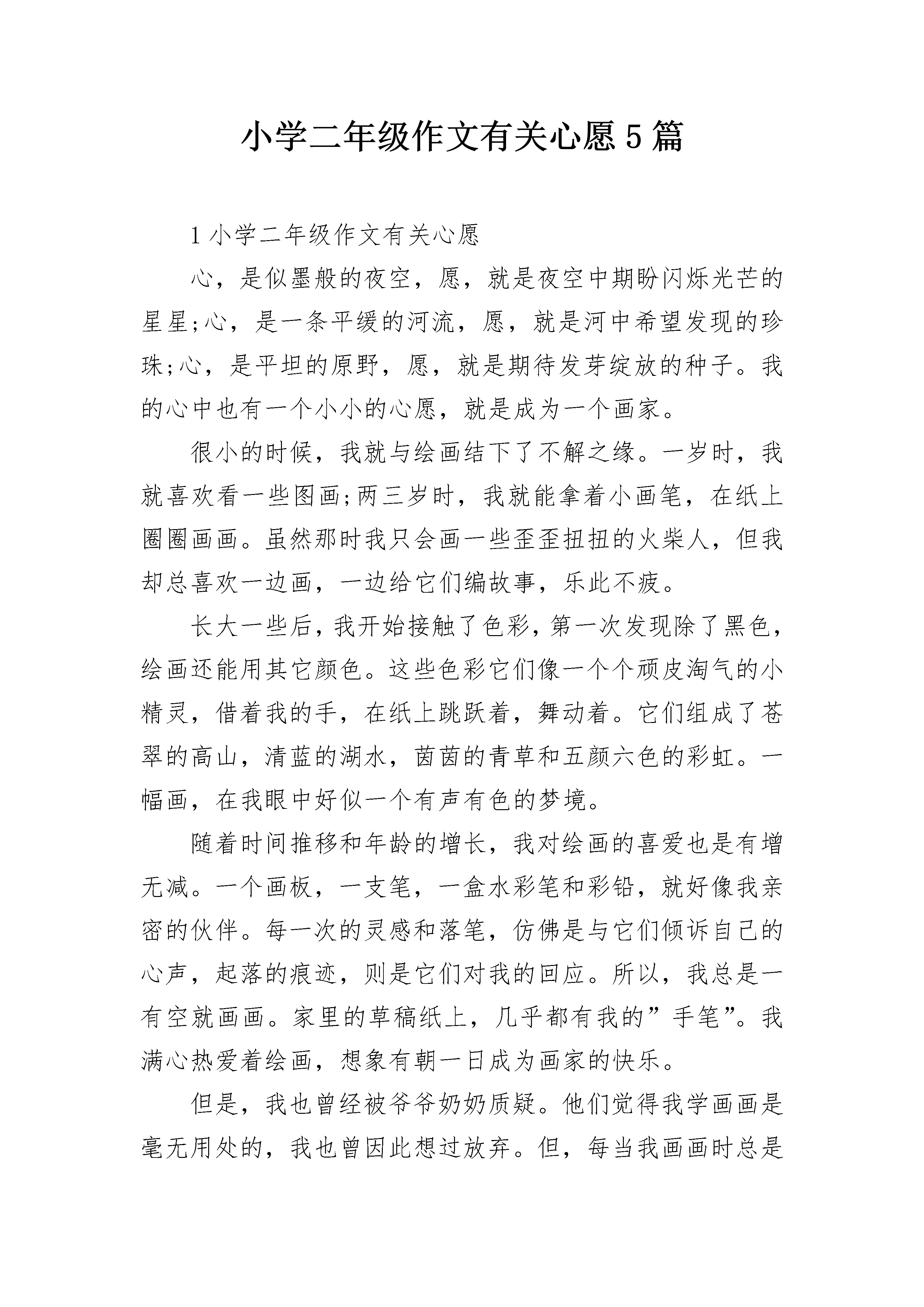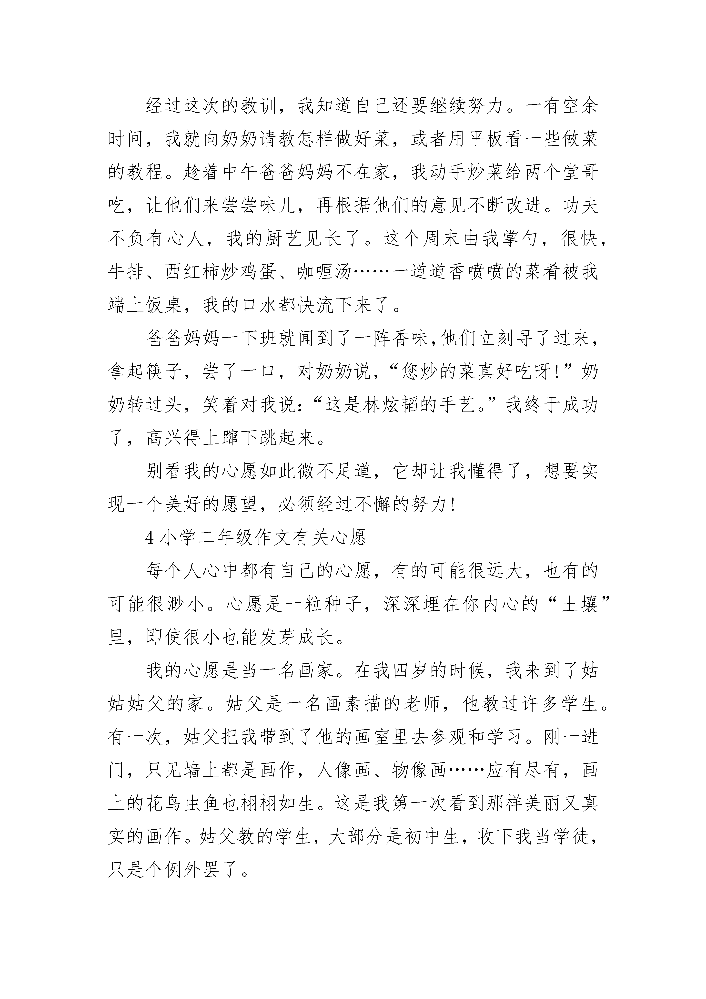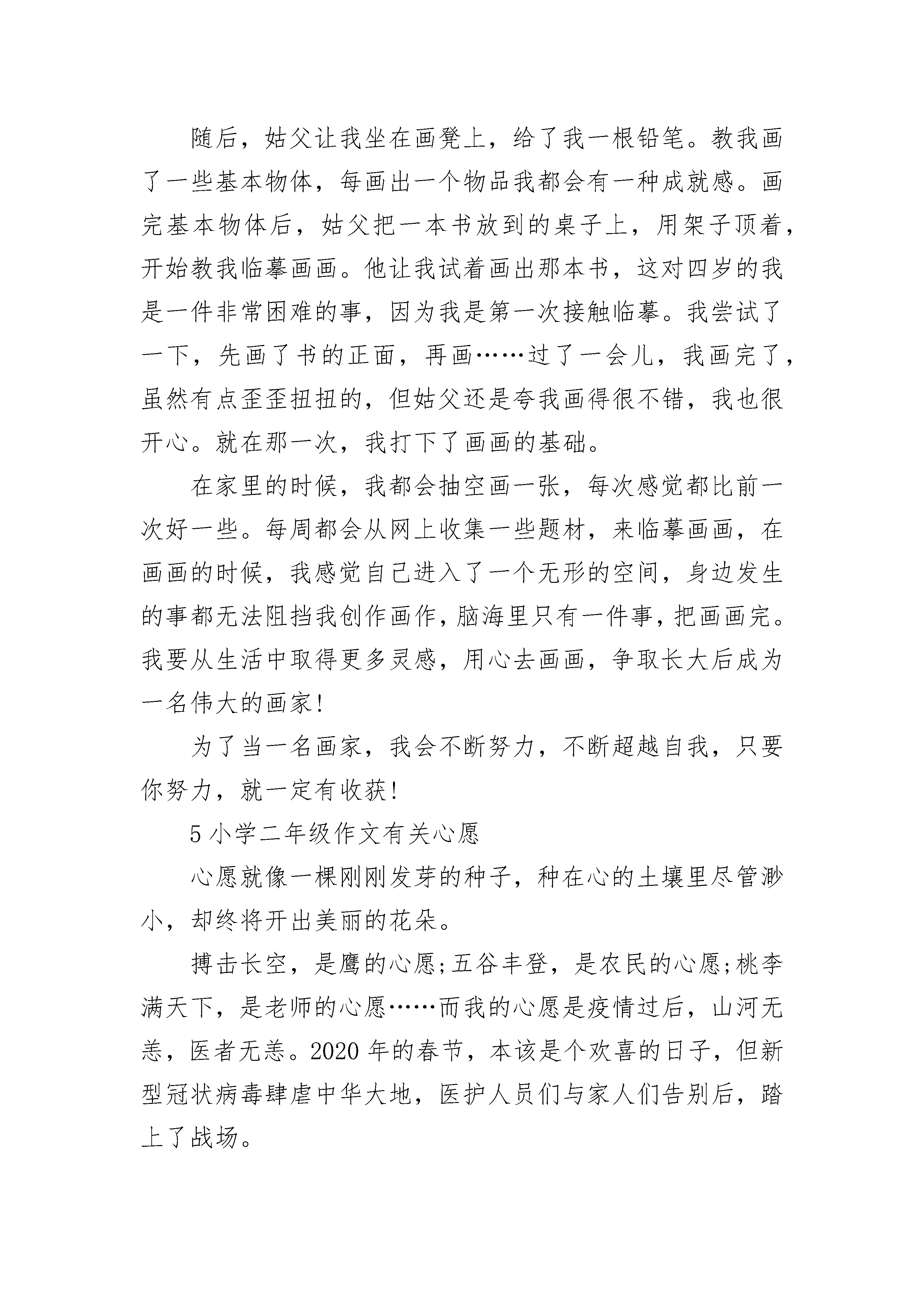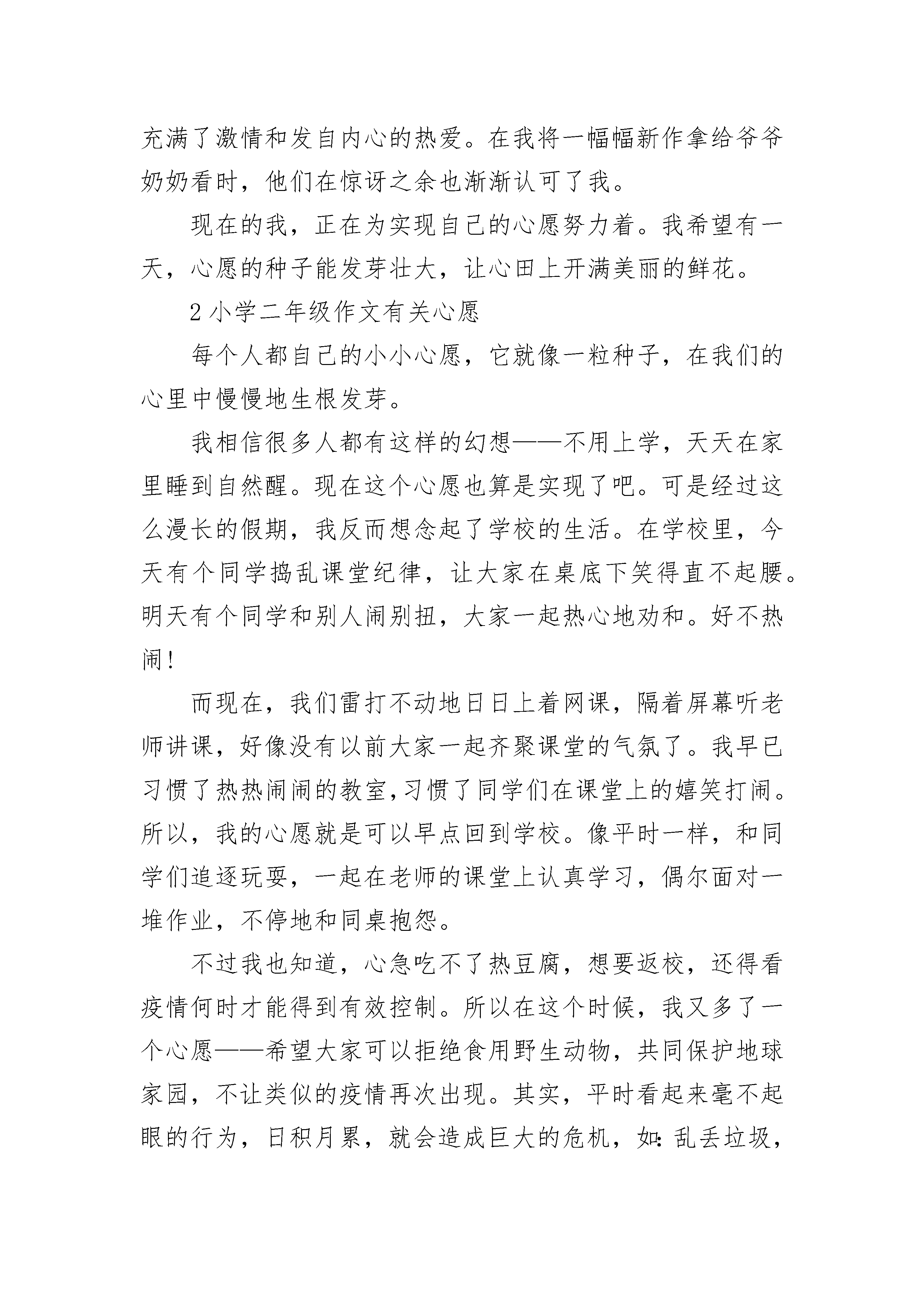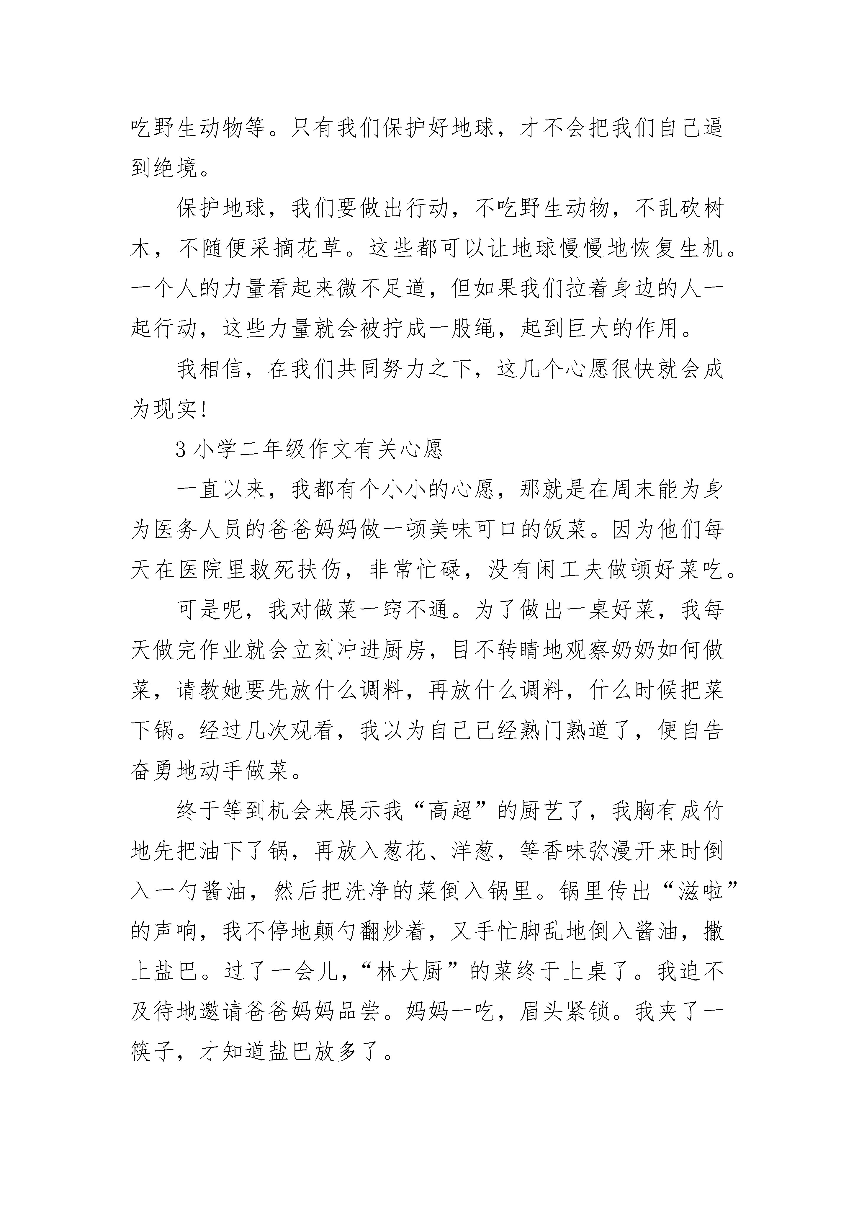 小学二年级作文有关心愿5篇1小学二年级作文有关心愿心,是似墨般的夜空,愿,就是夜空中期盼闪烁光芒的星星;心,是一条平缓的河流,愿,就是河中希望发现的珍珠;心,是平坦的原野,愿,就是期待发芽绽放的种子。我的心中也有一个小小的心愿,就是成为一个画家。很小的时候,我就与绘画结下了不解之缘。一岁时,我就喜欢看一些图画;两三岁时,我就能拿着小画笔,在纸上圈圈画画。虽然那时我只会画一些歪歪扭扭的火柴人,但我却总喜欢一边画,一边给它们编故事,乐此不疲。长大一些后,我开始接触了色彩,第一次发现除了黑色,绘画还能用其它颜色。这些色彩它们像一个个顽皮淘气的小精灵,借着我的手,在纸上跳跃着,舞动着。它们组成了苍翠的高山,清蓝的湖水,茵茵的青草和五颜六色的彩虹。一幅画,在我眼中好似一个有声有色的梦境。随着时间推移和年龄的增长,我对绘画的喜爱也是有增无减。一个画板,一支笔,一盒水彩笔和彩铅,就好像我亲密的伙伴。每一次的灵感和落笔,仿佛是与它们倾诉自己的心声,起落的痕迹,则是它们对我的回应。所以,我总是一有空就画画。家里的草稿纸上,几乎都有我的”手笔”。我满心热爱着绘画,想象有朝一日成为画家的快乐。但是,我也曾经被爷爷奶奶质疑。他们觉得我学画画是毫无用处的,我也曾因此想过放弃。但,每当我画画时总是充满了激情和发自内心的热爱。在我将一幅幅新作拿给爷爷奶奶看时,他们在惊讶之余也渐渐认可了我。现在的我,正在为实现自己的心愿努力着。我希望有一天,心愿的种子能发芽壮大,让心田上开满美丽的鲜花。2小学二年级作文有关心愿每个人都自己的小小心愿,它就像一粒种子,在我们的心里中慢慢地生根发芽。我相信很多人都有这样的幻想——不用上学,天天在家里睡到自然醒。现在这个心愿也算是实现了吧。可是经过这么漫长的假期,我反而想念起了学校的生活。在学校里,今天有个同学捣乱课堂纪律,让大家在桌底下笑得直不起腰。明天有个同学和别人闹别扭,大家一起热心地劝和。好不热闹!而现在,我们雷打不动地日日上着网课,隔着屏幕听老师讲课,好像没有以前大家一起齐聚课堂的气氛了。我早已习惯了热热闹闹的教室,习惯了同学们在课堂上的嬉笑打闹。所以,我的心愿就是可以早点回到学校。像平时一样,和同学们追逐玩耍,一起在老师的课堂上认真学习,偶尔面对一堆作业,不停地和同桌抱怨。不过我也知道,心急吃不了热豆腐,想要返校,还得看疫情何时才能得到有效控制。所以在这个时候,我又多了一个心愿——希望大家可以拒绝食用野生动物,共同保护地球家园,不让类似的疫情再次出现。其实,平时看起来毫不起眼的行为,日积月累,就会造成巨大的危机,如:乱丢垃圾,吃野生动物等。只有我们保护好地球,才不会把我们自己逼到绝境。保护地球,我们要做出行动,不吃野生动物,不乱砍树木,不随便采摘花草。这些都可以让地球慢慢地恢复生机。一个人的力量看起来微不足道,但如果我们拉着身边的人一起行动,这些力量就会被拧成一股绳,起到巨大的作用。我相信,在我们共同努力之下,这几个心愿很快就会成为现实!3小学二年级作文有关心愿一直以来,我都有个小小的心愿,那就是在周末能为身为医务人员的爸爸妈妈做一顿美味可口的饭菜。因为他们每天在医院里救死扶伤,非常忙碌,没有闲工夫做顿好菜吃。可是呢,我对做菜一窍不通。为了做出一桌好菜,我每天做完作业就会立刻冲进厨房,目不转睛地观察奶奶如何做菜,请教她要先放什么调料,再放什么调料,什么时候把菜下锅。经过几次观看,我以为自己已经熟门熟道了,便自告奋勇地动手做菜。终于等到机会来展示我“高超”的厨艺了,我胸有成竹地先把油下了锅,再放入葱花、洋葱,等香味弥漫开来时倒入一勺酱油,然后把洗净的菜倒入锅里。锅里传出“滋啦”的声响,我不停地颠勺翻炒着,又手忙脚乱地倒入酱油,撒上盐巴。过了一会儿,“林大厨”的菜终于上桌了。我迫不及待地邀请爸爸妈妈品尝。妈妈一吃,眉头紧锁。我夹了一筷子,才知道盐巴放多了。经过这次的教训,我知道自己还要继续努力。一有空余时间,我就向奶奶请教怎样做好菜,或者用平板看一些做菜的教程。趁着中午爸爸妈妈不在家,我动手炒菜给两个堂哥吃,让他们来尝尝味儿,再根据他们的意见不断改进。功夫不负有心人,我的厨艺见长了。这个周末由我掌勺,很快,牛排、西红柿炒鸡蛋、咖喱汤……一道道香喷喷的菜肴被我端上饭桌,我的口水都快流下来了。爸爸妈妈一下班就闻到了一阵香味,他们立刻寻了过来,拿起筷子,尝了一口,对奶奶说,“您炒的菜真好吃呀!”奶奶转过头,笑着对我说:“这是林炫韬的手艺。”我终于成功了,高兴得上蹿下跳起来。别看我的心愿如此微不足道,它却让我懂得了,想要实现一个美好的愿望,必须经过不懈的努力!4小学二年级作文有关心愿每个人心中都有自己的心愿,有的可能很远大,也有的可能很渺小。心愿是一粒种子,深深埋在你内心的“土壤”里,即使很小也能发芽成长。我的心愿是当一名画家